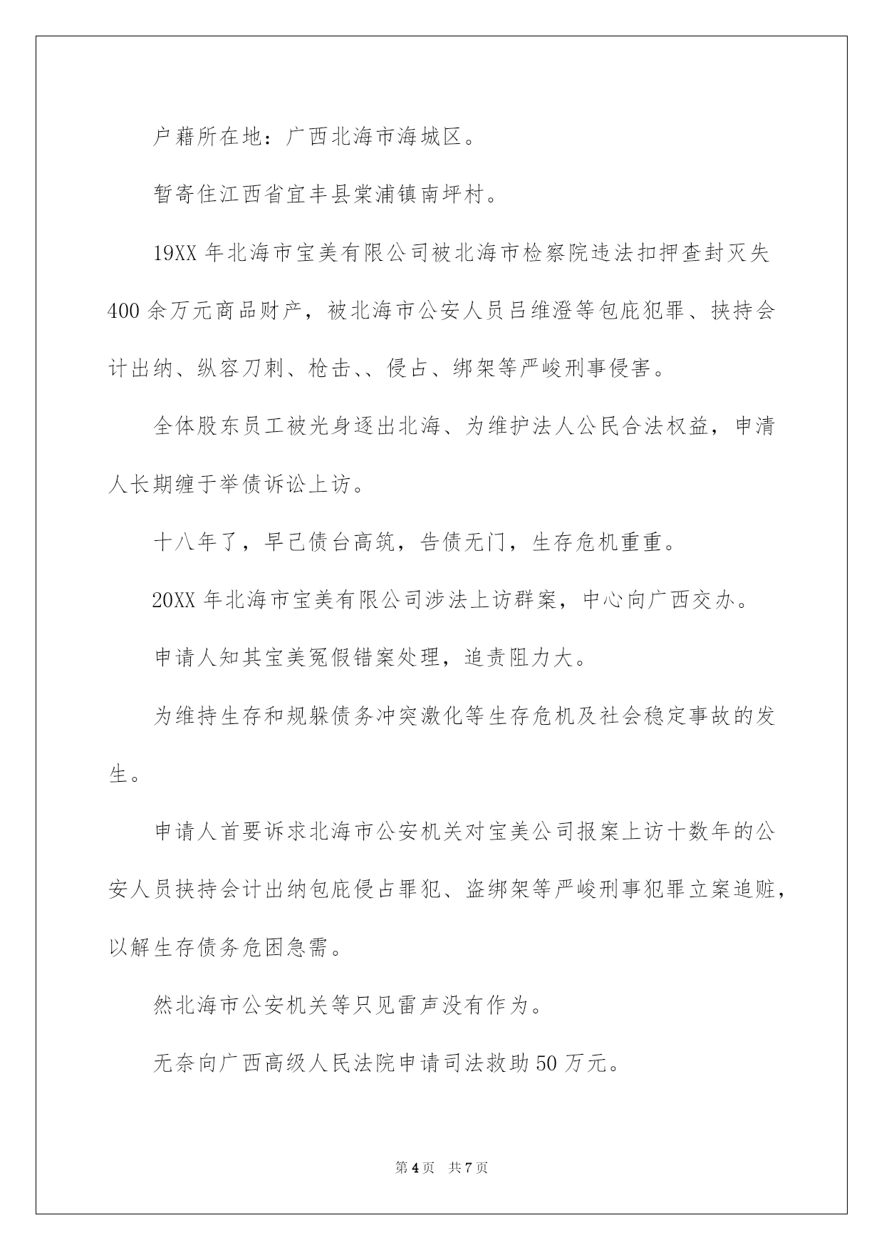 第PAGE\*Arabic\*MERGEFORMAT7页共NUMPAGES\*Arabic\*MERGEFORMAT7页第PAGE\*MERGEFORMAT7页共NUMPAGES\*MERGEFORMAT7页第PAGE\*MERGEFORMAT7页共NUMPAGES\*MERGEFORMAT7页第PAGE\*MERGEFORMAT7页共NUMPAGES\*MERGEFORMAT7页第PAGE\*MERGEFORMAT7页共NUMPAGES\*MERGEFORMAT7页第PAGE\*MERGEFORMAT7页共NUMPAGES\*MERGEFORMAT7页第PAGE\*MERGEFORMAT7页共NUMPAGES\*MERGEFORMAT7页第PAGE\*MERGEFORMAT7页共NUMPAGES\*MERGEFORMAT7页第PAGE\*MERGEFORMAT7页共NUMPAGES\*MERGEFORMAT7页第PAGE\*MERGEFORMAT7页共NUMPAGES\*MERGEFORMAT7页第PAGE\*MERGEFORMAT7页共NUMPAGES\*MERGEFORMAT7页2022司法救助申请书司法救助申请书司法救助的申请书应当怎么写?下面是我整理的司法救助申请书范文,仅供参考。司法救助申请书范文十三师党委政法委:自20XX年以来,我师法院根据党委政法委和兵团分院的统一部署,先后两次主动开展清理执行积案活动,取得了显著成效,执行工作步入良性循环轨道。但是,执行难问题并未根本解决,仍有相当一部分案件因多种缘由难以执行,特殊是在执行标的较大的.刑事附带民事赔偿、交通事故损害赔偿、人身损害赔偿等案件中,遇到被执行人暂无财产或确无财产可供执行时,法院穷尽与案件相适应的执行措施后,只能中止或终结执行。申请人因其合法权益得不到实现对执行产生误会,迁怒于法院和社会,导致有的申请人四处上访、告状。影响了党在人民群众中的威信,损害了人民法院的形象,也牵制了人民法院执行机构大量的人力、物力,从而给社会带来了担心定因素。据统计我师两级三院现有确无财产可供执行案件45件,其中被执行人下落不明21件,被执行人无履行实力24件。为有效地缓解“执行难”所引发的冲突,避开生活困难的申请人实行上访闹访等影响社会稳定的行为,体现我师党委亲民、利民的执政理念,彰显执政为民宗旨。依据有关文件精神和其他一些单位的阅历,设立执行案件特困群体救助基金是从机制体制上解决此类问题的有效途径。我院根据兵团分院要求,在借鉴他人阅历,充分调研的基础上,向师党委政法委申请设立执行案件特困群体救助基金。农十三师中级人民法院20XX年11月30日司法救助申请书申请人:某某某恳求事项:免交诉讼费用理由:申请人已向贵院提起遗产继承诉讼,但是由于申请人目前属城市低保人员且生活特别困难,无力支付诉讼费用,特申请贵院依法供应司法救助,予以免交诉讼费用。请予准许为盼。此致某某区人民法院申请人:某某某20XX年7月15日附:街道低保及经济困难证明一份。司法救助申请书申请人刘保民、男、73岁、汉族、原北海市宝美有限公司董事长,现无业无居所。户藉所在地:湖北省鄂洲市鄂城区。暂寄住祖藉:江西省宜丰县棠浦镇南坪村。唐必凤、女、44岁、汉族、原北海市宝美有限公司股东、总经理助理,现无业无居所。户藉所在地:广西北海市海城区。暂寄住江西省宜丰县棠浦镇南坪村。19XX年北海市宝美有限公司被北海市检察院违法扣押查封灭失400余万元商品财产,被北海市公安人员吕维澄等包庇犯罪、挟持会计出纳、纵容刀刺、枪击、、侵占、绑架等严峻刑事侵害。全体股东员工被光身逐出北海、为维护法人公民合法权益,申清人长期缠于举债诉讼上访。十八年了,早己债台高筑,告债无门,生存危机重重。20XX年北海市宝美有限公司涉法上访群案,中心向广西交办。申请人知其宝美冤假错案处理,追责阻力大。为维持生存和规躲债务冲突激化等生存危机及社会稳定事故的发生。申请人首要诉求北海市公安机关对宝美公司报案上访十数年的公安人员挟持会计出纳包庇侵占罪犯、盗绑架等严峻刑事犯罪立案追赃,以解生存债务危困急需。然北海市公安机关等只见雷声没有作为。无奈向广西高级人民法院申请司法救助50万元。以解生存、高额债务利息、听证诉讼律师费等费用急需。此呈广西壮族自治区高级人民法院罗殿龙院长明鉴申清人:北海市宝美有限公司法定代表人:股东员工代表:20XX年7月1日司法救助申请书申请人:陈邦良男汉族农夫户籍:广西博白县双旺镇周旺村小江队身份证:4525281968XXXXXX电话:130059XXXXX申请救助理由:我因20XX年