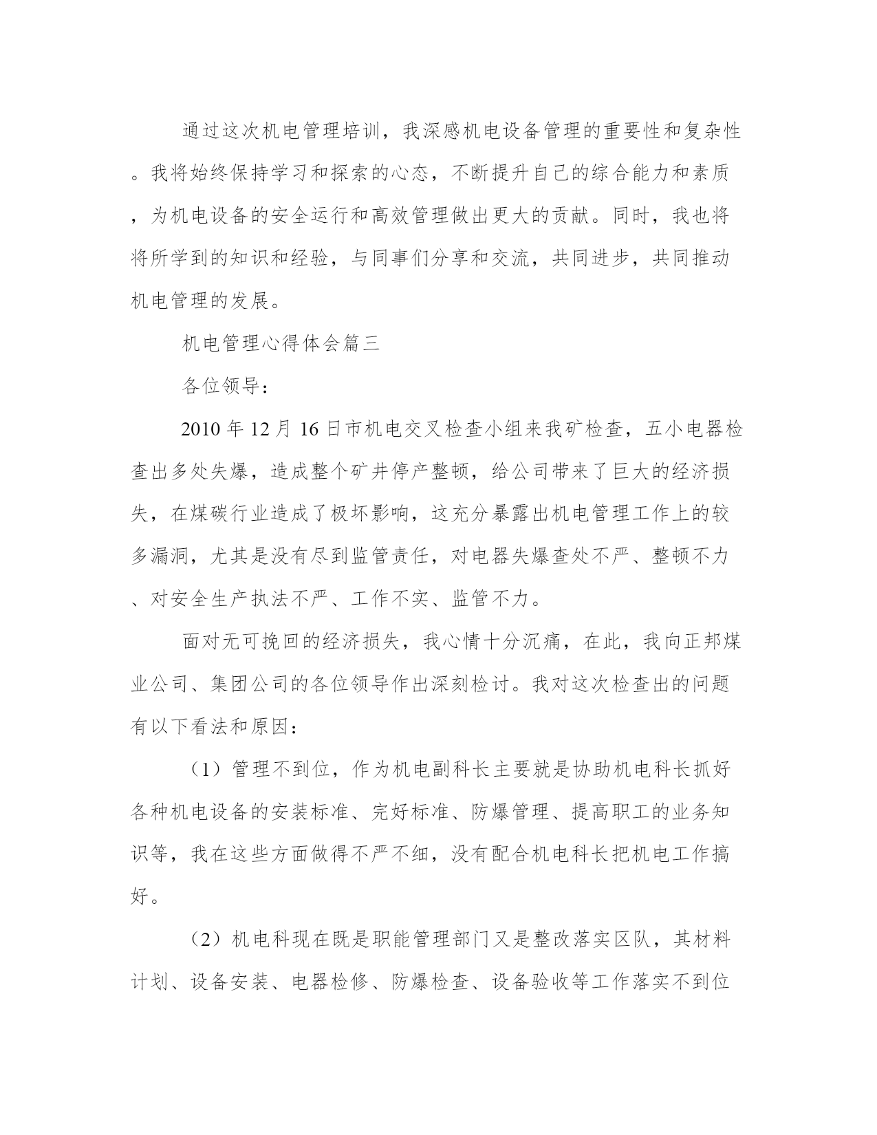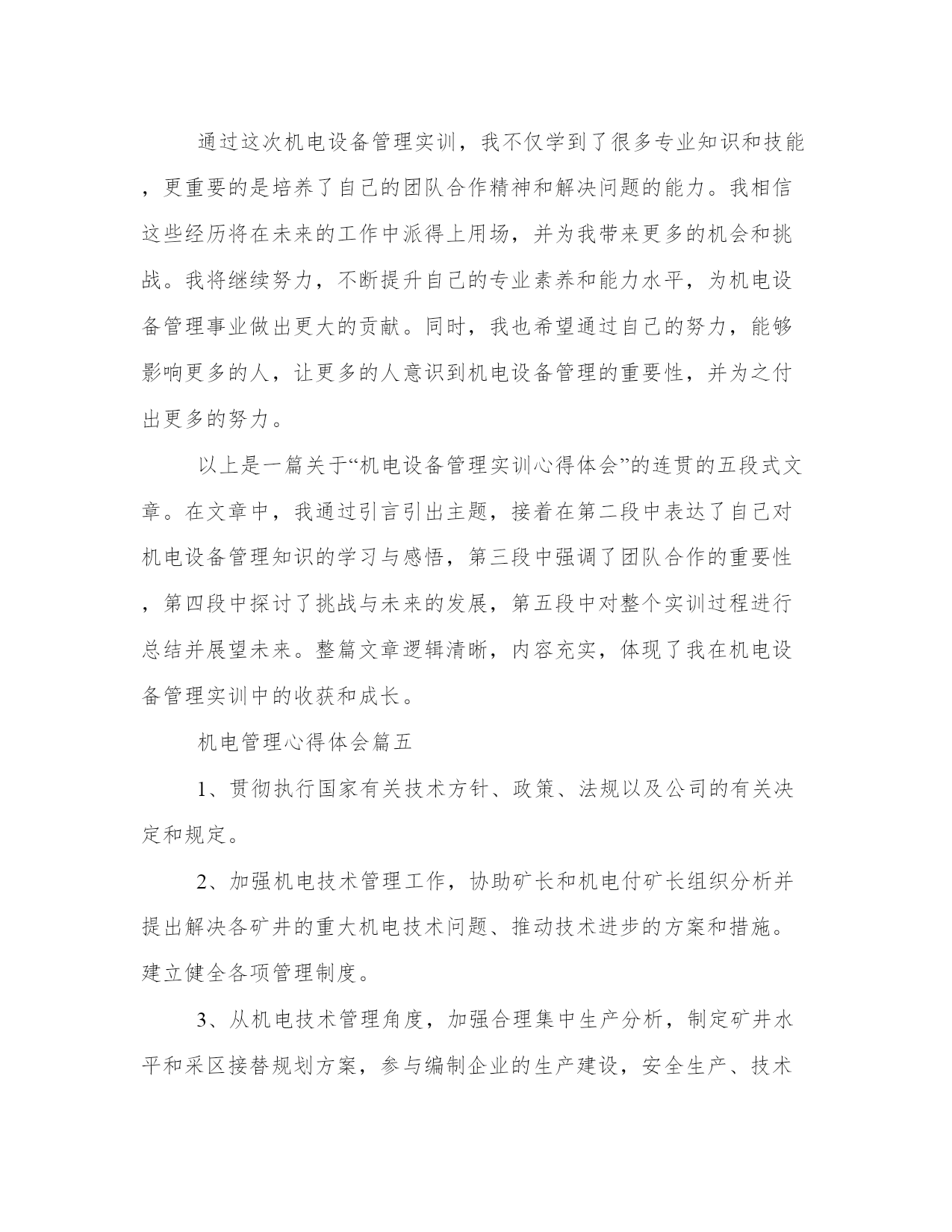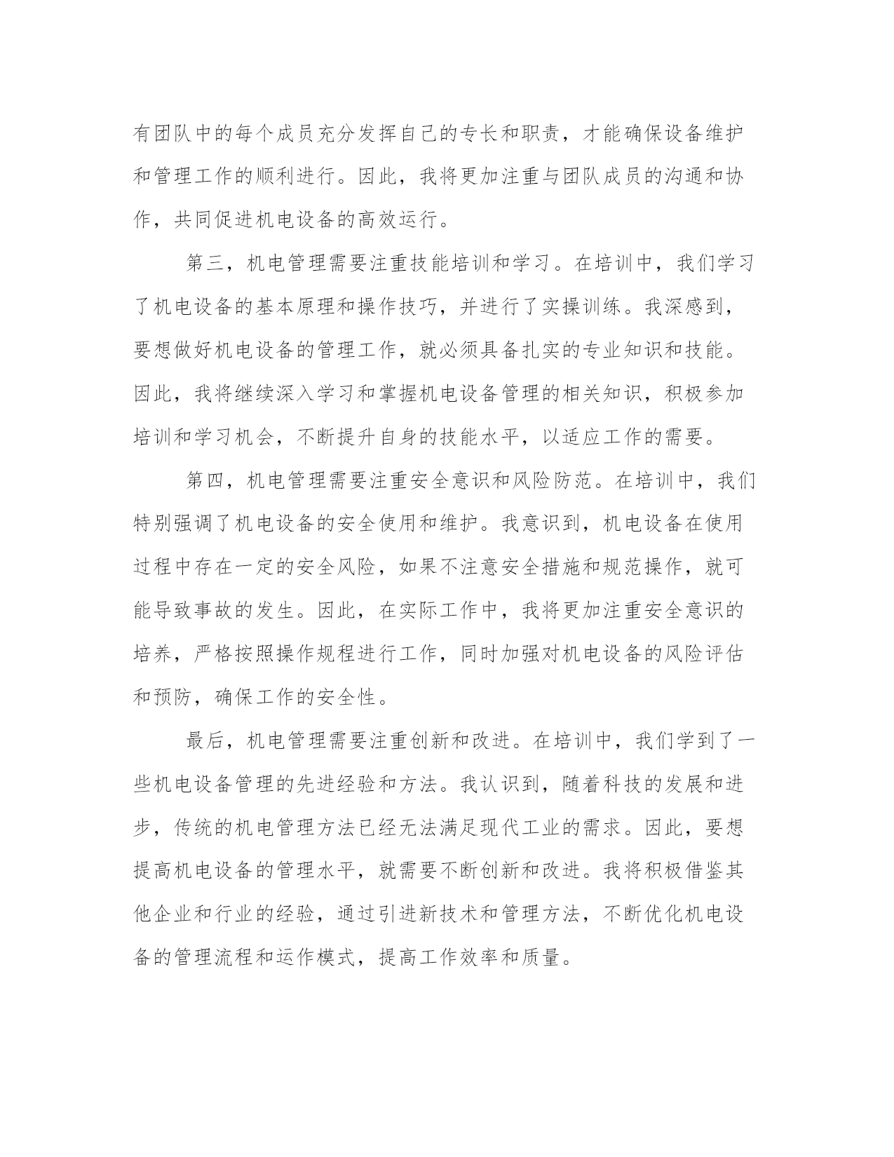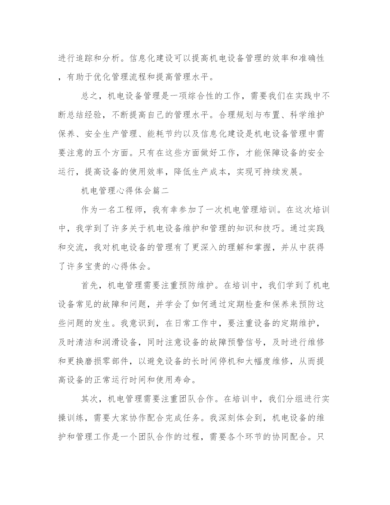最新机电管理心得体会(精选17篇)写心得体会是一个评估自己学习和工作成果的方式。写心得体会时要注意调整语气和语态,避免过于自夸或过于谦虚。以下是一些关于心得体会的范文,供大家参考和借鉴。机电管理心得体会篇一机电设备管理是现代社会生产生活中不可或缺的一环。作为一名机电管理者,我在工作中有着许多体会和心得。在不断总结中,我发现机电设备管理需要注意以下五个方面:合理规划与布置、科学维护保养、安全生产管理、能耗节约以及信息化建设。下面我将分别谈谈这五个方面的体会和感想。首先,合理规划与布置对于机电设备管理至关重要。合理规划和布置可以最大程度地提高设备的使用效率和安全性。在规划过程中,我们需要考虑设备所需的空间、人力资源、供电等因素。在布置时,要考虑设备之间的安全距离、通道的宽度等因素。通过合理规划和布置,可以避免设备之间的干扰和安全事故的发生。其次,科学维护保养对于延长设备寿命和提高设备运行效率非常重要。科学维护保养包括设备的定期检查、清洁和润滑。定期检查可以及时发现设备故障和隐患,及时进行维修和更换。清洁能够保持设备的良好状态,减少设备的摩擦和磨损。润滑则可以减少设备的摩擦和磨损,提高设备的运行效率。通过科学维护保养,可以延长设备的使用寿命,减少设备故障和停机时间,提高设备运行效率。第三,安全生产管理是机电设备管理中必不可少的一环。安全生产管理包括安全培训、安全检查和事故应急预案等。安全培训可以提高员工的安全意识和应急处理能力。安全检查可以及时发现设备的安全隐患,及时进行整改。事故应急预案可以在事故发生时迅速应对,降低事故对设备和人员的伤害。通过安全生产管理,可以最大程度地保障设备的安全运行和人员的生命安全。第四,能耗节约是机电设备管理中的一个重要方面。节约能源不仅可以降低生产成本,还有助于减少对环境的污染。能耗节约包括对设备的合理使用、能源的有效利用、设备的能效改造等。通过合理使用设备,减少设备的空转时间和待机时间,可以降低能源消耗。通过优化能源利用方式和改造设备,可以提高设备的能效,实现能耗的节约。能耗节约是机电设备管理中的一个重要课题,需要我们持续的努力。最后,信息化建设在机电设备管理中起着重要的作用。信息化建设包括设备的数字化管理、设备运行数据的实时监测和设备维修记录的电子化等。通过设备的数字化管理,可以方便对设备进行监控和管理。通过设备运行数据的实时监测,可以及时发现设备的异常情况并进行处理。通过设备维修记录的电子化,可以方便对设备的维修情况进行追踪和分析。信息化建设可以提高机电设备管理的效率和准确性,有助于优化管理流程和提高管理水平。总之,机电设备管理是一项综合性的工作,需要我们在实践中不断总结经验,不断提高自己的管理水平。合理规划与布置、科学维护保养、安全生产管理、能耗节约以及信息化建设是机电设备管理中需要注意的五个方面。只有在这些方面做好工作,才能保障设备的安全运行,提高设备的使用效率,降低生产成本,实现可持续发展。机电管理心得体会篇二作为一名工程师,我有幸参加了一次机电管理培训。在这次培训中,我学到了许多关于机电设备维护和管理的知识和技巧。通过实践和交流,我对机电设备的管理有了更深入的理解和掌握,并从中获得了许多宝贵的心得体会。首先,机电管理需要注重预防维护。在培训中,我们学到了机电设备常见的故障和问题,并学会了如何通过定期检查和保养来预防这些问题的发生。我意识到,在日常工作中,要注重设备的定期维护,及时清洁和润滑设备,同时注意设备的故障预警信号,及时进行维修和更换磨损零部件,以避免设备的长时间停机和大幅度维修,从而提高设备的正常运行时间和使用寿命。其次,机电管理需要注重团队合作。在培训中,我们分组进行实操训练,需要大家协作配合完成任务。我深刻体会到,机电设备的维护和管理工作是一个团队合作的过程,需要各个环节的协同配合。只有团队中的每个成员充分发挥自己的专长和职责,才能确保设备维护和管理工作的顺利进行。因此,我将更加注重与团队成员的沟通和协作,共同促进机电设备的高效运行。第三,机电管理需要注重技能培训和学习。在培训中,我们学习了机电设备的基本原理和操作技巧,并进行了实操训练。我深感到,要想做好机电设备的管理工作,就必须具备扎实的专业知识和技能。因此,我将继续深入学习和掌握机电设备管理的相关知识,积极参加培训和学习机会,不断提升自身的技能水平,以适应工作的需要。第四,机电管理需要注重安全意识和风险防范。在培训中,我们特别强调了机电设备的安全使用和维护。我意识到,机电设备在使用过程中存在一定的安全风险,如果不注意安全措施和规范操作,就可能导致事故的发生。因此,在实际工作中,我将更加注重安全意识的培养,严格按照操作规程进行工作,同时加强对机电设备的风险评估和预防,确保工作的安全性。最后,
