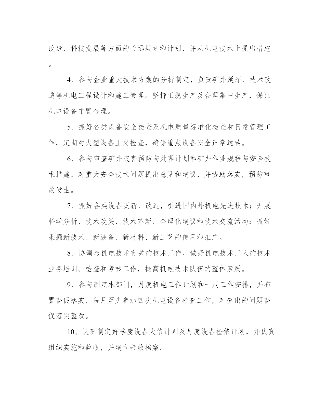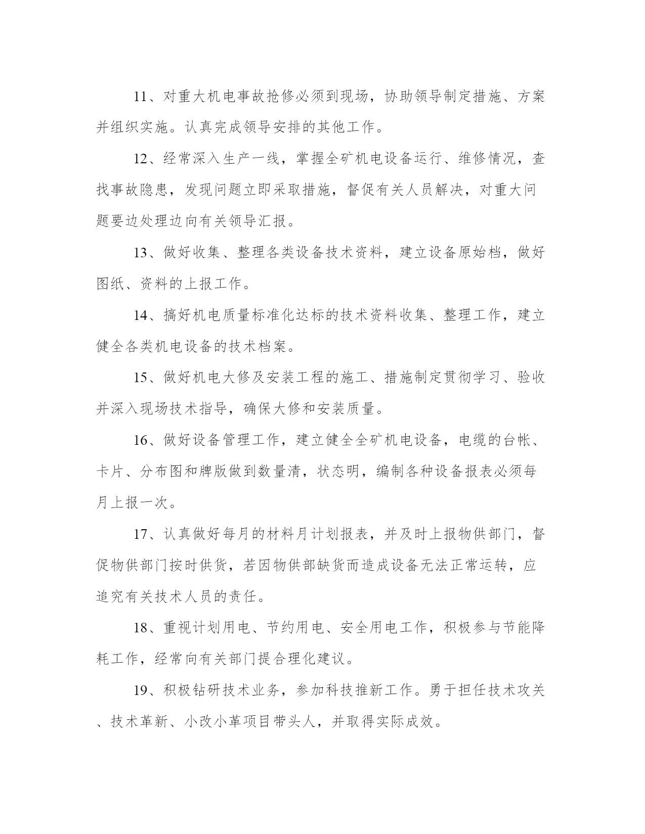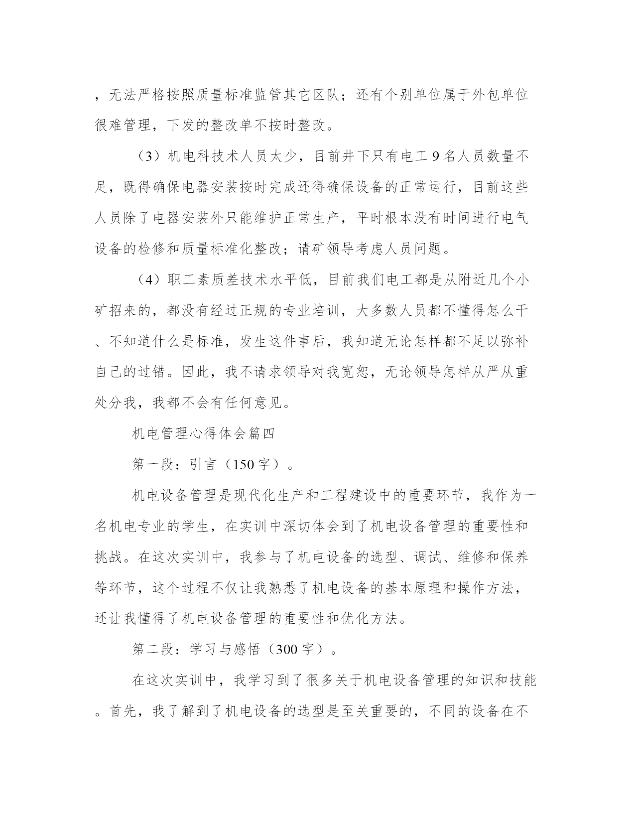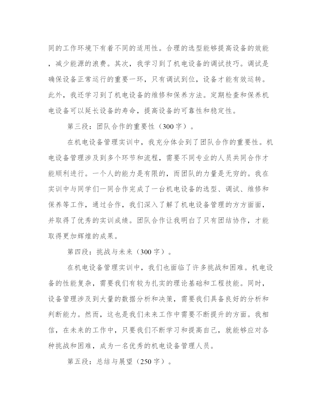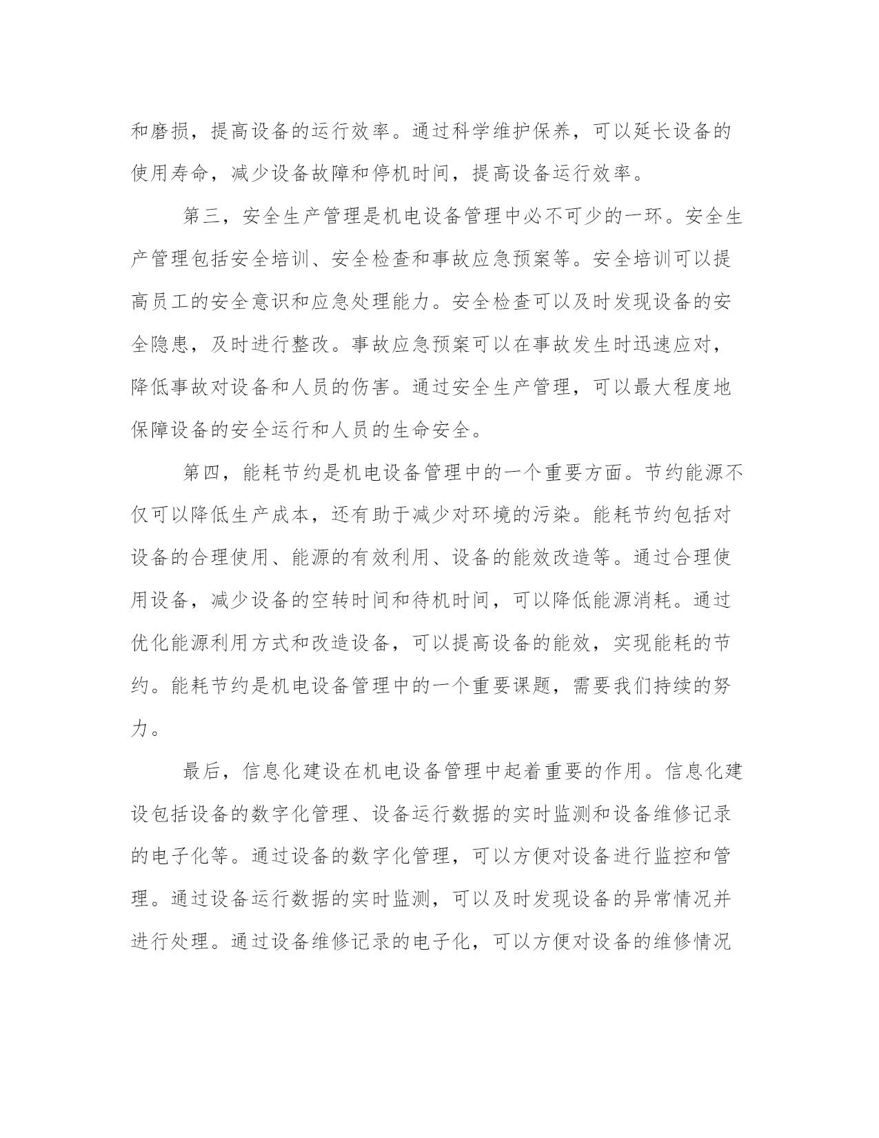 最新机电管理心得体会(精选17篇)写心得体会是一个评估自己学习和工作成果的方式。写心得体会时要注意调整语气和语态,避免过于自夸或过于谦虚。以下是一些关于心得体会的范文,供大家参考和借鉴。机电管理心得体会篇一机电设备管理是现代社会生产生活中不可或缺的一环。作为一名机电管理者,我在工作中有着许多体会和心得。在不断总结中,我发现机电设备管理需要注意以下五个方面:合理规划与布置、科学维护保养、安全生产管理、能耗节约以及信息化建设。下面我将分别谈谈这五个方面的体会和感想。首先,合理规划与布置对于机电设备管理至关重要。合理规划和布置可以最大程度地提高设备的使用效率和安全性。在规划过程中,我们需要考虑设备所需的空间、人力资源、供电等因素。在布置时,要考虑设备之间的安全距离、通道的宽度等因素。通过合理规划和布置,可以避免设备之间的干扰和安全事故的发生。其次,科学维护保养对于延长设备寿命和提高设备运行效率非常重要。科学维护保养包括设备的定期检查、清洁和润滑。定期检查可以及时发现设备故障和隐患,及时进行维修和更换。清洁能够保持设备的良好状态,减少设备的摩擦和磨损。润滑则可以减少设备的摩擦和磨损,提高设备的运行效率。通过科学维护保养,可以延长设备的使用寿命,减少设备故障和停机时间,提高设备运行效率。第三,安全生产管理是机电设备管理中必不可少的一环。安全生产管理包括安全培训、安全检查和事故应急预案等。安全培训可以提高员工的安全意识和应急处理能力。安全检查可以及时发现设备的安全隐患,及时进行整改。事故应急预案可以在事故发生时迅速应对,降低事故对设备和人员的伤害。通过安全生产管理,可以最大程度地保障设备的安全运行和人员的生命安全。第四,能耗节约是机电设备管理中的一个重要方面。节约能源不仅可以降低生产成本,还有助于减少对环境的污染。能耗节约包括对设备的合理使用、能源的有效利用、设备的能效改造等。通过合理使用设备,减少设备的空转时间和待机时间,可以降低能源消耗。通过优化能源利用方式和改造设备,可以提高设备的能效,实现能耗的节约。能耗节约是机电设备管理中的一个重要课题,需要我们持续的努力。最后,信息化建设在机电设备管理中起着重要的作用。信息化建设包括设备的数字化管理、设备运行数据的实时监测和设备维修记录的电子化等。通过设备的数字化管理,可以方便对设备进行监控和管理。通过设备运行数据的实时监测,可以及时发现设备的异常情况并进行处理。通过设备维修记录的电子化,可以方便对设备的维修情况进行追踪和分析。信息化建设可以提高机电设备管理的效率和准确性,有助于优化管理流程和提高管理水平。总之,机电设备管理是一项综合性的工作,需要我们在实践中不断总结经验,不断提高自己的管理水平。合理规划与布置、科学维护保养、安全生产管理、能耗节约以及信息化建设是机电设备管理中需要注意的五个方面。只有在这些方面做好工作,才能保障设备的安全运行,提高设备的使用效率,降低生产成本,实现可持续发展。机电管理心得体会篇二作为一名工程师,我有幸参加了一次机电管理培训。在这次培训中,我学到了许多关于机电设备维护和管理的知识和技巧。通过实践和交流,我对机电设备的管理有了更深入的理解和掌握,并从中获得了许多宝贵的心得体会。首先,机电管理需要注重预防维护。在培训中,我们学到了机电设备常见的故障和问题,并学会了如何通过定期检查和保养来预防这些问题的发生。我意识到,在日常工作中,要注重设备的定期维护,及时清洁和润滑设备,同时注意设备的故障预警信号,及时进行维修和更换磨损零部件,以避免设备的长时间停机和大幅度维修,从而提高设备的正常运行时间和使用寿命。其次,机电管理需要注重团队合作。在培训中,我们分组进行实操训练,需要大家协作配合完成任务。我深刻体会到,机电设备的维护和管理工作是一个团队合作的过程,需要各个环节的协同配合。只有团队中的每个成员充分发挥自己的专长和职责,才能确保设备维护和管理工作的顺利进行。因此,我将更加注重与团队成员的沟通和协作,共同促进机电设备的高效运行。第三,机电管理需要注重技能培训和学习。在培训中,我们学习了机电设备的基本原理和操作技巧,并进行了实操训练。我深感到,要想做好机电设备的管理工作,就必须具备扎实的专业知识和技能。因此,我将继续深入学习和掌握机电设备管理的相关知识,积极参加培训和学习机会,不断提升自身的技能水平,以适应工作的需要。第四,机电管理需要注重安全意识和风险防范。在培训中,我们特别强调了机电设备的安全使用和维护。我意识到,机电设备在使用过程中存在一定的安全风险,如果不注意安全措施和规范操作,就可能导致事故的发生。因此,在实际工作中,我将更加注重安全意识的培养,严格按照操作规程进行工作,同时加强对机电设备的风险评估和预防,确保工作的安全性。最后,