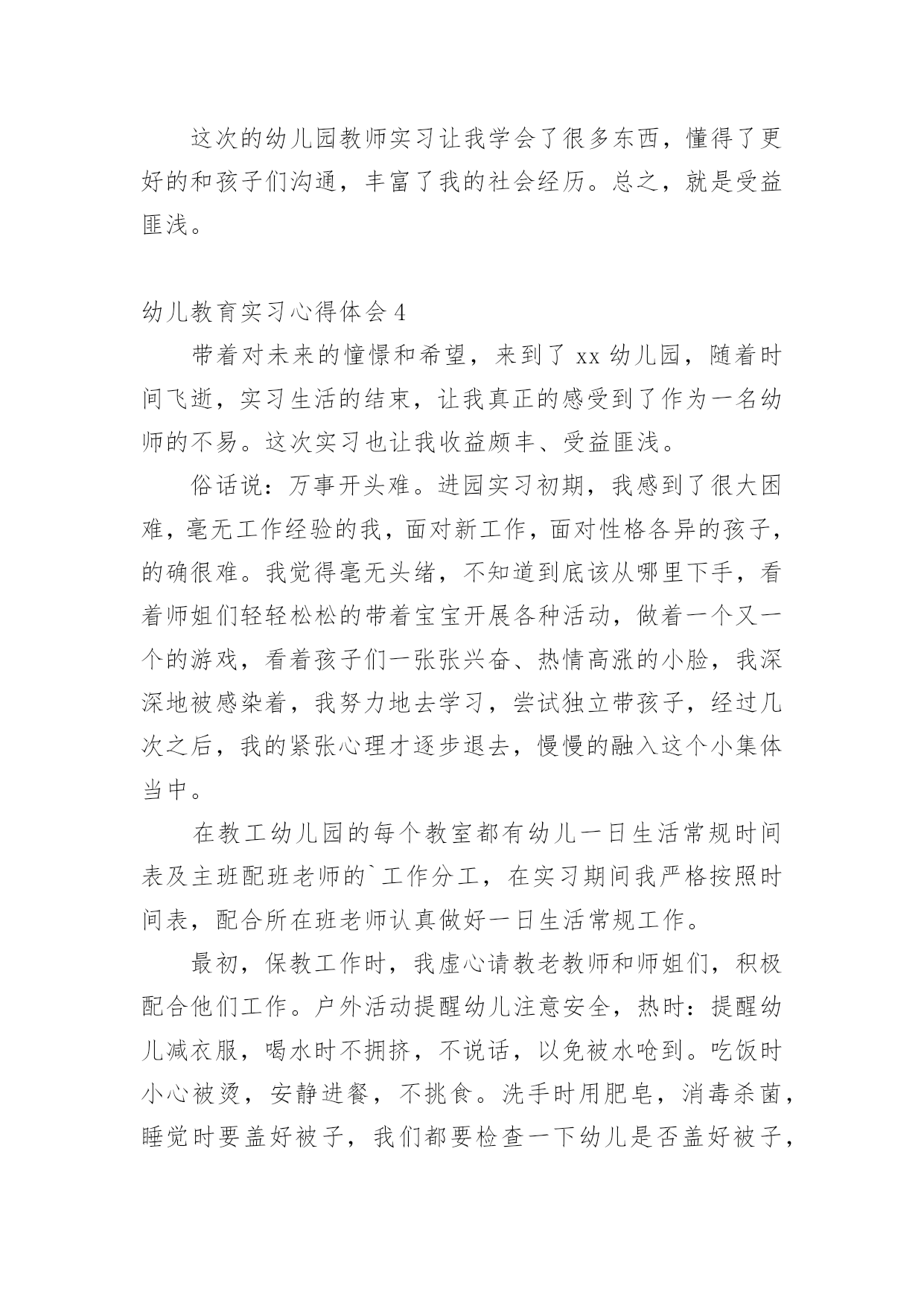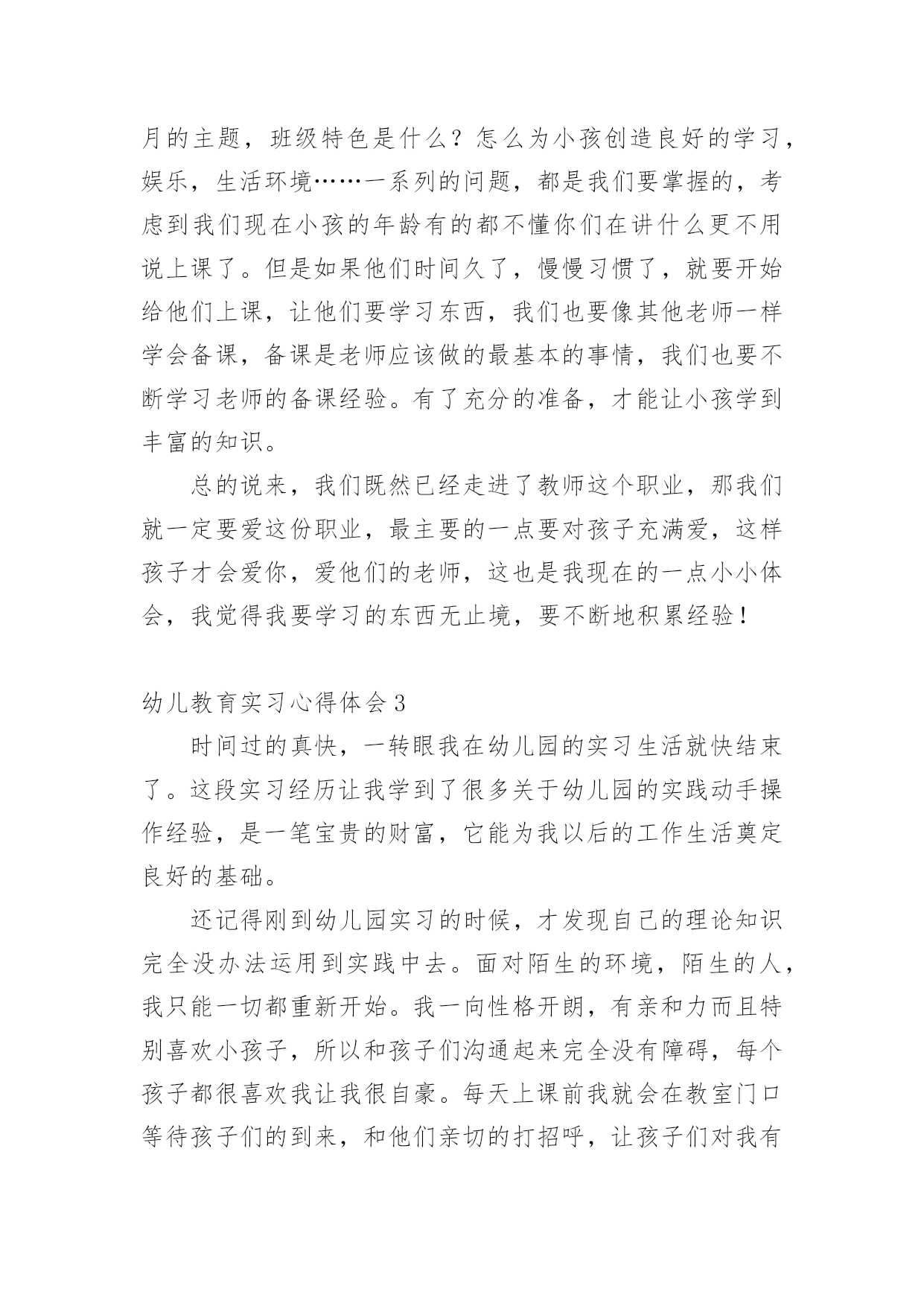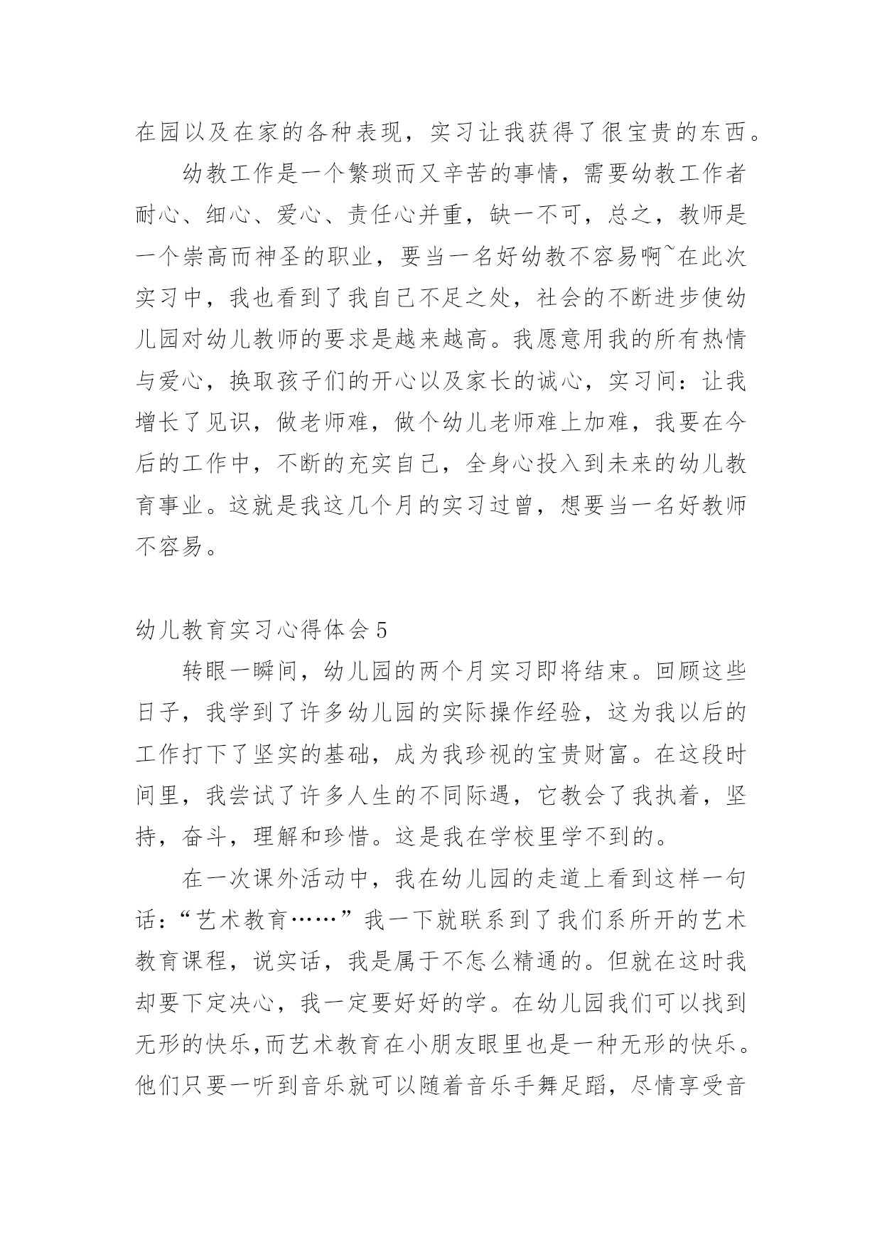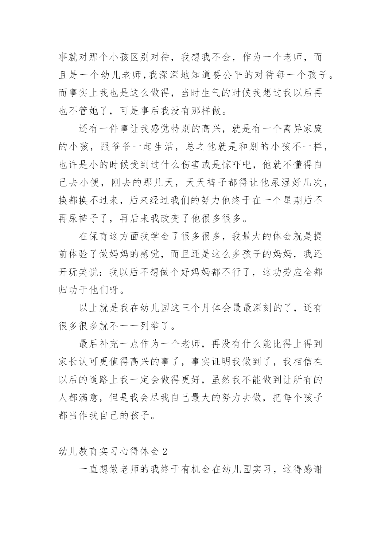 幼儿教育实习心得体会幼儿教育实习心得体会1时间过得真快,转眼之间,幼儿园的实习即将结束。回顾这些日子,我学到了许多幼儿园的实际操作经验,这为我以后的工作打下了坚实的基础,成为我珍视的宝贵财富。在这段时间里,我尝试了许多人生的不同际遇,它教会了我执着,坚持,奋斗,理解和珍惜。这是我在学校里学不到的。这几周的实习生活,是苦中有甜,累中有乐,回味无穷。在准备实习的前几周,我很矛盾。矛盾在于,很想去实习,很想去感受一下幼儿园的生活和幼儿教师的生活;在校期间曾俩次到学校所在地的幼儿园见习,感受了不同的氛围,尤其是在市幼儿园见习那一周,和谐的氛围让我特别憧憬幼儿园的生活,可是真正到了这个时候又特别害怕去实习,因为总感觉自己还没有能力去做一名幼儿教师。我们现在是大三,专业学习了两年,但是我们并没有完全掌握好所学的知识,何况理论与实践根本是两回事,怕自己胜任不了。怀着这样矛盾的心情去找实习的地方,刚开始由于对自己的不自信,找实习地的时候,没有勇气去那种公立园,只是去了一些私立园,我们走了很多的幼儿园,虽然我们去的那些幼儿园都希望我们可以留下来,但是一些大一点的幼儿园我们去了只能从保育员干起,小的就不同了,我们就可以直接代课了,所以,经过再三考虑我还是选择了一个比较小的幼儿园,先锻炼一下自己吧!来到幼儿园见到以前的老师,她们的年纪也比我们大不了多少,有的甚至都是同龄,可看上去比我们成熟多了,我们还像个小孩,这些应该都源于社会的磨练吧。像我们这些一直在学校待着的人缺乏的就是这样的机会。说他们比我们成熟,不仅是外貌,更多的在于思想,在于社会交往方面。经过这次实习,我在这些方面有了很大的提高。我真正体会到了社会的复杂。刚刚进入幼儿园的时候,才真切地发现在学校里学到的理论性的东西,在实际操作起来根本没法运用。经过一段时间的锻炼,在前辈的指点下我终于不再是那个拿到教材就发蒙无从下手的新手了,为了吸引孩子们的注意力,我和其他代课老师利用课余时间想动作,想尽一切办法吸引他们的注意力,事实这个方法特别有效,因为刚开始我的教学是特别的死板,我发现孩子们都不时特别愿意学,尤其我代的是小班小朋友,这个年龄阶段的孩子最大的喜好就是玩,但是我总觉得我把他们的天性都给泯灭了,怎样做才能让他们既能学到东西还能感觉到学习的快乐,那就是将教学内容贯穿到幼儿喜欢玩的游戏中。园长告诉我们想要得到孩子与家长的认可首先要记住他们的名字。刚开始我以为这个一点都不重要,但是一次试验后我才发现这对于一个孩子来说太重要了,一次,我想让我班的一个小孩回答问题,但我就是想不起来他叫什么名字,无奈只好说:“这个宝宝……”可是让我失望的是那个小孩不但不理我,还哭了起来,当时我特别的纳闷他为什么会哭,事后我才知道是因为我不记得他的名字,从那以后,我特别注意,我带的班级总共只有16个孩子,孩子少,所以我用最快的速度记住全班了孩子的名字,原因很简单;孩子们的想法特别简单,他们就认为你能记住他的名字就是喜欢他,记不住就是不喜欢了。还有一件事让我记忆特别深刻,在一次的家长意见回馈表上,有一个家长很直接的写着这么一条意见;教师不负责任,推卸责任,幼儿有不适不尽快向家长反映。当时我看完就被气懵了,我去找园长问了一下,园长告诉我可能就是因为上次小孩吃完药吐的那个事吧,其实那个事发生的当天我们就和家长说了,当时他也没说什么,但是他和园长说了,园长也认为没事就没和我们说,因为孩子在幼儿园吐什么的都是很平常的事,小孩的胃比较浅,有时可能因为水喝多了,不想吃什么东西了都会吐。当时感觉特别委屈,还很气愤,我总感觉我已经做得很好了,为什么还要这么说呢。后来园长的一番话让我有所领悟。她告诉我:没那个必要,这只是刚开始,以后的路还长着呢,如果你就因为这个就生这么大的气,还想放弃,那以后的路该怎么走,也许我们确实有做得不到位的地方,要不然家长也不会说,如果我们做得非常好的话,家长是不会这么说的,不管做什么事不能只想别人的过错,要先想想自己什么地方做得不够好,以后注意就是了。”园长的一番话让我感觉不那么难受了。事后我也想了想,确实是我做得不够到位吧,园长还告诉我千万不要因为这个事就对那个小孩区别对待,我想我不会,作为一个老师,而且是一个幼儿老师,我深深地知道要公平的对待每一个孩子。而事实上我也是这么做得,当时生气的时候我想过我以后再也不管她了,可是事后我没有那样做。还有一件事让我感觉特别的高兴,就是有一个离异家庭的小孩,跟爷爷一起生活,总之他就是和别的小孩不一样,也许是小的时候受到过什么伤害或是惊吓吧,他就不懂得自己去小便,刚去的那几天,天天裤子都得让他尿湿好几次,换都换不过来,后来经过我们的努力他终于在一个星期后不再尿裤子了,再后来我改变了他很多很多。在保育这方面我学会了很多很多,我最大的体会就是提前体验了做妈妈的感觉,而且还是这