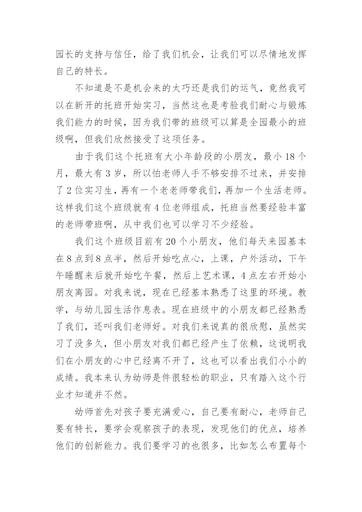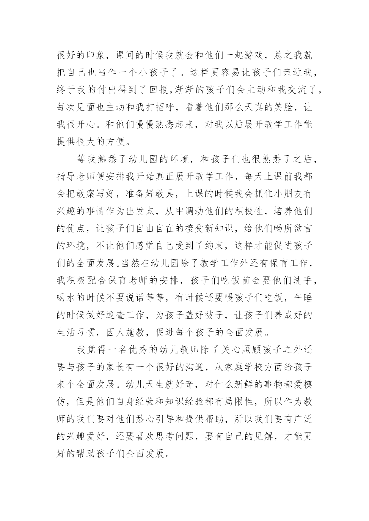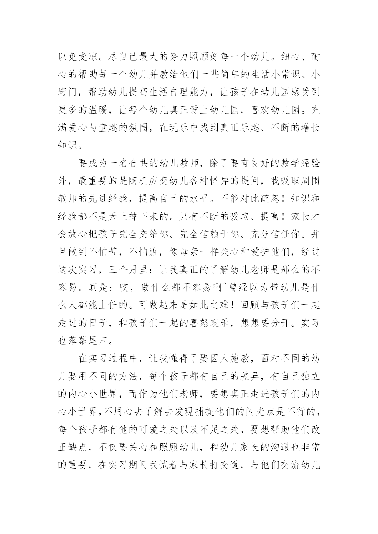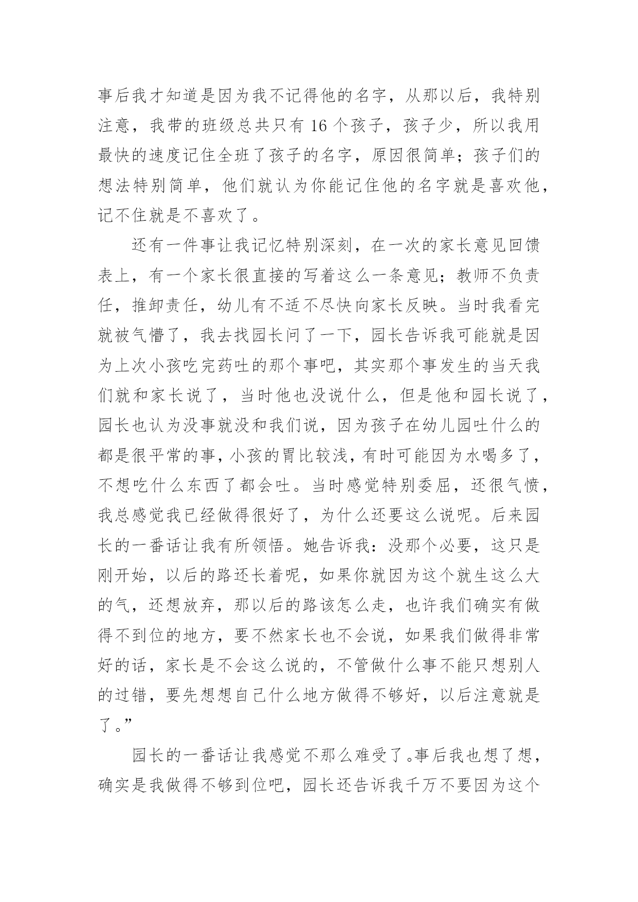 幼儿教育实习心得体会幼儿教育实习心得体会1时间过得真快,转眼之间,幼儿园的实习即将结束。回顾这些日子,我学到了许多幼儿园的实际操作经验,这为我以后的工作打下了坚实的基础,成为我珍视的宝贵财富。在这段时间里,我尝试了许多人生的不同际遇,它教会了我执着,坚持,奋斗,理解和珍惜。这是我在学校里学不到的。这几周的实习生活,是苦中有甜,累中有乐,回味无穷。在准备实习的前几周,我很矛盾。矛盾在于,很想去实习,很想去感受一下幼儿园的生活和幼儿教师的生活;在校期间曾俩次到学校所在地的幼儿园见习,感受了不同的氛围,尤其是在市幼儿园见习那一周,和谐的氛围让我特别憧憬幼儿园的生活,可是真正到了这个时候又特别害怕去实习,因为总感觉自己还没有能力去做一名幼儿教师。我们现在是大三,专业学习了两年,但是我们并没有完全掌握好所学的知识,何况理论与实践根本是两回事,怕自己胜任不了。怀着这样矛盾的心情去找实习的地方,刚开始由于对自己的不自信,找实习地的时候,没有勇气去那种公立园,只是去了一些私立园,我们走了很多的幼儿园,虽然我们去的那些幼儿园都希望我们可以留下来,但是一些大一点的幼儿园我们去了只能从保育员干起,小的就不同了,我们就可以直接代课了,所以,经过再三考虑我还是选择了一个比较小的幼儿园,先锻炼一下自己吧!来到幼儿园见到以前的老师,她们的年纪也比我们大不了多少,有的甚至都是同龄,可看上去比我们成熟多了,我们还像个小孩,这些应该都源于社会的磨练吧。像我们这些一直在学校待着的人缺乏的就是这样的机会。说他们比我们成熟,不仅是外貌,更多的在于思想,在于社会交往方面。经过这次实习,我在这些方面有了很大的提高。我真正体会到了社会的复杂。刚刚进入幼儿园的时候,才真切地发现在学校里学到的理论性的东西,在实际操作起来根本没法运用。经过一段时间的锻炼,在前辈的指点下我终于不再是那个拿到教材就发蒙无从下手的新手了,为了吸引孩子们的注意力,我和其他代课老师利用课余时间想动作,想尽一切办法吸引他们的注意力,事实这个方法特别有效,因为刚开始我的教学是特别的死板,我发现孩子们都不时特别愿意学,尤其我代的是小班小朋友,这个年龄阶段的孩子最大的喜好就是玩,但是我总觉得我把他们的天性都给泯灭了,怎样做才能让他们既能学到东西还能感觉到学习的快乐,那就是将教学内容贯穿到幼儿喜欢玩的游戏中。园长告诉我们想要得到孩子与家长的认可首先要记住他们的名字。刚开始我以为这个一点都不重要,但是一次试验后我才发现这对于一个孩子来说太重要了,一次,我想让我班的一个小孩回答问题,但我就是想不起来他叫什么名字,无奈只好说:“这个宝宝……”可是让我失望的是那个小孩不但不理我,还哭了起来,当时我特别的纳闷他为什么会哭,事后我才知道是因为我不记得他的名字,从那以后,我特别注意,我带的班级总共只有16个孩子,孩子少,所以我用最快的速度记住全班了孩子的名字,原因很简单;孩子们的想法特别简单,他们就认为你能记住他的名字就是喜欢他,记不住就是不喜欢了。还有一件事让我记忆特别深刻,在一次的家长意见回馈表上,有一个家长很直接的写着这么一条意见;教师不负责任,推卸责任,幼儿有不适不尽快向家长反映。当时我看完就被气懵了,我去找园长问了一下,园长告诉我可能就是因为上次小孩吃完药吐的那个事吧,其实那个事发生的当天我们就和家长说了,当时他也没说什么,但是他和园长说了,园长也认为没事就没和我们说,因为孩子在幼儿园吐什么的都是很平常的事,小孩的胃比较浅,有时可能因为水喝多了,不想吃什么东西了都会吐。当时感觉特别委屈,还很气愤,我总感觉我已经做得很好了,为什么还要这么说呢。后来园长的一番话让我有所领悟。她告诉我:没那个必要,这只是刚开始,以后的路还长着呢,如果你就因为这个就生这么大的气,还想放弃,那以后的路该怎么走,也许我们确实有做得不到位的地方,要不然家长也不会说,如果我们做得非常好的话,家长是不会这么说的,不管做什么事不能只想别人的过错,要先想想自己什么地方做得不够好,以后注意就是了。”园长的一番话让我感觉不那么难受了。事后我也想了想,确实是我做得不够到位吧,园长还告诉我千万不要因为这个事就对那个小孩区别对待,我想我不会,作为一个老师,而且是一个幼儿老师,我深深地知道要公平的对待每一个孩子。而事实上我也是这么做得,当时生气的时候我想过我以后再也不管她了,可是事后我没有那样做。还有一件事让我感觉特别的高兴,就是有一个离异家庭的小孩,跟爷爷一起生活,总之他就是和别的小孩不一样,也许是小的时候受到过什么伤害或是惊吓吧,他就不懂得自己去小便,刚去的那几天,天天裤子都得让他尿湿好几次,换都换不过来,后来经过我们的努力他终于在一个星期后不再尿裤子了,再后来我改变了他很多很多。在保育这方面我学会了很多很多,我最大的体会就是提前体验了做妈妈的感觉,而且还是这