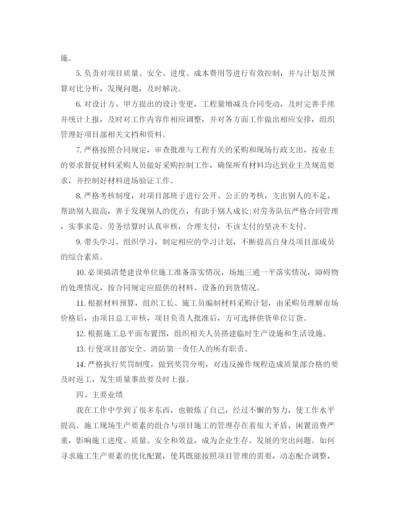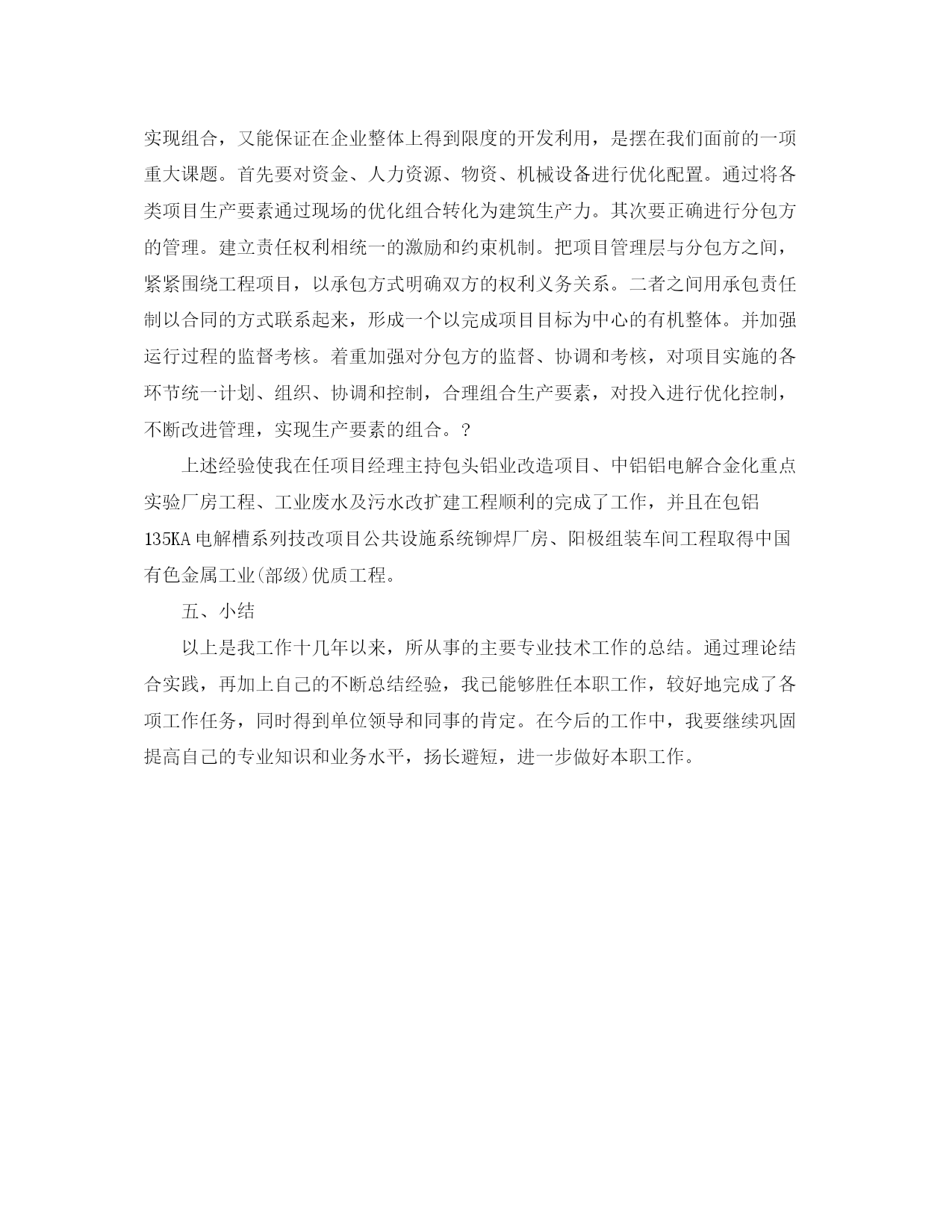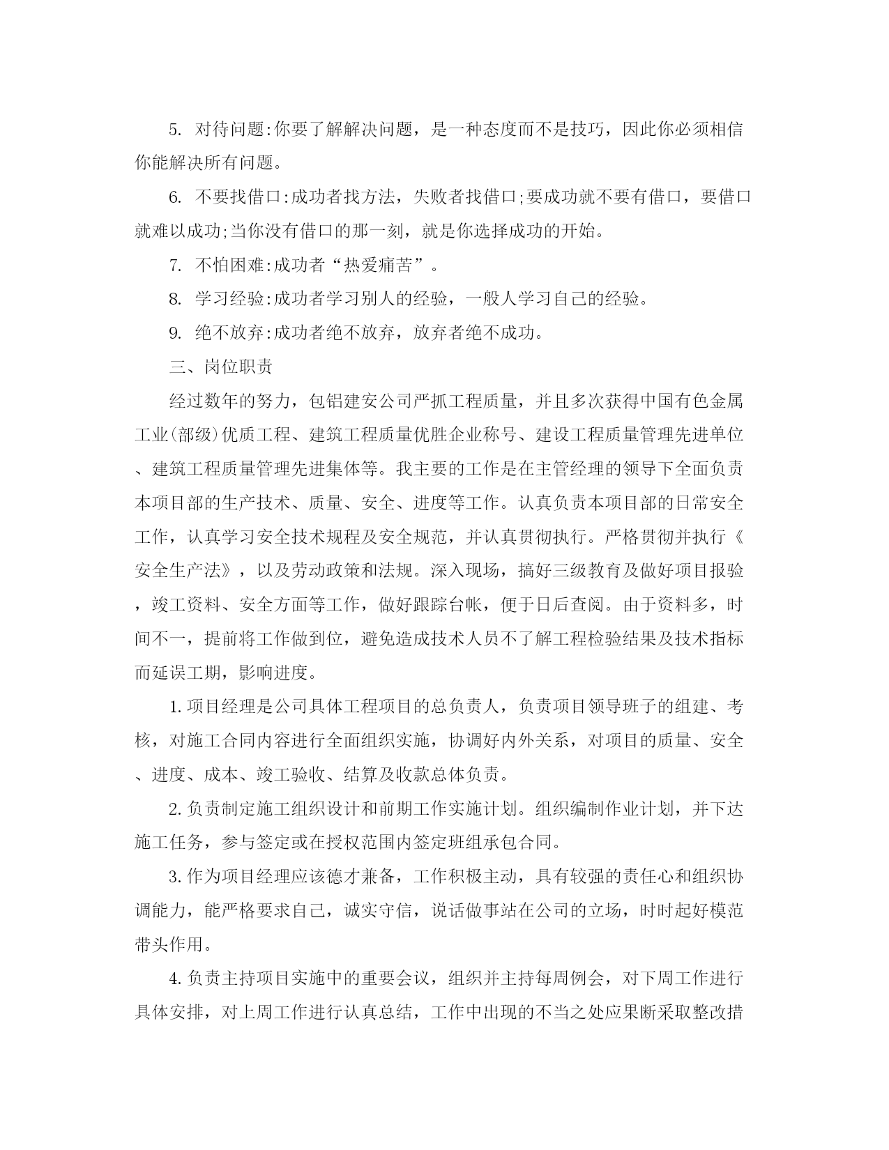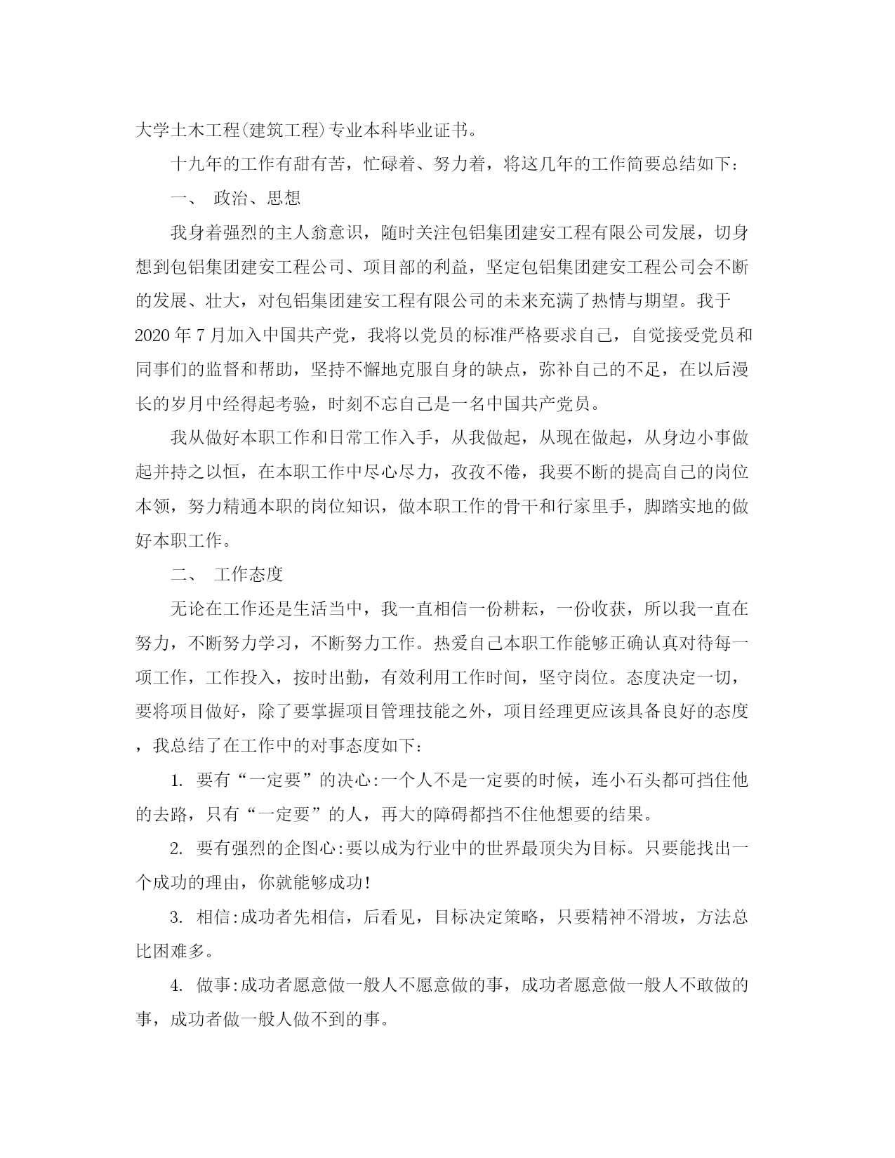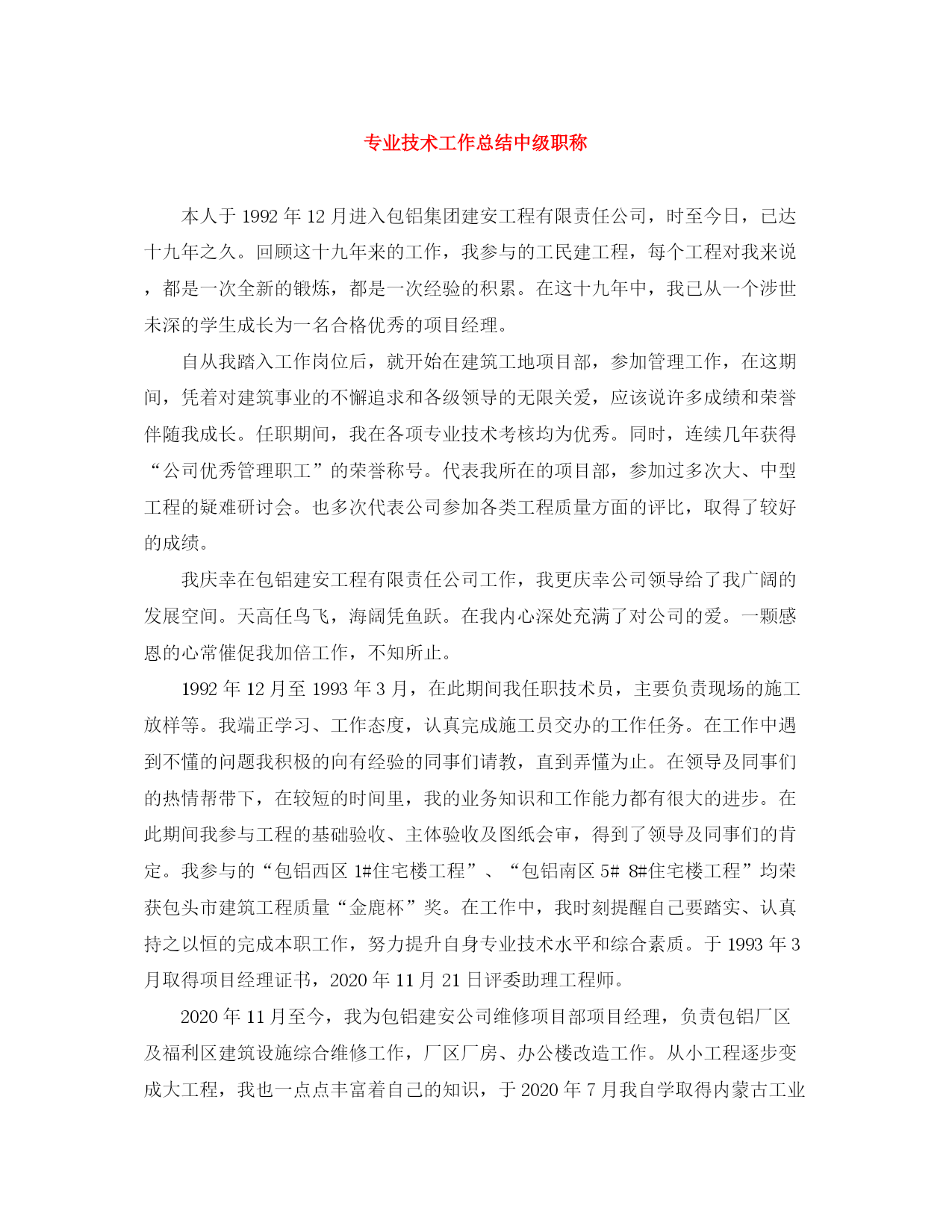 此资料由网络收集而来,如有侵权请告知上传者立即删除。资料共分享,我们负责传递知识。专业技术工作总结中级职称本人于1992年12月进入包铝集团建安工程有限责任公司,时至今日,已达十九年之久。回顾这十九年来的工作,我参与的工民建工程,每个工程对我来说,都是一次全新的锻炼,都是一次经验的积累。在这十九年中,我已从一个涉世未深的学生成长为一名合格优秀的项目经理。自从我踏入工作岗位后,就开始在建筑工地项目部,参加管理工作,在这期间,凭着对建筑事业的不懈追求和各级领导的无限关爱,应该说许多成绩和荣誉伴随我成长。任职期间,我在各项专业技术考核均为优秀。同时,连续几年获得“公司优秀管理职工”的荣誉称号。代表我所在的项目部,参加过多次大、中型工程的疑难研讨会。也多次代表公司参加各类工程质量方面的评比,取得了较好的成绩。我庆幸在包铝建安工程有限责任公司工作,我更庆幸公司领导给了我广阔的发展空间。天高任鸟飞,海阔凭鱼跃。在我内心深处充满了对公司的爱。一颗感恩的心常催促我加倍工作,不知所止。1992年12月至1993年3月,在此期间我任职技术员,主要负责现场的施工放样等。我端正学习、工作态度,认真完成施工员交办的工作任务。在工作中遇到不懂的问题我积极的向有经验的同事们请教,直到弄懂为止。在领导及同事们的热情帮带下,在较短的时间里,我的业务知识和工作能力都有很大的进步。在此期间我参与工程的基础验收、主体验收及图纸会审,得到了领导及同事们的肯定。我参与的“包铝西区1#住宅楼工程”、“包铝南区5#8#住宅楼工程”均荣获包头市建筑工程质量“金鹿杯”奖。在工作中,我时刻提醒自己要踏实、认真持之以恒的完成本职工作,努力提升自身专业技术水平和综合素质。于1993年3月取得项目经理证书,2020年11月21日评委助理工程师。2020年11月至今,我为包铝建安公司维修项目部项目经理,负责包铝厂区及福利区建筑设施综合维修工作,厂区厂房、办公楼改造工作。从小工程逐步变成大工程,我也一点点丰富着自己的知识,于2020年7月我自学取得内蒙古工业大学土木工程(建筑工程)专业本科毕业证书。十九年的工作有甜有苦,忙碌着、努力着,将这几年的工作简要总结如下:一、政治、思想我身着强烈的主人翁意识,随时关注包铝集团建安工程有限公司发展,切身想到包铝集团建安工程公司、项目部的利益,坚定包铝集团建安工程公司会不断的发展、壮大,对包铝集团建安工程有限公司的未来充满了热情与期望。我于2020年7月加入中国共产党,我将以党员的标准严格要求自己,自觉接受党员和同事们的监督和帮助,坚持不懈地克服自身的缺点,弥补自己的不足,在以后漫长的岁月中经得起考验,时刻不忘自己是一名中国共产党员。我从做好本职工作和日常工作入手,从我做起,从现在做起,从身边小事做起并持之以恒,在本职工作中尽心尽力,孜孜不倦,我要不断的提高自己的岗位本领,努力精通本职的岗位知识,做本职工作的骨干和行家里手,脚踏实地的做好本职工作。二、工作态度无论在工作还是生活当中,我一直相信一份耕耘,一份收获,所以我一直在努力,不断努力学习,不断努力工作。热爱自己本职工作能够正确认真对待每一项工作,工作投入,按时出勤,有效利用工作时间,坚守岗位。态度决定一切,要将项目做好,除了要掌握项目管理技能之外,项目经理更应该具备良好的态度,我总结了在工作中的对事态度如下:1.要有“一定要”的决心:一个人不是一定要的时候,连小石头都可挡住他的去路,只有“一定要”的人,再大的障碍都挡不住他想要的结果。2.要有强烈的企图心:要以成为行业中的世界最顶尖为目标。只要能找出一个成功的理由,你就能够成功!3.相信:成功者先相信,后看见,目标决定策略,只要精神不滑坡,方法总比困难多。4.做事:成功者愿意做一般人不愿意做的事,成功者愿意做一般人不敢做的事,成功者做一般人做不到的事。5.对待问题:你要了解解决问题,是一种态度而不是技巧,因此你必须相信你能解决所有问题。6.不要找借口:成功者找方法,失败者找借口;要成功就不要有借口,要借口就难以成功;当你没有借口的那一刻,就是你选择成功的开始。7.不怕困难:成功者“热爱痛苦”。8.学习经验:成功者学习别人的经验,一般人学习自己的经验。9.绝不放弃:成功者绝不放弃,放弃者绝不成功。三、岗位职责经过数年的努力,包铝建安公司严抓工程质量,并且多次获得中国有色金属工业(部级)优质工程、建筑工程质量优胜企业称号、建设工程质量管理先进单位、建筑工程质量管理先进集体等。我主要的工作是在主管经理的领导下全面负责本项目部的生产技术、质量、安全、进度等工作。认真负责本项目部的日常安全工作,认真学习安全技术规程及安全规范,并认真贯彻执行。严格贯彻并执行《安全生产法》,以及劳动政策和法规。深入现场,搞好三级教育