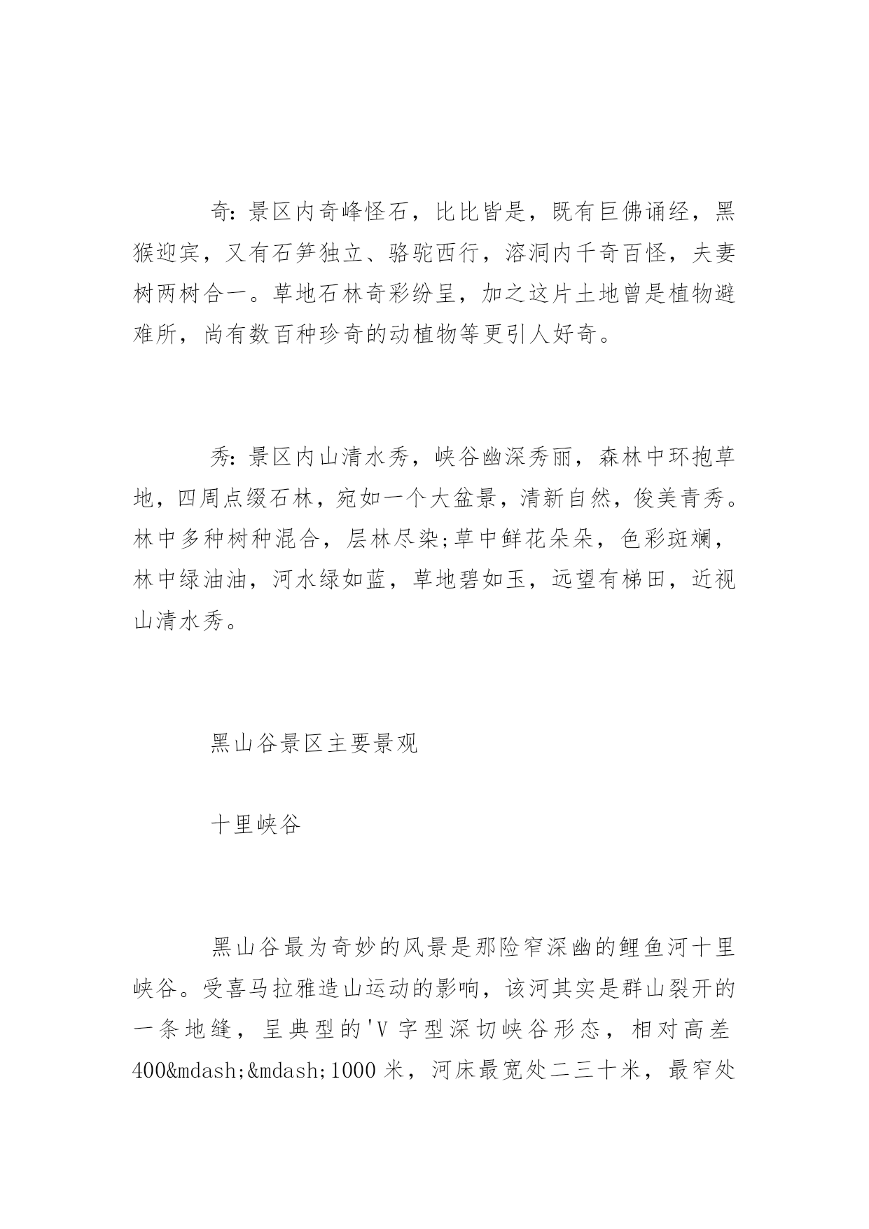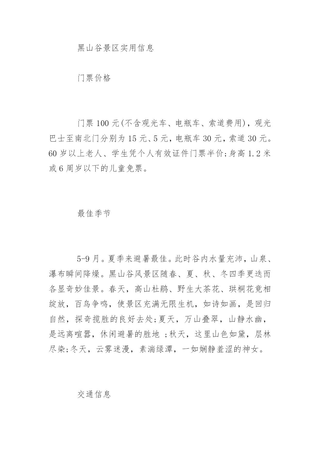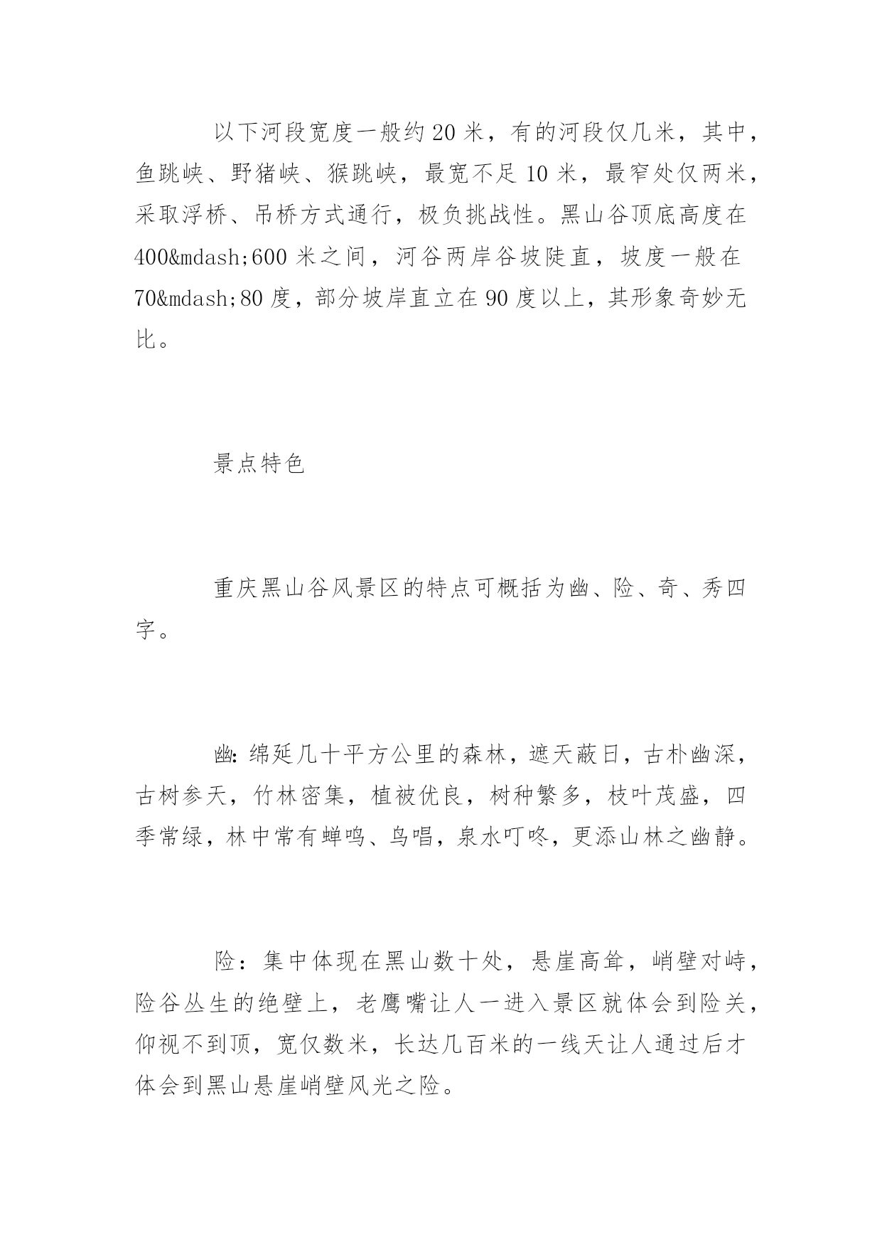 黑山谷景区旅游攻略黑山谷景区是中国最佳休闲名山,中国最佳绿色低碳旅游休闲胜地,亚洲大中华区最具魅力风景名胜区,重庆市巴渝新十二景,重庆市首家环保示范景区。以下是为大家分享的黑山谷景区旅游攻略,供大家参考借鉴,欢迎浏览!黑山谷景区简介黑山谷景区位于重庆市万盛经济技术开发区黑山镇境内,地理坐标为东经106°58'26,北纬28°51'46,距万盛城区20公里,距离重庆主城区110公里。与南川金佛山、贵州桐梓柏箐自然保护区毗邻。黑山谷所在山脉地处云贵高原向四川盆地过渡的大娄山余脉,是重庆和贵州两省市的一座界山。景区面积100平方公里,峡谷全长13公里,山顶与谷底高差最大1200米左右,景区内最高峰狮子峰海拔1973米,是直辖前重庆市的最高峰。四季风貌黑山谷风景区随春、夏、秋、冬四季更迭而各显奇妙佳景。春天,高山杜鹃、野生大茶花、珙桐花竞相绽放,百鸟争鸣,使景区充满无限生机,如诗如画,是回归自然,探奇揽胜的良好去处;夏天,万山叠翠,山静水幽,是远离喧嚣,休闲避暑的胜地;秋天,这里山色如黛,层林尽染;冬天,云雾迷漫,素湍绿潭,一如娴静羞涩的神女。黑山谷风景区全长13公里,其中有6公里的电瓶车车程,6公里的栈道和浮桥,1公里的上山观光索道(也可步行)。从景区大门进入,沿河而下至响水村一段,河谷宽约40—50米,沿河有平缓地,上面是丘陵和山地,呈阶梯状地形,河谷断面呈V字形,河面狭窄。以下河段宽度一般约20米,有的河段仅几米,其中,鱼跳峡、野猪峡、猴跳峡,最宽不足10米,最窄处仅两米,采取浮桥、吊桥方式通行,极负挑战性。黑山谷顶底高度在400—600米之间,河谷两岸谷坡陡直,坡度一般在70—80度,部分坡岸直立在90度以上,其形象奇妙无比。景点特色重庆黑山谷风景区的特点可概括为幽、险、奇、秀四字。幽:绵延几十平方公里的森林,遮天蔽日,古朴幽深,古树参天,竹林密集,植被优良,树种繁多,枝叶茂盛,四季常绿,林中常有蝉鸣、鸟唱,泉水叮咚,更添山林之幽静。险:集中体现在黑山数十处,悬崖高耸,峭壁对峙,险谷丛生的绝壁上,老鹰嘴让人一进入景区就体会到险关,仰视不到顶,宽仅数米,长达几百米的一线天让人通过后才体会到黑山悬崖峭壁风光之险。奇:景区内奇峰怪石,比比皆是,既有巨佛诵经,黑猴迎宾,又有石笋独立、骆驼西行,溶洞内千奇百怪,夫妻树两树合一。草地石林奇彩纷呈,加之这片土地曾是植物避难所,尚有数百种珍奇的动植物等更引人好奇。秀:景区内山清水秀,峡谷幽深秀丽,森林中环抱草地,四周点缀石林,宛如一个大盆景,清新自然,俊美青秀。林中多种树种混合,层林尽染;草中鲜花朵朵,色彩斑斓,林中绿油油,河水绿如蓝,草地碧如玉,远望有梯田,近视山清水秀。黑山谷景区主要景观十里峡谷黑山谷最为奇妙的风景是那险窄深幽的鲤鱼河十里峡谷。受喜马拉雅造山运动的影响,该河其实是群山裂开的一条地缝,呈典型的'V字型深切峡谷形态,相对高差400——1000米,河床最宽处二三十米,最窄处不足两米。峡谷两岸皆为植被茂密的悬崖,坡度在七八十度左右,部分岸壁由于洪水冲蚀底部,甚至逆倾为100余度,形成罕见的倒斜壁奇观。鲤鱼峡、野猪峡、神龙峡3峡,两岸峭壁由于倒倾幅度大,上端几乎蓬拢,河流成为暗河,阳光终日不到。人站在最窄的鲤鱼峡中,一只手可摸到重庆的山,另一只手则可摸到贵州的山。峡谷中滩多水急,钟乳石密布,古藤倒挂,瀑布悬垂,河水里有鱼蟹游戏,崖壁林木中有黑叶猴、山羊、野猪等出没,还有国家二级保护动物鼯鼠。游人步行在栈道和浮桥上,如在龙宫漫游。鱼跳峡鱼跳峡,因此段河谷中鱼跳潭而著名,每年春夏季节,鲤鱼河下游的鱼逗滩进入上游,都必须由此潭跳起越过落差达60公分高的鱼跳滩,一次又一次的展现各种鱼类出水腾越前行的奇观,所以当地人将此峡谷称之为鱼跳峡。两峡夹水,极为险峻,聪明的人类在不破原始森林自然的前提下,别出心裁地在水面上搭建了一座水中栈道,弯弯曲曲地在水面延伸开来,颇为奇特。飞鱼瀑飞鱼瀑奇丽雅然、水流连绵不断,气势雄伟磅礴,似九天银河泻地飞鱼瀑是万盛黑山谷最为壮观的瀑布,因瀑布的形状像鱼,故名飞鱼瀑布。夏季山洪季节,水流量可达5吨/秒,如九天银河泄地,气势十分磅礴。远远望去,银练飞挂,上可接天。直探瀑底,疑是银河落九天是李白的远观,不知近看他会发什么奇想,而所得到的就是自然之力的震撼。水柱从百米的高处飞落下来,已不是水了,竟是珍珠粒,击在瀑底石块上,掀起满天烟雾,慢慢升腾而上,珠沫玉屑扑面而来,汇成巨大的无形冲击波,让人呼吸困难。据说若有太阳,会形成七色彩虹。如此景象早已令人折服。中国的百慕大重庆最大的生态园——神奇迷人的黑山谷,被称