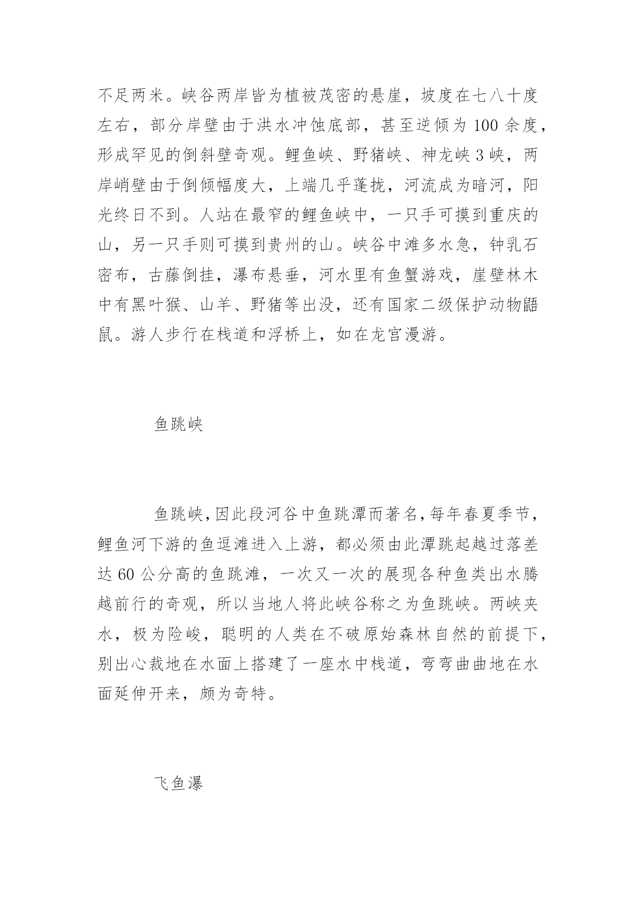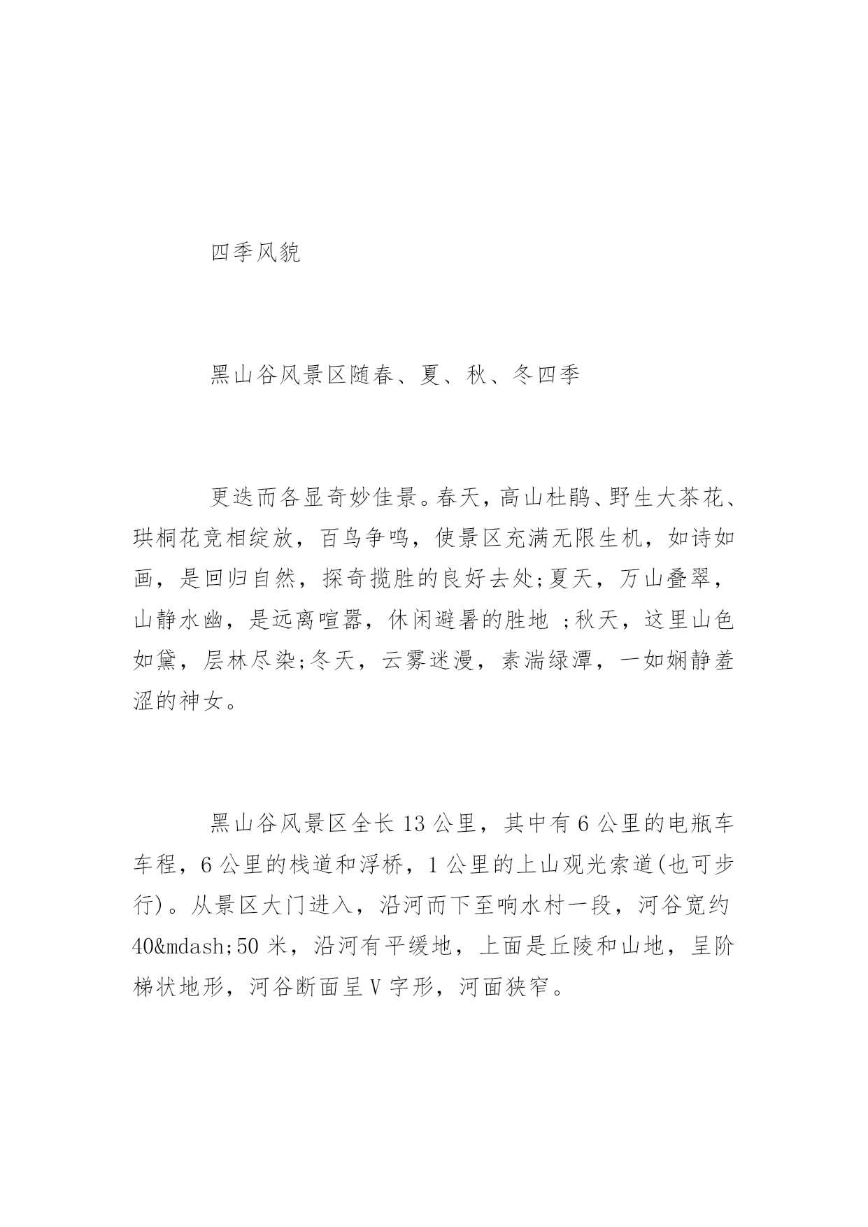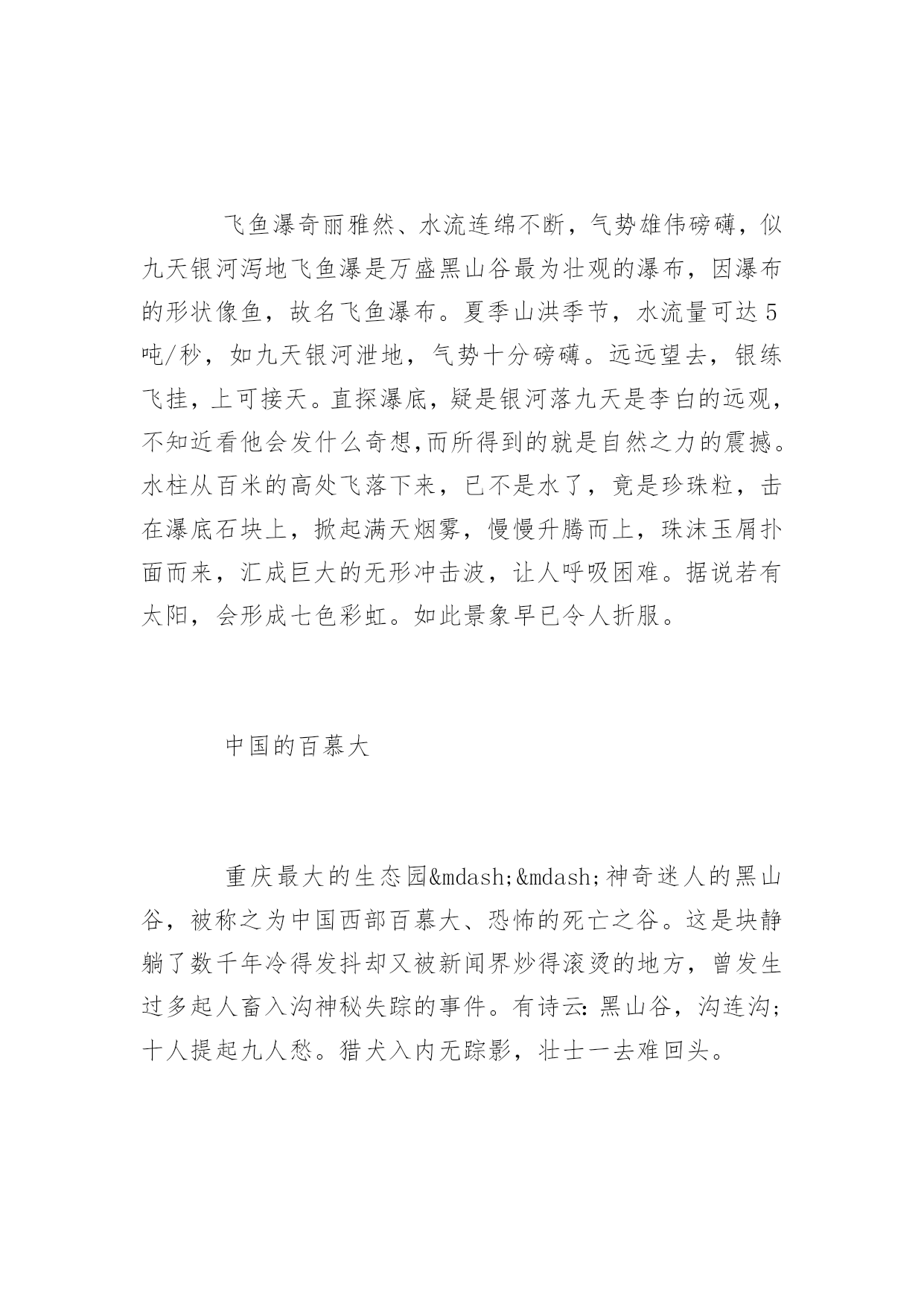 黑山谷景区旅游攻略黑山谷景区是中国最佳休闲名山,中国最佳绿色低碳旅游休闲胜地,亚洲大中华区最具魅力风景名胜区,重庆市巴渝新十二景,重庆市首家环保示范景区。以下是为大家分享的黑山谷景区旅游攻略,供大家参考借鉴,欢迎浏览!黑山谷景区简介黑山谷景区位于重庆市万盛经济技术开发区黑山镇境内,地理坐标为东经106°58'26,北纬28°51'46,距万盛城区20公里,距离重庆主城区110公里。与南川金佛山、贵州桐梓柏箐自然保护区毗邻。黑山谷所在山脉地处云贵高原向四川盆地过渡的大娄山余脉,是重庆和贵州两省市的一座界山。景区面积100平方公里,峡谷全长13公里,山顶与谷底高差最大1200米左右,景区内最高峰狮子峰海拔1973米,是直辖前重庆市的最高峰。四季风貌黑山谷风景区随春、夏、秋、冬四季更迭而各显奇妙佳景。春天,高山杜鹃、野生大茶花、珙桐花竞相绽放,百鸟争鸣,使景区充满无限生机,如诗如画,是回归自然,探奇揽胜的良好去处;夏天,万山叠翠,山静水幽,是远离喧嚣,休闲避暑的胜地;秋天,这里山色如黛,层林尽染;冬天,云雾迷漫,素湍绿潭,一如娴静羞涩的神女。黑山谷风景区全长13公里,其中有6公里的电瓶车车程,6公里的栈道和浮桥,1公里的上山观光索道(也可步行)。从景区大门进入,沿河而下至响水村一段,河谷宽约40—50米,沿河有平缓地,上面是丘陵和山地,呈阶梯状地形,河谷断面呈V字形,河面狭窄。以下河段宽度一般约20米,有的河段仅几米,其中,鱼跳峡、野猪峡、猴跳峡,最宽不足10米,最窄处仅两米,采取浮桥、吊桥方式通行,极负挑战性。黑山谷顶底高度在400—600米之间,河谷两岸谷坡陡直,坡度一般在70—80度,部分坡岸直立在90度以上,其形象奇妙无比。景点特色重庆黑山谷风景区的特点可概括为幽、险、奇、秀四字。幽:绵延几十平方公里的森林,遮天蔽日,古朴幽深,古树参天,竹林密集,植被优良,树种繁多,枝叶茂盛,四季常绿,林中常有蝉鸣、鸟唱,泉水叮咚,更添山林之幽静。险:集中体现在黑山数十处,悬崖高耸,峭壁对峙,险谷丛生的绝壁上,老鹰嘴让人一进入景区就体会到险关,仰视不到顶,宽仅数米,长达几百米的一线天让人通过后才体会到黑山悬崖峭壁风光之险。奇:景区内奇峰怪石,比比皆是,既有巨佛诵经,黑猴迎宾,又有石笋独立、骆驼西行,溶洞内千奇百怪,夫妻树两树合一。草地石林奇彩纷呈,加之这片土地曾是植物避难所,尚有数百种珍奇的动植物等更引人好奇。秀:景区内山清水秀,峡谷幽深秀丽,森林中环抱草地,四周点缀石林,宛如一个大盆景,清新自然,俊美青秀。林中多种树种混合,层林尽染;草中鲜花朵朵,色彩斑斓,林中绿油油,河水绿如蓝,草地碧如玉,远望有梯田,近视山清水秀。黑山谷景区主要景观十里峡谷黑山谷最为奇妙的风景是那险窄深幽的鲤鱼河十里峡谷。受喜马拉雅造山运动的影响,该河其实是群山裂开的一条地缝,呈典型的'V字型深切峡谷形态,相对高差400——1000米,河床最宽处二三十米,最窄处不足两米。峡谷两岸皆为植被茂密的悬崖,坡度在七八十度左右,部分岸壁由于洪水冲蚀底部,甚至逆倾为100余度,形成罕见的倒斜壁奇观。鲤鱼峡、野猪峡、神龙峡3峡,两岸峭壁由于倒倾幅度大,上端几乎蓬拢,河流成为暗河,阳光终日不到。人站在最窄的鲤鱼峡中,一只手可摸到重庆的山,另一只手则可摸到贵州的山。峡谷中滩多水急,钟乳石密布,古藤倒挂,瀑布悬垂,河水里有鱼蟹游戏,崖壁林木中有黑叶猴、山羊、野猪等出没,还有国家二级保护动物鼯鼠。游人步行在栈道和浮桥上,如在龙宫漫游。鱼跳峡鱼跳峡,因此段河谷中鱼跳潭而著名,每年春夏季节,鲤鱼河下游的鱼逗滩进入上游,都必须由此潭跳起越过落差达60公分高的鱼跳滩,一次又一次的展现各种鱼类出水腾越前行的奇观,所以当地人将此峡谷称之为鱼跳峡。两峡夹水,极为险峻,聪明的人类在不破原始森林自然的前提下,别出心裁地在水面上搭建了一座水中栈道,弯弯曲曲地在水面延伸开来,颇为奇特。飞鱼瀑飞鱼瀑奇丽雅然、水流连绵不断,气势雄伟磅礴,似九天银河泻地飞鱼瀑是万盛黑山谷最为壮观的瀑布,因瀑布的形状像鱼,故名飞鱼瀑布。夏季山洪季节,水流量可达5吨/秒,如九天银河泄地,气势十分磅礴。远远望去,银练飞挂,上可接天。直探瀑底,疑是银河落九天是李白的远观,不知近看他会发什么奇想,而所得到的就是自然之力的震撼。水柱从百米的高处飞落下来,已不是水了,竟是珍珠粒,击在瀑底石块上,掀起满天烟雾,慢慢升腾而上,珠沫玉屑扑面而来,汇成巨大的无形冲击波,让人呼吸困难。据说若有太阳,会形成七色彩虹。如此景象早已令人折服。中国的百慕大重庆最大的生态园——神奇迷人的黑山谷,被称
