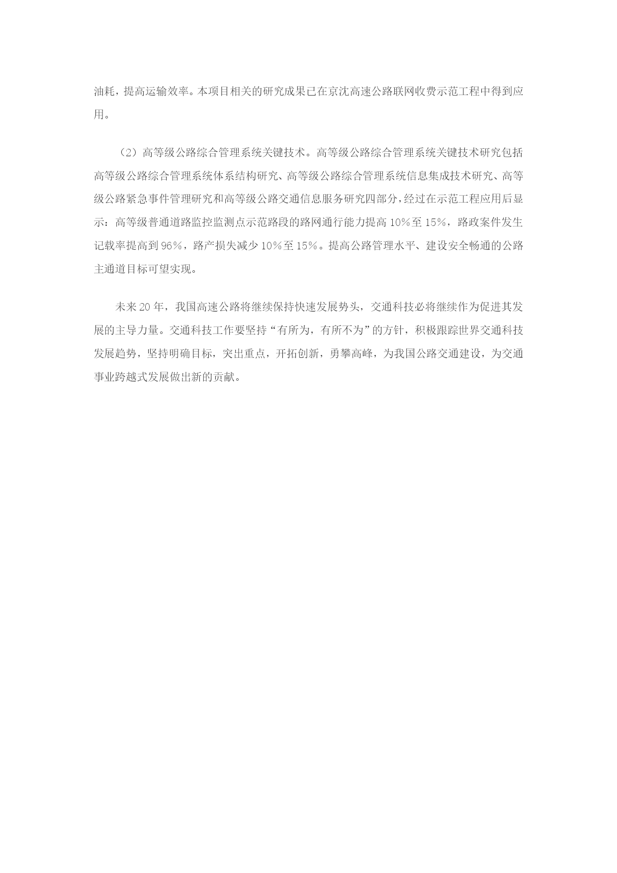 交通科技加速高速公路建设1988年10月,我国建成了第一条高速公路——上海沪嘉高速公路,标志着中国大陆高速公路建设实现了零的突破,我国公路交通现代化建设由此迈出了坚实的一步。15年来,我国高速公路建设高歌猛进,不断创造出新的奇迹。至2002年年底,全国高速公路里程已达2.5万公里,居世界第二位,为交通事业跨越式发展奠定了坚实的基础。回顾我国高速公路建设所取得的巨大成就,交通科技功不可没。实践证明,始终把科技作为发展交通的第一生产力,坚定不移地实施科教兴交战略,依靠科技进步,加强自主创新,才能加快实现我国公路交通现代化。长期以来,交通科技工作面向公路交通主战场,特别是紧密结合高速公路建设中的关键技术问题,集中力量,联合攻关,勇于创新,取得了突出成绩。高速公路建设为交通科技发展提供了广阔空间,催生出了一整套高速公路建设技术,从而为高速公路网络的拓展及建设水平、建设质量的提高提供了必要的技术保证。这也凝结着广大交通科技工作者的智慧和劳动。开发公路设计集成技术适应高速公路建设需要在高速公路建设初期,为提高高速公路设计水平,交通科研人员通过“七五”攻关,开发了高等级公路路线和桥梁计算机辅助设计系统,大大提高了设计效率和质量,彻底改变了我国公路工程的设计面貌,并通过优化设计降低了工程造价,提高了工程质量,同时为公路行业电子计算机和信息技术的应用打下了良好基础。到“九五”期间,通过实施“国道主干线设计集成系统开发研究”科技攻关项目,开发应用全球卫星定位技术、航测与遥感技术、地理信息技术,开发数字地图、数字摄影测量技术,提高完善了公路CAD技术,形成了高效数据采集、数据处理、计算机辅助设计为主体的公路勘察设计集成技术。开发公路工程施工新技术提高高速公路建设技术含量为适应高速公路建设需要,交通科研人员在“七五”期间重点研究开发了高等级公路半刚性基层沥青路面和抗滑表层路面修筑成套技术,解决了沥青路面使用寿命短、开裂严重以及没有国产重交通道路沥青的现实问题;“八五”期间开发了高等级公路水泥混凝土路面材料和应用技术、道路沥青性能级半刚性基层沥青路面典型结构技术以及实现路面机械化施工的高效设备,大大提高了公路建设机械化水平,保证了建设质量和建设速度;修建高速公路初期,在东部沿海地区首先面临水网地区的软土和过湿土路基问题的困扰,通过科技攻关研究开发了软土和过湿土路基加固设计方法、加固技术和施工工艺,提出了高等级公路路基路面综合排水技术措施,为高速公路发展提供了科技保障。与此同时,通过引进、消化和创新,研究开发了路桥质量检测技术和路面管理系统(CPMS),进一步提高了基础设施管理水平。开发桥梁建设新技术提升桥梁建设整体水平随着高速公路的迅猛发展,与之相适应的桥梁建设技术也进一步向深入基础大跨径的高科技含量方面发展。我国桥梁建设技术总体水平已进入国际先进行列,在10年的时间里,跨径超越了400米直至突破1000米,建成的虎门大桥、万县长江大桥、南京长江二桥、江阴长江大桥以及建设中的润扬长江大桥都是在我国建桥史上具有划时代意义的桥梁,其中1385米跨径的江阴长江大桥获首届金·菲戈金奖,这也是中国首次获得国际桥梁大奖。开发安全、监控、通信、收费系统技术高速公路运营服务水平实现新飞跃结合我国高速公路建设实际现状和交通发展状况,交通科研人员开发了高速公路监控系统和安全系统以及通信和收费系统,确立了高速公路四大系统的发展模式,尤其是安全系统和收费系统已覆盖全部高速公路,使高速公路充分发挥安全、快速、经济、舒适的效益。经过十几年的艰苦努力,以“五纵七横”为主骨架的国道主干线交通运输网络体系已初具规模,缓解了公路交通“瓶颈”的制约,为我国经济腾飞起到了助推作用。在21世纪,我们进入全面建设小康社会的新阶段,如何应对社会经济发展带来的交通网络体系现代化的问题,已摆在面前。国家科技攻关项目“智能交通系统关键技术开发和示范工程”正是在这种背景下得以启动。目前我们正在研究和开发的主要技术有:(1)跨省市国道主干线电子收费技术。本项目主要研究解决跨省市国道主干线高速公路联网收费的一些关键技术,实现以国道主干线为主骨架的区域或省域联网收费,提高高速公路整体社会效益和服务水平,建立起高效、安全、开放、优质、快捷、先进的高速公路运营管理服务体系,使高速公路的资源得到充分的利用,减少公路交通堵塞、拥挤,降低汽车油耗,提高运输效率。本项目相关的研究成果已在京沈高速公路联网收费示范工程中得到应用。(2)高等级公路综合管理系统关键技术。高等级公路综合管理系统关键技术研究包括高等级公路综合管理系统体系结构研究、高等级公路综合管理系统信息集成技术研究、高等级公路紧急事件管理研究和高等级公路交通信息服务研究四部分,经过在示范工程应用后显示:高等级普通道路监控监测点示范路段