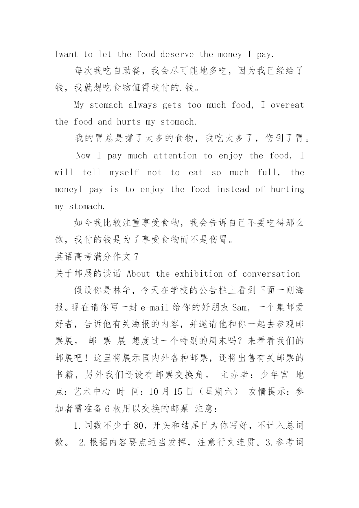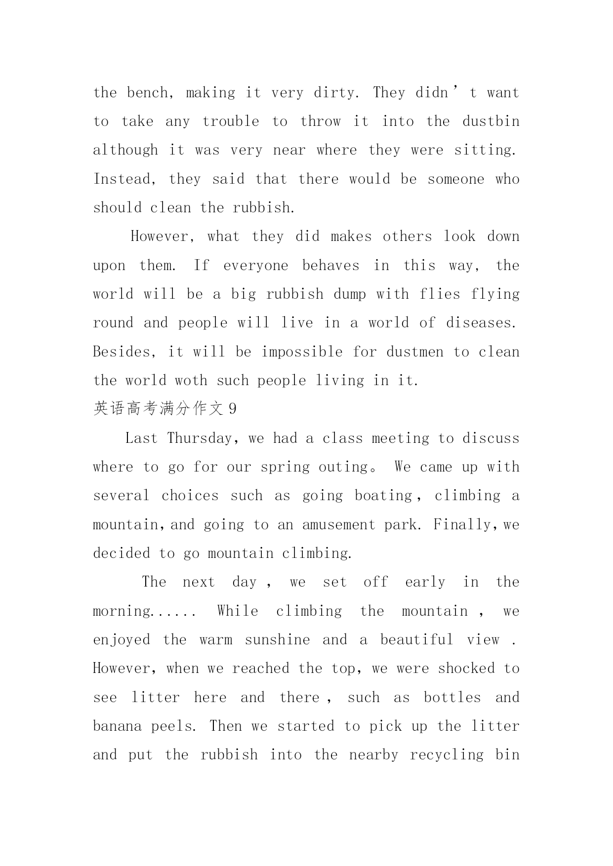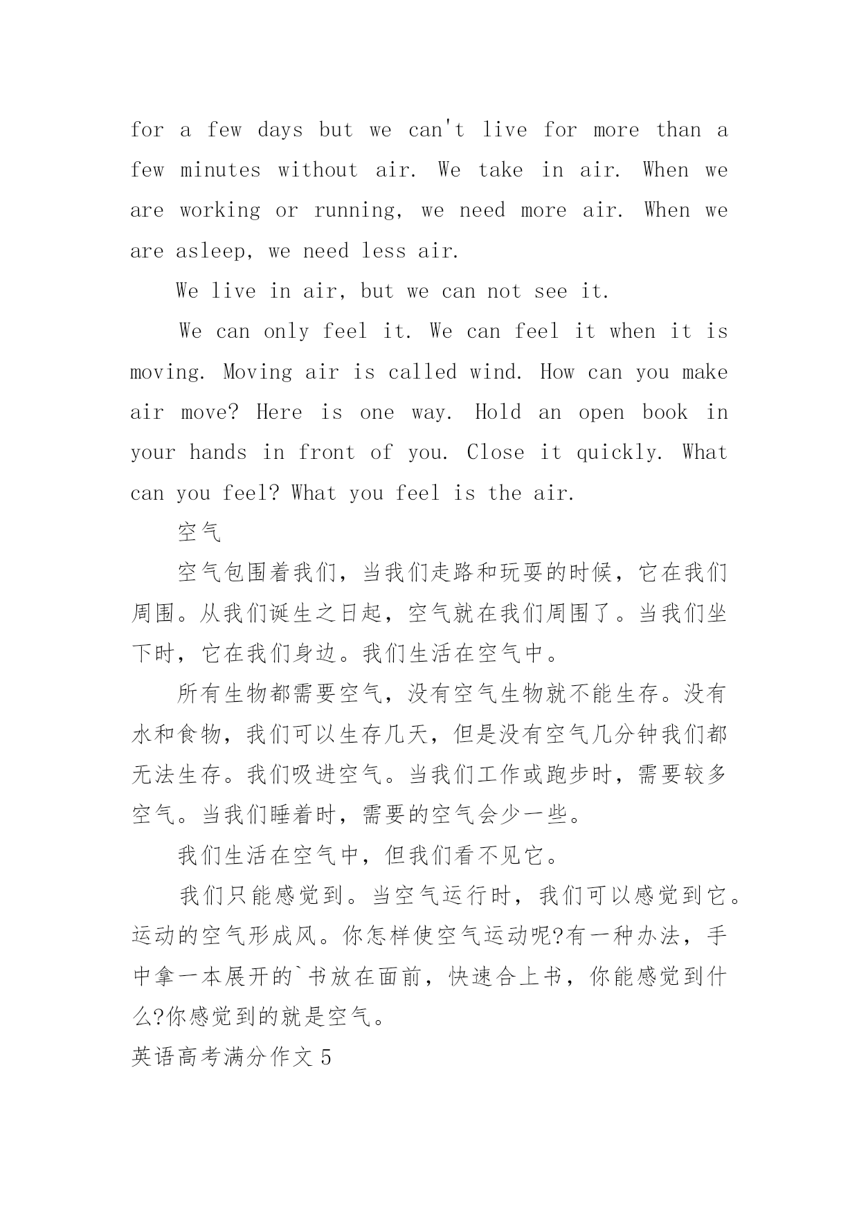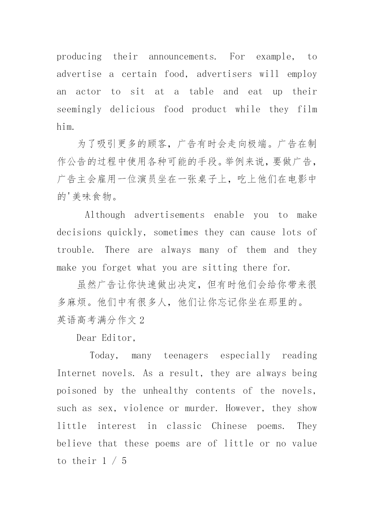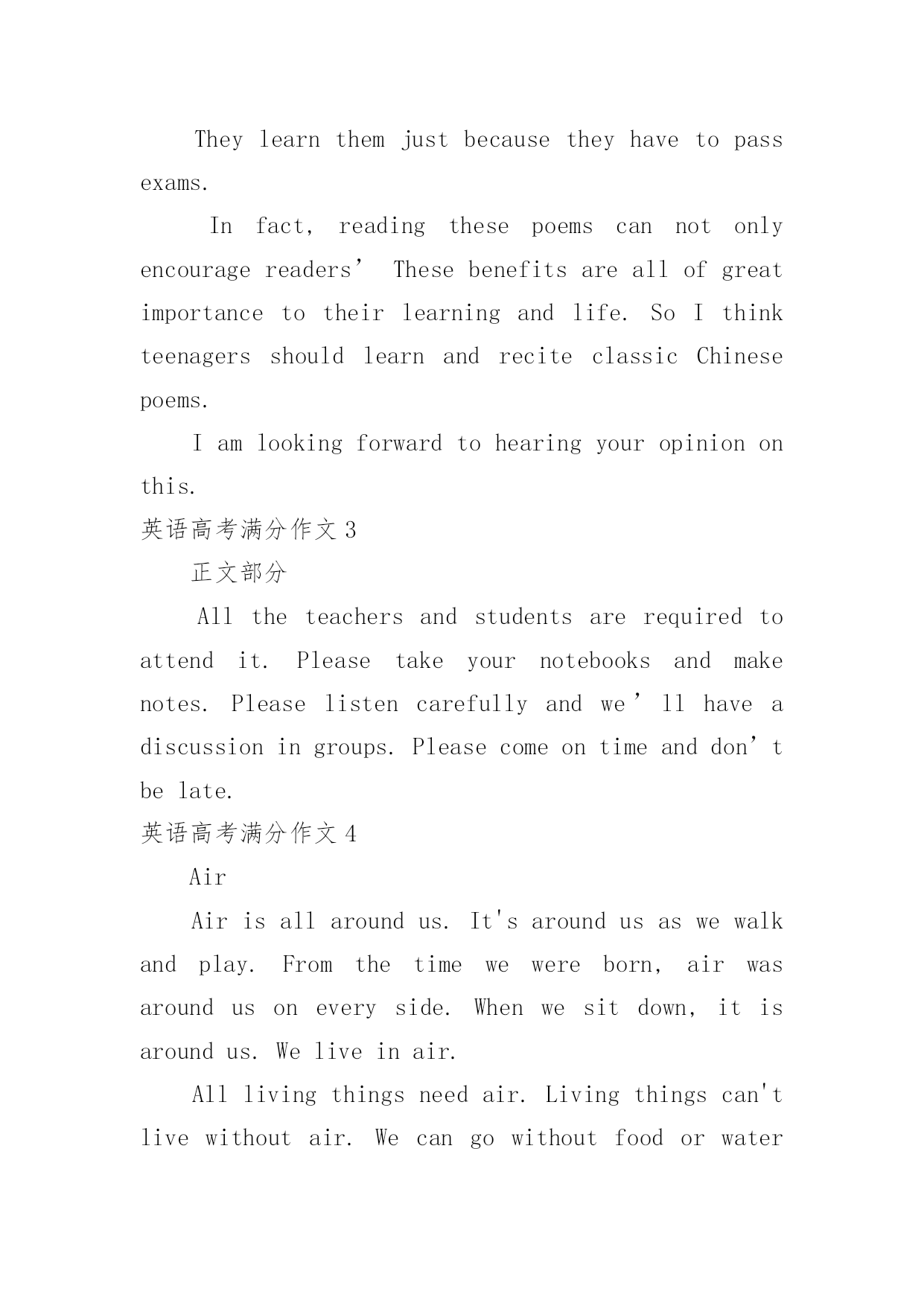 英语高考满分作文英语高考满分作文在平平淡淡的学习、工作、生活中,大家都跟作文打过交道吧,作文根据写作时限的不同可以分为限时作文和非限时作文。如何写一篇有思想、有文采的作文呢?以下是小编为大家收集的英语高考满分作文,希望能够帮助到大家。英语高考满分作文1Advertisementsappeareverywhereinmodernsociety.Whenyouwalkalongthestreets,youcanseelargeboardswithprettygirlssmilingatyou.Youreadnewspapers,andseehalfofthepagescoveredwithads.YouturnonTV,andyouseecommercialadvertisementsagain.Whetheryoulikeitornot,advertisementsfillyourlife.广告在现代社会中无处不在。当你走在街上,你可以看到大的董事会与漂亮的女孩在你微笑。你看报纸,看到有一半的网页上覆盖着广告。你打开电视,你看到商业广告。不管你喜欢不喜欢,广告填满你的生活。Inordertoattractmorecustomers,advertisementswillsometimesgotoextremes.Advertisementsuseeverypossiblemeansinproducingtheirannouncements.Forexample,toadvertiseacertainfood,advertiserswillemployanactortositatatableandeatuptheirseeminglydeliciousfoodproductwhiletheyfilmhim.为了吸引更多的顾客,广告有时会走向极端。广告在制作公告的过程中使用各种可能的手段。举例来说,要做广告,广告主会雇用一位演员坐在一张桌子上,吃上他们在电影中的'美味食物。Althoughadvertisementsenableyoutomakedecisionsquickly,sometimestheycancauselotsoftrouble.Therearealwaysmanyofthemandtheymakeyouforgetwhatyouaresittingtherefor.虽然广告让你快速做出决定,但有时他们会给你带来很多麻烦。他们中有很多人,他们让你忘记你坐在那里的。英语高考满分作文2DearEditor,Today,manyteenagersespeciallyreadingInternetnovels.Asaresult,theyarealwaysbeingpoisonedbytheunhealthycontentsofthenovels,suchassex,violenceormurder.However,theyshowlittleinterestinclassicChinesepoems.Theybelievethatthesepoemsareoflittleornovaluetotheir1/5Theylearnthemjustbecausetheyhavetopassexams.Infact,readingthesepoemscannotonlyencouragereaders’Thesebenefitsareallofgreatimportancetotheirlearningandlife.SoIthinkteenagersshouldlearnandreciteclassicChinesepoems.Iamlookingforwardtohearingyouropiniononthis.英语高考满分作文3正文部分Alltheteachersandstudentsarerequiredtoattendit.Pleasetakeyournotebooksandmakenotes.Pleaselistencarefullyandwe’llhaveadiscussioningroups.Pleasecomeontimeanddon’tbelate.英语高考满分作文4AirAirisallaroundus.It'saroundusaswewalkandplay.Fromthetimewewereborn,airwasaroundusoneveryside.Whenwesitdown,itisaroundus.Weliveinair.Alllivingthingsneedair.Livingthingscan'tlivewithoutair.Wecangowithoutfoodorwaterforafewda