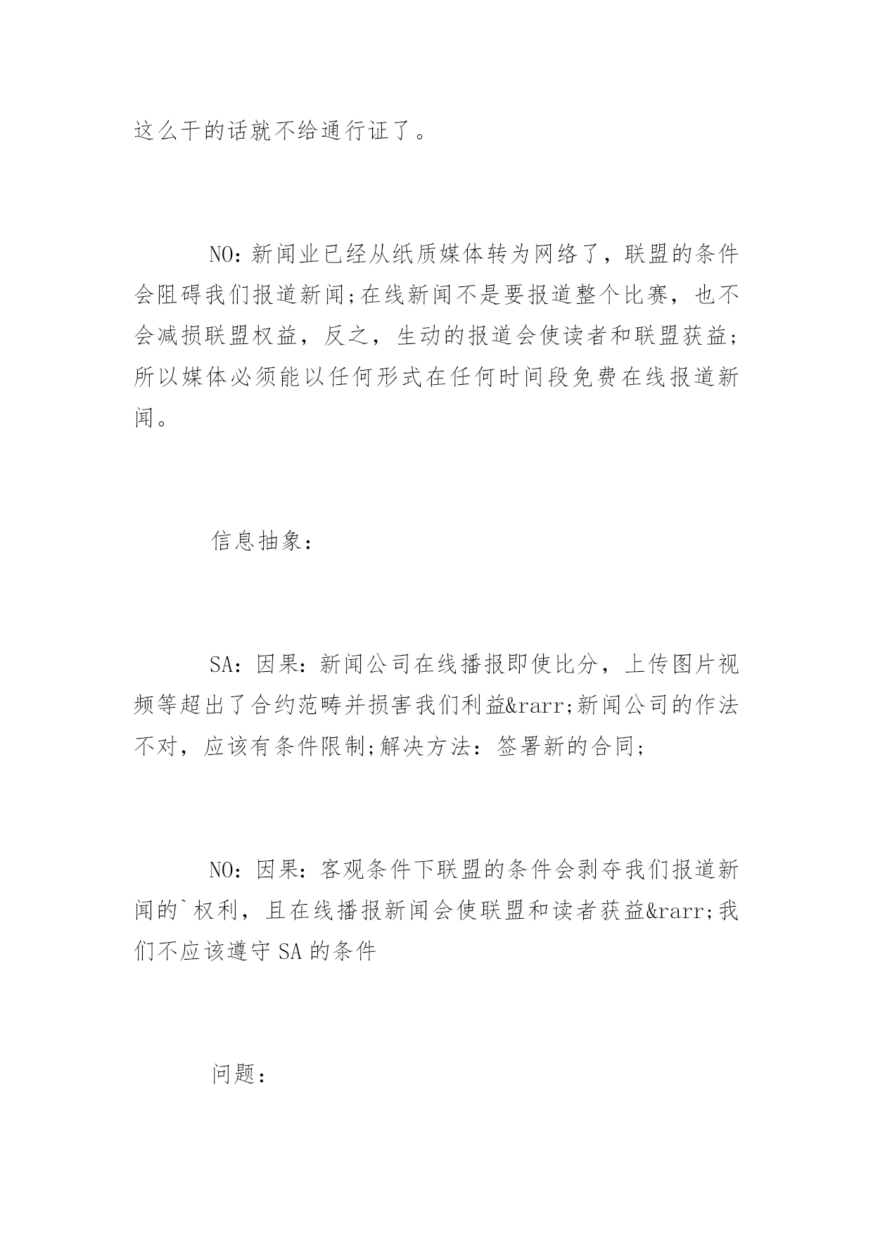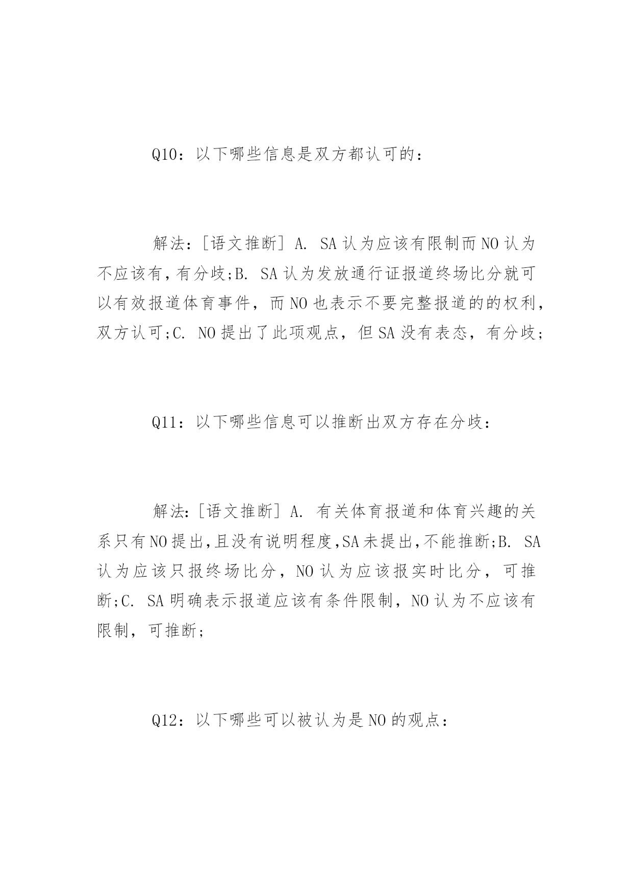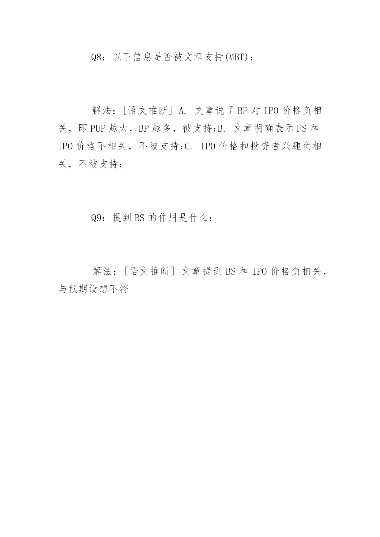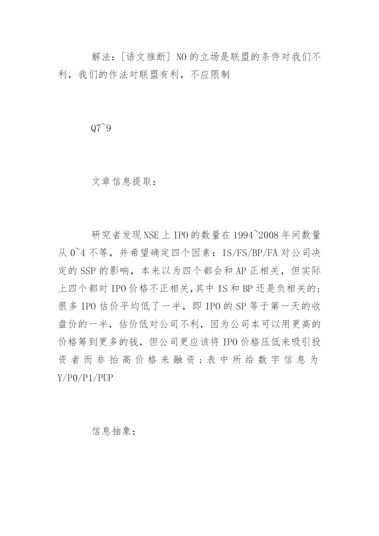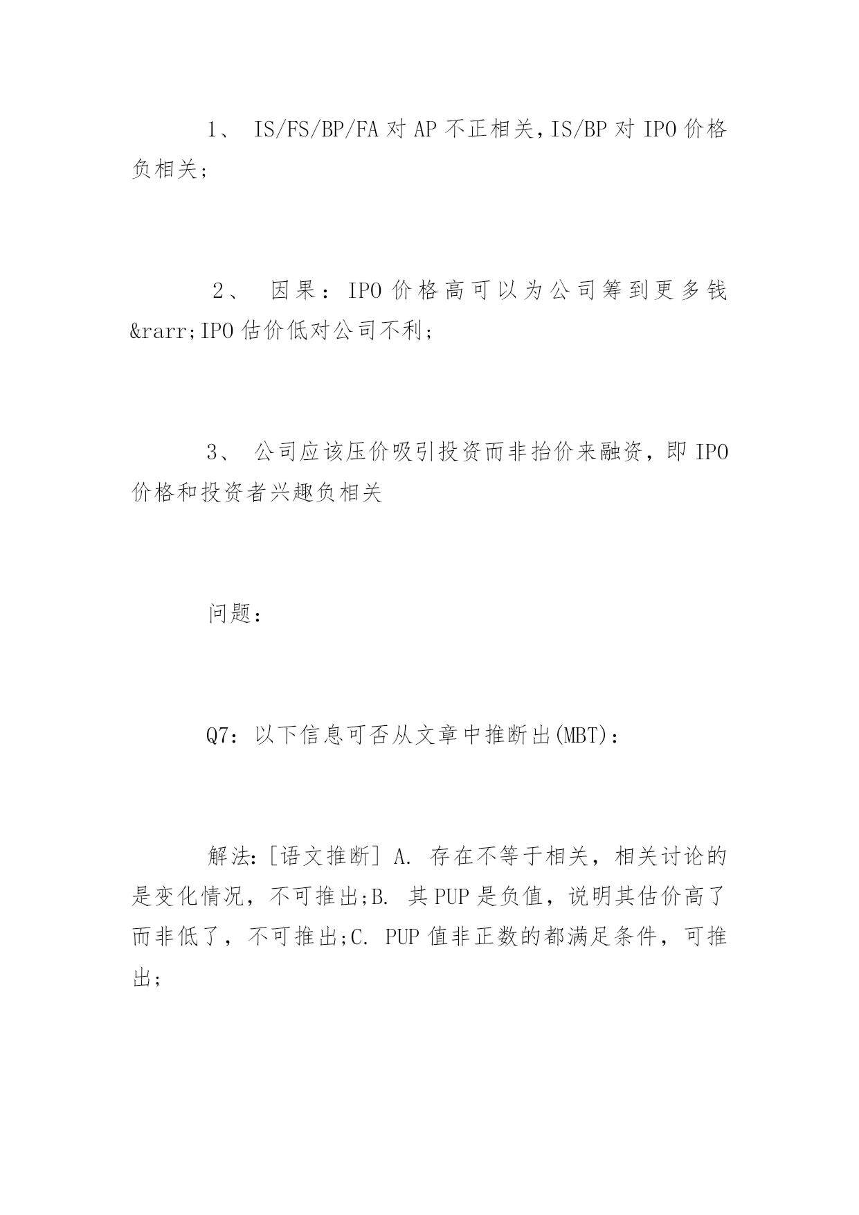 GMATIR考试复习试题GMATIR考试复习必备精选试题学好靠信心,求教靠虚心,探求靠专心,长进靠恒心。以下是小编为大家搜索整理的GMATIR考试复习必备精选试题,希望能给大家带来帮助!更多精彩内容请及时关注我们应届毕业生考试网!Q10~12文章信息提取:SA:体育联盟和电视公司对报道权有协议,电视公司给我们钱,资助联盟,我们给记者免费通行证,帮助他们有效报道体育新闻,包括最终比分;然而现在一些机构把视频图片即时比分等都放到了网上,这种行为应该被限制,因为这已经不是体育新闻报道的范畴了,这对合约和联盟权利都不利;希望报道这些信息的机构应该再签署相应的合同,不这么干的话就不给通行证了。NO:新闻业已经从纸质媒体转为网络了,联盟的条件会阻碍我们报道新闻;在线新闻不是要报道整个比赛,也不会减损联盟权益,反之,生动的报道会使读者和联盟获益;所以媒体必须能以任何形式在任何时间段免费在线报道新闻。信息抽象:SA:因果:新闻公司在线播报即使比分,上传图片视频等超出了合约范畴并损害我们利益→新闻公司的作法不对,应该有条件限制;解决方法:签署新的合同;NO:因果:客观条件下联盟的条件会剥夺我们报道新闻的`权利,且在线播报新闻会使联盟和读者获益→我们不应该遵守SA的条件问题:Q10:以下哪些信息是双方都认可的:解法:[语文推断]A.SA认为应该有限制而NO认为不应该有,有分歧;B.SA认为发放通行证报道终场比分就可以有效报道体育事件,而NO也表示不要完整报道的的权利,双方认可;C.NO提出了此项观点,但SA没有表态,有分歧;Q11:以下哪些信息可以推断出双方存在分歧:解法:[语文推断]A.有关体育报道和体育兴趣的关系只有NO提出,且没有说明程度,SA未提出,不能推断;B.SA认为应该只报终场比分,NO认为应该报实时比分,可推断;C.SA明确表示报道应该有条件限制,NO认为不应该有限制,可推断;Q12:以下哪些可以被认为是NO的观点:解法:[语文推断]NO的立场是联盟的条件对我们不利,我们的作法对联盟有利,不应限制Q7~9文章信息提取:研究者发现NSE上IPO的数量在1994~2008年间数量从0~4不等,并希望确定四个因素:IS/FS/BP/FA对公司决定的SSP的影响,本来以为四个都会和AP正相关,但实际上四个都对IPO价格不正相关,其中IS和BP还是负相关的;很多IPO估价平均低了一半,即IPO的SP等于第一天的收盘价的一半,估价低对公司不利,因为公司本可以用更高的价格筹到更多的钱,但公司更应该将IPO价格压低来吸引投资者而非抬高价格来融资;表中所给数字信息为Y/P0/P1/PUP信息抽象:1、IS/FS/BP/FA对AP不正相关,IS/BP对IPO价格负相关;2、因果:IPO价格高可以为公司筹到更多钱→IPO估价低对公司不利;3、公司应该压价吸引投资而非抬价来融资,即IPO价格和投资者兴趣负相关问题:Q7:以下信息可否从文章中推断出(MBT):解法:[语文推断]A.存在不等于相关,相关讨论的是变化情况,不可推出;B.其PUP是负值,说明其估价高了而非低了,不可推出;C.PUP值非正数的都满足条件,可推出;Q8:以下信息是否被文章支持(MBT):解法:[语文推断]A.文章说了BP对IPO价格负相关,即PUP越大,BP越多,被支持;B.文章明确表示FS和IPO价格不相关,不被支持;C.IPO价格和投资者兴趣负相关,不被支持;Q9:提到BS的作用是什么:解法:[语文推断]文章提到BS和IPO价格负相关,与预期设想不符