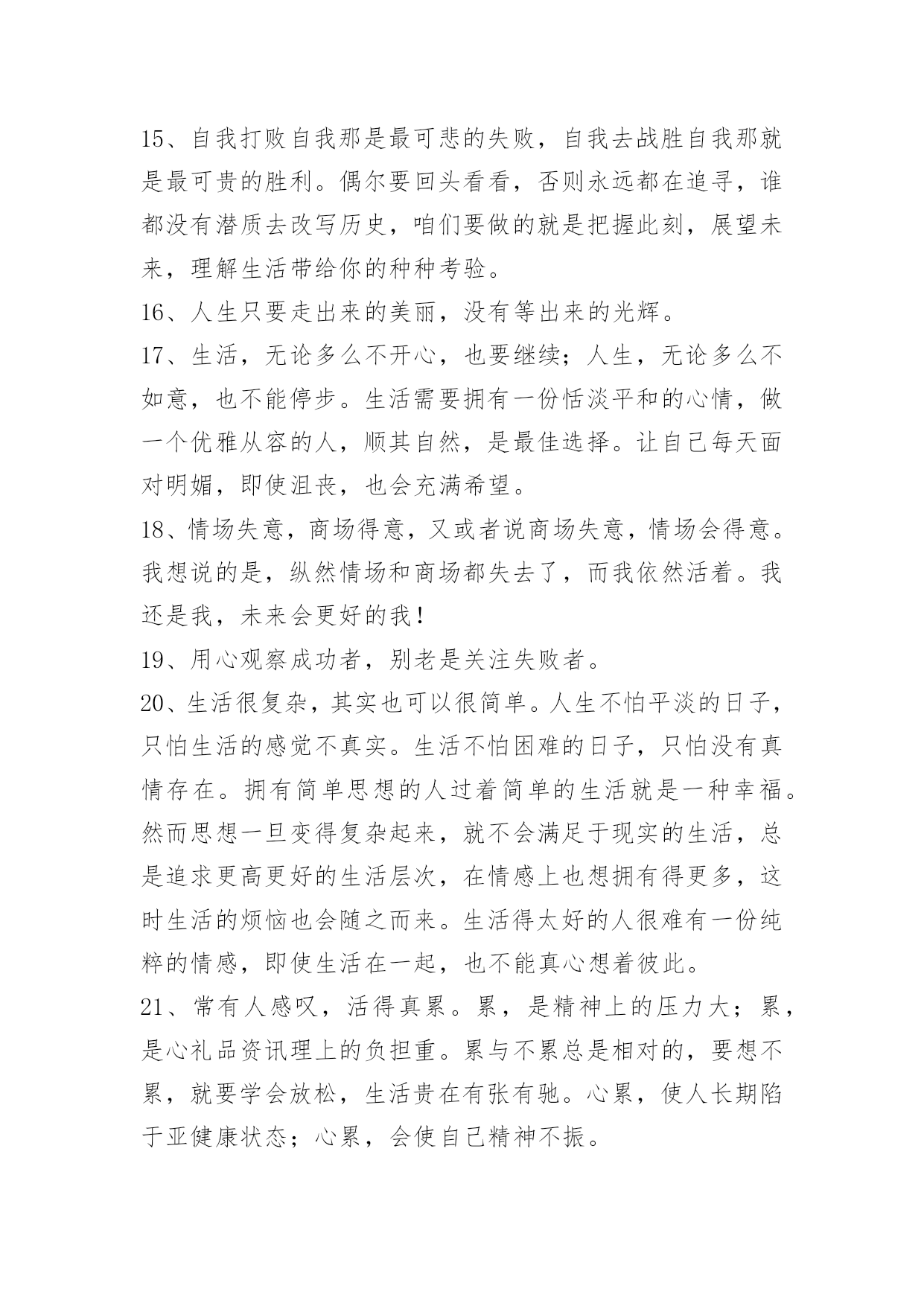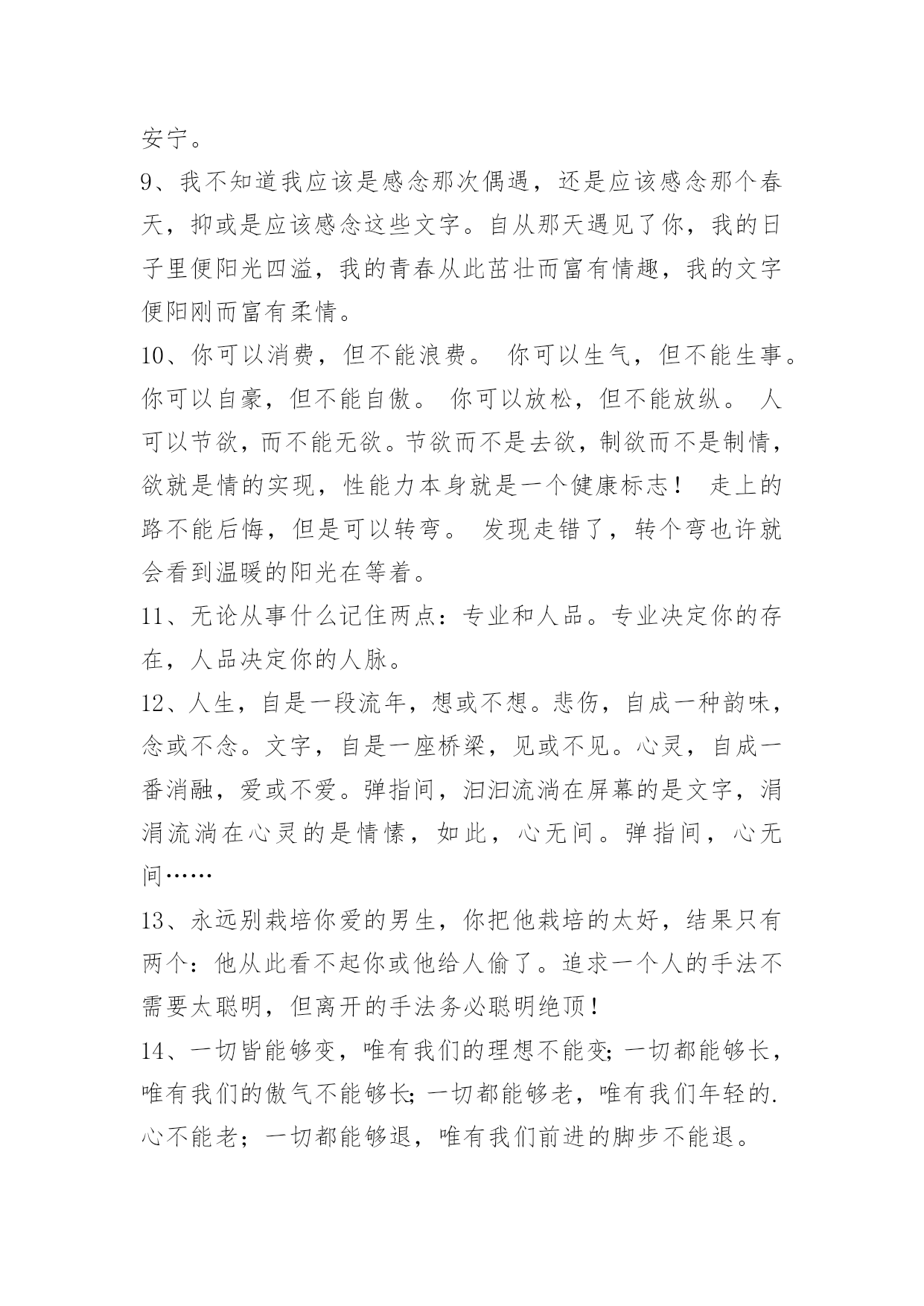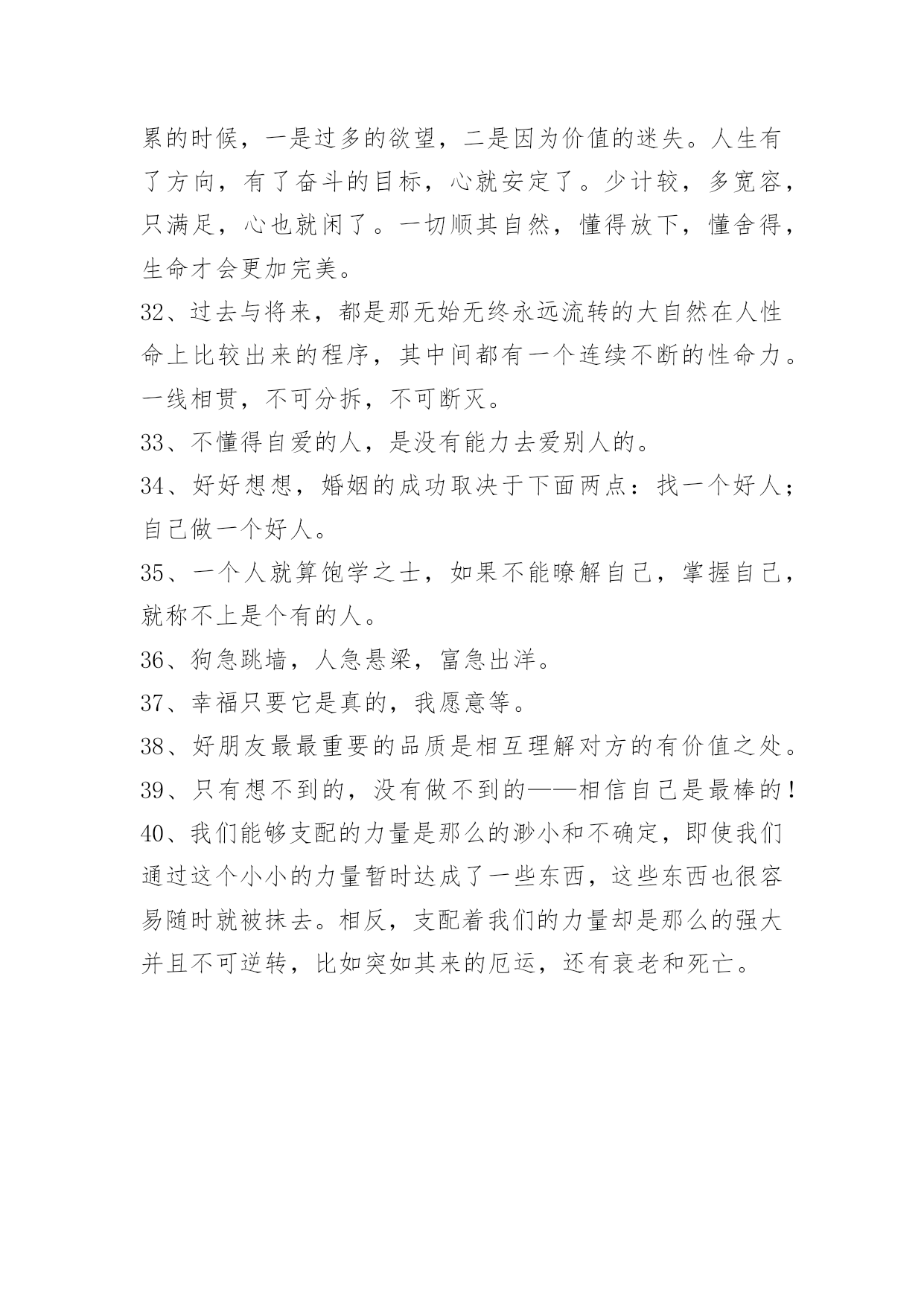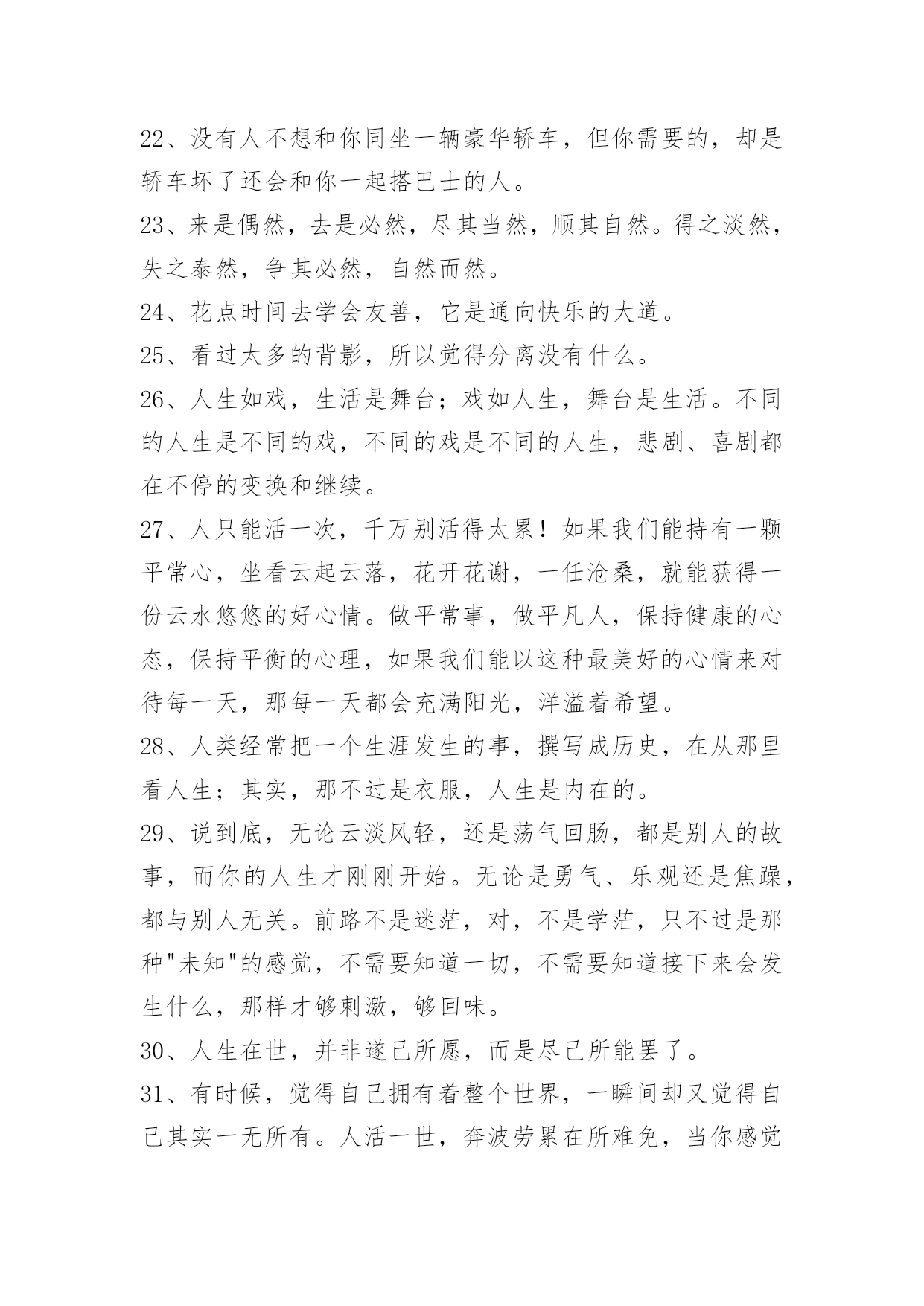 人生感悟句子40条【必备】2022年人生感悟句子集合40条工作随着志向起,成功随着工作来。以下是小编给各位读者分享的人生感悟句子40条,欢迎阅读借鉴。1、工作计划簿有用吗,有,至少可以让一个人培养出三分钟的热度,拟定目标不仅是可以督促自己,也是能让别人得知你是有哪些需要。2、有的人爱说目标很难到达,那是由于他们的意志薄弱所致。3、你想要幸福,你就下决心去追求幸福,给自己一个清晰明确的目标,然后一步步去实现它,你会发现你是能够做很多事情的。4、如果梦想不曾坠落悬崖千钧一发,又怎会懂得执着的人拥有隐形翅膀。5、仇恨如同潮水在胸中汹涌起伏。6、谀谄之人不可疗治,奸邪之人不可疗治,恶口之人不可疗治,嫉妒之人不可疗治,无反复之人不可疗治。7、为自己找借口,就不会进步。8、做人要当提起时提起,当放下时放下。功名富贵放不下,生命就在功名富贵里耗费;悲欢离合放不下,生命就在悲欢离合里挣扎;放不下金钱,放不下名位,放不下人情,生命就在金钱、名位、人情里打滚;对是非放不下,对得失放不下,对善恶放不下,生命就在是非、善恶、得失里面,不得安宁。9、我不知道我应该是感念那次偶遇,还是应该感念那个春天,抑或是应该感念这些文字。自从那天遇见了你,我的日子里便阳光四溢,我的青春从此茁壮而富有情趣,我的文字便阳刚而富有柔情。10、你可以消费,但不能浪费。你可以生气,但不能生事。你可以自豪,但不能自傲。你可以放松,但不能放纵。人可以节欲,而不能无欲。节欲而不是去欲,制欲而不是制情,欲就是情的实现,性能力本身就是一个健康标志!走上的路不能后悔,但是可以转弯。发现走错了,转个弯也许就会看到温暖的阳光在等着。11、无论从事什么记住两点:专业和人品。专业决定你的存在,人品决定你的人脉。12、人生,自是一段流年,想或不想。悲伤,自成一种韵味,念或不念。文字,自是一座桥梁,见或不见。心灵,自成一番消融,爱或不爱。弹指间,汩汩流淌在屏幕的是文字,涓涓流淌在心灵的是情愫,如此,心无间。弹指间,心无间……13、永远别栽培你爱的男生,你把他栽培的太好,结果只有两个:他从此看不起你或他给人偷了。追求一个人的手法不需要太聪明,但离开的手法务必聪明绝顶!14、一切皆能够变,唯有我们的理想不能变;一切都能够长,唯有我们的傲气不能够长;一切都能够老,唯有我们年轻的.心不能老;一切都能够退,唯有我们前进的脚步不能退。15、自我打败自我那是最可悲的失败,自我去战胜自我那就是最可贵的胜利。偶尔要回头看看,否则永远都在追寻,谁都没有潜质去改写历史,咱们要做的就是把握此刻,展望未来,理解生活带给你的种种考验。16、人生只要走出来的美丽,没有等出来的光辉。17、生活,无论多么不开心,也要继续;人生,无论多么不如意,也不能停步。生活需要拥有一份恬淡平和的心情,做一个优雅从容的人,顺其自然,是最佳选择。让自己每天面对明媚,即使沮丧,也会充满希望。18、情场失意,商场得意,又或者说商场失意,情场会得意。我想说的是,纵然情场和商场都失去了,而我依然活着。我还是我,未来会更好的我!19、用心观察成功者,别老是关注失败者。20、生活很复杂,其实也可以很简单。人生不怕平淡的日子,只怕生活的感觉不真实。生活不怕困难的日子,只怕没有真情存在。拥有简单思想的人过着简单的生活就是一种幸福。然而思想一旦变得复杂起来,就不会满足于现实的生活,总是追求更高更好的生活层次,在情感上也想拥有得更多,这时生活的烦恼也会随之而来。生活得太好的人很难有一份纯粹的情感,即使生活在一起,也不能真心想着彼此。21、常有人感叹,活得真累。累,是精神上的压力大;累,是心礼品资讯理上的负担重。累与不累总是相对的,要想不累,就要学会放松,生活贵在有张有驰。心累,使人长期陷于亚健康状态;心累,会使自己精神不振。22、没有人不想和你同坐一辆豪华轿车,但你需要的,却是轿车坏了还会和你一起搭巴士的人。23、来是偶然,去是必然,尽其当然,顺其自然。得之淡然,失之泰然,争其必然,自然而然。24、花点时间去学会友善,它是通向快乐的大道。25、看过太多的背影,所以觉得分离没有什么。26、人生如戏,生活是舞台;戏如人生,舞台是生活。不同的人生是不同的戏,不同的戏是不同的人生,悲剧、喜剧都在不停的变换和继续。27、人只能活一次,千万别活得太累!如果我们能持有一颗平常心,坐看云起云落,花开花谢,一任沧桑,就能获得一份云水悠悠的好心情。做平常事,做平凡人,保持健康的心态,保持平衡的心理,如果我们能以这种最美好的心情来对待每一天,那每一天都会充满阳光,洋溢着希望。28、人类经常把一个生涯发生的事,撰写成历史,在从那里看人生;其实,那不过是衣服,人生是内在的。29、说到底,无论云淡风轻,还是荡气回肠,都是别人的故事,而你的人生才刚刚开始。无论是勇气、乐观还是焦躁,都与别人无关。