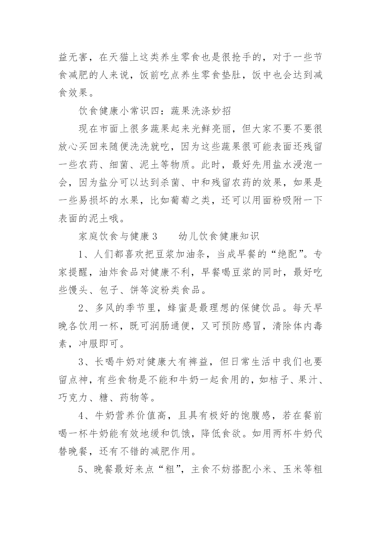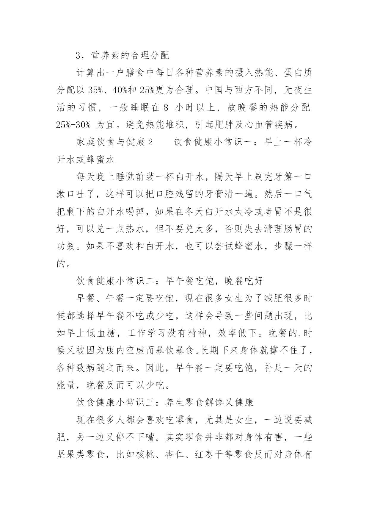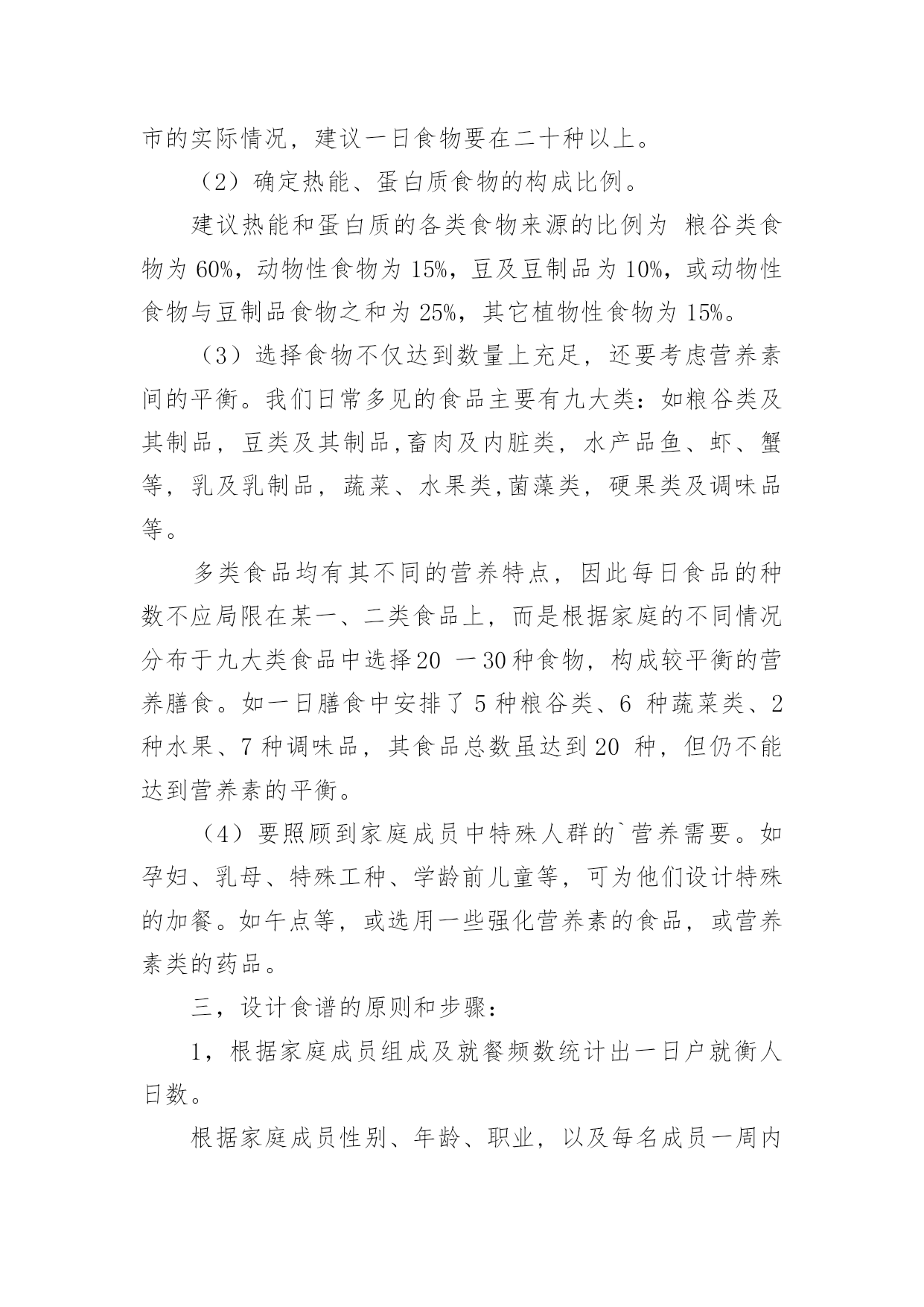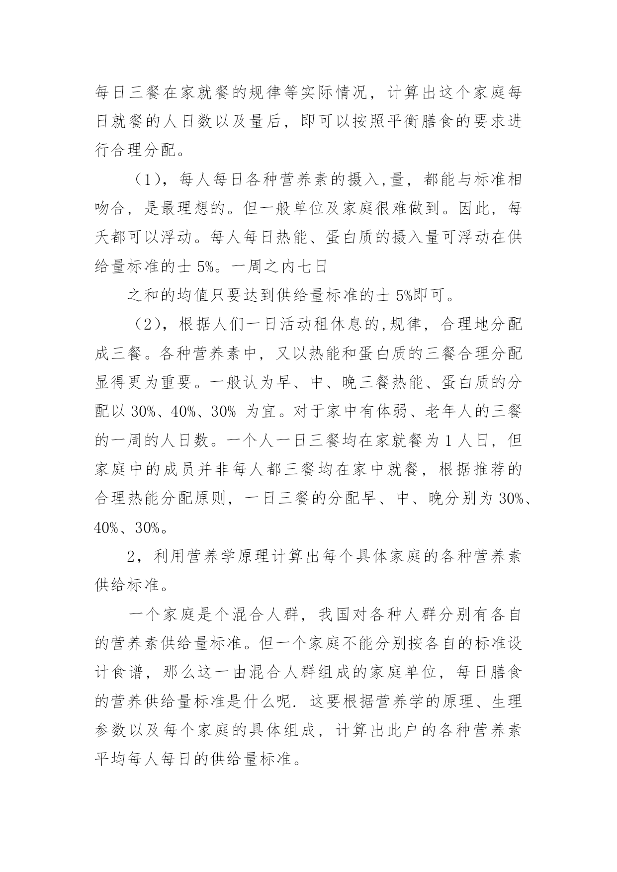 家庭饮食与健康家庭饮食与健康,众所周知,人体每天都需要有营养物质供给,才能满足身体的使用需求。而一日三餐需要规律进食,补充人体需要的营养元素,这样才能有效促进身体健康。一起来看看家庭饮食与健康。家庭饮食与健康1一,食品种类的选择:1,提供热能的主食,每周除大米、面粉外,可搭配1-2次的玉米、小米、黄豆等杂依,做到粗细搭配,起列营养互补的作用。2,保护性的动物性食品,一周内最好只安排两次猪肉、一次脏腑、一次鱼肉、一次鸡或鸭肉、一次牛或羊肉,做到多种肉食的搭配,既可保证动物吐蛋白质的供给,又可减少动物性脂肪的摄入。3,提供维生素、矿物质的蔬菜,应首选菜叶累,叶菜中绿色越深所含维生紊矿物质的童越高,因此叶菜中绿色叶菜要占叶菜量的半数,才能保证维生素的补充。4,辅以调味的调料食品,如葱、,姜、味精等,可以促进食欲。二,食品的搭配(1)选择多种食物,每种食物均有自己的营养特点。任何一种食物也不能满足人体对各种营养素的需要,必须多种食品搭配,才能起到营养素的互补作用。日本提出每日食物必须在三十种以上,才易达到平衡膳的要求,根据我市的实际情况,建议一日食物要在二十种以上。(2)确定热能、蛋白质食物的构成比例。建议热能和蛋白质的各类食物来源的比例为粮谷类食物为60%,动物性食物为15%,豆及豆制品为10%,或动物性食物与豆制品食物之和为25%,其它植物性食物为15%。(3)选择食物不仅达到数量上充足,还要考虑营养素间的平衡。我们日常多见的食品主要有九大类:如粮谷类及其制品,豆类及其制品,畜肉及内脏类,水产品鱼、虾、蟹等,乳及乳制品,蔬菜、水果类,菌藻类,硬果类及调味品等。多类食品均有其不同的营养特点,因此每日食品的种数不应局限在某一、二类食品上,而是根据家庭的不同情况分布于九大类食品中选择20一30种食物,构成较平衡的营养膳食。如一日膳食中安排了5种粮谷类、6种蔬菜类、2种水果、7种调味品,其食品总数虽达到20种,但仍不能达到营养素的平衡。(4)要照顾到家庭成员中特殊人群的`营养需要。如孕妇、乳母、特殊工种、学龄前儿童等,可为他们设计特殊的加餐。如午点等,或选用一些强化营养素的食品,或营养素类的药品。三,设计食谱的原则和步骤:1,根据家庭成员组成及就餐频数统计出一日户就衡人日数。根据家庭成员性别、年龄、职业,以及每名成员一周内每日三餐在家就餐的规律等实际情况,计算出这个家庭每日就餐的人日数以及量后,即可以按照平衡膳食的要求进行合理分配。(1),每人每日各种营养素的摄入,量,都能与标准相吻合,是最理想的。但一般单位及家庭很难做到。因此,每夭都可以浮动。每人每日热能、蛋白质的摄入量可浮动在供给量标准的士5%。一周之内七日之和的均值只要达到供给量标准的士5%即可。(2),根据人们一日活动租休息的,规律,合理地分配成三餐。各种营养素中,又以热能和蛋白质的三餐合理分配显得更为重要。一般认为早、中、晚三餐热能、蛋白质的分配以30%、40%、30%为宜。对于家中有体弱、老年人的三餐的一周的人日数。一个人一日三餐均在家就餐为1人日,但家庭中的成员并非每人都三餐均在家中就餐,根据推荐的合理热能分配原则,一日三餐的分配早、中、晚分别为30%、40%、30%。2,利用营养学原理计算出每个具体家庭的各种营养素供给标准。一个家庭是个混合人群,我国对各种人群分别有各自的营养素供给量标准。但一个家庭不能分别按各自的标准设计食谱,那么这一由混合人群组成的家庭单位,每日膳食的营养供给量标准是什么呢.这要根据营养学的原理、生理参数以及每个家庭的具体组成,计算出此户的各种营养素平均每人每日的供给量标准。3,营养素的合理分配计算出一户膳食中每日各种营养素的摄入热能、蛋白质分配以35%、40%和25%更为合理。中国与西方不同,无夜生活的习惯,一般睡眠在8小时以上,故晚餐的热能分配25%-30%为宜。避免热能堆积,引起肥胖及心血管疾病。家庭饮食与健康2饮食健康小常识一:早上一杯冷开水或蜂蜜水每天晚上睡觉前装一杯白开水,隔天早上刷完牙第一口漱口吐了,这样可以把口腔残留的牙膏清一遍。然后一口气把剩下的白开水喝掉,如果在冬天白开水太冷或者胃不是很好,可以兑一点热水,但不要兑太多,否则失去清理肠胃的功效。如果不喜欢和白开水,也可以尝试蜂蜜水,步骤一样的。饮食健康小常识二:早午餐吃饱,晚餐吃好早餐、午餐一定要吃饱,现在很多女生为了减肥很多时候都选择早午餐不吃或少吃,这样会导致一些问题出现,比如早上低血糖,工作学习没有精神,效率低下。晚餐的.时候又被因为腹内空虚而暴饮暴食。长期下来身体就撑不住了,各种致病随之而来。因此,早午餐一定要吃饱,补足一天的能量,晚餐反而可以少吃。饮食健康小常识三:养生零食解馋又健康现在很多人都会喜欢吃零食,尤其是女生,一边说要减肥,另一边又停不下嘴。其实零食并非都对身