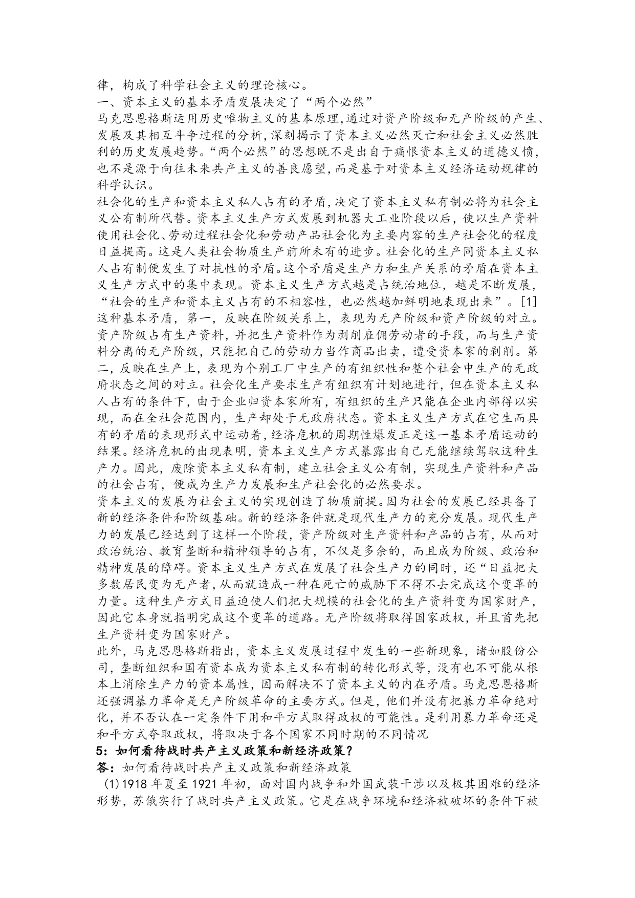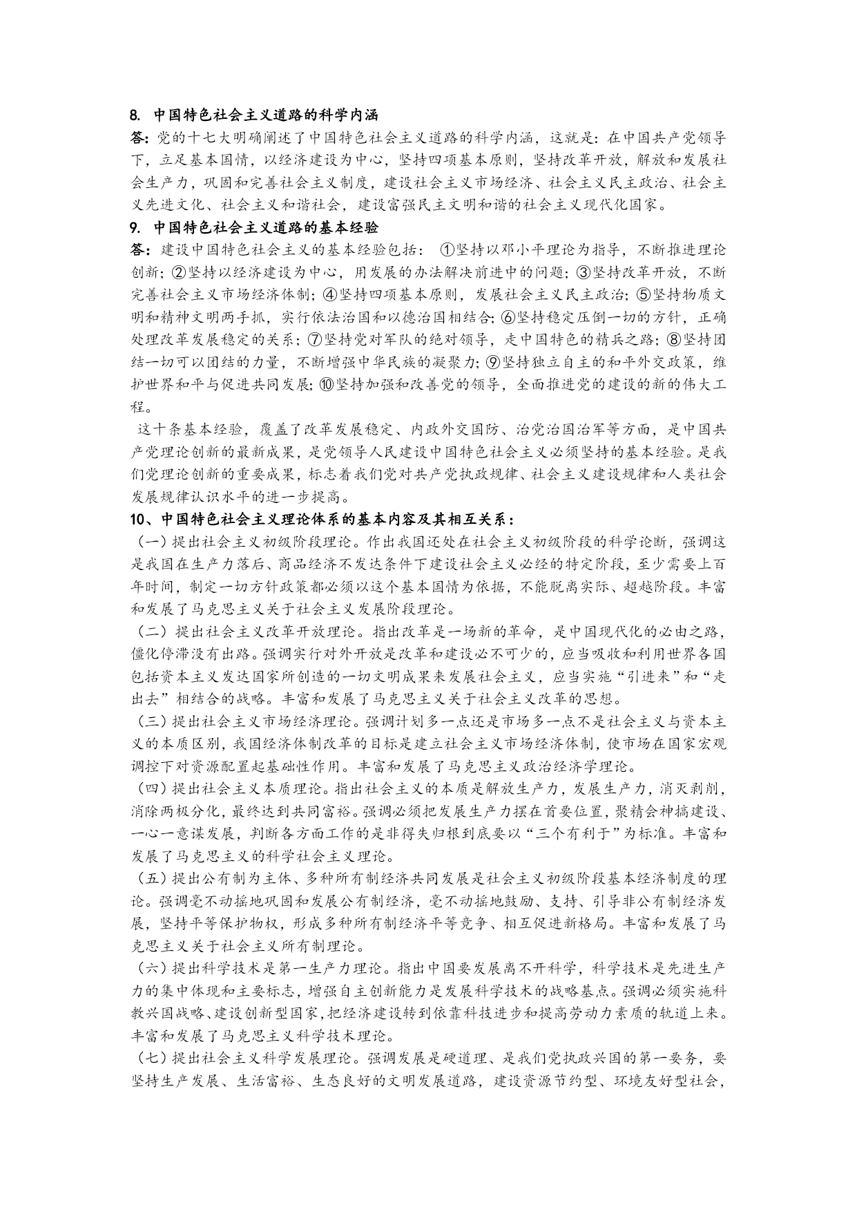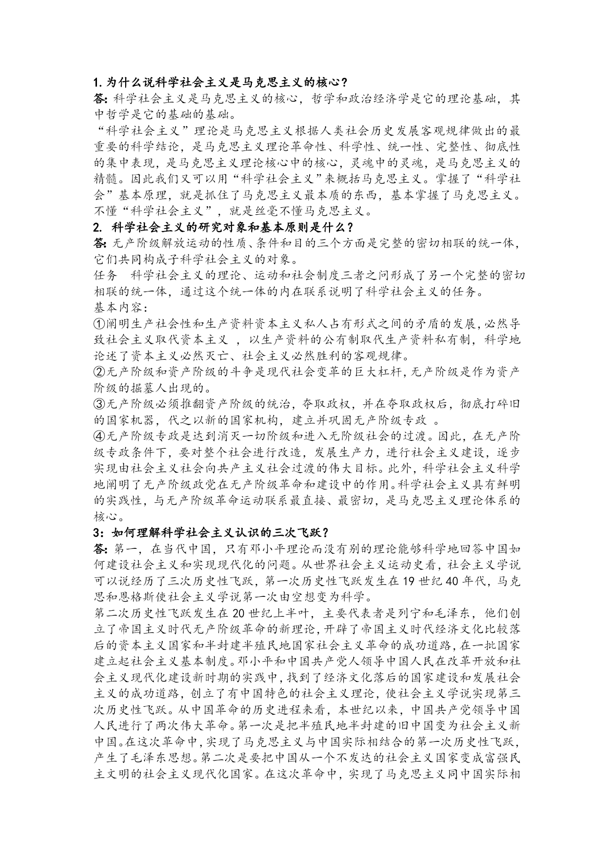 1.为什么说科学社会主义是马克思主义的核心?答:科学社会主义是马克思主义的核心,哲学和政治经济学是它的理论基础,其中哲学是它的基础的基础。“科学社会主义”理论是马克思主义根据人类社会历史发展客观规律做出的最重要的科学结论,是马克思主义理论革命性、科学性、统一性、完整性、彻底性的集中表现,是马克思主义理论核心中的核心,灵魂中的灵魂,是马克思主义的精髓。因此我们又可以用“科学社会主义”来概括马克思主义。掌握了“科学社会”基本原理,就是抓住了马克思主义最本质的东西,基本掌握了马克思主义。不懂“科学社会主义”,就是丝毫不懂马克思主义。2.科学社会主义的研究对象和基本原则是什么?答:无产阶级解放运动的性质、条件和目的三个方面是完整的密切相联的统一体,它们共同构成子科学社会主义的对象。任务科学社会主义的理论、运动和社会制度三者之问形成了另一个完整的密切相联的统一体,通过这个统一体的内在联系说明了科学社会主义的任务。基本内容:①阐明生产社会性和生产资料资本主义私人占有形式之间的矛盾的发展,必然导致社会主义取代资本主义,以生产资料的公有制取代生产资料私有制,科学地论述了资本主义必然灭亡、社会主义必然胜利的客观规律。②无产阶级和资产阶级的斗争是现代社会变革的巨大杠杆,无产阶级是作为资产阶级的掘墓人出现的。③无产阶级必须推翻资产阶级的统治,夺取政权,并在夺取政权后,彻底打碎旧的国家机器,代之以新的国家机构,建立并巩固无产阶级专政。④无产阶级专政是达到消灭一切阶级和进入无阶级社会的过渡。因此,在无产阶级专政条件下,要对整个社会进行改造,发展生产力,进行社会主义建设,逐步实现由社会主义社会向共产主义社会过渡的伟大目标。此外,科学社会主义科学地阐明了无产阶级政党在无产阶级革命和建设中的作用。科学社会主义具有鲜明的实践性,与无产阶级革命运动联系最直接、最密切,是马克思主义理论体系的核心。3:如何理解科学社会主义认识的三次飞跃?答:第一,在当代中国,只有邓小平理论而没有别的理论能够科学地回答中国如何建设社会主义和实现现代化的问题。从世界社会主义运动史看,社会主义学说可以说经历了三次历史性飞跃,第一次历史性飞跃发生在19世纪40年代,马克思和恩格斯使社会主义学说第一次由空想变为科学。第二次历史性飞跃发生在20世纪上半叶,主要代表者是列宁和毛泽东,他们创立了帝国主义时代无产阶级革命的新理论,开辟了帝国主义时代经济文化比较落后的资本主义国家和半封建半殖民地国家社会主义革命的成功道路,在一批国家建立起社会主义基本制度。邓小平和中国共产党人领导中国人民在改革开放和社会主义现代化建设新时期的实践中,找到了经济文化落后的国家建设和发展社会主义的成功道路,创立了有中国特色的社会主义理论,使社会主义学说实现第三次历史性飞跃。从中国革命的历史进程来看,本世纪以来,中国共产党领导中国人民进行了两次伟大革命。第一次是把半殖民地半封建的旧中国变为社会主义新中国。在这次革命中,实现了马克思主义与中国实际相结合的第一次历史性飞跃,产生了毛泽东思想。第二次是要把中国从一个不发达的社会主义国家变成富强民主文明的社会主义现代化国家。在这次革命中,实现了马克思主义同中国实际相结合的第二次历史性飞跃,产生了邓小平理论。这一理论继承和发展了马克思列宁主义、毛泽东思想,总结了世界社会主义运动特别是中国社会主义建设的经验教训,大胆吸收借鉴了人类社会共有的文明成果,第一次比较系统地回答了什么是社会主义,中国这样的经济文化比较落后的国家如何建设社会主义、巩固和发展社会主义等一系列基本问题。在当代中国,只有这一理论而没有别的理论能够解决社会主义前途和命运问题。走向新世纪的中国,只有高举邓小平理论的伟大旗帜,才能坚持正确的发展方向,解决现存的问题,使社会主义中国具有光明的前途。第二,在当代中国,只有邓小平理论能够确立为民族振兴的精神支柱,能够凝聚起全民族的力量,使民族振兴、国家富强。在今天的中国,能够与中国所处的时代特征、社会发展阶段、历史任务和条件相适应,而且是已被实践证明是正确的,能够被绝大多数中国人民所认同、接受、从而确立为民族精神支柱的思想理论,只能是邓小平理论。因为:第一,这一理论继承、丰富和发展了马克思列宁主义和毛泽东思想,第一次比较系统、科学地回答了中国这样的经济文化落后的国家如何建设、巩固和发展社会主义的一系列基本问题,为中华民族的振兴注入了强大的精神动力。第二,这一理论描绘了我国社会主义现代化建设的宏伟蓝图,提出了把这一蓝图变为现实的基本途径、战略和一系列原则,从而为中华民族的振兴指明了方向。第三,这一理论博大精深,其内容涉及到经济、政治和思想、道德、文化等诸多领域,回答了许多关于世界观、人生观、价值观的问题。第四,这一理论洋溢着强烈的爱国主义精神,而
