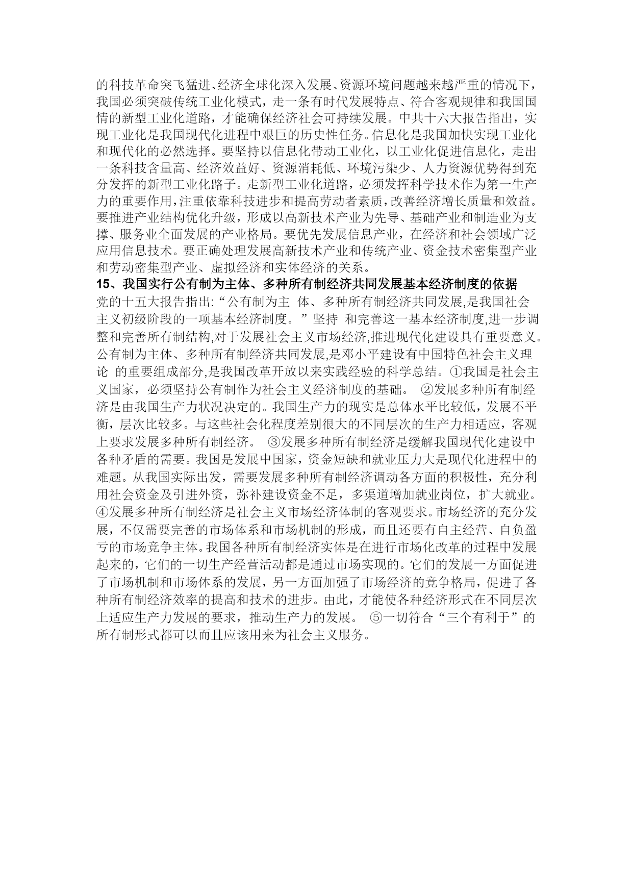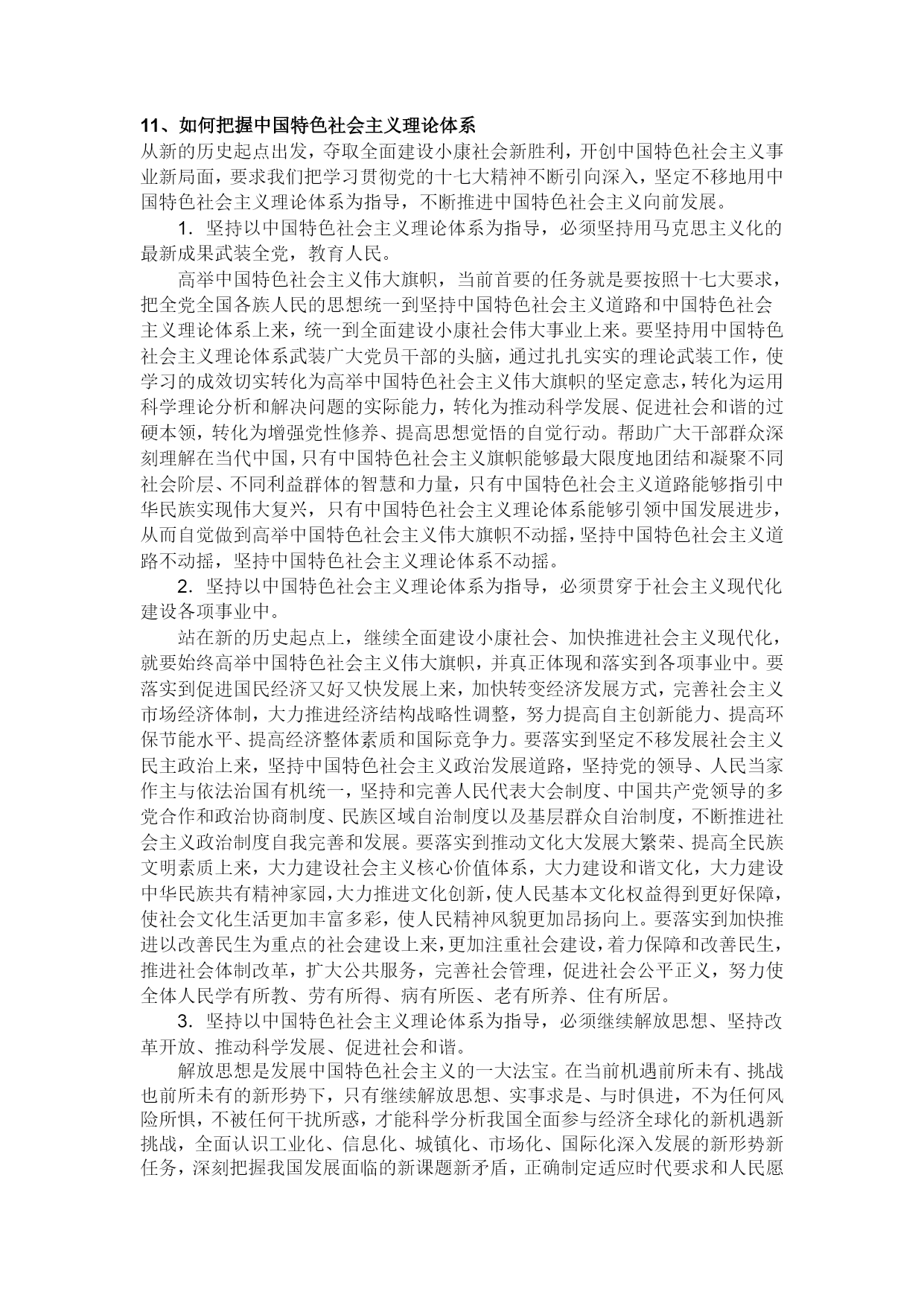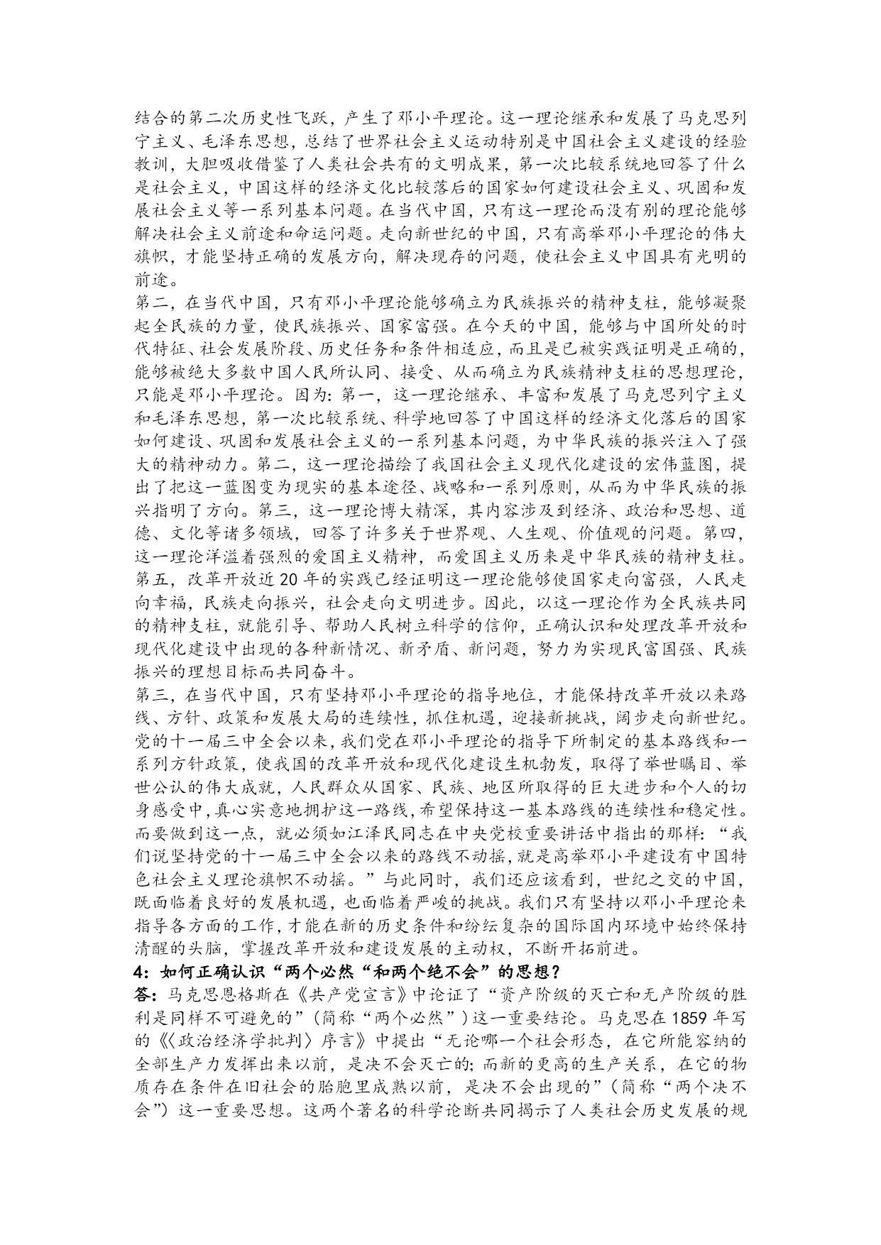 1.为什么说科学社会主义是马克思主义的核心?答:科学社会主义是马克思主义的核心,哲学和政治经济学是它的理论基础,其中哲学是它的基础的基础。“科学社会主义”理论是马克思主义根据人类社会历史发展客观规律做出的最重要的科学结论,是马克思主义理论革命性、科学性、统一性、完整性、彻底性的集中表现,是马克思主义理论核心中的核心,灵魂中的灵魂,是马克思主义的精髓。因此我们又可以用“科学社会主义”来概括马克思主义。掌握了“科学社会”基本原理,就是抓住了马克思主义最本质的东西,基本掌握了马克思主义。不懂“科学社会主义”,就是丝毫不懂马克思主义。2.科学社会主义的研究对象和基本原则是什么?答:无产阶级解放运动的性质、条件和目的三个方面是完整的密切相联的统一体,它们共同构成子科学社会主义的对象。任务科学社会主义的理论、运动和社会制度三者之问形成了另一个完整的密切相联的统一体,通过这个统一体的内在联系说明了科学社会主义的任务。基本内容:①阐明生产社会性和生产资料资本主义私人占有形式之间的矛盾的发展,必然导致社会主义取代资本主义,以生产资料的公有制取代生产资料私有制,科学地论述了资本主义必然灭亡、社会主义必然胜利的客观规律。②无产阶级和资产阶级的斗争是现代社会变革的巨大杠杆,无产阶级是作为资产阶级的掘墓人出现的。③无产阶级必须推翻资产阶级的统治,夺取政权,并在夺取政权后,彻底打碎旧的国家机器,代之以新的国家机构,建立并巩固无产阶级专政。④无产阶级专政是达到消灭一切阶级和进入无阶级社会的过渡。因此,在无产阶级专政条件下,要对整个社会进行改造,发展生产力,进行社会主义建设,逐步实现由社会主义社会向共产主义社会过渡的伟大目标。此外,科学社会主义科学地阐明了无产阶级政党在无产阶级革命和建设中的作用。科学社会主义具有鲜明的实践性,与无产阶级革命运动联系最直接、最密切,是马克思主义理论体系的核心。3:如何理解科学社会主义认识的三次飞跃?答:第一,在当代中国,只有邓小平理论而没有别的理论能够科学地回答中国如何建设社会主义和实现现代化的问题。从世界社会主义运动史看,社会主义学说可以说经历了三次历史性飞跃,第一次历史性飞跃发生在19世纪40年代,马克思和恩格斯使社会主义学说第一次由空想变为科学。第二次历史性飞跃发生在20世纪上半叶,主要代表者是列宁和毛泽东,他们创立了帝国主义时代无产阶级革命的新理论,开辟了帝国主义时代经济文化比较落后的资本主义国家和半封建半殖民地国家社会主义革命的成功道路,在一批国家建立起社会主义基本制度。邓小平和中国共产党人领导中国人民在改革开放和社会主义现代化建设新时期的实践中,找到了经济文化落后的国家建设和发展社会主义的成功道路,创立了有中国特色的社会主义理论,使社会主义学说实现第三次历史性飞跃。从中国革命的历史进程来看,本世纪以来,中国共产党领导中国人民进行了两次伟大革命。第一次是把半殖民地半封建的旧中国变为社会主义新中国。在这次革命中,实现了马克思主义与中国实际相结合的第一次历史性飞跃,产生了毛泽东思想。第二次是要把中国从一个不发达的社会主义国家变成富强民主文明的社会主义现代化国家。在这次革命中,实现了马克思主义同中国实际相结合的第二次历史性飞跃,产生了邓小平理论。这一理论继承和发展了马克思列宁主义、毛泽东思想,总结了世界社会主义运动特别是中国社会主义建设的经验教训,大胆吸收借鉴了人类社会共有的文明成果,第一次比较系统地回答了什么是社会主义,中国这样的经济文化比较落后的国家如何建设社会主义、巩固和发展社会主义等一系列基本问题。在当代中国,只有这一理论而没有别的理论能够解决社会主义前途和命运问题。走向新世纪的中国,只有高举邓小平理论的伟大旗帜,才能坚持正确的发展方向,解决现存的问题,使社会主义中国具有光明的前途。第二,在当代中国,只有邓小平理论能够确立为民族振兴的精神支柱,能够凝聚起全民族的力量,使民族振兴、国家富强。在今天的中国,能够与中国所处的时代特征、社会发展阶段、历史任务和条件相适应,而且是已被实践证明是正确的,能够被绝大多数中国人民所认同、接受、从而确立为民族精神支柱的思想理论,只能是邓小平理论。因为:第一,这一理论继承、丰富和发展了马克思列宁主义和毛泽东思想,第一次比较系统、科学地回答了中国这样的经济文化落后的国家如何建设、巩固和发展社会主义的一系列基本问题,为中华民族的振兴注入了强大的精神动力。第二,这一理论描绘了我国社会主义现代化建设的宏伟蓝图,提出了把这一蓝图变为现实的基本途径、战略和一系列原则,从而为中华民族的振兴指明了方向。第三,这一理论博大精深,其内容涉及到经济、政治和思想、道德、文化等诸多领域,回答了许多关于世界观、人生观、价值观的问题。第四,这一理论洋溢着强烈的爱国主义精神,而
