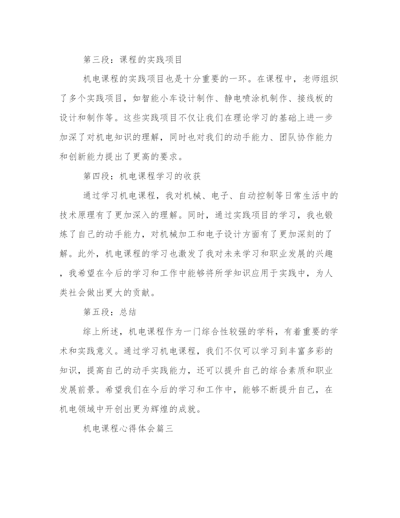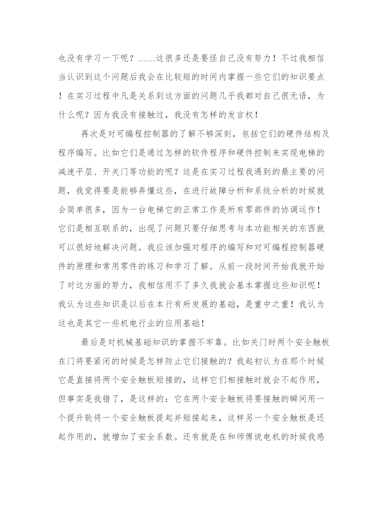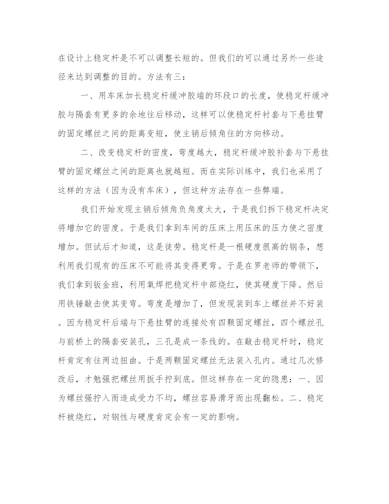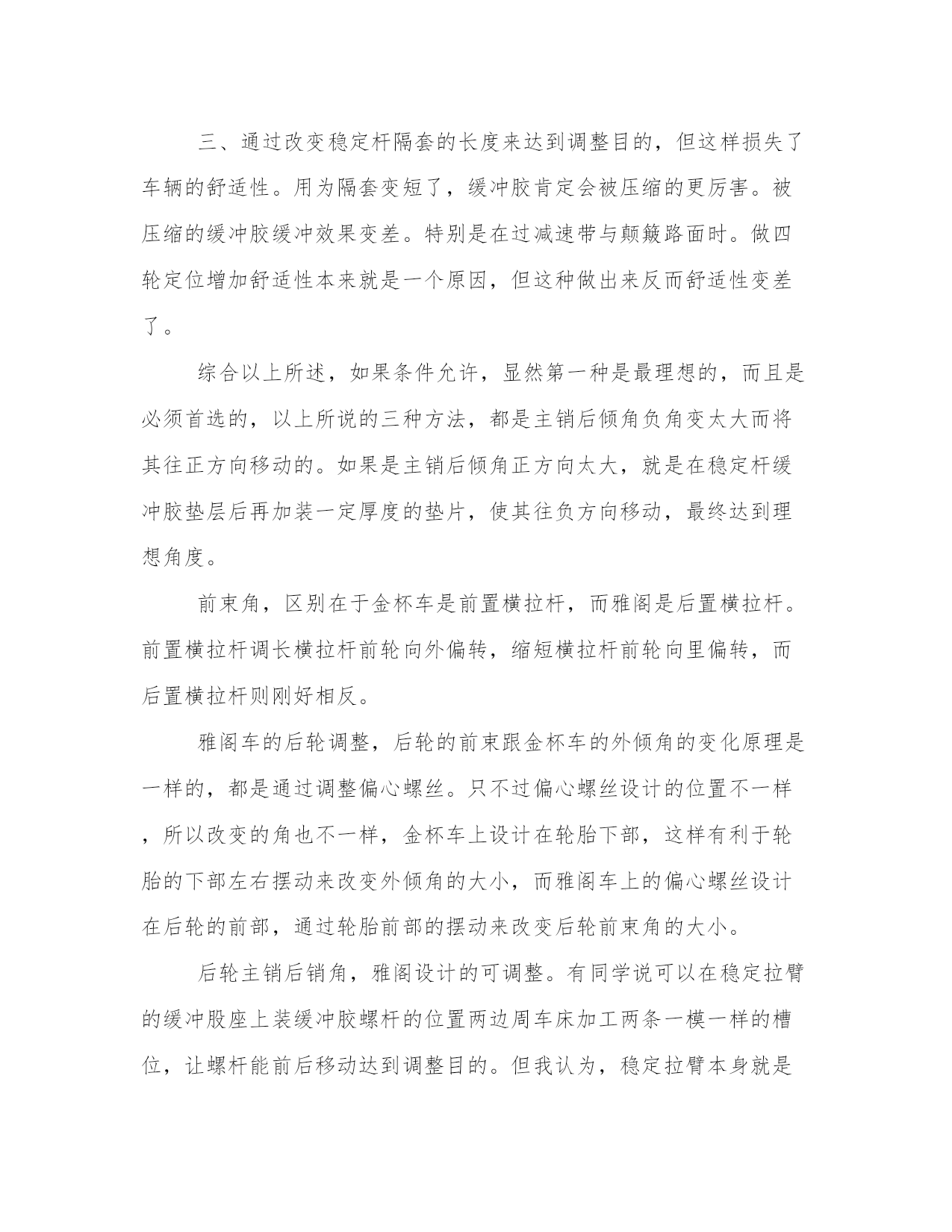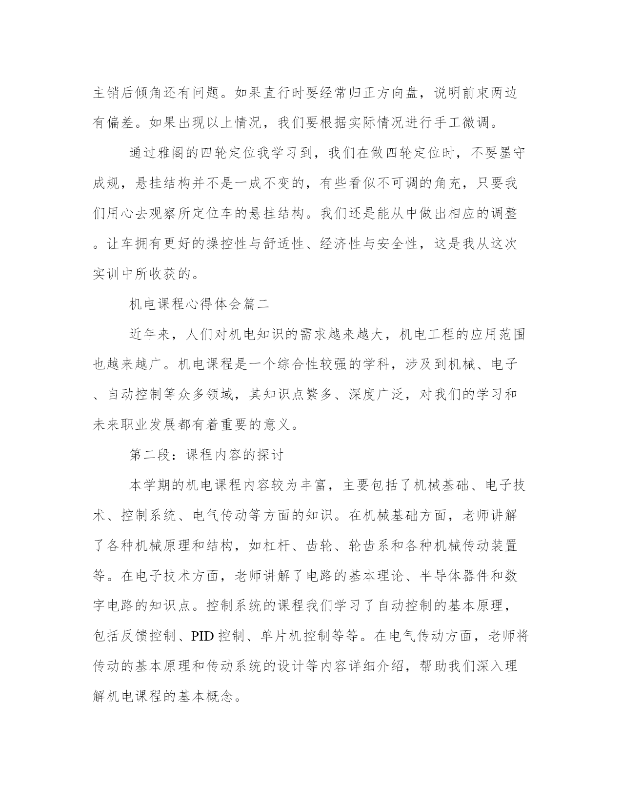 机电课程心得体会(优质12篇)当我们备受启迪时,常常可以将它们写成一篇心得体会,如此就可以提升我们写作能力了。大家想知道怎么样才能写得一篇好的心得体会吗?下面是小编帮大家整理的心得体会范文大全,供大家参考借鉴,希望可以帮助到有需要的朋友。机电课程心得体会篇一在之前金杯模块的学习当中,我们对四轮定位有了一定的了解,并进行了实际操作。在今天雅阁的四轮定位之后,感觉两者既有相同之处,又存在很大的区别。前期的准备工作基本是一样的,检查悬挂、制动转向系统是否正常,以及轮胎气压,车身高度等。最大的区别是:金杯车的后轮不需要调整。因为它的非独立悬挂决定它没法调整。而雅阁车把后轮是独立悬挂,是需要调整的。而且还要先调整后轮,因为前轮的数据是以后轮做为参照的。还有在金杯车上角度是有专门的调整设置,而雅阁车上是没有专门调整设置。比如,前轮外倾角,在金杯车上可调整下悬挂臂的偏心螺丝来改变前轮外倾角的大小,但在雅阁车上则不可以调整。而有些在设计上似乎不可调整的角度,但在保证汽车正常行驶,而且不会出现安全隐患的情况下,可以通过改变零件的形状来达到调整的目的。从而使车辆有更可靠的操控性与舒适性。比如前轮的主销后倾角,金杯车可通过调整后置稳定杆的长短来调整。而在雅阁车上是前置稳定杆,而且在设计上稳定杆是不可以调整长短的。但我们的可以通过另外一些途径来达到调整的目的。方法有三:一、用车床加长稳定杆缓冲胶端的环段口的长度,使稳定杆缓冲胶与隔套有更多的余地往后移动,这样可以使稳定杆衬套与下悬挂臂的固定螺丝之间的距离变短,使主销后倾角往的方向移动。二、改变稳定杆的密度,弯度越大,稳定杆缓冲胶补套与下悬挂臂的固定螺丝之间的距离也就越短。而在实际训练中,我们也采用了这样的方法(因为没有车床),但这种方法存在一些弊端。我们开始发现主销后倾角负角度太大,于是我们拆下稳定杆决定将增加它的密度。于是我们拿到车间的压床上用压床的压力使之密度增加。但试后才知道,这是徒劳。稳定杆是一根硬度很高的钢条,想利用我们现有的压床不可能将其变得更弯。于是在罗老师的带领下,我们拿到钣金班,利用氧焊把稳定杆中部烧红,使其硬度下降。然后用铁锤敲击使其变弯。弯度是增加了,但发现装到车上螺丝并不好装。因为稳定杆后端与下悬挂臂的连接处有四颗固定螺丝,四个螺丝孔与前桥上的隔套安装孔,三孔是成一条线的。在敲击稳定杆时,稳定杆肯定有往两边扭曲。于是两颗固定螺丝无法装入孔内。通过几次修改后,才勉强把螺丝用扳手拧到底。但这样存在一定的隐患:一、因为螺丝强拧入而造成受力不均,螺丝容易滑牙而出现翻松。二、稳定杆被烧红,对钢性与硬度肯定会有一定的影响。三、通过改变稳定杆隔套的长度来达到调整目的,但这样损失了车辆的舒适性。用为隔套变短了,缓冲胶肯定会被压缩的更厉害。被压缩的缓冲胶缓冲效果变差。特别是在过减速带与颠簸路面时。做四轮定位增加舒适性本来就是一个原因,但这种做出来反而舒适性变差了。综合以上所述,如果条件允许,显然第一种是最理想的,而且是必须首选的,以上所说的三种方法,都是主销后倾角负角变太大而将其往正方向移动的。如果是主销后倾角正方向太大,就是在稳定杆缓冲胶垫层后再加装一定厚度的垫片,使其往负方向移动,最终达到理想角度。前束角,区别在于金杯车是前置横拉杆,而雅阁是后置横拉杆。前置横拉杆调长横拉杆前轮向外偏转,缩短横拉杆前轮向里偏转,而后置横拉杆则刚好相反。雅阁车的后轮调整,后轮的前束跟金杯车的外倾角的变化原理是一样的,都是通过调整偏心螺丝。只不过偏心螺丝设计的位置不一样,所以改变的角也不一样,金杯车上设计在轮胎下部,这样有利于轮胎的下部左右摆动来改变外倾角的大小,而雅阁车上的偏心螺丝设计在后轮的前部,通过轮胎前部的摆动来改变后轮前束角的大小。后轮主销后销角,雅阁设计的可调整。有同学说可以在稳定拉臂的缓冲股座上装缓冲胶螺杆的位置两边周车床加工两条一模一样的槽位,让螺杆能前后移动达到调整目的。但我认为,稳定拉臂本身就是用来增加后轮下悬臂的刚性的。如果在缓冲胶座上切槽会影响稳定拉臂的刚性。而且怎样来前后推动稳定拉臂。所以我不赞同此做法。后轮外倾角,在设计上是不可调整的。但是我们可以通过在上摆臂的固定螺丝处加装垫片来改变后轮外倾角。当然我们在调整前要知道多厚的垫片改变多大的角度。0.3-0.5mm厚的垫片可改变3’-5’的角度,1.0-1.5mm可改变,2’-30’的角度,2.0-3.0mm,可改变25’-35’的角度。这样就可以根据电脑检测出的数据来计算需要加装多厚的垫片。在加装垫片时需要特别注意的是,加装垫片后,原来的螺杆长度是否够长。如果出现角度偏差太大,要确认所选车型是否正确,一般情况下,角度偏差不大,加一块1.5mm左右的垫片,螺杆是够长的,如果确认所选车型无误,那么有可能是车辆使用
