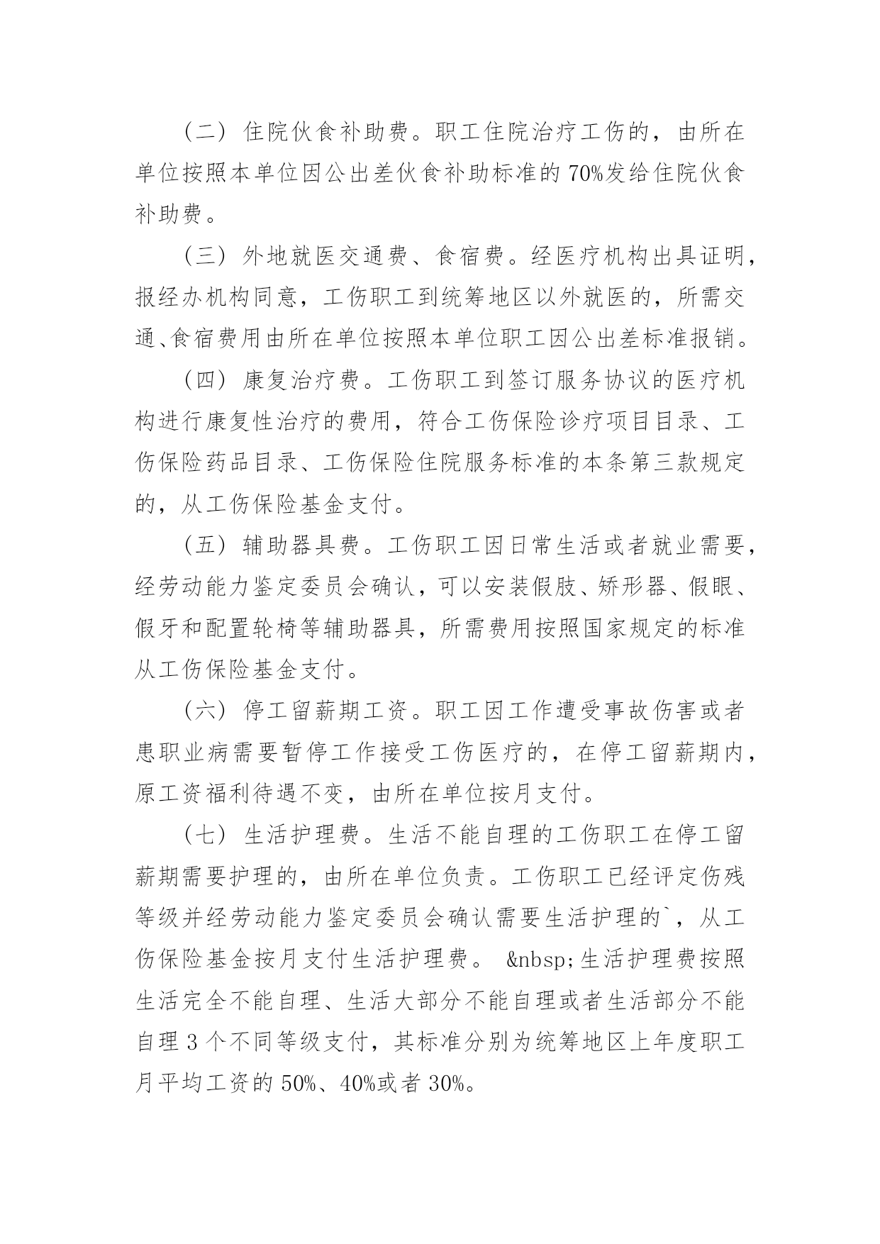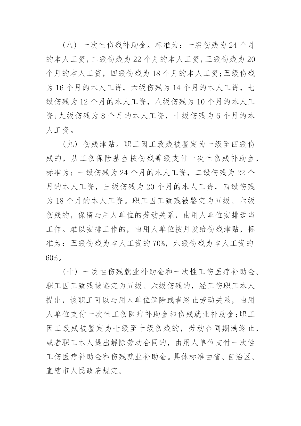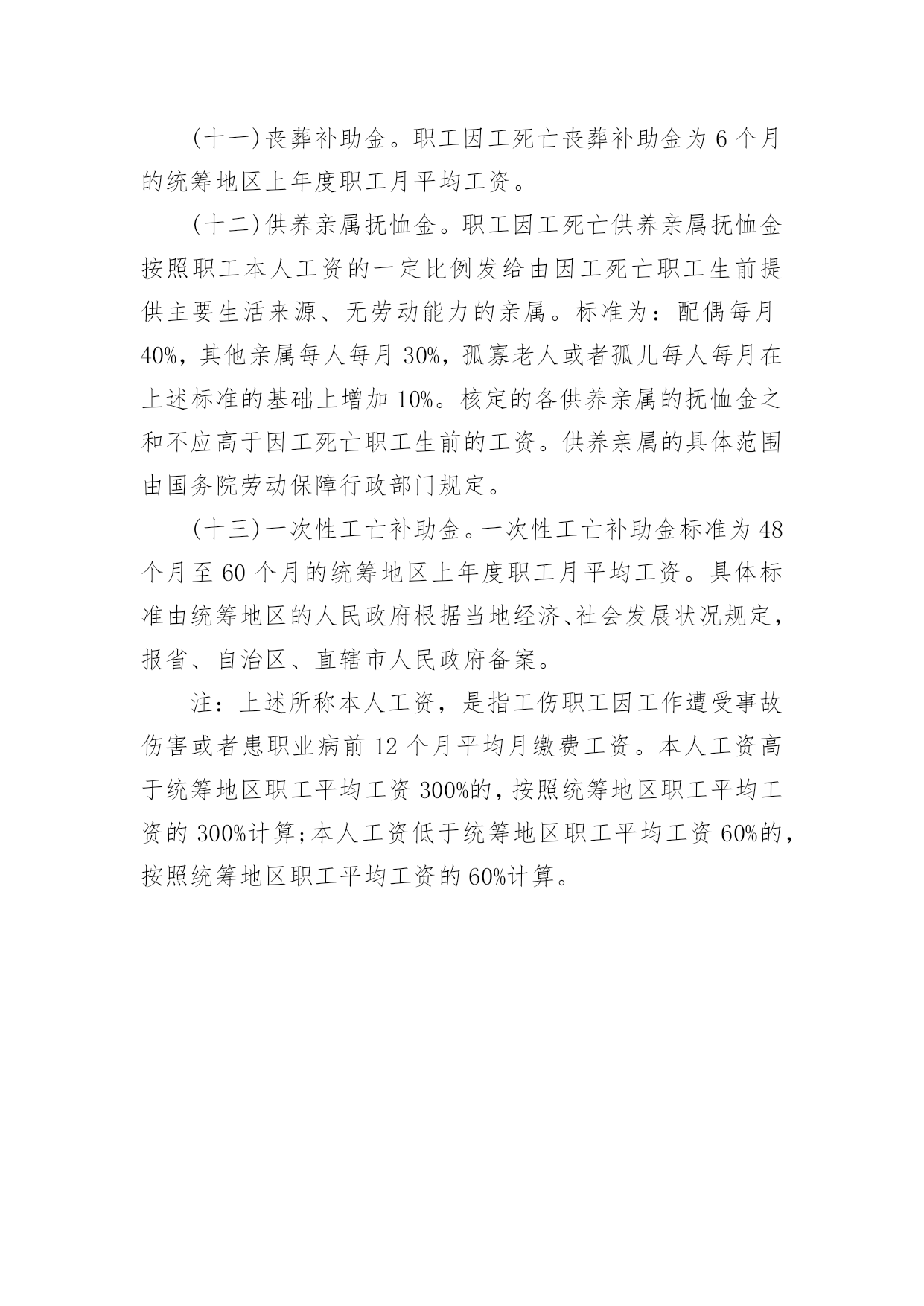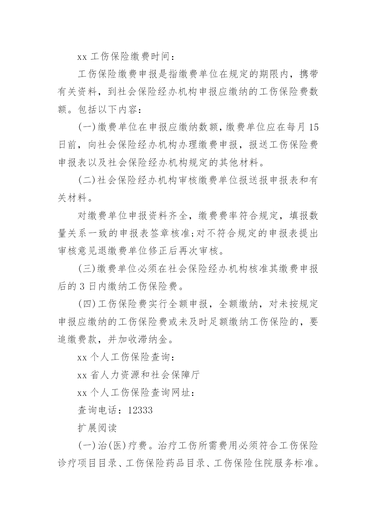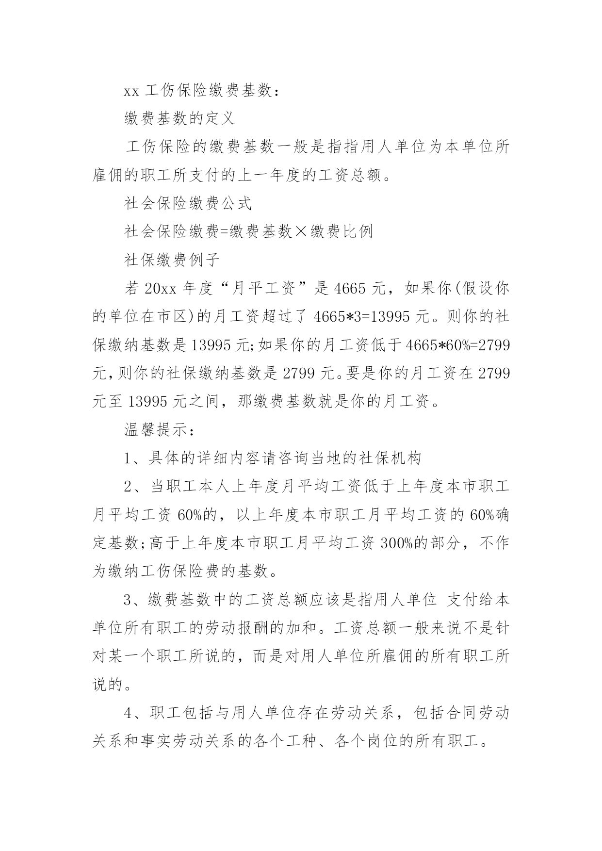 工伤保险缴费比例及基数文件工伤保险缴费比例及基数文件【xx工伤保险缴费比例及基数】xx工伤保险缴费比例:1、社会保险经办机构根据用人单位的工商登记和主要经营生产业务等情况,分别确定各用人单位的行业风险类别。2、根据不同行业的工伤风险程度,将行业划分为3个类别:一类为风险较小行业,二类为中等风险行业,三类为风险较大行业。三类行业分别实行3种不同的工伤保险缴费率。3、工伤保险自2016年7月1日起执行新的费率政策。将原有1至3类行业工伤风险类别调整为1至8类,对应行业基准费率分别由0.5%、1%、1.5%调整为0.5%、0.7%、1%、1.2%、1.5%、1.7%、1.9%、2.5%。4、用人单位属一类行业的,按行业基准费率缴费,不实行费率浮动,用人单位属二、三类行业的,费率实行浮动。温馨提示:1、工伤保险费用是由单位缴纳,非个人缴费。2、用人单位的初次缴费费率,按行业基准费率确定,以后由社会保险经办机构根据用人单位工伤保险费使用、工伤发生率、职业病危害程度等因素,1-3年浮动1次。3、具体的分类及缴纳费率情况请咨询当地的社保机构。xx工伤保险缴费基数:缴费基数的定义工伤保险的缴费基数一般是指指用人单位为本单位所雇佣的职工所支付的上一年度的工资总额。社会保险缴费公式社会保险缴费=缴费基数×缴费比例社保缴费例子若20xx年度“月平工资”是4665元,如果你(假设你的单位在市区)的月工资超过了4665*3=13995元。则你的社保缴纳基数是13995元;如果你的月工资低于4665*60%=2799元,则你的社保缴纳基数是2799元。要是你的月工资在2799元至13995元之间,那缴费基数就是你的月工资。温馨提示:1、具体的详细内容请咨询当地的社保机构2、当职工本人上年度月平均工资低于上年度本市职工月平均工资60%的,以上年度本市职工月平均工资的60%确定基数;高于上年度本市职工月平均工资300%的部分,不作为缴纳工伤保险费的基数。3、缴费基数中的工资总额应该是指用人单位支付给本单位所有职工的劳动报酬的加和。工资总额一般来说不是针对某一个职工所说的,而是对用人单位所雇佣的所有职工所说的。4、职工包括与用人单位存在劳动关系,包括合同劳动关系和事实劳动关系的各个工种、各个岗位的所有职工。xx工伤保险缴费时间:工伤保险缴费申报是指缴费单位在规定的期限内,携带有关资料,到社会保险经办机构申报应缴纳的工伤保险费数额。包括以下内容:(一)缴费单位在申报应缴纳数额,缴费单位应在每月15日前,向社会保险经办机构办理缴费申报,报送工伤保险费申报表以及社会保险经办机构规定的其他材料。(二)社会保险经办机构审核缴费单位报送报申报表和有关材料。对缴费单位申报资料齐全,缴费费率符合规定,填报数量关系一致的申报表签章核准;对不符合规定的申报表提出审核意见退缴费单位修正后再次审核。(三)缴费单位必须在社会保险经办机构核准其缴费申报后的3日内缴纳工伤保险费。(四)工伤保险费实行全额申报,全额缴纳,对未按规定申报应缴纳的工伤保险费或未及时足额缴纳工伤保险的,要追缴费款,并加收滞纳金。xx个人工伤保险查询:xx省人力资源和社会保障厅xx个人工伤保险查询网址:查询电话:12333扩展阅读(一)治(医)疗费。治疗工伤所需费用必须符合工伤保险诊疗项目目录、工伤保险药品目录、工伤保险住院服务标准。(二)住院伙食补助费。职工住院治疗工伤的,由所在单位按照本单位因公出差伙食补助标准的70%发给住院伙食补助费。(三)外地就医交通费、食宿费。经医疗机构出具证明,报经办机构同意,工伤职工到统筹地区以外就医的,所需交通、食宿费用由所在单位按照本单位职工因公出差标准报销。(四)康复治疗费。工伤职工到签订服务协议的医疗机构进行康复性治疗的费用,符合工伤保险诊疗项目目录、工伤保险药品目录、工伤保险住院服务标准的本条第三款规定的,从工伤保险基金支付。(五)辅助器具费。工伤职工因日常生活或者就业需要,经劳动能力鉴定委员会确认,可以安装假肢、矫形器、假眼、假牙和配置轮椅等辅助器具,所需费用按照国家规定的标准从工伤保险基金支付。(六)停工留薪期工资。职工因工作遭受事故伤害或者患职业病需要暂停工作接受工伤医疗的,在停工留薪期内,原工资福利待遇不变,由所在单位按月支付。(七)生活护理费。生活不能自理的工伤职工在停工留薪期需要护理的,由所在单位负责。工伤职工已经评定伤残等级并经劳动能力鉴定委员会确认需要生活护理的`,从工伤保险基金按月支付生活护理费。 生活护理费按照生活完全不能自理、生活大部分不能自理或者生活部分不能自理3个不同等级支付,其标准分别为统筹地区上年度职工月平均工资的50%、40%或者30%。(八)一次性伤残补助金。标准为:一级伤残为24个月的本人工资,二级伤残为22个月的本人工资,三