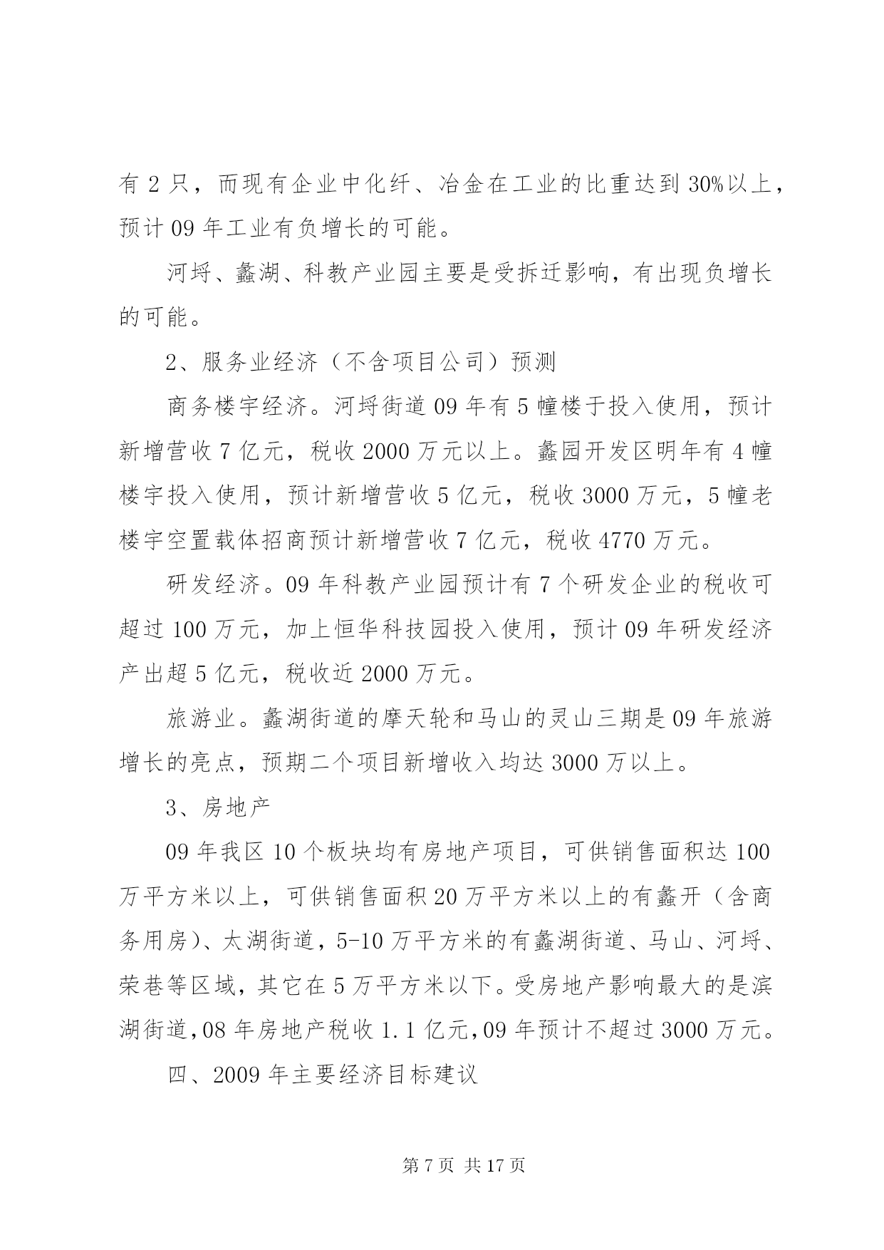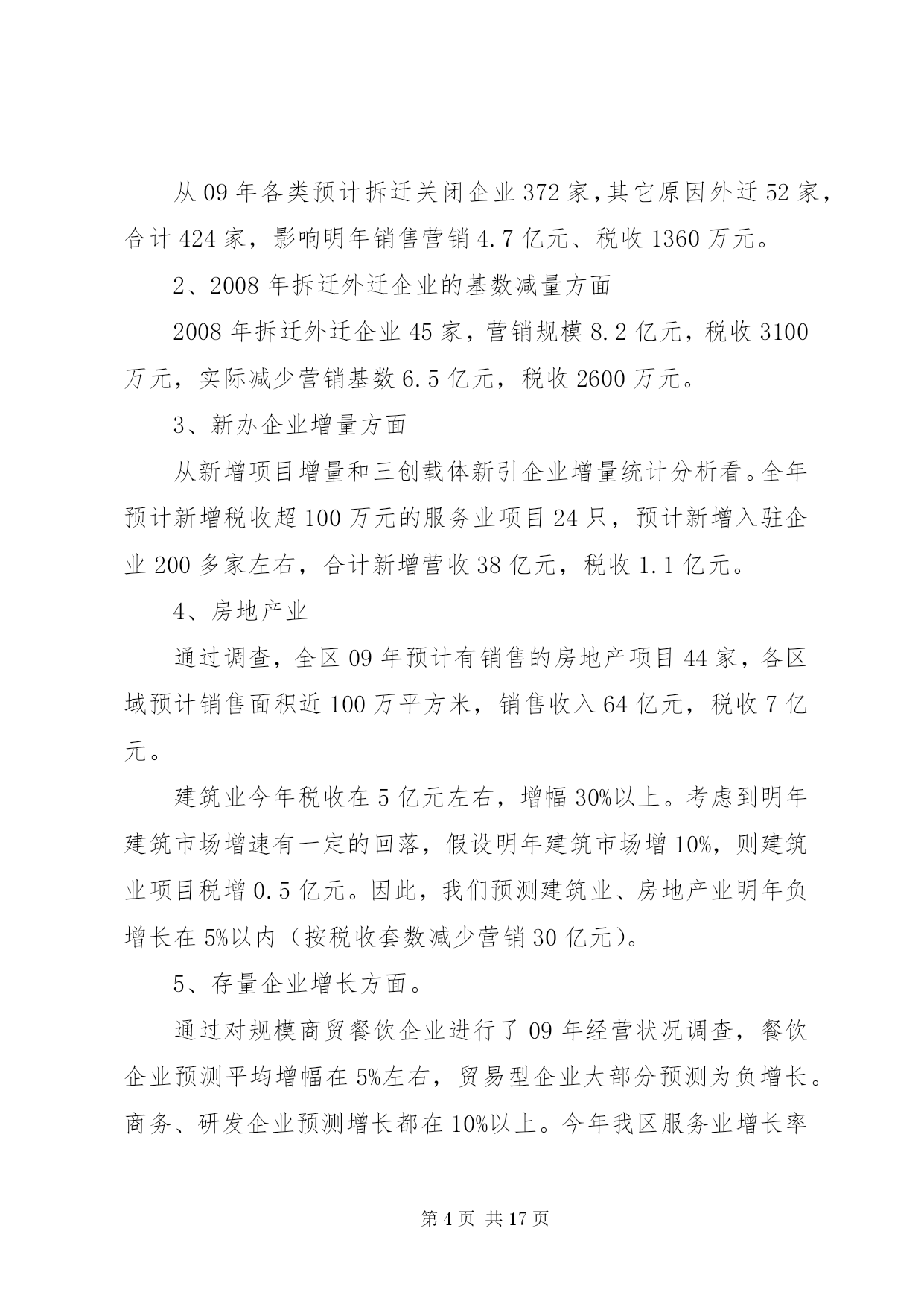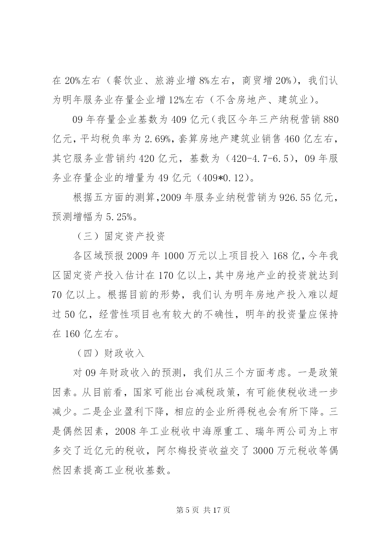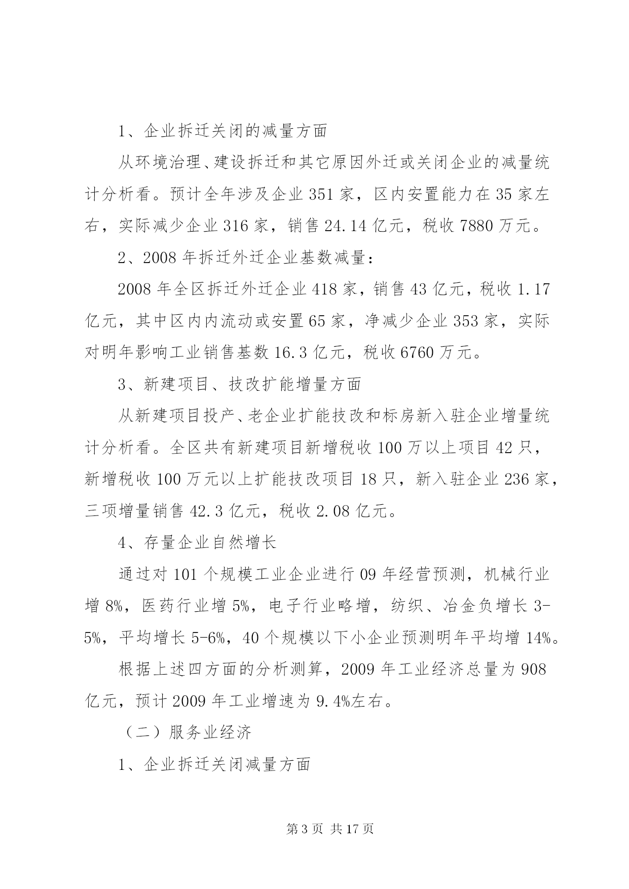 第PAGE\*Arabic\*MERGEFORMAT17页共NUMPAGES\*MERGEFORMAT17页区经济发展状况评估报告一、2009年区域经济环境趋势分析当前全球金融危机的集中爆发正向实体经济蔓延,全球经济下行的趋势还在继续,而作为转型提升中的滨湖区域经济发展发展形势,无法独善其中于国际环境之外。当前,国家出台拉动内需用综合政策,其政策效应的显现还有待时日。外部环境对我区的影响也正在逐步现显,目前,滨湖经济发展压力存在于八个大的方面:一是房地产市场逆转性变化的影响,削弱了我区转型期间经济增长的依托,财政增长的压力在加大。二是城市化推进中的“拆”、“建”、“安”的矛盾日益突出,企业稳心留根及发展空间的挤压的压力在加大。三是传统工业受市场和资金和发展空间的影响,企业自身发展和提升、改造、转型的主动性压力在加大。四是新兴产业发展刚起步,短期内还难以见效,加快发展新兴产业的压力在加大。五是相对低迷的土地流转市场的形势,依靠土地流转溢价支撑基础性投入的压力在加大。六是受市场波动等因素,特别是原材料价格的波动,企业自身预见风险的能力相对较弱,所以企业风险压力在加大。七是从金融动荡最终连锁反应到实体经济和区域拆迁量增大的双重压力来看,我区的就业压力在加大。八是环境承载能力的长期透支,治太任务重负的责任压力在加大。但滨湖区域经济发展,经过近多年的优化调整,从经济发展层面上看,我区有比较完善的产业结构使我区具有较强抗风险能力。已形成了以机械制造、生物医药、电子工业、科技研发、商贸商务、旅游餐饮为主体的实体经济,具有较高的技术含量和装备水平,特别是我区的科研、商务等新兴产业,逐步进入产出期,实体经济拥有较为雄厚的产业资本和财富积累,增强了我区经济的发展物质基础能力,明年仍有稳健的发展机遇和潜力。从社会发展层面上看,我区有较为和谐的社会环境使我区具体较强危机应对的综合能力。我区的社会保障水平、社区治理水平、人民富裕程度和各级干部精神状态都处于较高的水平,具备有应对危机的物质基础和社会基础。总体来看,我区经济在宏观周期性调整的压力下,明年经济增速将会有一个顺势下调过程,但国家拉动内需政策对下行过程应有明显的拉动和支撑作用,我区经济仍具备稳定发展的基础和潜力。二、2009的全区经济发展的要素评估(剔除内需拉动政策预期)(一)工业经济1、企业拆迁关闭的减量方面从环境治理、建设拆迁和其它原因外迁或关闭企业的减量统计分析看。预计全年涉及企业351家,区内安置能力在35家左右,实际减少企业316家,销售24.14亿元,税收7880万元。2、2008年拆迁外迁企业基数减量:2008年全区拆迁外迁企业418家,销售43亿元,税收1.17亿元,其中区内内流动或安置65家,净减少企业353家,实际对明年影响工业销售基数16.3亿元,税收6760万元。3、新建项目、技改扩能增量方面从新建项目投产、老企业扩能技改和标房新入驻企业增量统计分析看。全区共有新建项目新增税收100万以上项目42只,新增税收100万元以上扩能技改项目18只,新入驻企业236家,三项增量销售42.3亿元,税收2.08亿元。4、存量企业自然增长通过对101个规模工业企业进行09年经营预测,机械行业增8%,医药行业增5%,电子行业略增,纺织、冶金负增长3-5%,平均增长5-6%,40个规模以下小企业预测明年平均增14%。根据上述四方面的分析测算,2009年工业经济总量为908亿元,预计2009年工业增速为9.4%左右。(二)服务业经济1、企业拆迁关闭减量方面从09年各类预计拆迁关闭企业372家,其它原因外迁52家,合计424家,影响明年销售营销4.7亿元、税收1360万元。2、2008年拆迁外迁企业的基数减量方面2008年拆迁外迁企业45家,营销规模8.2亿元,税收3100万元,实际减少营销基数6.5亿元,税收2600万元。3、新办企业增量方面从新增项目增量和三创载体新引企业增量统计分析看。全年预计新增税收超100万元的服务业项目24只,预计新增入驻企业200多家左右,合计新增营收38亿元,税收1.1亿元。4、房地产业通过调查,全区09年预计有销售的房地产项目44家,各区域预计销售面积近100万平方米,销售收入64亿元,税收7亿元。建筑业今年税收在5亿元左右,增幅30%以上。考虑到明年建筑市场增速有一定的回落,假设明年建筑市场增10%,则建筑业项目税增0.5亿元。因此,我们预测建筑业、房地产业明年负增长在5%以内(按税收套数减少营销30亿元)。5、存量企业增长方面。通过对规模商贸餐饮企业进行了09年经营状况调查,餐饮企业预测平均增幅在5%左右,贸易型企业大部分预测为负增长。商务、研发企业预测增长都在10%以上。今年我区服务业增长率在20%左右(餐饮业、旅游业增8%左右
