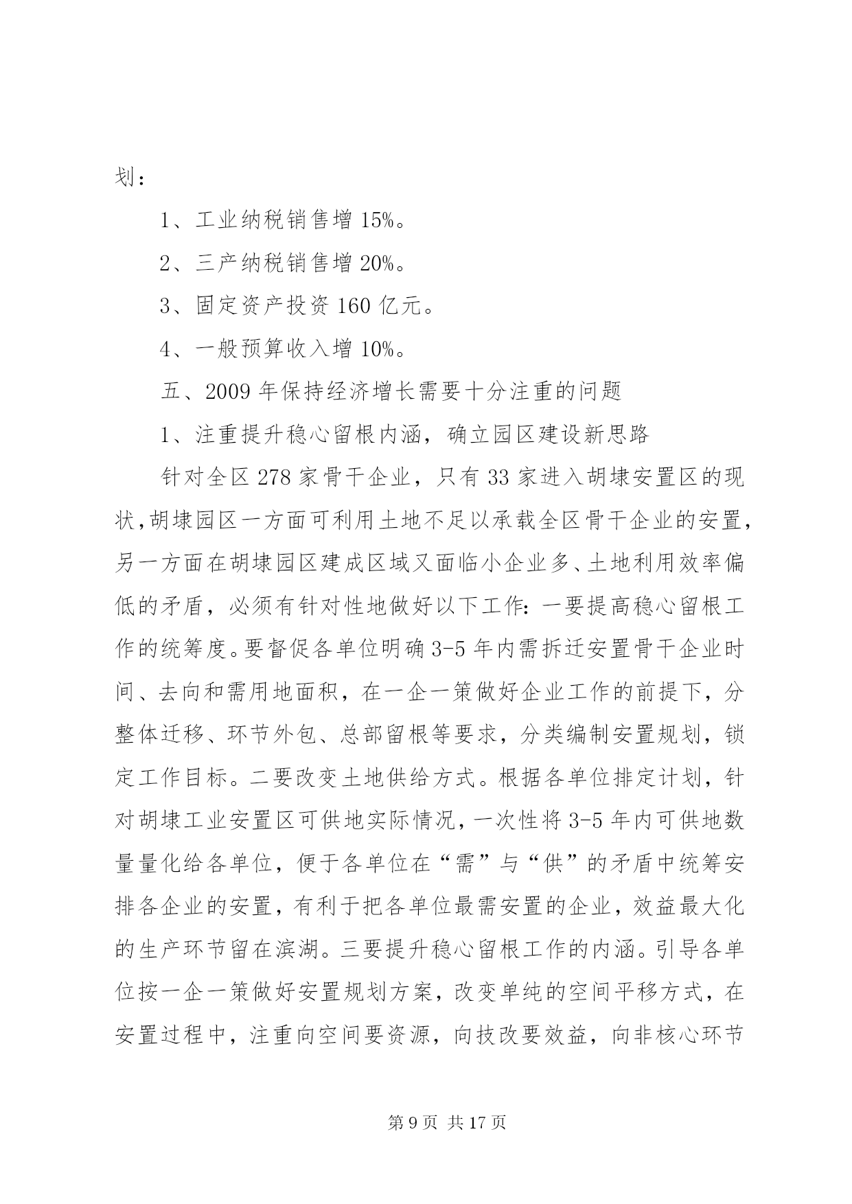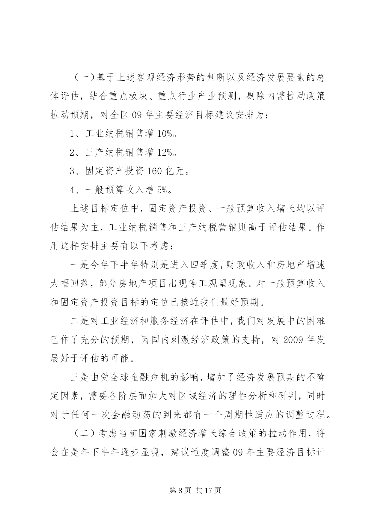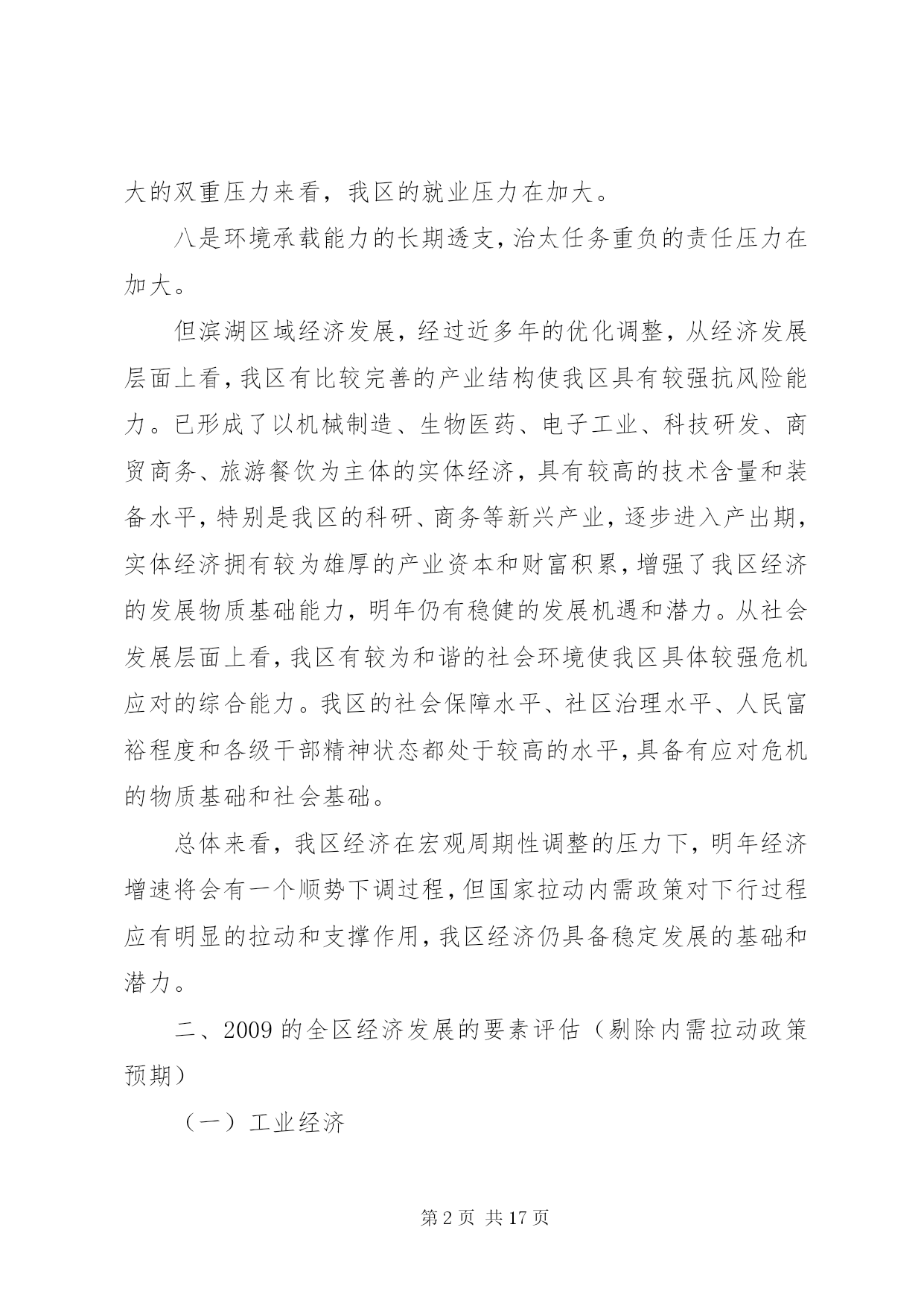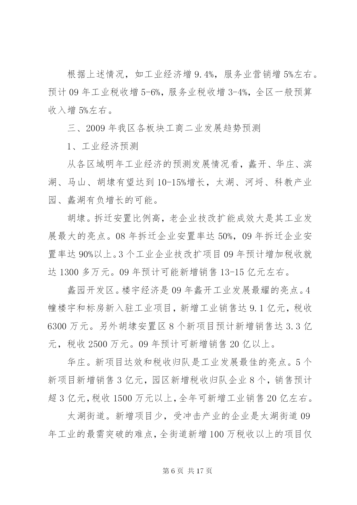 第PAGE\*Arabic\*MERGEFORMAT17页共NUMPAGES\*MERGEFORMAT17页区经济发展状况评估报告一、2009年区域经济环境趋势分析当前全球金融危机的集中爆发正向实体经济蔓延,全球经济下行的趋势还在继续,而作为转型提升中的滨湖区域经济发展发展形势,无法独善其中于国际环境之外。当前,国家出台拉动内需用综合政策,其政策效应的显现还有待时日。外部环境对我区的影响也正在逐步现显,目前,滨湖经济发展压力存在于八个大的方面:一是房地产市场逆转性变化的影响,削弱了我区转型期间经济增长的依托,财政增长的压力在加大。二是城市化推进中的“拆”、“建”、“安”的矛盾日益突出,企业稳心留根及发展空间的挤压的压力在加大。三是传统工业受市场和资金和发展空间的影响,企业自身发展和提升、改造、转型的主动性压力在加大。四是新兴产业发展刚起步,短期内还难以见效,加快发展新兴产业的压力在加大。五是相对低迷的土地流转市场的形势,依靠土地流转溢价支撑基础性投入的压力在加大。六是受市场波动等因素,特别是原材料价格的波动,企业自身预见风险的能力相对较弱,所以企业风险压力在加大。七是从金融动荡最终连锁反应到实体经济和区域拆迁量增大的双重压力来看,我区的就业压力在加大。八是环境承载能力的长期透支,治太任务重负的责任压力在加大。但滨湖区域经济发展,经过近多年的优化调整,从经济发展层面上看,我区有比较完善的产业结构使我区具有较强抗风险能力。已形成了以机械制造、生物医药、电子工业、科技研发、商贸商务、旅游餐饮为主体的实体经济,具有较高的技术含量和装备水平,特别是我区的科研、商务等新兴产业,逐步进入产出期,实体经济拥有较为雄厚的产业资本和财富积累,增强了我区经济的发展物质基础能力,明年仍有稳健的发展机遇和潜力。从社会发展层面上看,我区有较为和谐的社会环境使我区具体较强危机应对的综合能力。我区的社会保障水平、社区治理水平、人民富裕程度和各级干部精神状态都处于较高的水平,具备有应对危机的物质基础和社会基础。总体来看,我区经济在宏观周期性调整的压力下,明年经济增速将会有一个顺势下调过程,但国家拉动内需政策对下行过程应有明显的拉动和支撑作用,我区经济仍具备稳定发展的基础和潜力。二、2009的全区经济发展的要素评估(剔除内需拉动政策预期)(一)工业经济1、企业拆迁关闭的减量方面从环境治理、建设拆迁和其它原因外迁或关闭企业的减量统计分析看。预计全年涉及企业351家,区内安置能力在35家左右,实际减少企业316家,销售24.14亿元,税收7880万元。2、2008年拆迁外迁企业基数减量:2008年全区拆迁外迁企业418家,销售43亿元,税收1.17亿元,其中区内内流动或安置65家,净减少企业353家,实际对明年影响工业销售基数16.3亿元,税收6760万元。3、新建项目、技改扩能增量方面从新建项目投产、老企业扩能技改和标房新入驻企业增量统计分析看。全区共有新建项目新增税收100万以上项目42只,新增税收100万元以上扩能技改项目18只,新入驻企业236家,三项增量销售42.3亿元,税收2.08亿元。4、存量企业自然增长通过对101个规模工业企业进行09年经营预测,机械行业增8%,医药行业增5%,电子行业略增,纺织、冶金负增长3-5%,平均增长5-6%,40个规模以下小企业预测明年平均增14%。根据上述四方面的分析测算,2009年工业经济总量为908亿元,预计2009年工业增速为9.4%左右。(二)服务业经济1、企业拆迁关闭减量方面从09年各类预计拆迁关闭企业372家,其它原因外迁52家,合计424家,影响明年销售营销4.7亿元、税收1360万元。2、2008年拆迁外迁企业的基数减量方面2008年拆迁外迁企业45家,营销规模8.2亿元,税收3100万元,实际减少营销基数6.5亿元,税收2600万元。3、新办企业增量方面从新增项目增量和三创载体新引企业增量统计分析看。全年预计新增税收超100万元的服务业项目24只,预计新增入驻企业200多家左右,合计新增营收38亿元,税收1.1亿元。4、房地产业通过调查,全区09年预计有销售的房地产项目44家,各区域预计销售面积近100万平方米,销售收入64亿元,税收7亿元。建筑业今年税收在5亿元左右,增幅30%以上。考虑到明年建筑市场增速有一定的回落,假设明年建筑市场增10%,则建筑业项目税增0.5亿元。因此,我们预测建筑业、房地产业明年负增长在5%以内(按税收套数减少营销30亿元)。5、存量企业增长方面。通过对规模商贸餐饮企业进行了09年经营状况调查,餐饮企业预测平均增幅在5%左右,贸易型企业大部分预测为负增长。商务、研发企业预测增长都在10%以上。今年我区服务业增长率在20%左右(餐饮业、旅游业增8%左右