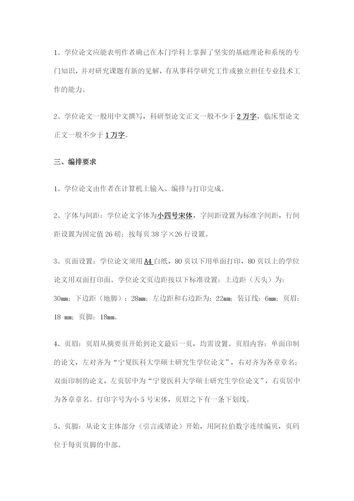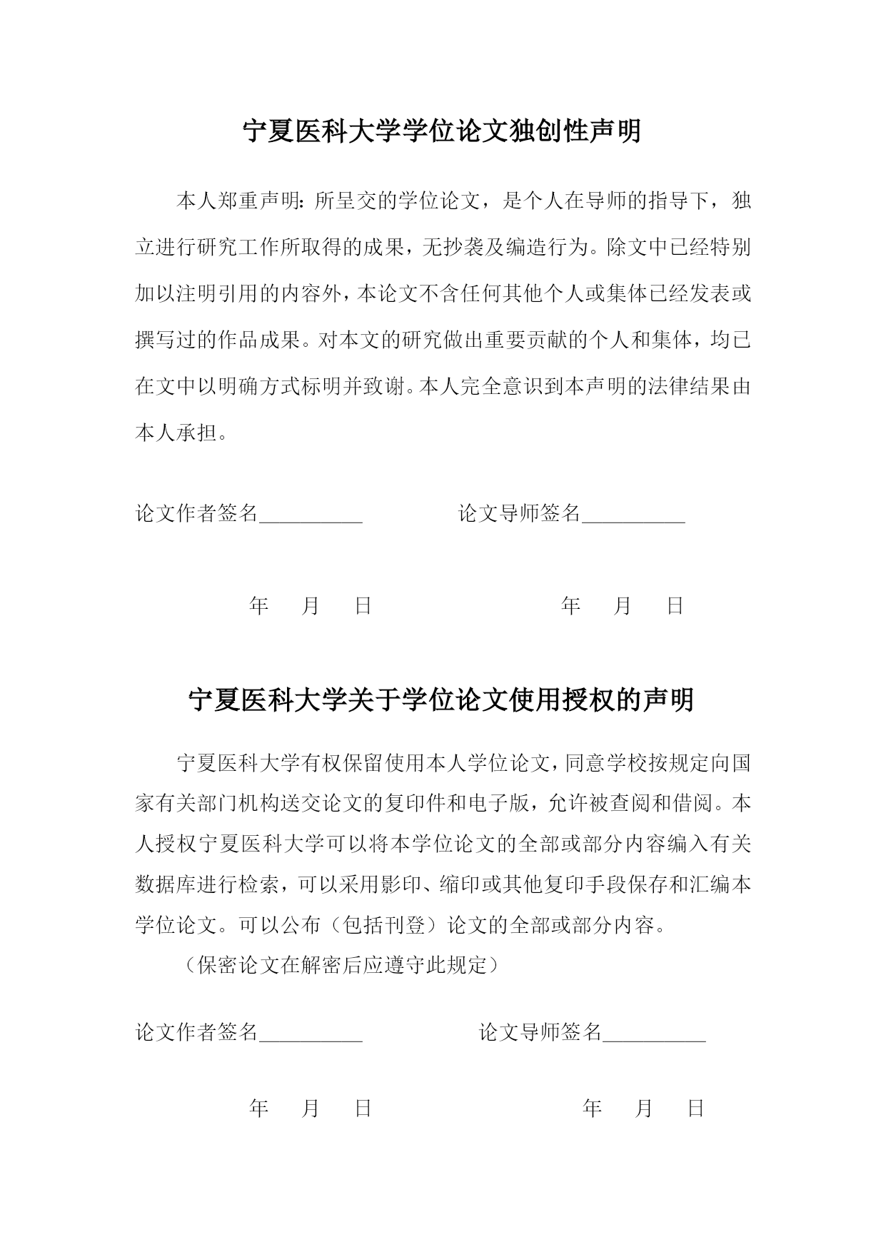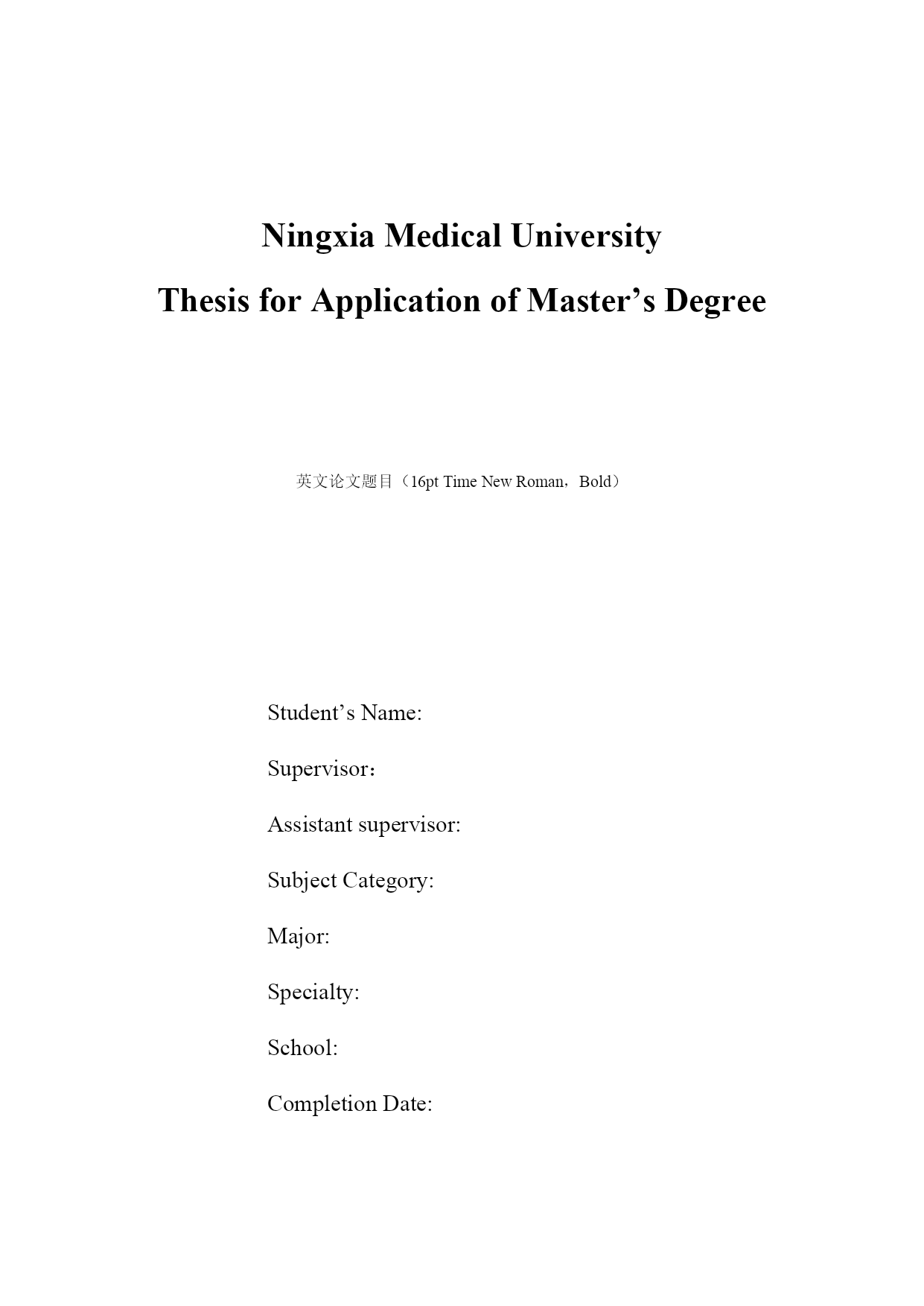 分类号:单位代码:10752密级:公开学号:宁夏医科大学硕士研究生学位论文中文论文题目(二号黑体)英文论文题目(16ptTimeNewRoman,Bold)学位申请人:指导教师姓名、职称指导教师:合作指导教师:医学、理学严格按照专业名称填写申请学位门类级别:按照导师的研究方向填写专业名称:研究方向:严格按照所在学院名称填写所在学院:论文完成日期:宁夏医科大学研究生部NingxiaMedicalUniversityThesisforApplicationofMaster’sDegree英文论文题目(16ptTimeNewRoman,Bold)Student’sName:Supervisor:Assistantsupervisor:SubjectCategory:Major:Specialty:School:CompletionDate:宁夏医科大学学位论文独创性声明本人郑重声明:所呈交的学位论文,是个人在导师的指导下,独立进行研究工作所取得的成果,无抄袭及编造行为。除文中已经特别加以注明引用的内容外,本论文不含任何其他个人或集体已经发表或撰写过的作品成果。对本文的研究做出重要贡献的个人和集体,均已在文中以明确方式标明并致谢。本人完全意识到本声明的法律结果由本人承担。论文作者签名_____论文导师签名_____年月日年月日宁夏医科大学关于学位论文使用授权的声明宁夏医科大学有权保留使用本人学位论文,同意学校按规定向国家有关部门机构送交论文的复印件和电子版,允许被查阅和借阅。本人授权宁夏医科大学可以将本学位论文的全部或部分内容编入有关数据库进行检索,可以采用影印、缩印或其他复印手段保存和汇编本学位论文。可以公布(包括刊登)论文的全部或部分内容。(保密论文在解密后应遵守此规定)论文作者签名_____论文导师签名_____年月日年月日书脊的书写页边学位论文的书脊用小三号仿宋字书写,上方写论文题目,下方写申请人姓名,距上下页边均为5cm,如下图:5cm学号题目姓名5cm页边注:1、申请学位门类级别:遗传学、生理学专业填:理学其它专业均填:医学2、专业名称:按二级学科填写,如:外科学、人体解剖与组织胚胎学3、研究方向:按导师研究方向填写4、分类号:R医学、卫生R1预防医学、卫生学R2中国医学R3基础医学R4临床医学R5内科学R6外科学R71妇产科学R72儿科学R73肿瘤学R74神经病学与精神病学R75皮肤病学与性科学R76耳鼻咽喉科学R77眼科学R78口腔科学R79外国民族医学R8特种医学R9药学宁夏医科大学硕士研究生学位论文格式的统一要求发布时间:2009-3-2016:43:27点击次数:127一、引言为了提高研究生的学位论文质量,做到学位论文在内容和格式上的规范与统一,保证学位论文的质量,便利信息系统的收集、存放、处理、加工、检索、利用和交流,特作如下规定:二、基本要求1、学位论文应能表明作者确已在本门学科上掌握了坚实的基础理论和系统的专门知识,并对研究课题有新的见解,有从事科学研究工作或独立担任专业技术工作的能力。2、学位论文一般用中文撰写,科研型论文正文一般不少于2万字,临床型论文正文一般不少于1万字。三、编排要求1、学位论文由作者在计算机上输入、编排与打印完成。2、字体与间距:学位论文字体为小四号宋体,字间距设置为标准字间距,行间距设置为固定值26磅;按每页38字×26行设置。3、页面设置:学位论文须用A4白纸,80页以下用单面打印,80页以上的学位论文用双面打印面。学位论文页边距按以下标准设置:上边距(天头)为:30mm;下边距(地脚):28mm;左边距和右边距为:22mm;装订线:6mm;页眉:18mm;页脚:18mm。4、页眉:页眉从摘要页开始到论文最后一页,均需设置。页眉内容:单面印制的论文,左对齐为“宁夏医科大学硕士研究生学位论文”,右对齐为各章章名;双面印制的论文,左页居中为“宁夏医科大学硕士研究生学位论文”,右页居中为各章章名。打印字号为小5号宋体,页眉之下有一条下划线。5、页脚:从论文主体部分(引言或绪论)开始,用阿拉伯数字连续编页,页码位于每页页脚的中部。6、前置部分单独编页。7、图:图号按顺序编号,如图1、图2………。绘图必须工整、清晰、规范。示意图应能清楚反映图示内容;照片应在右下角给出放大标尺。图量较多时,可将图置于正文后(参考文献之前)。8、表格:表格按顺序编号,如表1、表2………。表应有标题,表内必须按规定的符号标注单位。四、论文组成部分论文内容一般应由十个主要部分组成,依次