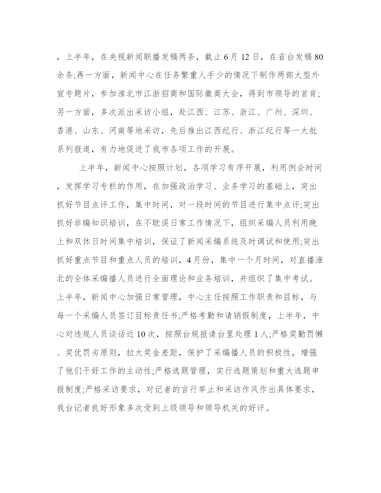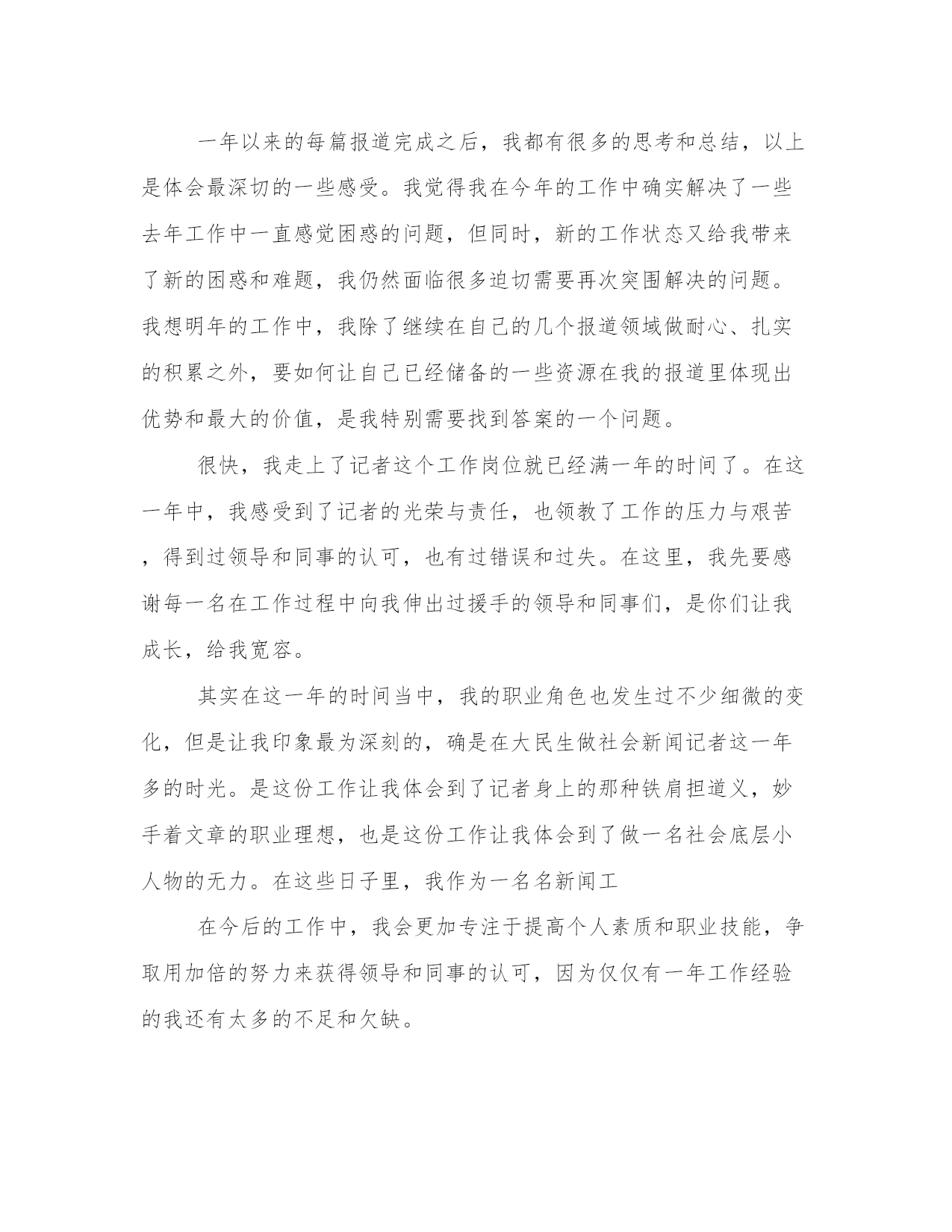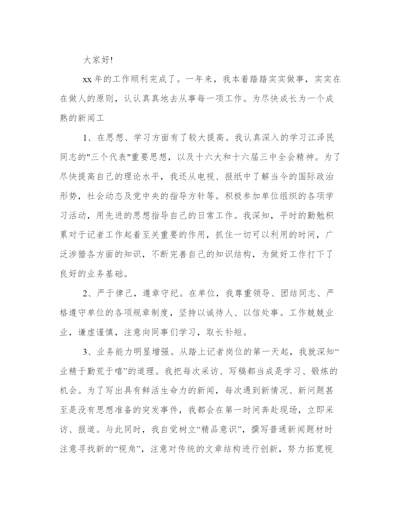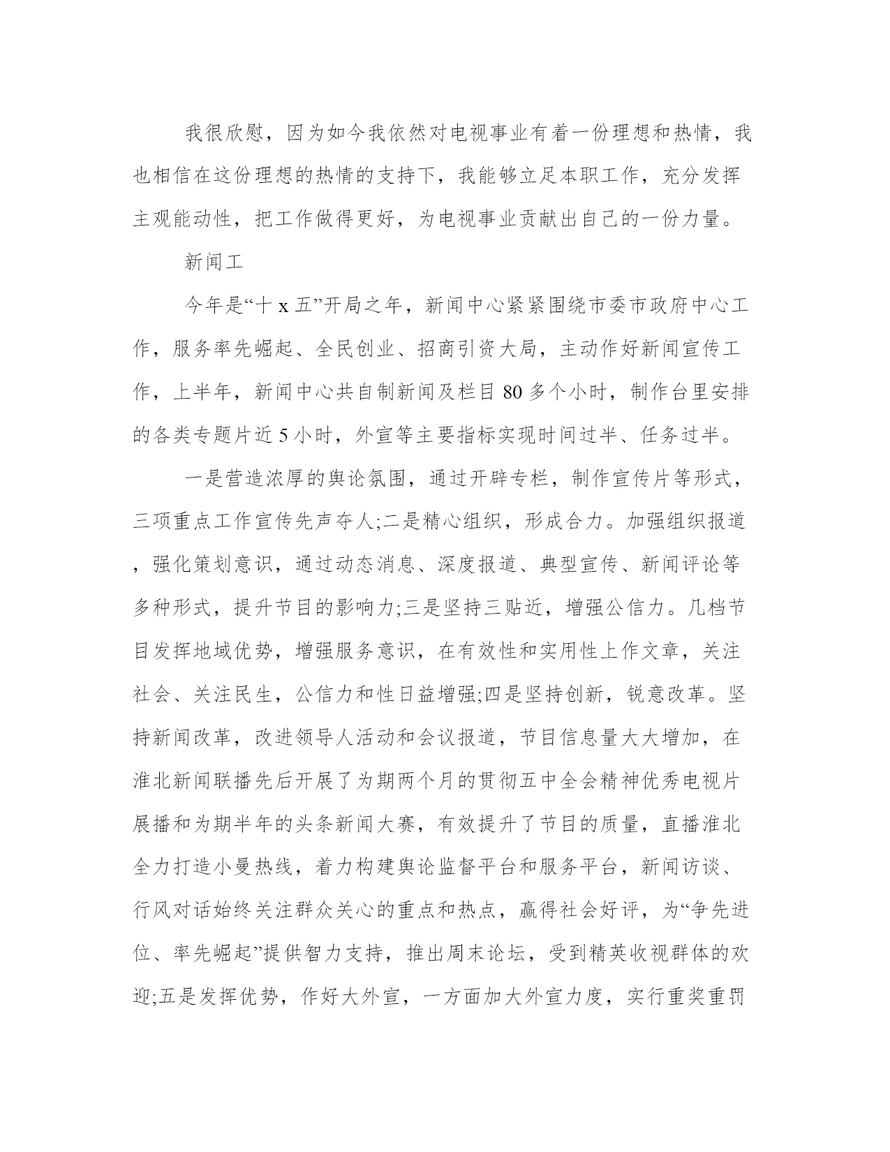 最新新闻工作者年度个人述职报告(5篇)随着个人素质的提升,报告使用的频率越来越高,我们在写报告的时候要注意逻辑的合理性。那么我们该如何写一篇较为完美的报告呢?下面是小编给大家带来的报告的范文模板,希望能够帮到你哟!新闻工在今年的日常工作中,我对本市各大媒体的经济栏目都进行了细致的分析,摸准了我所跑银行的定位,同时我也意识到:我必需努力学习,争取能够以一名专业人士的视角来审视新闻。厚积才能薄发,我通过业余时间恶补专业课程,同时阅读大量专业性报纸,观察优秀记者独特的视角、新闻切入点,同时认真阅读经济部同事的新闻报道。通过一段时间的观察,我认识到:好的经济记者必须具备举一反三,触类旁通的能力;必须具有充足的知识储备(新闻的敏感性是建立在广泛的知识储备的基础上的)。为了尽快达到这个目标,我做了大量的工作。第一,我坚持收看中央电视台、天津电视台的经济节目,从中了解金融基础知识和重点热点经济问题。第二,我努力做一个有心人,注意身边人们谈论各类话题中有价值的东西,以备不时之需。记得在去年年初,我作为一个新记者,工作初期开展银行的新闻采写异常艰难,我通过阅读和观察,找到了一些颇具特色的新闻点,完成了20xx年年初的一些理财稿件。我深刻地认识到,新闻记者最可贵、也是最重要的素质就是敏锐。新闻拼体力,拼智力,拼反应速度。反应速度的基础有三个:一是扎实的基础,二是丰富的经验,三是正确科学的方法。作为从业时间不长的新记者,我着重从方法上下功夫:每接一个选题,我都要求自己在最短的时间内选准切入点,对较熟悉的领域,我多学多问,多向有经验的同事请教,深思慎取;对比较陌生的范围,我采用上网查询的方式,在最短的时间内了解背景资料,迅速扫清障碍。20xx年7月8、9两天连续发表的英恐怖连环爆炸对经济影响系列一组稿件内容丰富、资料翔实、有一定深度的新闻稿就是在这种基础上写成的,获得了报社的好稿奖。金融新闻具有极强的专业性,近一个多月来,我通过对本市各家银行行长的采访以及写稿,我越来越明白一个道理:只有努力拼搏,变压力为动力,坚持不懈才能锻炼自己的水平、磨练自己的意志力和能力,努力、坚韧就一定会有收获,采访对象的一些优点也是自己增长能量的一种养分。一年以来的每篇报道完成之后,我都有很多的思考和总结,以上是体会最深切的一些感受。我觉得我在今年的工作中确实解决了一些去年工作中一直感觉困惑的问题,但同时,新的工作状态又给我带来了新的困惑和难题,我仍然面临很多迫切需要再次突围解决的问题。我想明年的工作中,我除了继续在自己的几个报道领域做耐心、扎实的积累之外,要如何让自己已经储备的一些资源在我的报道里体现出优势和最大的价值,是我特别需要找到答案的一个问题。很快,我走上了记者这个工作岗位就已经满一年的时间了。在这一年中,我感受到了记者的光荣与责任,也领教了工作的压力与艰苦,得到过领导和同事的认可,也有过错误和过失。在这里,我先要感谢每一名在工作过程中向我伸出过援手的领导和同事们,是你们让我成长,给我宽容。其实在这一年的时间当中,我的职业角色也发生过不少细微的变化,但是让我印象最为深刻的,确是在大民生做社会新闻记者这一年多的时光。是这份工作让我体会到了记者身上的那种铁肩担道义,妙手着文章的职业理想,也是这份工作让我体会到了做一名社会底层小人物的无力。在这些日子里,我作为一名名新闻工在今后的工作中,我会更加专注于提高个人素质和职业技能,争取用加倍的努力来获得领导和同事的认可,因为仅仅有一年工作经验的我还有太多的不足和欠缺。我很欣慰,因为如今我依然对电视事业有着一份理想和热情,我也相信在这份理想的热情的支持下,我能够立足本职工作,充分发挥主观能动性,把工作做得更好,为电视事业贡献出自己的一份力量。新闻工今年是“十x五”开局之年,新闻中心紧紧围绕市委市政府中心工作,服务率先崛起、全民创业、招商引资大局,主动作好新闻宣传工作,上半年,新闻中心共自制新闻及栏目80多个小时,制作台里安排的各类专题片近5小时,外宣等主要指标实现时间过半、任务过半。一是营造浓厚的舆论氛围,通过开辟专栏,制作宣传片等形式,三项重点工作宣传先声夺人;二是精心组织,形成合力。加强组织报道,强化策划意识,通过动态消息、深度报道、典型宣传、新闻评论等多种形式,提升节目的影响力;三是坚持三贴近,增强公信力。几档节目发挥地域优势,增强服务意识,在有效性和实用性上作文章,关注社会、关注民生,公信力和性日益增强;四是坚持创新,锐意改革。坚持新闻改革,改进领导人活动和会议报道,节目信息量大大增加,在淮北新闻联播先后开展了为期两个月的贯彻五中全会精神优秀电视片展播和为期半年的头条新闻大赛,有效提升了节目的质量,直播淮北全力打造小曼热线,着力构建舆论监督平台和服务平台,新闻访谈、行风对话始终