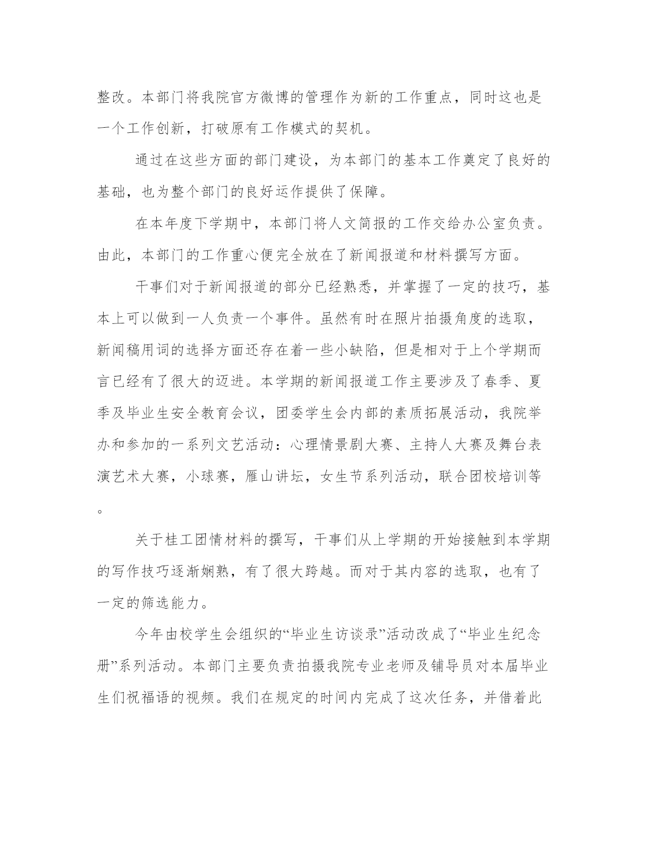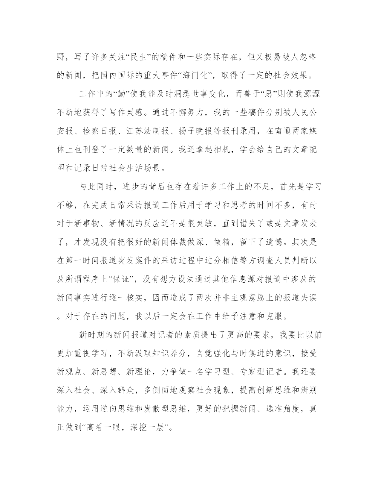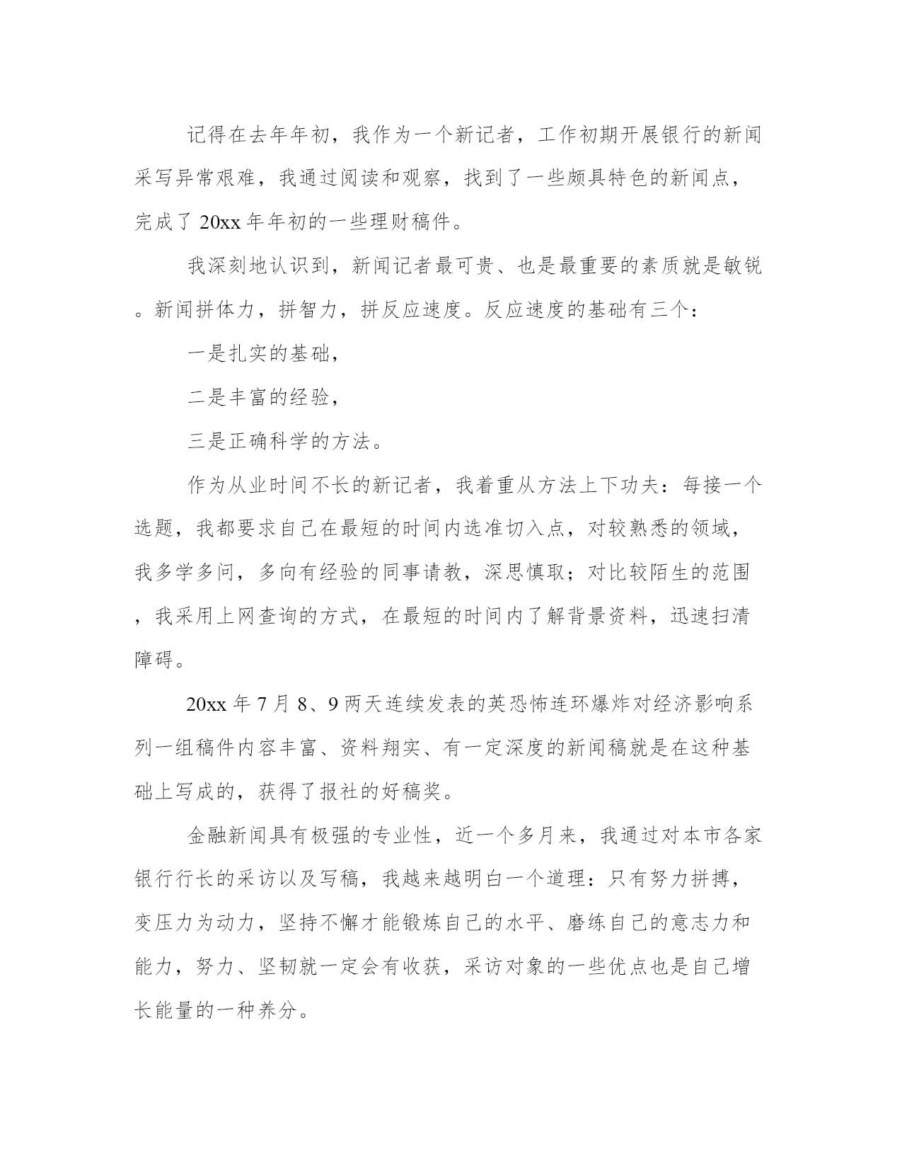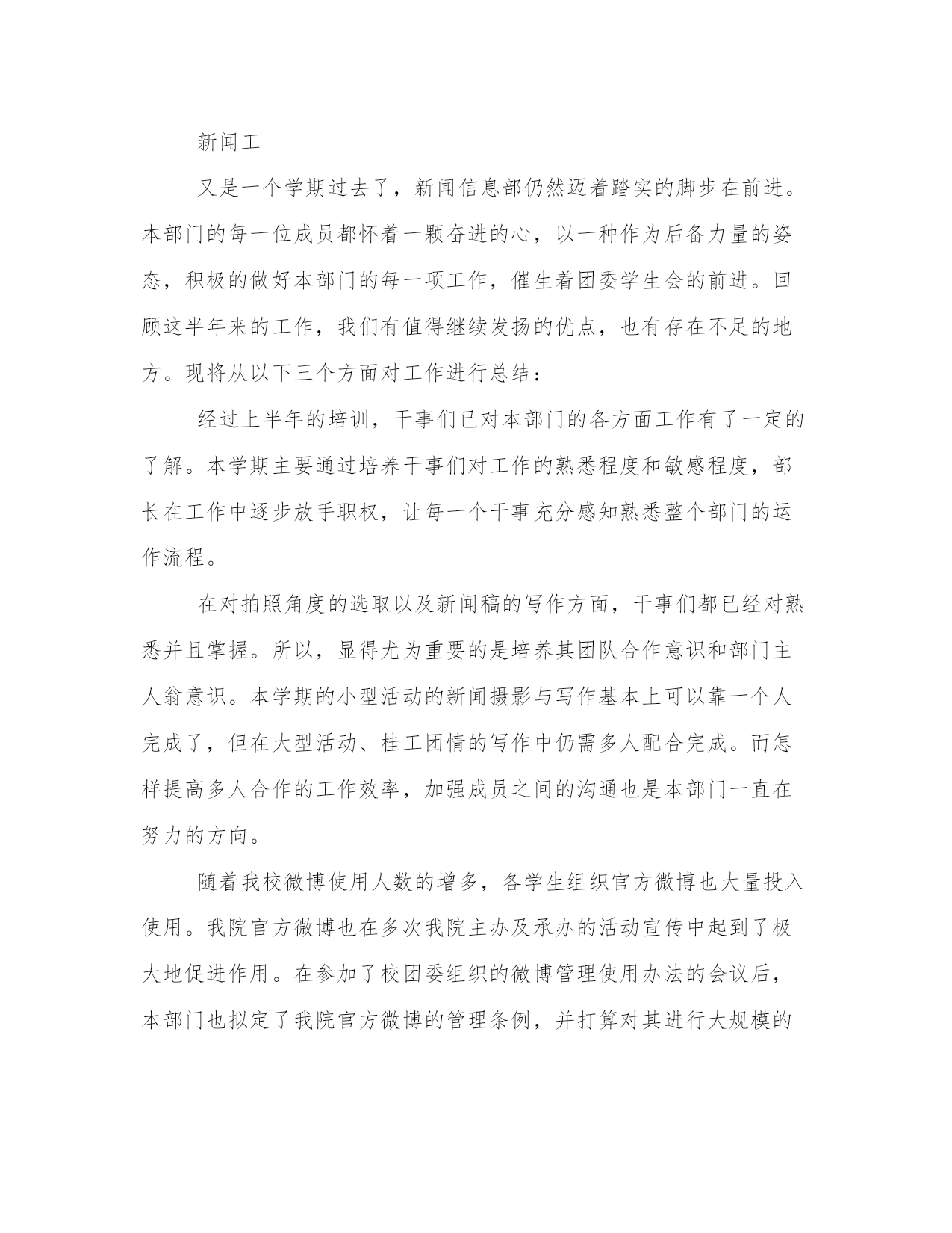 最新新闻工作者年度个人述职报告(5篇)随着个人素质的提升,报告使用的频率越来越高,我们在写报告的时候要注意逻辑的合理性。那么我们该如何写一篇较为完美的报告呢?下面是小编给大家带来的报告的范文模板,希望能够帮到你哟!新闻工在今年的日常工作中,我对本市各大媒体的经济栏目都进行了细致的分析,摸准了我所跑银行的定位,同时我也意识到:我必需努力学习,争取能够以一名专业人士的视角来审视新闻。厚积才能薄发,我通过业余时间恶补专业课程,同时阅读大量专业性报纸,观察优秀记者独特的视角、新闻切入点,同时认真阅读经济部同事的新闻报道。通过一段时间的观察,我认识到:好的经济记者必须具备举一反三,触类旁通的能力;必须具有充足的知识储备(新闻的敏感性是建立在广泛的知识储备的基础上的)。为了尽快达到这个目标,我做了大量的工作。第一,我坚持收看中央电视台、天津电视台的经济节目,从中了解金融基础知识和重点热点经济问题。第二,我努力做一个有心人,注意身边人们谈论各类话题中有价值的东西,以备不时之需。记得在去年年初,我作为一个新记者,工作初期开展银行的新闻采写异常艰难,我通过阅读和观察,找到了一些颇具特色的新闻点,完成了20xx年年初的一些理财稿件。我深刻地认识到,新闻记者最可贵、也是最重要的素质就是敏锐。新闻拼体力,拼智力,拼反应速度。反应速度的基础有三个:一是扎实的基础,二是丰富的经验,三是正确科学的方法。作为从业时间不长的新记者,我着重从方法上下功夫:每接一个选题,我都要求自己在最短的时间内选准切入点,对较熟悉的领域,我多学多问,多向有经验的同事请教,深思慎取;对比较陌生的范围,我采用上网查询的方式,在最短的时间内了解背景资料,迅速扫清障碍。20xx年7月8、9两天连续发表的英恐怖连环爆炸对经济影响系列一组稿件内容丰富、资料翔实、有一定深度的新闻稿就是在这种基础上写成的,获得了报社的好稿奖。金融新闻具有极强的专业性,近一个多月来,我通过对本市各家银行行长的采访以及写稿,我越来越明白一个道理:只有努力拼搏,变压力为动力,坚持不懈才能锻炼自己的水平、磨练自己的意志力和能力,努力、坚韧就一定会有收获,采访对象的一些优点也是自己增长能量的一种养分。一年以来的每篇报道完成之后,我都有很多的思考和总结,以上是体会最深切的一些感受。我觉得我在今年的工作中确实解决了一些去年工作中一直感觉困惑的问题,但同时,新的工作状态又给我带来了新的困惑和难题,我仍然面临很多迫切需要再次突围解决的问题。我想明年的工作中,我除了继续在自己的几个报道领域做耐心、扎实的积累之外,要如何让自己已经储备的一些资源在我的报道里体现出优势和最大的价值,是我特别需要找到答案的一个问题。很快,我走上了记者这个工作岗位就已经满一年的时间了。在这一年中,我感受到了记者的光荣与责任,也领教了工作的压力与艰苦,得到过领导和同事的认可,也有过错误和过失。在这里,我先要感谢每一名在工作过程中向我伸出过援手的领导和同事们,是你们让我成长,给我宽容。其实在这一年的时间当中,我的职业角色也发生过不少细微的变化,但是让我印象最为深刻的,确是在大民生做社会新闻记者这一年多的时光。是这份工作让我体会到了记者身上的那种铁肩担道义,妙手着文章的职业理想,也是这份工作让我体会到了做一名社会底层小人物的无力。在这些日子里,我作为一名名新闻工在今后的工作中,我会更加专注于提高个人素质和职业技能,争取用加倍的努力来获得领导和同事的认可,因为仅仅有一年工作经验的我还有太多的不足和欠缺。我很欣慰,因为如今我依然对电视事业有着一份理想和热情,我也相信在这份理想的热情的支持下,我能够立足本职工作,充分发挥主观能动性,把工作做得更好,为电视事业贡献出自己的一份力量。新闻工今年是“十x五”开局之年,新闻中心紧紧围绕市委市政府中心工作,服务率先崛起、全民创业、招商引资大局,主动作好新闻宣传工作,上半年,新闻中心共自制新闻及栏目80多个小时,制作台里安排的各类专题片近5小时,外宣等主要指标实现时间过半、任务过半。一是营造浓厚的舆论氛围,通过开辟专栏,制作宣传片等形式,三项重点工作宣传先声夺人;二是精心组织,形成合力。加强组织报道,强化策划意识,通过动态消息、深度报道、典型宣传、新闻评论等多种形式,提升节目的影响力;三是坚持三贴近,增强公信力。几档节目发挥地域优势,增强服务意识,在有效性和实用性上作文章,关注社会、关注民生,公信力和性日益增强;四是坚持创新,锐意改革。坚持新闻改革,改进领导人活动和会议报道,节目信息量大大增加,在淮北新闻联播先后开展了为期两个月的贯彻五中全会精神优秀电视片展播和为期半年的头条新闻大赛,有效提升了节目的质量,直播淮北全力打造小曼热线,着力构建舆论监督平台和服务平台,新闻访谈、行风对话始终