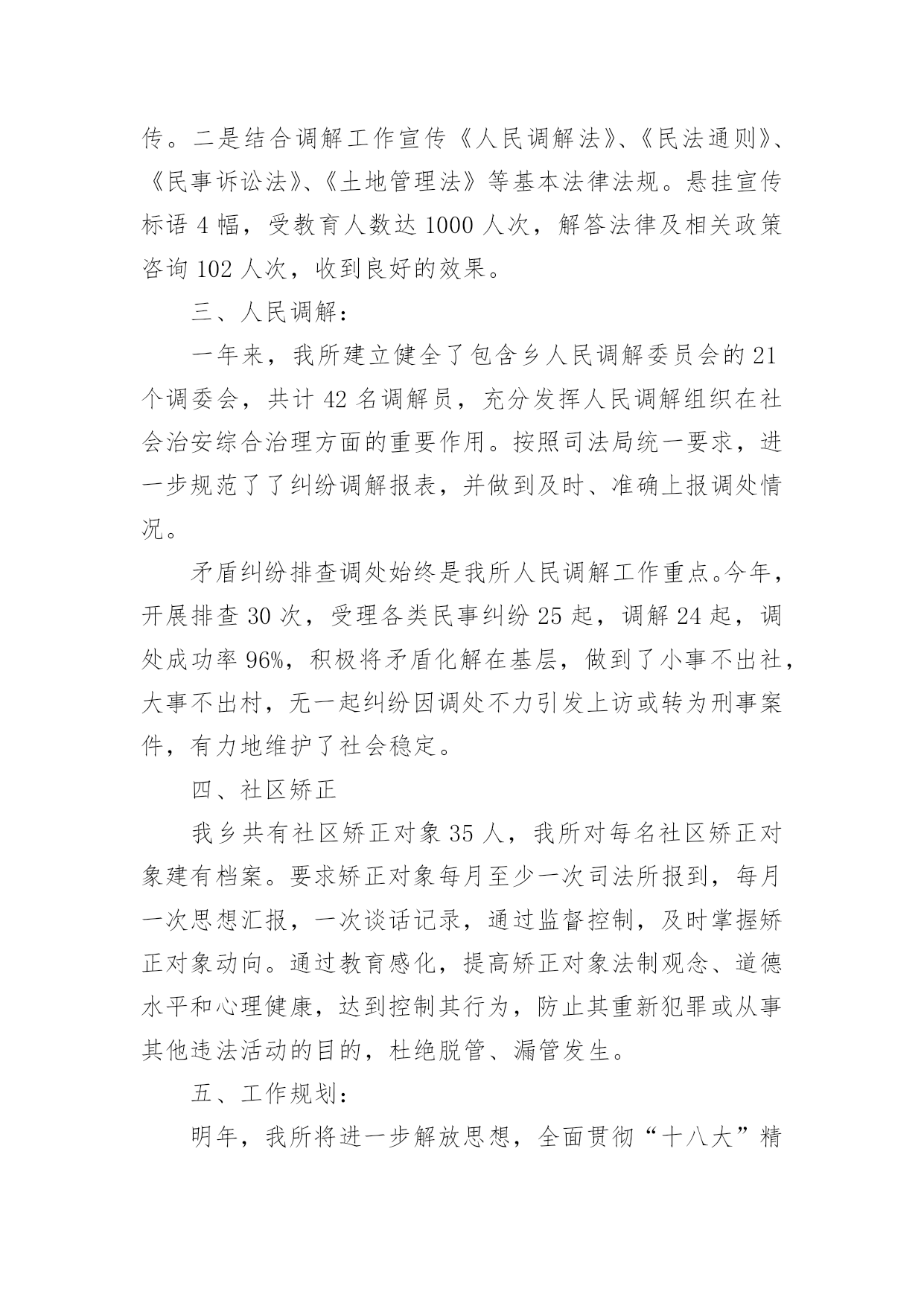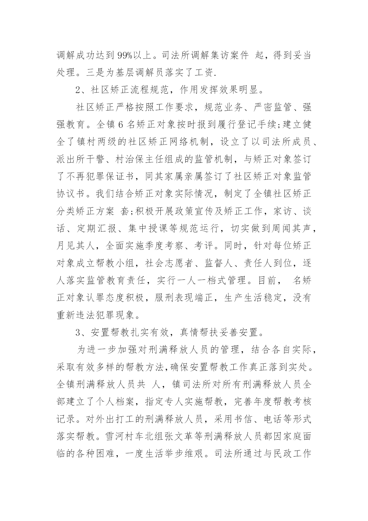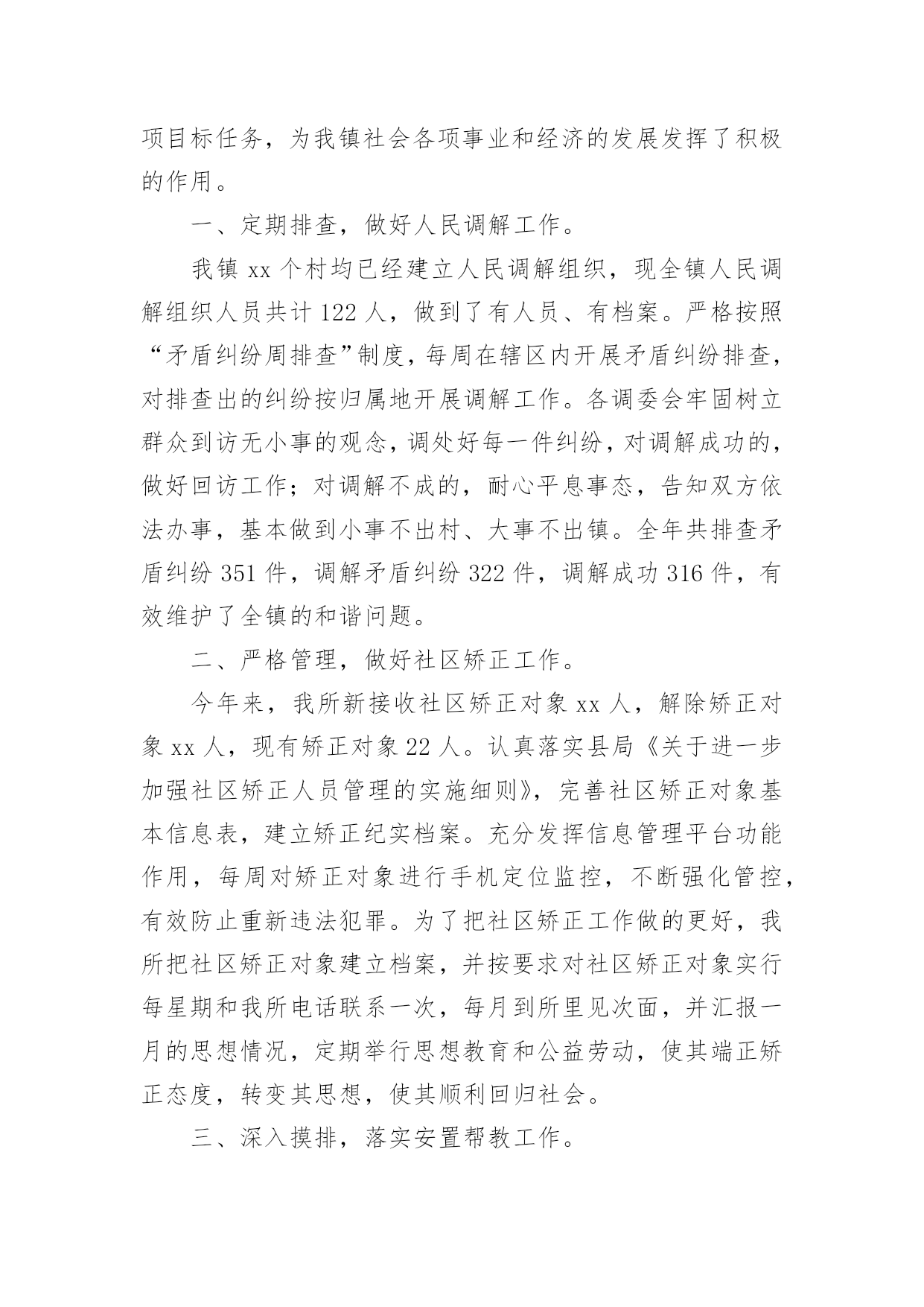 司法所所长个人总结司法所所长个人总结3篇总结是对某一阶段的工作、学习或思想中的经验或情况进行分析研究的书面材料,它能帮我们理顺知识结构,突出重点,突破难点,我想我们需要写一份总结了吧。那么如何把总结写出新花样呢?下面是小编整理的司法所所长个人总结,欢迎阅读与收藏。司法所所长个人总结1xx司法所在镇党委、政府的领导下,在各级指导和大力支持下,以狠抓队伍建设、注重职能发挥、强化管理规范、提升硬件设施和争创文明站所为突破口,认真深入地开展普法教育、依法治理、人民调解、社区矫正、安置帮教、法律服务等工作,较好的完成了年度的各项工作,为xx镇的社会事业和经济发展起到了有力法律保障。现就xx年司法所工作总结如下:一、抓思想政治、扬优良作风打造过硬的司法队伍司法所直接与人民群众打交道,是一个基层窗口单位,担负着千家万户的矛盾纠纷调解和法律服务工作,责任重大。能否适应新形势的需要,有一支政治素质高、业务能力强、作风纪律硬的司法行政队伍,直接影响着司法行政工作开展的好坏。我们本着“提升水平、打造品牌、发扬传统、坚定信念”的思想,不断加强思想教育工作。使每一位工作人员有一颗扎根基层,服务百姓的红心,想群众之所想,急群众之所急,明确自身职责,发挥自己作用。树立“人民利益高于一切,人民呼声急于一切,人民疾苦先于一切”的服务理念,每名干部都能熟练的使用电脑和专用系统;建立政治学习制度,坚持每月开展学习。积极参加各种法律培训班、认真学习典型案例,不断的.讨论交流,充分提高司法工作人员的业务理论水平。在思想上、政治上、行动上与党委、政府能保持高度的一致,爱岗敬业、乐于奉献,思想觉悟高、政治素质好。每一位干警都能做到依法办事,不徇私情,不谋私利。形成了一支工作作风扎实、业务能力过硬、实事求是的良好司法干部队伍。二、立足本职、服务社会、充分发挥司法职能1、积极开展人民调解工作,发挥维稳第一防线作用。一是紧紧围绕镇党委、镇政府的中心工作,努力做好排查社会不安定因素和调解社会矛盾纠纷工作,积极预防矛盾纠纷的激化。按照“那里有人群,哪里就有调解组织”要求,进一步加强标准化调委会创建工作,截止目前共创建基层标准化调委会13个,均能按照要求正常开展工作;二是按照“人民调解制度化、规范化、法制化”要求,今年上半年共召开镇村两级调委会及人民调解员业务培训会3次,全面培训指导各调委会工作规范化运作;三是加强信息反馈、数据统计,坚持每月进行矛盾纠纷排查,全面准确掌握工作动态。今年,共调解各类纠纷起,调解成功起。受理达到100%,调解成功达到99%以上。司法所调解集访案件起,得到妥当处理。三是为基层调解员落实了工资.2、社区矫正流程规范,作用发挥效果明显。社区矫正严格按照工作要求,规范业务、严密监管、强强教育。全镇6名矫正对象按时报到履行登记手续;建立健全了镇村两级的社区矫正网络机制,设立了以司法所成员、派出所干警、村治保主任组成的监管机制,与矫正对象签订了不再犯罪保证书,同其家属亲属签订了社区矫正对象监管协议书。我们结合矫正对象实际情况,制定了全镇社区矫正分类矫正方案套;积极开展政策宣传及矫正工作,家访、谈话、定期汇报、集中授课等规范运行,切实做到周闻其声,月见其人,全面实施季度考察、考评。同时,针对每位矫正对象成立帮教小组,社会志愿者、监督人、责任人到位,逐人落实监管教育责任,实行一人一档式管理。目前,名矫正对象认罪态度积极,服刑表现端正,生产生活稳定,没有重新违法犯罪现象。3、安置帮教扎实有效,真情帮扶妥善安置。为进一步加强对刑满释放人员的管理,结合各自实际,采取有效多样的帮教方法,确保安置帮教工作真正落到实处。全镇刑满释放人员共人,镇司法所对所有刑满释放人员全部建立了个人档案,指定专人实施帮教,完善年度帮教考核记录。对外出打工的刑满释放人员,采用书信、电话等形式落实帮教。雪河村车北组张文革等刑满释放人员都因家庭面临的各种困难,一度生活举步维艰。司法所通过与民政工作站联系,为他们争取了边缘人群生活补助,累计解决救助资金余元,并为其家庭办了农村低保,解决了生活中的实际问题。通过人性化的帮教工作,使解教人员彻底走出低落情绪,重新树立起了生活的勇气和信心。司法所所长个人总结2xx年,司法所在乡党委、政府的正确领导和县司法局的精心指导下,以创新务实的工作姿态,创新普法依法治理工作,拓展和规范法律服务,充分发挥法制宣传、人民调解、社区矫正、安置帮教等各项工作职能,为乡经济社会发展营造良好的法制环境,更好地为地方发展和社会稳定服务。回顾一年来的工作,我们主要做了以下努力:一、司法所建设:司法所现有工作人员5人,村调解人员共计42人。乡司法所配备了专门的调解室、办公室,电脑、打印机、摄录机等,工作基础设施比较完善。为了逐步实现司法所的`规范化管理,我们制定了下列规章制度:1、司法所工