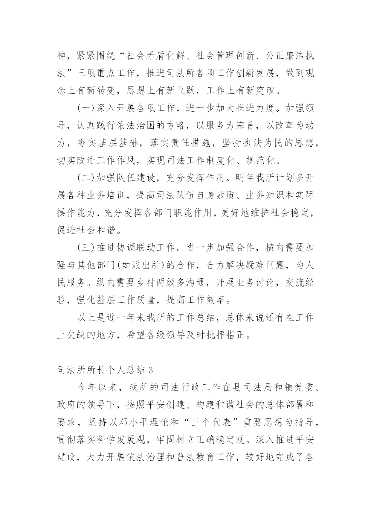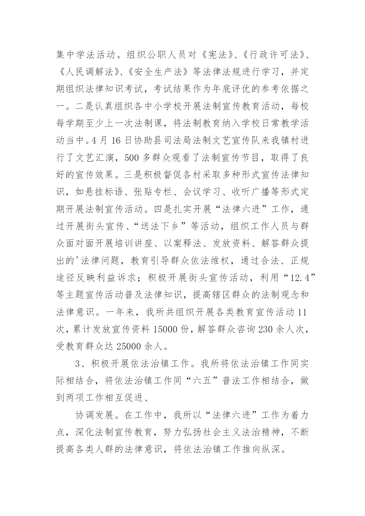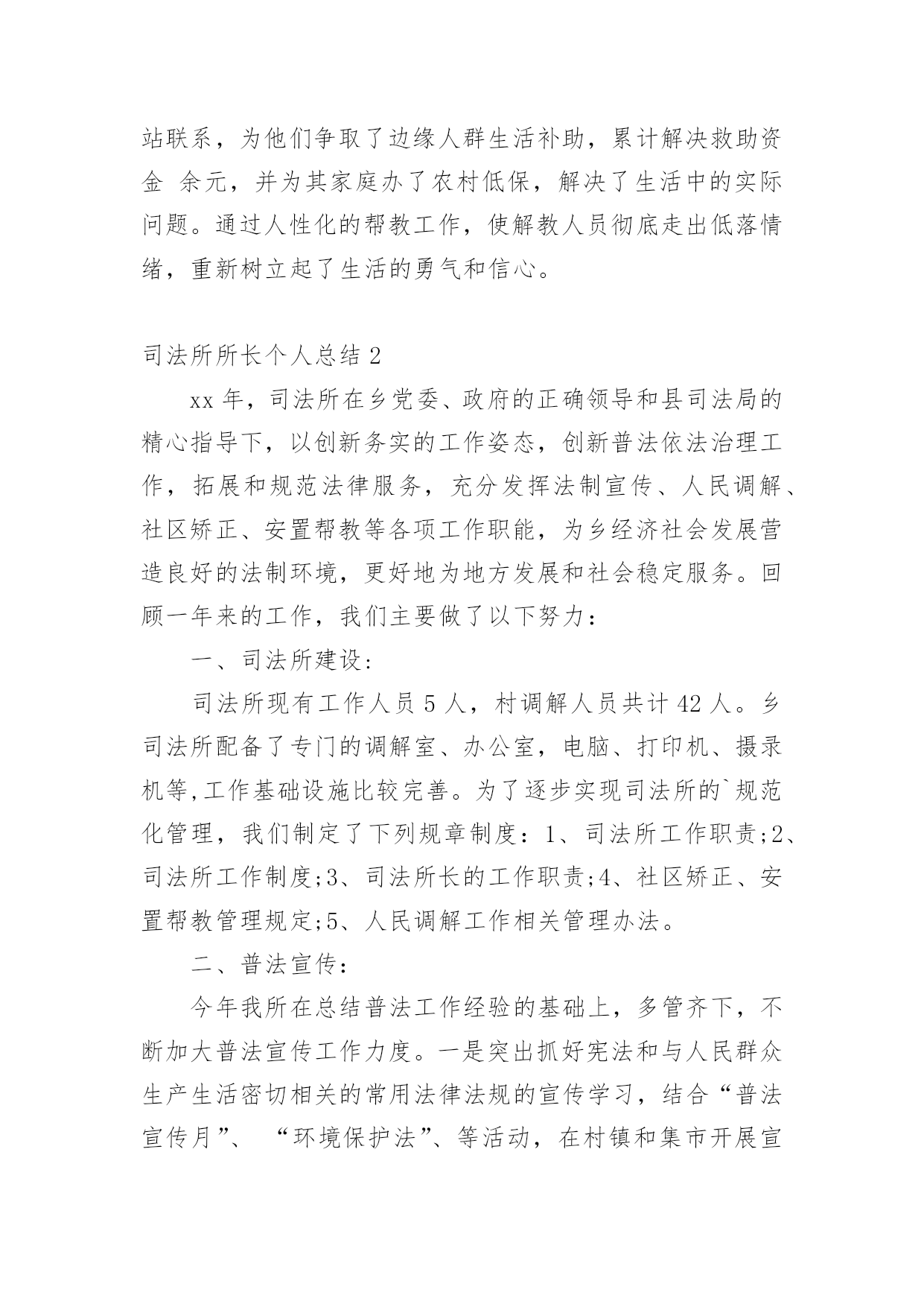 司法所所长个人总结司法所所长个人总结3篇总结是对某一阶段的工作、学习或思想中的经验或情况进行分析研究的书面材料,它能帮我们理顺知识结构,突出重点,突破难点,我想我们需要写一份总结了吧。那么如何把总结写出新花样呢?下面是小编整理的司法所所长个人总结,欢迎阅读与收藏。司法所所长个人总结1xx司法所在镇党委、政府的领导下,在各级指导和大力支持下,以狠抓队伍建设、注重职能发挥、强化管理规范、提升硬件设施和争创文明站所为突破口,认真深入地开展普法教育、依法治理、人民调解、社区矫正、安置帮教、法律服务等工作,较好的完成了年度的各项工作,为xx镇的社会事业和经济发展起到了有力法律保障。现就xx年司法所工作总结如下:一、抓思想政治、扬优良作风打造过硬的司法队伍司法所直接与人民群众打交道,是一个基层窗口单位,担负着千家万户的矛盾纠纷调解和法律服务工作,责任重大。能否适应新形势的需要,有一支政治素质高、业务能力强、作风纪律硬的司法行政队伍,直接影响着司法行政工作开展的好坏。我们本着“提升水平、打造品牌、发扬传统、坚定信念”的思想,不断加强思想教育工作。使每一位工作人员有一颗扎根基层,服务百姓的红心,想群众之所想,急群众之所急,明确自身职责,发挥自己作用。树立“人民利益高于一切,人民呼声急于一切,人民疾苦先于一切”的服务理念,每名干部都能熟练的使用电脑和专用系统;建立政治学习制度,坚持每月开展学习。积极参加各种法律培训班、认真学习典型案例,不断的.讨论交流,充分提高司法工作人员的业务理论水平。在思想上、政治上、行动上与党委、政府能保持高度的一致,爱岗敬业、乐于奉献,思想觉悟高、政治素质好。每一位干警都能做到依法办事,不徇私情,不谋私利。形成了一支工作作风扎实、业务能力过硬、实事求是的良好司法干部队伍。二、立足本职、服务社会、充分发挥司法职能1、积极开展人民调解工作,发挥维稳第一防线作用。一是紧紧围绕镇党委、镇政府的中心工作,努力做好排查社会不安定因素和调解社会矛盾纠纷工作,积极预防矛盾纠纷的激化。按照“那里有人群,哪里就有调解组织”要求,进一步加强标准化调委会创建工作,截止目前共创建基层标准化调委会13个,均能按照要求正常开展工作;二是按照“人民调解制度化、规范化、法制化”要求,今年上半年共召开镇村两级调委会及人民调解员业务培训会3次,全面培训指导各调委会工作规范化运作;三是加强信息反馈、数据统计,坚持每月进行矛盾纠纷排查,全面准确掌握工作动态。今年,共调解各类纠纷起,调解成功起。受理达到100%,调解成功达到99%以上。司法所调解集访案件起,得到妥当处理。三是为基层调解员落实了工资.2、社区矫正流程规范,作用发挥效果明显。社区矫正严格按照工作要求,规范业务、严密监管、强强教育。全镇6名矫正对象按时报到履行登记手续;建立健全了镇村两级的社区矫正网络机制,设立了以司法所成员、派出所干警、村治保主任组成的监管机制,与矫正对象签订了不再犯罪保证书,同其家属亲属签订了社区矫正对象监管协议书。我们结合矫正对象实际情况,制定了全镇社区矫正分类矫正方案套;积极开展政策宣传及矫正工作,家访、谈话、定期汇报、集中授课等规范运行,切实做到周闻其声,月见其人,全面实施季度考察、考评。同时,针对每位矫正对象成立帮教小组,社会志愿者、监督人、责任人到位,逐人落实监管教育责任,实行一人一档式管理。目前,名矫正对象认罪态度积极,服刑表现端正,生产生活稳定,没有重新违法犯罪现象。3、安置帮教扎实有效,真情帮扶妥善安置。为进一步加强对刑满释放人员的管理,结合各自实际,采取有效多样的帮教方法,确保安置帮教工作真正落到实处。全镇刑满释放人员共人,镇司法所对所有刑满释放人员全部建立了个人档案,指定专人实施帮教,完善年度帮教考核记录。对外出打工的刑满释放人员,采用书信、电话等形式落实帮教。雪河村车北组张文革等刑满释放人员都因家庭面临的各种困难,一度生活举步维艰。司法所通过与民政工作站联系,为他们争取了边缘人群生活补助,累计解决救助资金余元,并为其家庭办了农村低保,解决了生活中的实际问题。通过人性化的帮教工作,使解教人员彻底走出低落情绪,重新树立起了生活的勇气和信心。司法所所长个人总结2xx年,司法所在乡党委、政府的正确领导和县司法局的精心指导下,以创新务实的工作姿态,创新普法依法治理工作,拓展和规范法律服务,充分发挥法制宣传、人民调解、社区矫正、安置帮教等各项工作职能,为乡经济社会发展营造良好的法制环境,更好地为地方发展和社会稳定服务。回顾一年来的工作,我们主要做了以下努力:一、司法所建设:司法所现有工作人员5人,村调解人员共计42人。乡司法所配备了专门的调解室、办公室,电脑、打印机、摄录机等,工作基础设施比较完善。为了逐步实现司法所的`规范化管理,我们制定了下列规章制度:1、司法所工