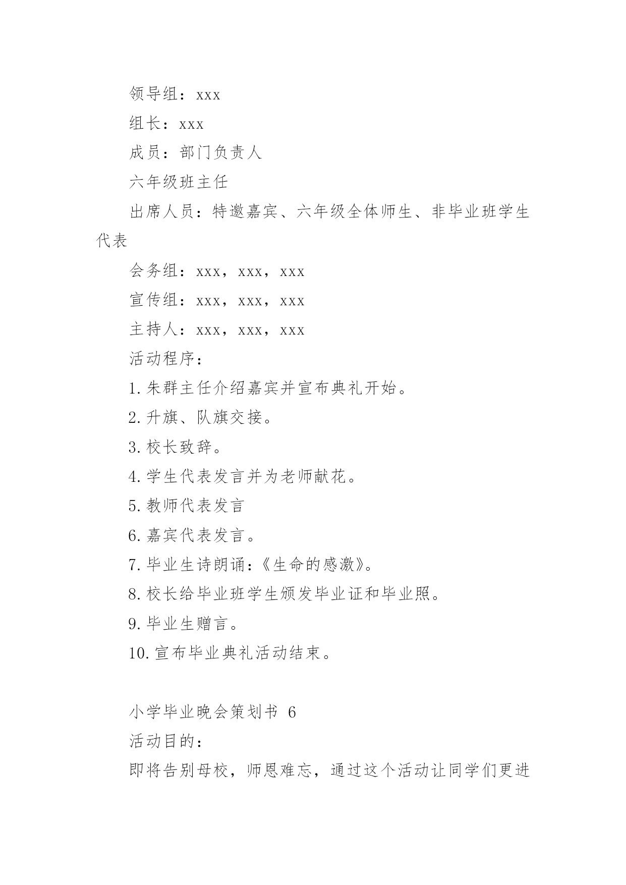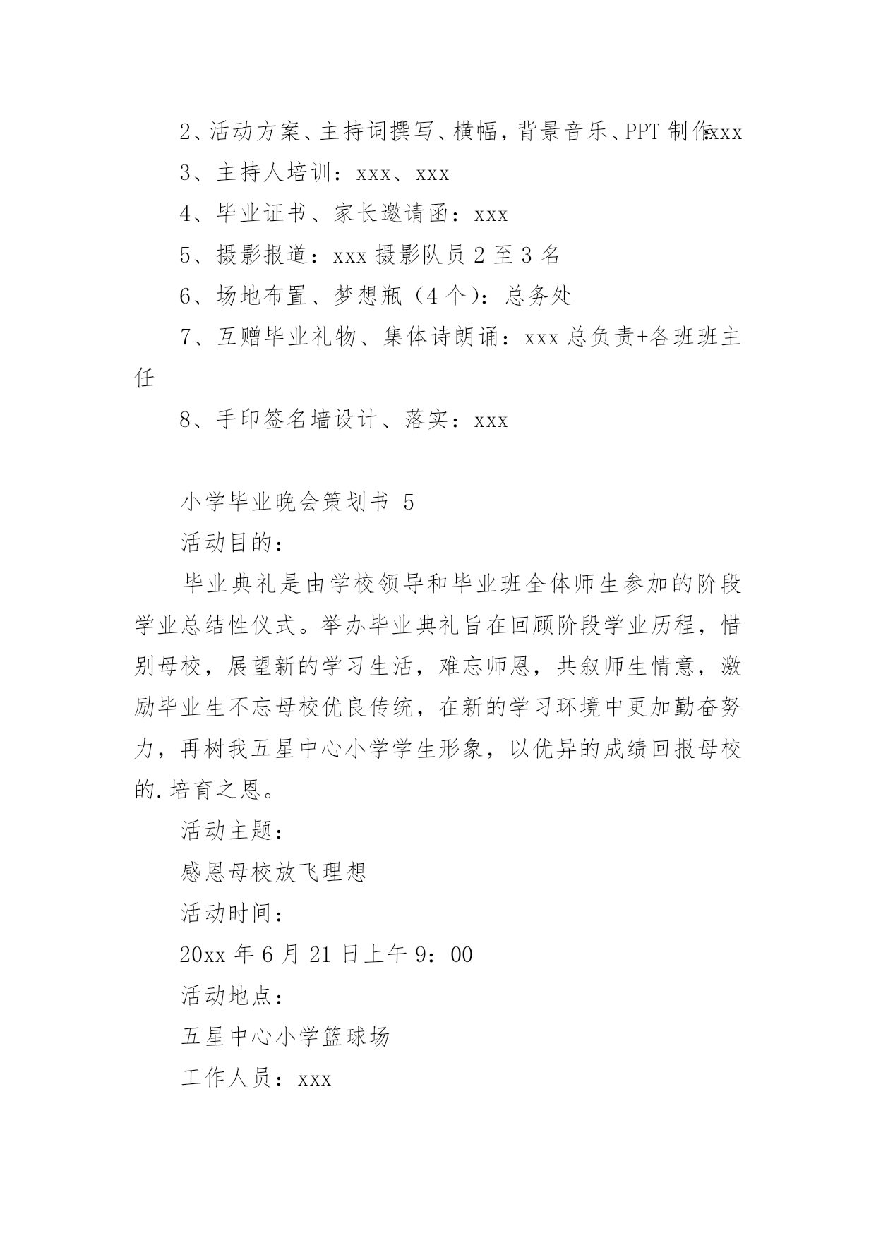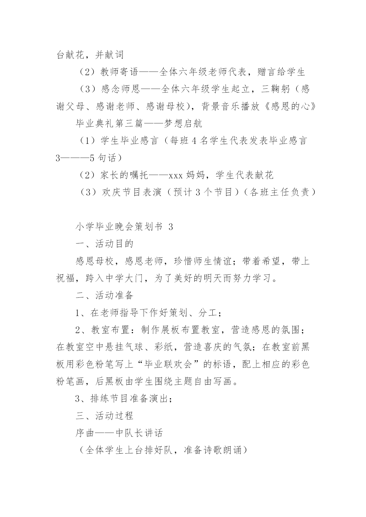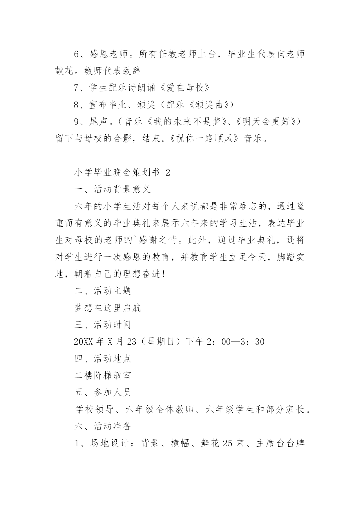 小学毕业晚会策划书小学毕业晚会策划书范文(精选10篇)时间过得真快,一段时间的工作已经告一段落了,你有制定过下阶段的工作目标吗?需要认真地为此写一份策划书。写策划书需要注意哪些问题呢?以下是小编精心整理的小学毕业晚会策划书范文,欢迎大家借鉴与参考,希望对大家有所帮助。小学毕业晚会策划书1一、活动目的六年的小学生活对每一个人来说都是非常难忘的,在小学里学生开始学会做人、学会学习、学会交往、学会实践。在毕业季,我们通过隆重而有意义的`毕业典礼,展示六年来的教育效果,表达这六年级学习生活中结下的“师生之情、同窗之谊”。让学生的小学生活画上圆满的句号,展望更美好的未来。二、主题“百年校园,梦想起点”——xx小学20xx届六年级毕业典礼三、时间7月2日上午8:30分(提前半小时报到)四、地点xx小学报告厅五、参加人员六年级任课老师、六年级学生、家长、全体行政人员。六、活动准备1、主持、主持词串接:学生2名2、《那些年》MTV,PPT背景3、音响调试、摄影摄像、灯4、主席台布置、横幅、花束准备5、颁发毕业证书,优秀毕业生荣誉证书6、诗朗诵:学生4名7、其他:校长致辞,教师致辞,学生代表发言,13位献花的学生入座:根据会场标识,会场从左向右依次为一班、二班、三班、四班,学生坐前面,家长坐后面,校长、教导、班主任坐第一排,其他老师坐便于进出的座位。七、活动流程1、序曲——音乐《毕业生》、《祝你一路顺风》(会场准备)投影“百年xx,梦想起点”——xx小学20xx届毕业典礼2、开场白,宣布典礼开始。3、回忆(滚动播放:“那些年”MTV)(音乐:《阳光总在风雨后》《最后一个夏天》《再见吧,校园》)4、校长致辞。5、感恩父母。学生表达对父母的感恩之情。(配乐《烛光里的妈妈》,说一声:谢谢你爸爸或者妈妈!6、感恩老师。所有任教老师上台,毕业生代表向老师献花。教师代表致辞7、学生配乐诗朗诵《爱在母校》8、宣布毕业、颁奖(配乐《颁奖曲》)9、尾声。(音乐《我的未来不是梦》、《明天会更好》)留下与母校的合影,结束。《祝你一路顺风》音乐。小学毕业晚会策划书2一、活动背景意义六年的小学生活对每个人来说都是非常难忘的,通过隆重而有意义的毕业典礼来展示六年来的学习生活,表达毕业生对母校的老师的`感谢之情。此外,通过毕业典礼,还将对学生进行一次感恩的教育,并教育学生立足今天,脚踏实地,朝着自己的理想奋进!二、活动主题梦想在这里启航三、活动时间20XX年X月23(星期日)下午2:00—3:30四、活动地点二楼阶梯教室五、参加人员学校领导、六年级全体教师、六年级学生和部分家长。六、活动准备1、场地设计:背景、横幅、鲜花25束、主席台台牌(总务处)2、摄像、音响、投影3、毕业感言。每个班选1名同学,脱稿说一段毕业感言4、诗歌朗诵5、制作学生小学生活回顾片6、选拔好主持人7、六年级23名学生献花。(鲜花+感恩老师的贺卡和祝福语)8、学生给母校献礼(书画作品)9、毕业横幅上签字10、座位安排:各班主任协调。七、毕业典礼议程1、主持人宣布毕业典礼开始。2、介绍到会嘉宾及领导。第一篇——难忘母校(1)校园生活回顾(播放)全体同学诗歌朗诵《告别母校》(2)校长毕业寄语学生代表献花(3)给母校献礼代表学生献上书法等作品毕业典礼第二篇——难忘恩师(1)难忘恩师——全体六年级老师上台,学生代表上台献花,并献词(2)教师寄语——全体六年级老师代表,赠言给学生(3)感念师恩——全体六年级学生起立,三鞠躬(感谢父母、感谢老师、感谢母校),背景音乐播放《感恩的心》毕业典礼第三篇——梦想启航(1)学生毕业感言(每班4名学生代表发表毕业感言3———5句话)(2)家长的嘱托——xxx妈妈,学生代表献花(3)欢庆节目表演(预计3个节目)(各班主任负责)小学毕业晚会策划书3一、活动目的感恩母校,感恩老师,珍惜师生情谊;带着希望,带上祝福,跨入中学大门,为了美好的明天而努力学习。二、活动准备1、在老师指导下作好策划、分工;2、教室布置:制作展板布置教室,营造感恩的氛围;在教室空中悬挂气球、彩纸,营造喜庆的气氛;在教室前黑板用彩色粉笔写上“毕业联欢会”的标语,配上相应的彩色粉笔画,后黑板由学生围绕主题自由写画。3、排练节目准备演出;三、活动过程序曲——中队长讲话(全体学生上台排好队,准备诗歌朗诵)伴随着欢乐的歌声,汲取着空气的`芬芳,我们——一群六年级的孩子,将告别哺育我们成长的母校和朝夕相处的老师。六年的光阴,给我们留下了太多难忘的回忆;六年的相处,让我们难舍难分。在此离别之际,让我们心怀感恩,把心中最美的诗篇献给至亲至爱的恩师;让我们依依惜别,把心底最真最纯的祝福送给亲如兄妹的同学。我宣布——“毕业联欢会”现在开始——活动:集体诗朗诵1、在《感恩的心》乐曲背景下,全体深情朗诵——《老师,我们爱您》2、朗