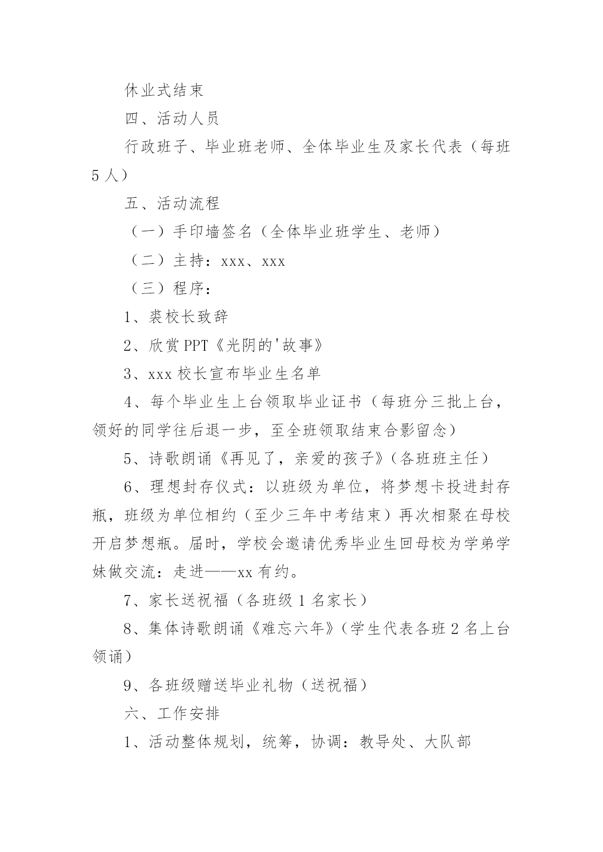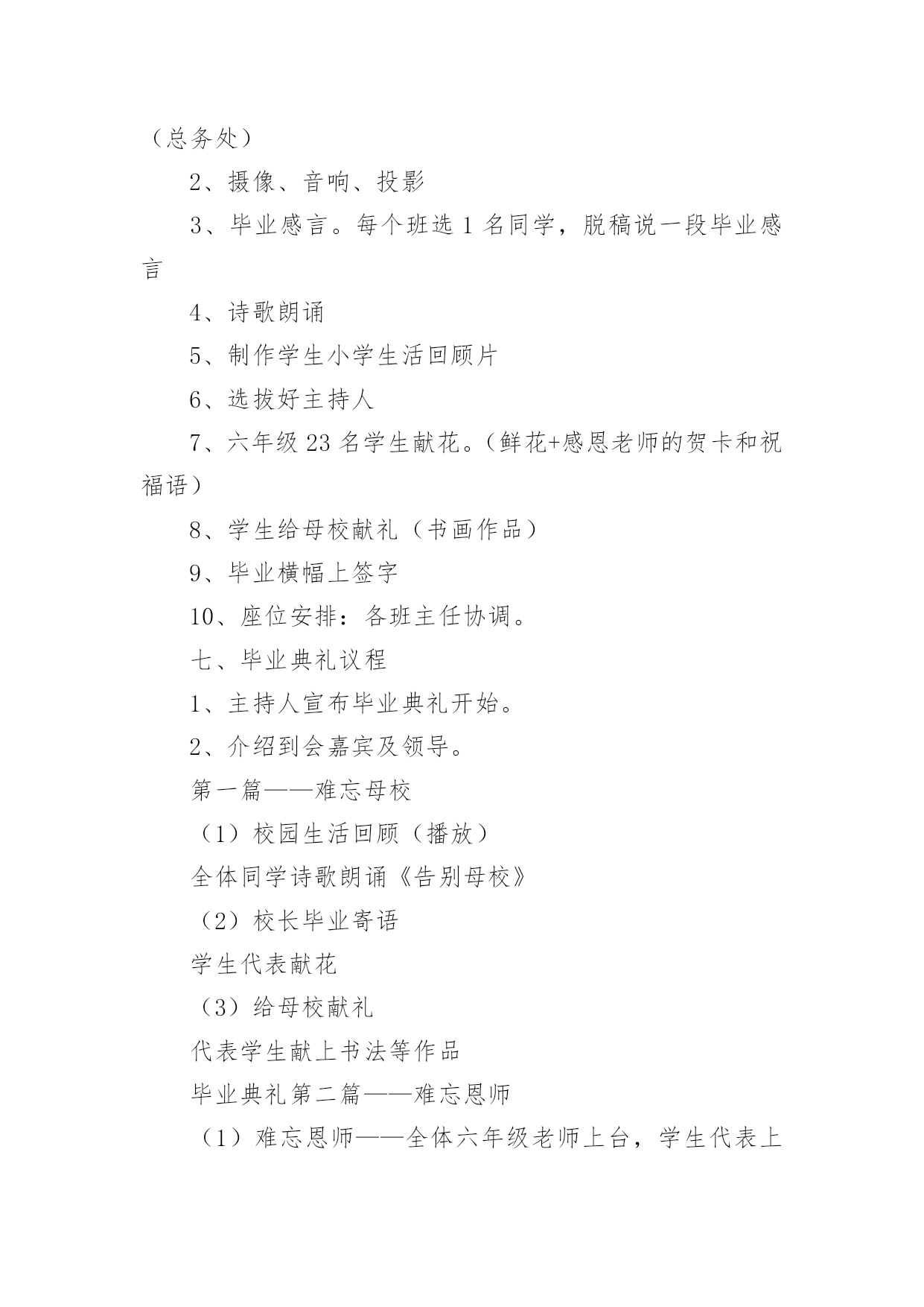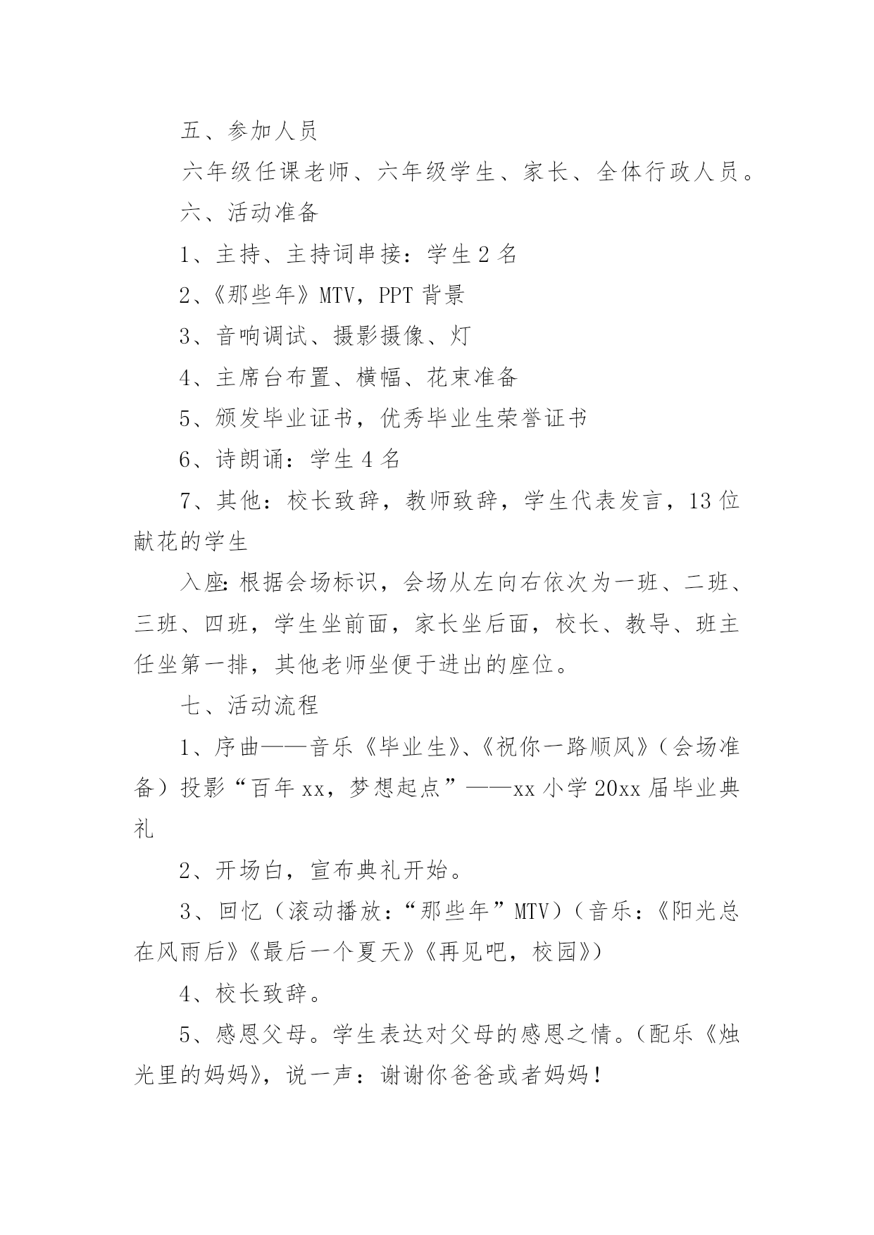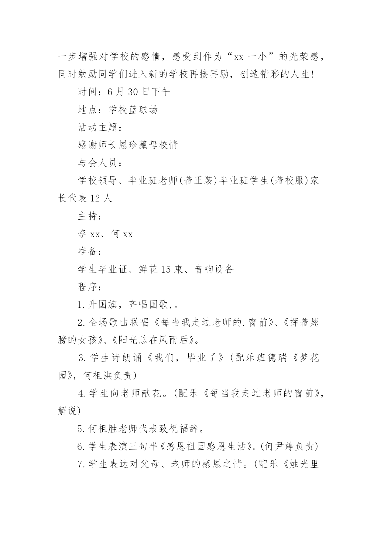小学毕业晚会策划书小学毕业晚会策划书范文(精选10篇)时间过得真快,一段时间的工作已经告一段落了,你有制定过下阶段的工作目标吗?需要认真地为此写一份策划书。写策划书需要注意哪些问题呢?以下是小编精心整理的小学毕业晚会策划书范文,欢迎大家借鉴与参考,希望对大家有所帮助。小学毕业晚会策划书1一、活动目的六年的小学生活对每一个人来说都是非常难忘的,在小学里学生开始学会做人、学会学习、学会交往、学会实践。在毕业季,我们通过隆重而有意义的`毕业典礼,展示六年来的教育效果,表达这六年级学习生活中结下的“师生之情、同窗之谊”。让学生的小学生活画上圆满的句号,展望更美好的未来。二、主题“百年校园,梦想起点”——xx小学20xx届六年级毕业典礼三、时间7月2日上午8:30分(提前半小时报到)四、地点xx小学报告厅五、参加人员六年级任课老师、六年级学生、家长、全体行政人员。六、活动准备1、主持、主持词串接:学生2名2、《那些年》MTV,PPT背景3、音响调试、摄影摄像、灯4、主席台布置、横幅、花束准备5、颁发毕业证书,优秀毕业生荣誉证书6、诗朗诵:学生4名7、其他:校长致辞,教师致辞,学生代表发言,13位献花的学生入座:根据会场标识,会场从左向右依次为一班、二班、三班、四班,学生坐前面,家长坐后面,校长、教导、班主任坐第一排,其他老师坐便于进出的座位。七、活动流程1、序曲——音乐《毕业生》、《祝你一路顺风》(会场准备)投影“百年xx,梦想起点”——xx小学20xx届毕业典礼2、开场白,宣布典礼开始。3、回忆(滚动播放:“那些年”MTV)(音乐:《阳光总在风雨后》《最后一个夏天》《再见吧,校园》)4、校长致辞。5、感恩父母。学生表达对父母的感恩之情。(配乐《烛光里的妈妈》,说一声:谢谢你爸爸或者妈妈!6、感恩老师。所有任教老师上台,毕业生代表向老师献花。教师代表致辞7、学生配乐诗朗诵《爱在母校》8、宣布毕业、颁奖(配乐《颁奖曲》)9、尾声。(音乐《我的未来不是梦》、《明天会更好》)留下与母校的合影,结束。《祝你一路顺风》音乐。小学毕业晚会策划书2一、活动背景意义六年的小学生活对每个人来说都是非常难忘的,通过隆重而有意义的毕业典礼来展示六年来的学习生活,表达毕业生对母校的老师的`感谢之情。此外,通过毕业典礼,还将对学生进行一次感恩的教育,并教育学生立足今天,脚踏实地,朝着自己的理想奋进!二、活动主题梦想在这里启航三、活动时间20XX年X月23(星期日)下午2:00—3:30四、活动地点二楼阶梯教室五、参加人员学校领导、六年级全体教师、六年级学生和部分家长。六、活动准备1、场地设计:背景、横幅、鲜花25束、主席台台牌(总务处)2、摄像、音响、投影3、毕业感言。每个班选1名同学,脱稿说一段毕业感言4、诗歌朗诵5、制作学生小学生活回顾片6、选拔好主持人7、六年级23名学生献花。(鲜花+感恩老师的贺卡和祝福语)8、学生给母校献礼(书画作品)9、毕业横幅上签字10、座位安排:各班主任协调。七、毕业典礼议程1、主持人宣布毕业典礼开始。2、介绍到会嘉宾及领导。第一篇——难忘母校(1)校园生活回顾(播放)全体同学诗歌朗诵《告别母校》(2)校长毕业寄语学生代表献花(3)给母校献礼代表学生献上书法等作品毕业典礼第二篇——难忘恩师(1)难忘恩师——全体六年级老师上台,学生代表上台献花,并献词(2)教师寄语——全体六年级老师代表,赠言给学生(3)感念师恩——全体六年级学生起立,三鞠躬(感谢父母、感谢老师、感谢母校),背景音乐播放《感恩的心》毕业典礼第三篇——梦想启航(1)学生毕业感言(每班4名学生代表发表毕业感言3———5句话)(2)家长的嘱托——xxx妈妈,学生代表献花(3)欢庆节目表演(预计3个节目)(各班主任负责)小学毕业晚会策划书3一、活动目的感恩母校,感恩老师,珍惜师生情谊;带着希望,带上祝福,跨入中学大门,为了美好的明天而努力学习。二、活动准备1、在老师指导下作好策划、分工;2、教室布置:制作展板布置教室,营造感恩的氛围;在教室空中悬挂气球、彩纸,营造喜庆的气氛;在教室前黑板用彩色粉笔写上“毕业联欢会”的标语,配上相应的彩色粉笔画,后黑板由学生围绕主题自由写画。3、排练节目准备演出;三、活动过程序曲——中队长讲话(全体学生上台排好队,准备诗歌朗诵)伴随着欢乐的歌声,汲取着空气的`芬芳,我们——一群六年级的孩子,将告别哺育我们成长的母校和朝夕相处的老师。六年的光阴,给我们留下了太多难忘的回忆;六年的相处,让我们难舍难分。在此离别之际,让我们心怀感恩,把心中最美的诗篇献给至亲至爱的恩师;让我们依依惜别,把心底最真最纯的祝福送给亲如兄妹的同学。我宣布——“毕业联欢会”现在开始——活动:集体诗朗诵1、在《感恩的心》乐曲背景下,全体深情朗诵——《老师,我们爱您》2、朗
