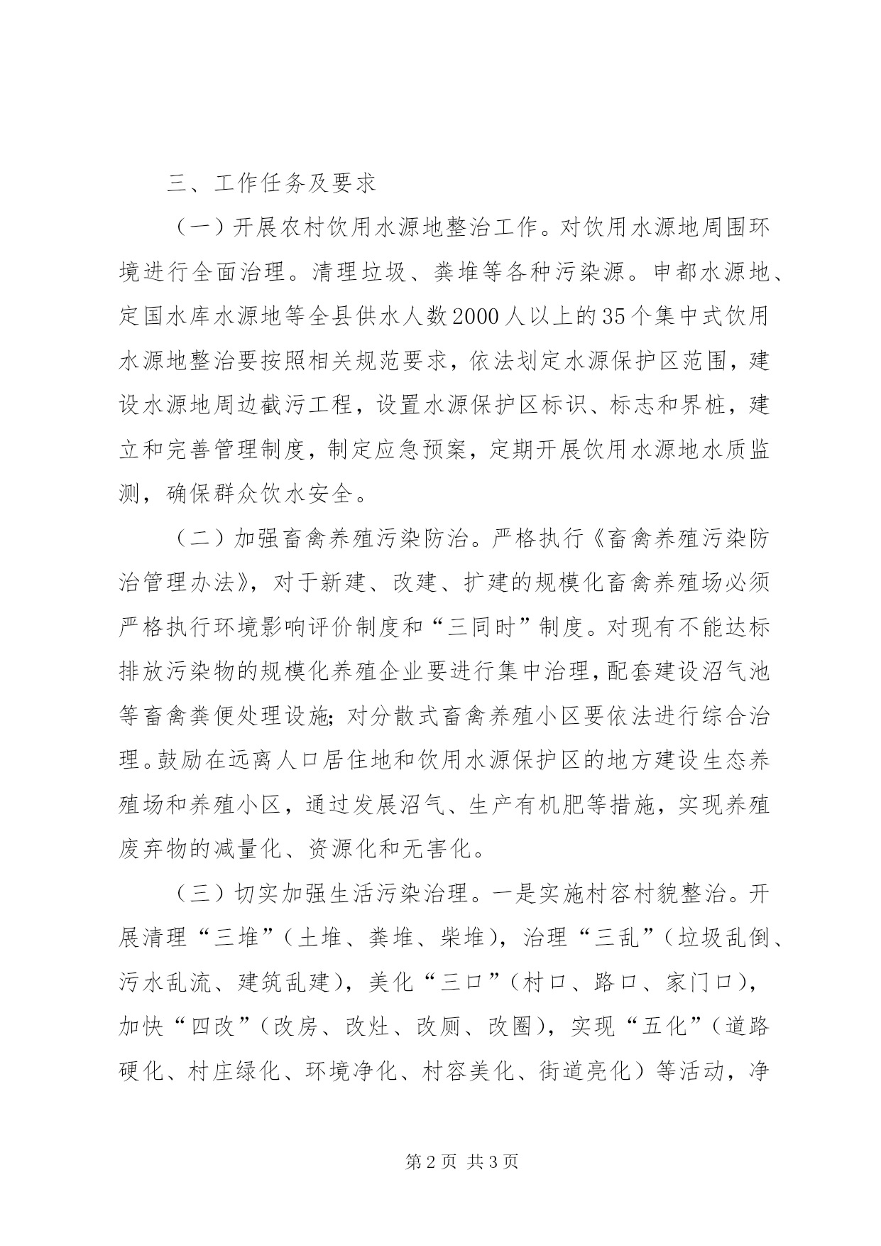第PAGE\*Arabic\*MERGEFORMAT3页共NUMPAGES\*MERGEFORMAT3页村委环保整顿工作方案为扎实推进社会主义新农村建设,改善农村人居环境,加快农村环境保护基础设施建设,促进农村环境与经济、社会协调发展,根据市、县工作部署及要求,特制定本实施方案:一、指导思想以科学发展观为指导,以改善农村环境质量为目标,按照清洁水源、清洁家园、清洁田园的总体要求,坚持城乡统筹、标本兼治的原则,全面推进环境友好的农村生产生活方式,发展农业循环经济,加强农村污染治理和生态环境保护,维护群众生命健康,提高农民生活质量,改变农村环保落后状况,稳步推进社会主义新农村建设,促进农村走上生产发展、生活富裕、生态良好的文明发展道路。二、总体目标通过开展农村环境综合整治,初步解决农村环境“脏、乱、差”问题,农村饮用水源地环境得到改善,工业企业污染和生活污染防治取得成效,规模化畜禽养殖污染得到基本控制,农业面源污染防治取得一定进展,生态示范创建活动全面展开,农村环境监管能力得到加强,公众环保意识进一步提高,村镇生活污水处理率、生活垃圾无害化处理率达到30%以上,规模化畜禽养殖场废弃物综合利用率和农作物秸秆综合利用率达到90%以上,农村环境质量明显好转。三、工作任务及要求(一)开展农村饮用水源地整治工作。对饮用水源地周围环境进行全面治理。清理垃圾、粪堆等各种污染源。申都水源地、定国水库水源地等全县供水人数2000人以上的35个集中式饮用水源地整治要按照相关规范要求,依法划定水源保护区范围,建设水源地周边截污工程,设置水源保护区标识、标志和界桩,建立和完善管理制度,制定应急预案,定期开展饮用水源地水质监测,确保群众饮水安全。(二)加强畜禽养殖污染防治。严格执行《畜禽养殖污染防治管理办法》,对于新建、改建、扩建的规模化畜禽养殖场必须严格执行环境影响评价制度和“三同时”制度。对现有不能达标排放污染物的规模化养殖企业要进行集中治理,配套建设沼气池等畜禽粪便处理设施;对分散式畜禽养殖小区要依法进行综合治理。鼓励在远离人口居住地和饮用水源保护区的地方建设生态养殖场和养殖小区,通过发展沼气、生产有机肥等措施,实现养殖废弃物的减量化、资源化和无害化。(三)切实加强生活污染治理。一是实施村容村貌整治。开展清理“三堆”(土堆、粪堆、柴堆),治理“三乱”(垃圾乱倒、污水乱流、建筑乱建),美化“三口”(村口、路口、家门口),加快“四改”(改房、改灶、改厕、改圈),实现“五化”(道路硬化、村庄绿化、环境净化、村容美化、街道亮化)等活动,净化村庄和农户环境。二是加强生活垃圾、生活污水处理。经济欠发达、交通不便利的村庄垃圾处理可采取堆肥或就近简易填埋,经济基础相对较好的村庄,要根据村庄规模和卫生要求配置一定的垃圾筒,设立垃圾仓,实行定点存放,统一收集,定时清运,资源化利用或集中处理。生活污水要采取净化沼气池建设与改厕、改厨、改圈相结合,逐步提高农村生活污水处理率。三是提高秸秆综合利用率。推行秸秆还田、秸秆养畜等综合利用工程,禁止露天焚烧秸秆。在夏、秋收季节开展专项检查,疏堵结合,防止因焚烧秸秆造成环境污染和生态破坏。