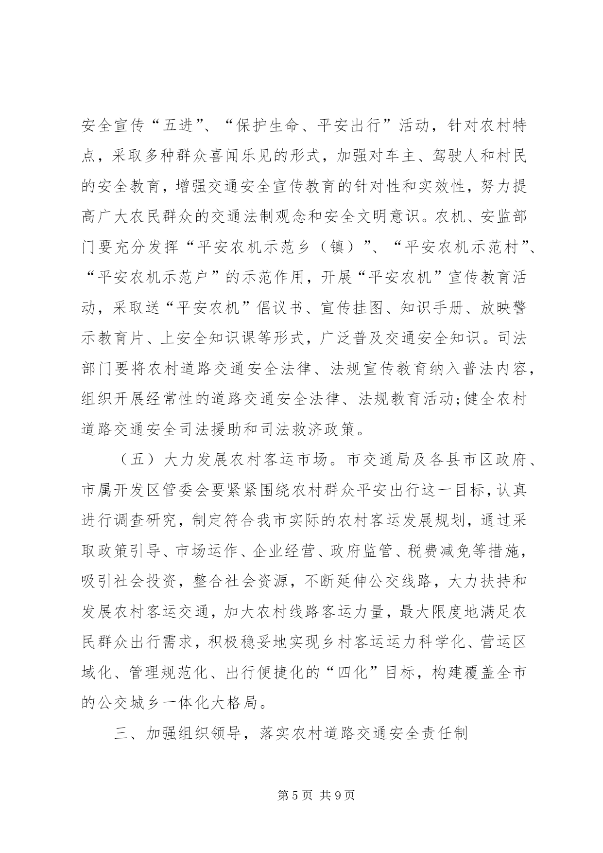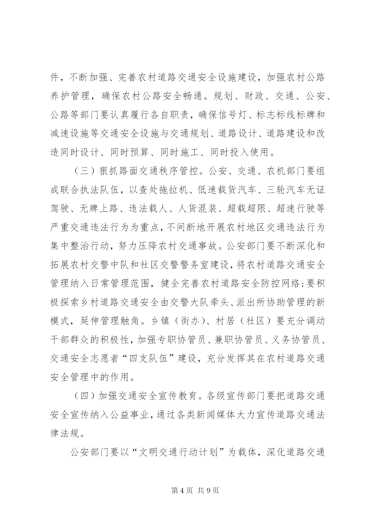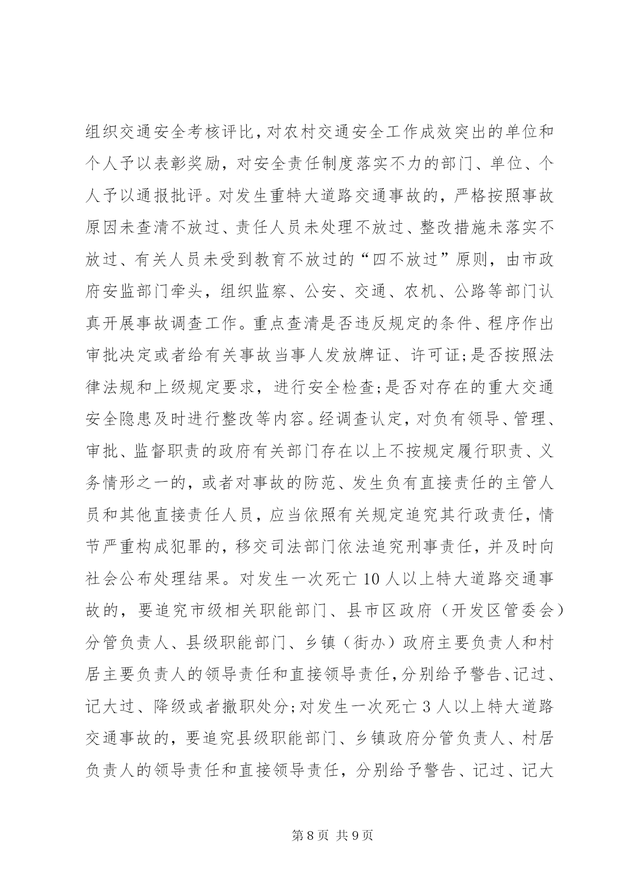 第PAGE\*Arabic\*MERGEFORMAT9页共NUMPAGES\*MERGEFORMAT9页市政办农村交通安全意见为全面贯彻落实《中华人民共和国道路交通安全法》及相关法律法规,根据国务院安委会办公室《关于进一步加强农村交通安全工作的通知》和国家安全生产监督管理局、公安部、交通运输部、农业部联合下发的《关于进一步加强治理拖拉机、低速载货汽车和三轮汽车违法载人工作的通知》要求,进一步强化农村道路交通安全工作,为社会主义新农村建设构建有序、安全、畅通、和谐的交通环境,现结合我市实际,就切实加强农村道路交通安全工作提出如下意见。一、充分认识当前农村道路交通安全工作面临的严峻形势,进一步增强责任感、使命感近年来,全市各级各部门认真贯彻落实国务院、省政府关于预防道路交通事故“五整顿、三加强”工作措施,大力整治路面行车秩序,加大事故隐患路段整改力度,广泛宣传交通安全法律法规,道路交通安全总体上保持平稳态势。但是,我市道路交通安全形势依然非常严峻,尤其是农村地区道路交通安全工作存在很多薄弱环节。一是“政府主导,部门监管,社会参与,齐抓共管,综合治理”的管理机制不够完善,农村交通安全宣传不够深入,农民交通安全意识比较淡薄,违法载人、无牌无证、报废车辆上路、人货混装、超速行驶、超载运输等严重交通违法行为普遍存在。二是随着经济社会的快速发展和一系列惠农政策的实施,拖拉机、低速载货汽车及三轮汽车等交通工具已普及农村家庭,目前全市共有拖拉机、低速载货汽车、三轮汽车约40余万辆,占机动车总数的20%以上,由于这些车辆安全性能、稳定性能差,存在较大交通安全隐患。三是农村“村村通”工程虽然使农村道路通行条件有了很大改善,但是道路交通安全设施建设不到位的问题依然普遍存在。四是农村公交客运不能满足广大农民日益增长的出行需求,很多县城、乡镇与村庄之间未开通短途客车,现有客运班车运行时间短、线路少,搭乘不便,致使农民外出经商、务工、接送学生等普遍乘坐拖拉机、低速载货汽车、三轮汽车,极易引发群死群伤的重特大恶性交通事故。据统计,近几年全市发生涉及拖拉机、低速载货汽车、三轮汽车造成的特大道路交通事故7起,死亡36人,分别占特大道路交通事故起数和死亡人数的50%和56.25%。道路交通安全事关人民群众生命财产安全,事关经济发展和社会稳定大局。做好道路交通安全工作是构建和谐平安的重要内容,是各级政府履行社会管理职能的基本要求。各级各部门要从维护人民群众生命财产安全、服务社会主义新农村建设、关注民生的高度,充分认识加强农村道路交通安全工作的极端重要性,切实增强紧迫感,把农村道路交通安全工作作为一项长期任务抓紧、抓好、抓出成效。二、落实各项措施,切实加强农村道路交通安全工作各级各部门要积极借鉴云南经验,强化源头管理,加大道路交通安全设施建设,狠抓路面交通秩序管控,加强交通安全宣传教育,大力发展农村客运市场,努力解决农村交通安全存在的问题,预防和减少农村道路交通事故,为农村群众出行创造安全畅通的环境。(一)强化源头管理。公安、交通、农机部门要对辖区拖拉机、低速载货汽车和三轮汽车等车辆的技术状况进行检验,对不符合安全运行条件的,严禁上路行驶。对达到报废标准的,坚决依法予以强制报废;认真做好驾驶人培训、考核,车辆登记和年度检验,驾驶证申领、换发、审验等工作;要对辖区内拖拉机、低速载货汽车和三轮汽车驾驶人培训机构进行一次全面排查和清理,取缔违规培训机构,杜绝违规办班现象。安监、公安、交通、公路部门要组织人员对全市农村道路进行一次集中摸排,对排查出的交通安全隐患制定相应的整改措施,及时予以整改。教育部门要加强对校车安全管理,与辖区学校签订交通安全责任状,坚决杜绝使用拖拉机、低速载货汽车、三轮汽车及报废车辆接送学生;严格学生集体出行手续的审批及车辆、驾驶人安全管理;公安部门要联合交通、公安、农机部门适时开展校车专项治理活动。(二)加大道路交通安全设施建设。交通、公路部门要按照《中华人民共和国公路法》及相关法律法规要求,抓住农村“村村通”工程实施的有利时机,大力改善农村道路交通安全通行条件,不断加强、完善农村道路交通安全设施建设,加强农村公路养护管理,确保农村公路安全畅通。规划、财政、交通、公安、公路等部门要认真履行各自职责,确保信号灯、标志标线标牌和减速设施等交通安全设施与交通规划、道路设计、道路建设和改造同时设计、同时预算、同时施工、同时投入使用。(三)狠抓路面交通秩序管控。公安、交通、农机部门要组成联合执法队伍,以查处拖拉机、低速载货汽车、三轮汽车无证驾驶、无牌上路、违法载人、人货混装、超载超限、超速行驶等严重交通违法行为为重点,不间断地开展农村地区交通违法行为集中整治行动,努力压降农村交通事故。公安部门要不断深化和拓展农村交警中队和社区交警警务室