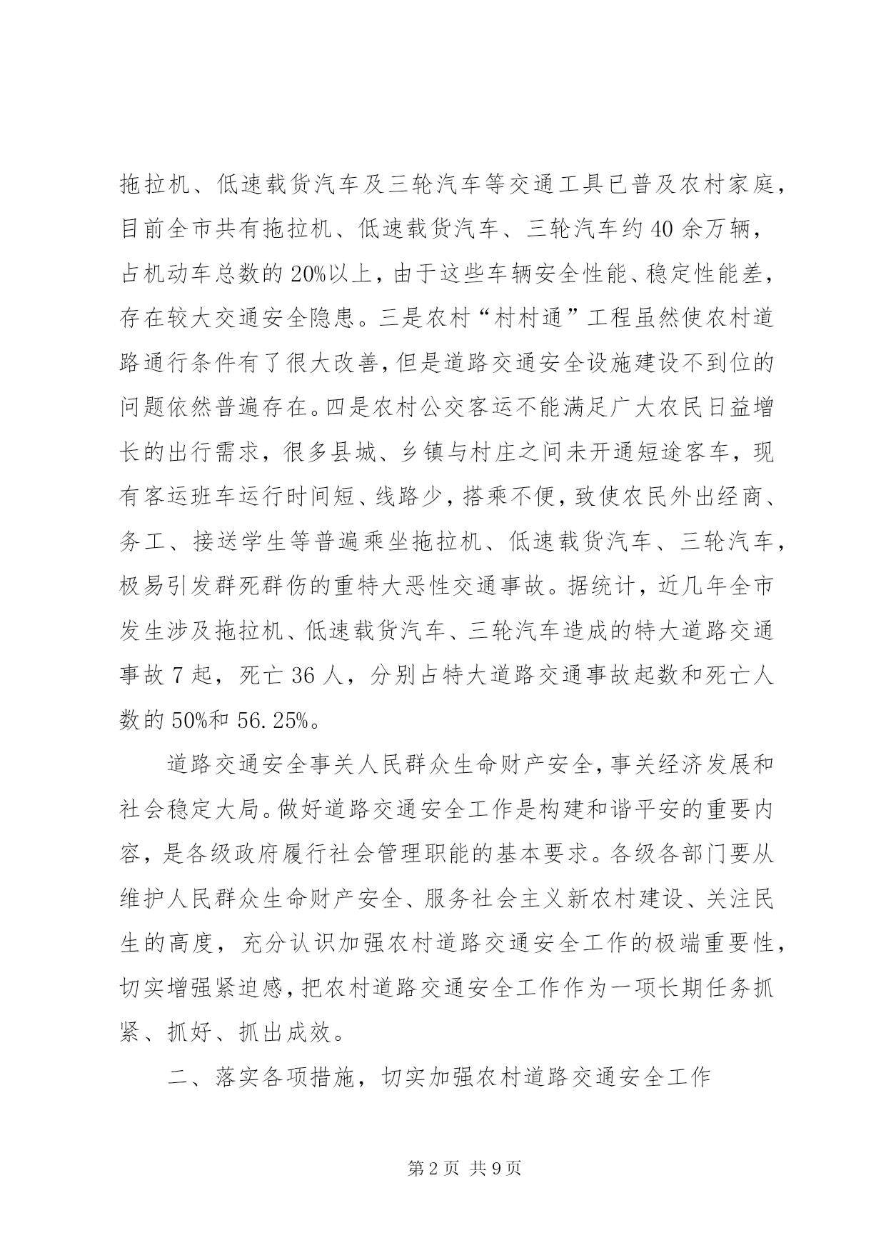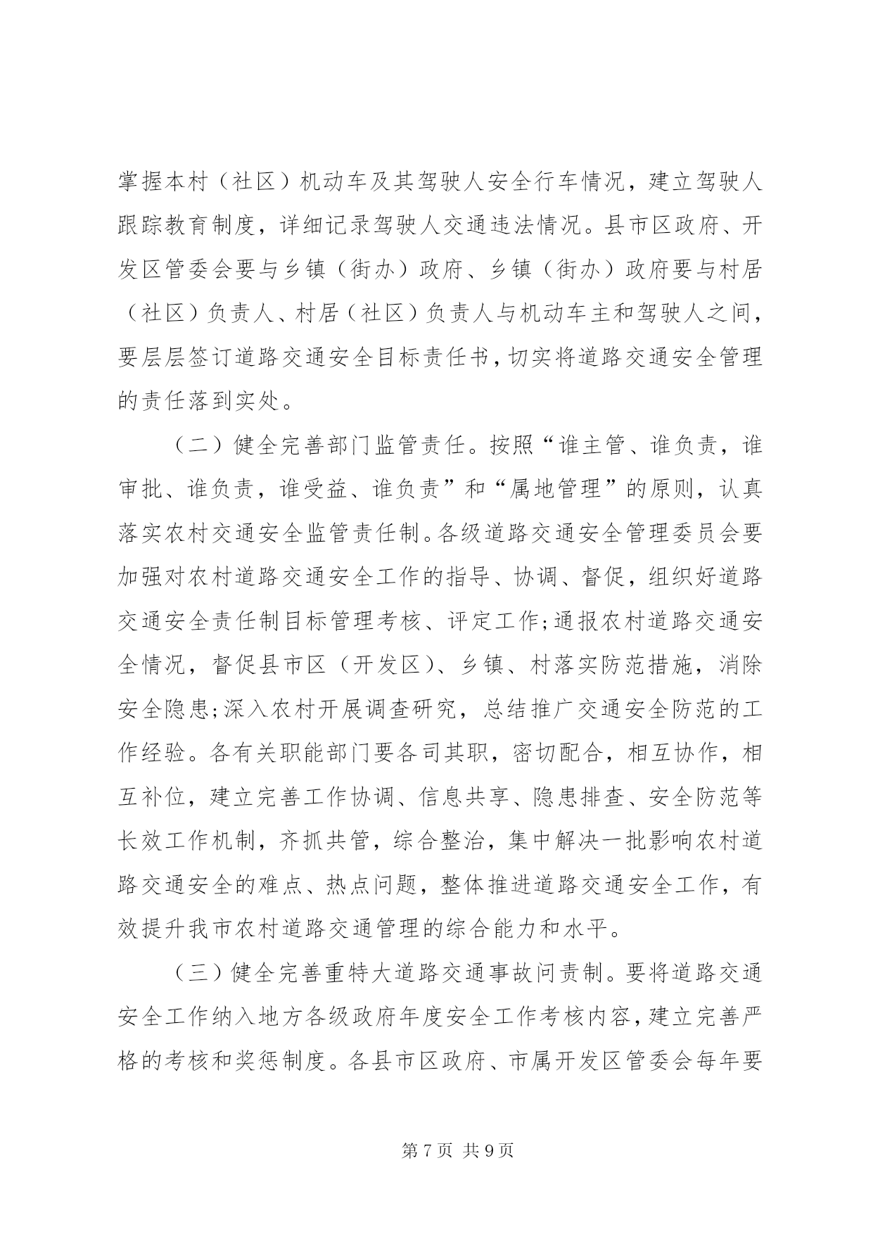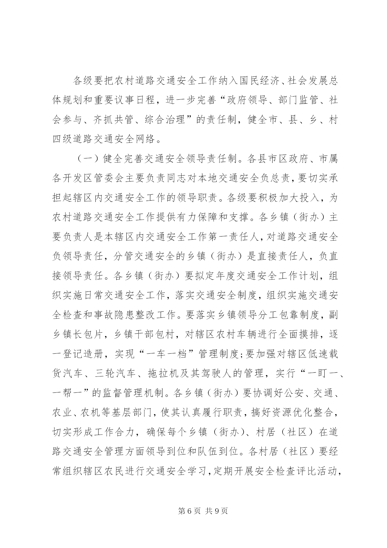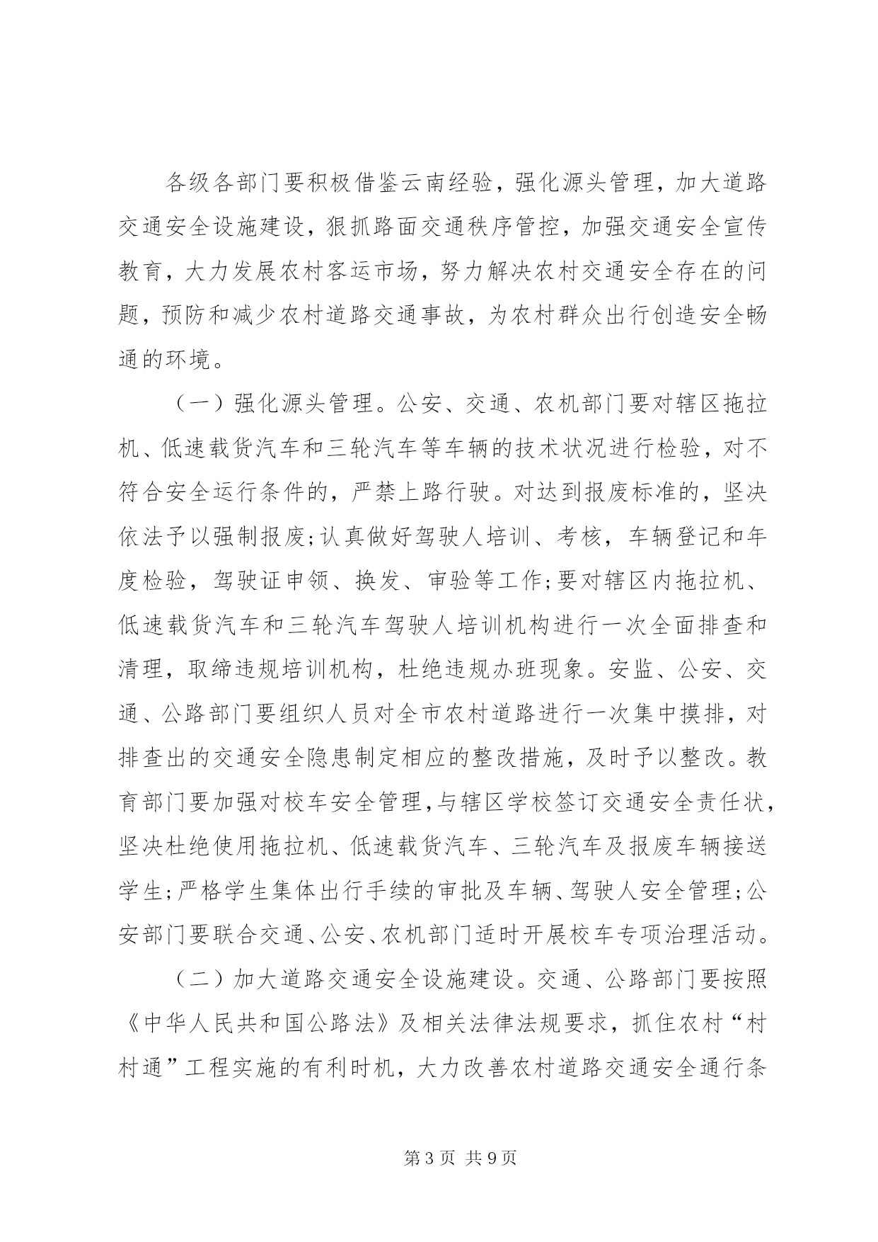 第PAGE\*Arabic\*MERGEFORMAT9页共NUMPAGES\*MERGEFORMAT9页市政办农村交通安全意见为全面贯彻落实《中华人民共和国道路交通安全法》及相关法律法规,根据国务院安委会办公室《关于进一步加强农村交通安全工作的通知》和国家安全生产监督管理局、公安部、交通运输部、农业部联合下发的《关于进一步加强治理拖拉机、低速载货汽车和三轮汽车违法载人工作的通知》要求,进一步强化农村道路交通安全工作,为社会主义新农村建设构建有序、安全、畅通、和谐的交通环境,现结合我市实际,就切实加强农村道路交通安全工作提出如下意见。一、充分认识当前农村道路交通安全工作面临的严峻形势,进一步增强责任感、使命感近年来,全市各级各部门认真贯彻落实国务院、省政府关于预防道路交通事故“五整顿、三加强”工作措施,大力整治路面行车秩序,加大事故隐患路段整改力度,广泛宣传交通安全法律法规,道路交通安全总体上保持平稳态势。但是,我市道路交通安全形势依然非常严峻,尤其是农村地区道路交通安全工作存在很多薄弱环节。一是“政府主导,部门监管,社会参与,齐抓共管,综合治理”的管理机制不够完善,农村交通安全宣传不够深入,农民交通安全意识比较淡薄,违法载人、无牌无证、报废车辆上路、人货混装、超速行驶、超载运输等严重交通违法行为普遍存在。二是随着经济社会的快速发展和一系列惠农政策的实施,拖拉机、低速载货汽车及三轮汽车等交通工具已普及农村家庭,目前全市共有拖拉机、低速载货汽车、三轮汽车约40余万辆,占机动车总数的20%以上,由于这些车辆安全性能、稳定性能差,存在较大交通安全隐患。三是农村“村村通”工程虽然使农村道路通行条件有了很大改善,但是道路交通安全设施建设不到位的问题依然普遍存在。四是农村公交客运不能满足广大农民日益增长的出行需求,很多县城、乡镇与村庄之间未开通短途客车,现有客运班车运行时间短、线路少,搭乘不便,致使农民外出经商、务工、接送学生等普遍乘坐拖拉机、低速载货汽车、三轮汽车,极易引发群死群伤的重特大恶性交通事故。据统计,近几年全市发生涉及拖拉机、低速载货汽车、三轮汽车造成的特大道路交通事故7起,死亡36人,分别占特大道路交通事故起数和死亡人数的50%和56.25%。道路交通安全事关人民群众生命财产安全,事关经济发展和社会稳定大局。做好道路交通安全工作是构建和谐平安的重要内容,是各级政府履行社会管理职能的基本要求。各级各部门要从维护人民群众生命财产安全、服务社会主义新农村建设、关注民生的高度,充分认识加强农村道路交通安全工作的极端重要性,切实增强紧迫感,把农村道路交通安全工作作为一项长期任务抓紧、抓好、抓出成效。二、落实各项措施,切实加强农村道路交通安全工作各级各部门要积极借鉴云南经验,强化源头管理,加大道路交通安全设施建设,狠抓路面交通秩序管控,加强交通安全宣传教育,大力发展农村客运市场,努力解决农村交通安全存在的问题,预防和减少农村道路交通事故,为农村群众出行创造安全畅通的环境。(一)强化源头管理。公安、交通、农机部门要对辖区拖拉机、低速载货汽车和三轮汽车等车辆的技术状况进行检验,对不符合安全运行条件的,严禁上路行驶。对达到报废标准的,坚决依法予以强制报废;认真做好驾驶人培训、考核,车辆登记和年度检验,驾驶证申领、换发、审验等工作;要对辖区内拖拉机、低速载货汽车和三轮汽车驾驶人培训机构进行一次全面排查和清理,取缔违规培训机构,杜绝违规办班现象。安监、公安、交通、公路部门要组织人员对全市农村道路进行一次集中摸排,对排查出的交通安全隐患制定相应的整改措施,及时予以整改。教育部门要加强对校车安全管理,与辖区学校签订交通安全责任状,坚决杜绝使用拖拉机、低速载货汽车、三轮汽车及报废车辆接送学生;严格学生集体出行手续的审批及车辆、驾驶人安全管理;公安部门要联合交通、公安、农机部门适时开展校车专项治理活动。(二)加大道路交通安全设施建设。交通、公路部门要按照《中华人民共和国公路法》及相关法律法规要求,抓住农村“村村通”工程实施的有利时机,大力改善农村道路交通安全通行条件,不断加强、完善农村道路交通安全设施建设,加强农村公路养护管理,确保农村公路安全畅通。规划、财政、交通、公安、公路等部门要认真履行各自职责,确保信号灯、标志标线标牌和减速设施等交通安全设施与交通规划、道路设计、道路建设和改造同时设计、同时预算、同时施工、同时投入使用。(三)狠抓路面交通秩序管控。公安、交通、农机部门要组成联合执法队伍,以查处拖拉机、低速载货汽车、三轮汽车无证驾驶、无牌上路、违法载人、人货混装、超载超限、超速行驶等严重交通违法行为为重点,不间断地开展农村地区交通违法行为集中整治行动,努力压降农村交通事故。公安部门要不断深化和拓展农村交警中队和社区交警警务室