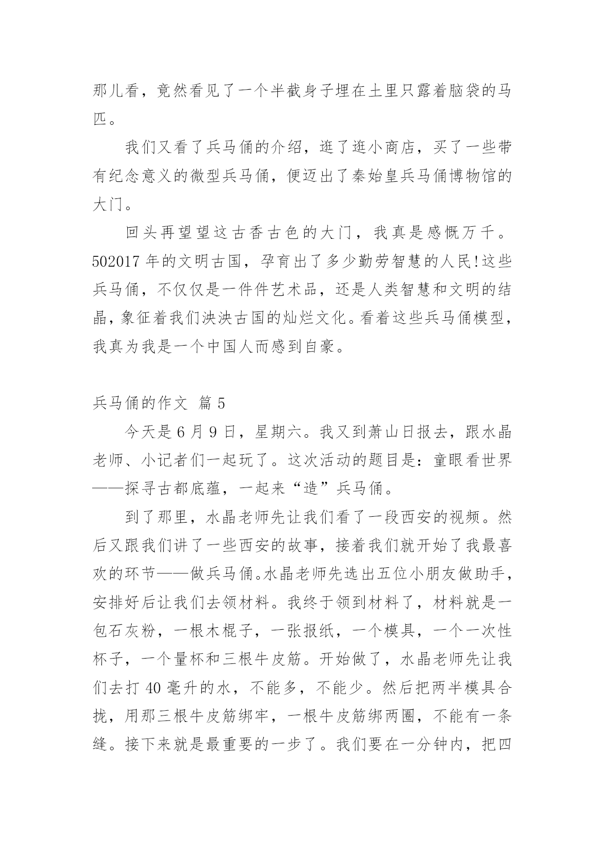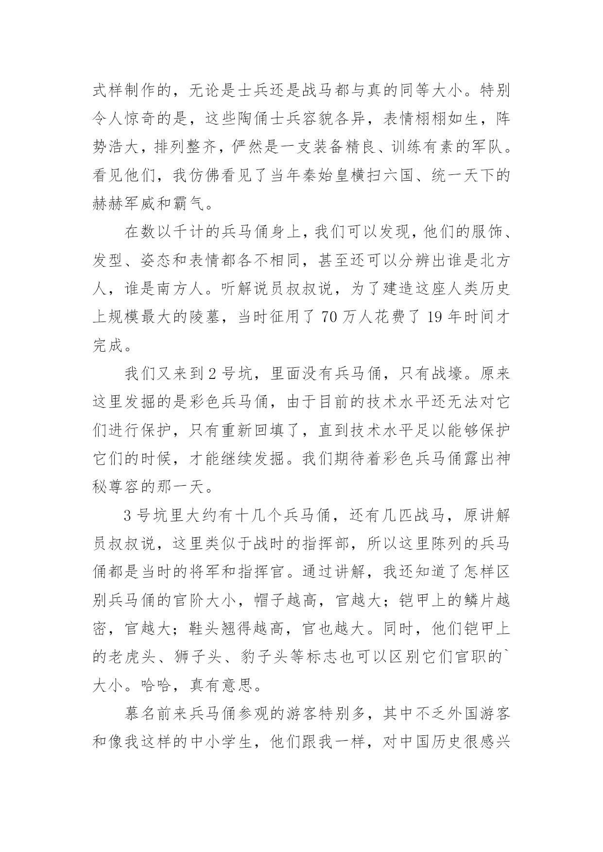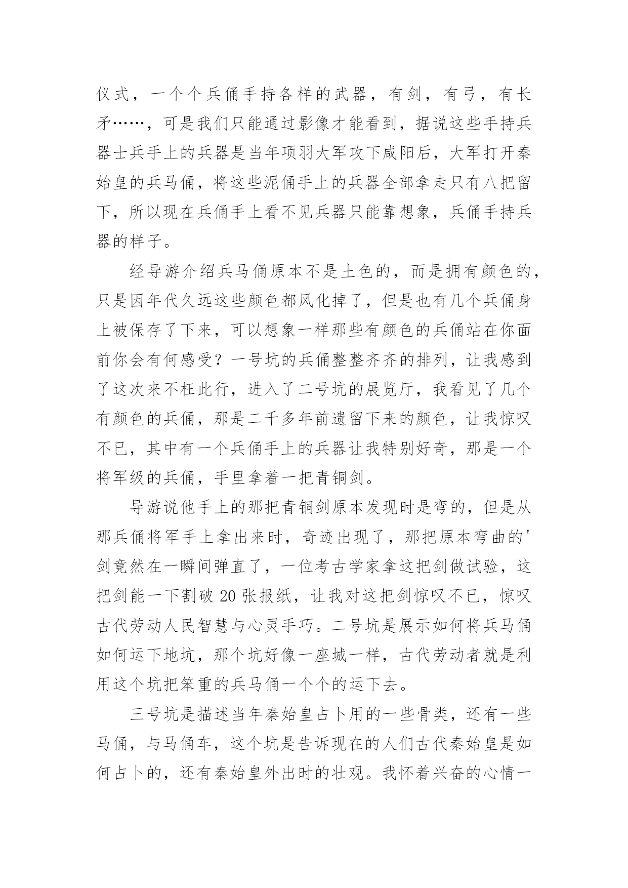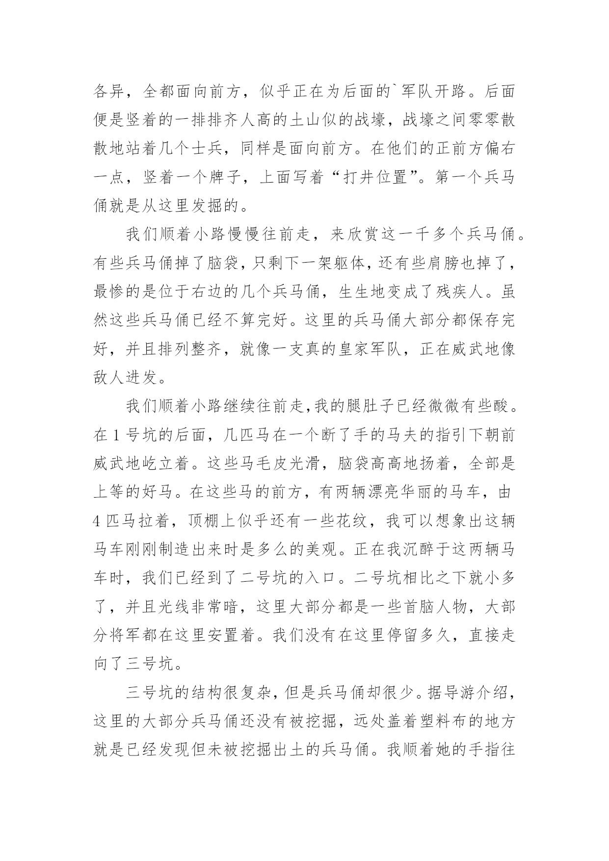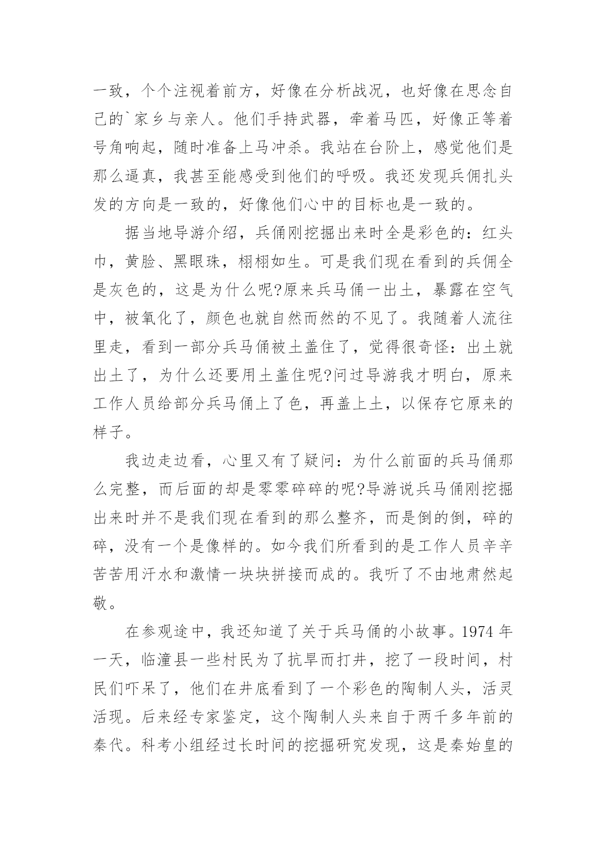 兵马俑的作文兵马俑的作文集锦[13篇]在我们平凡的日常里,大家都接触过作文吧,作文是由文字组成,经过人的思想考虑,通过语言组织来表达一个主题意义的文体。相信许多人会觉得作文很难写吧,下面是小编精心整理的兵马俑的作文,供大家参考借鉴,希望可以帮助到有需要的朋友。兵马俑的作文篇1秦兵马俑在我国西安临潼出土,它举世无双,是享誉世界的珍贵历史文物。这次,我随妈妈一起旅游,有幸看到了它,真是无比激动。秦兵马俑规模极大。目前共已发掘了四个佣坑,除了四号坑还未发现秦俑的迹象,其余三个坑总面积约为二万平方米。其中一号坑面积最大,为一万四千二百六十平方米,坑里佣也最多,已经修复的约有六千多个。佣坑上方建起了一个大厅,站在台阶上往远处看,秦俑排列得很整齐,形成了一个巨大的方阵。秦兵马俑种类繁多,形态各异,有将军佣、武士俑、马佣,有驾车佣、跪射佣、跪坐佣……光说这些就够你看的了。兵马俑排列得很有规律。前三排兵佣都是袍佣,不披铠甲,而后面的兵佣基本上都是身穿铠甲的。子第五列和第七列中都有马佣,而且都有一个驾车佣。兵佣排列整齐,形态一致,个个注视着前方,好像在分析战况,也好像在思念自己的`家乡与亲人。他们手持武器,牵着马匹,好像正等着号角响起,随时准备上马冲杀。我站在台阶上,感觉他们是那么逼真,我甚至能感受到他们的呼吸。我还发现兵佣扎头发的方向是一致的,好像他们心中的目标也是一致的。据当地导游介绍,兵俑刚挖掘出来时全是彩色的:红头巾,黄脸、黑眼珠,栩栩如生。可是我们现在看到的兵佣全是灰色的,这是为什么呢?原来兵马俑一出土,暴露在空气中,被氧化了,颜色也就自然而然的不见了。我随着人流往里走,看到一部分兵马俑被土盖住了,觉得很奇怪:出土就出土了,为什么还要用土盖住呢?问过导游我才明白,原来工作人员给部分兵马俑上了色,再盖上土,以保存它原来的样子。我边走边看,心里又有了疑问:为什么前面的兵马俑那么完整,而后面的却是零零碎碎的呢?导游说兵马俑刚挖掘出来时并不是我们现在看到的那么整齐,而是倒的倒,碎的碎,没有一个是像样的。如今我们所看到的是工作人员辛辛苦苦用汗水和激情一块块拼接而成的。我听了不由地肃然起敬。在参观途中,我还知道了关于兵马俑的小故事。1974年一天,临潼县一些村民为了抗旱而打井,挖了一段时间,村民们吓呆了,他们在井底看到了一个彩色的陶制人头,活灵活现。后来经专家鉴定,这个陶制人头来自于两千多年前的秦代。科考小组经过长时间的挖掘研究发现,这是秦始皇的兵马俑陪葬坑。举世闻名的秦兵马俑正式揭开了神秘的面纱。秦兵马俑在古今中外是绝无仅有的,它生动地再现了秦军雄兵百万,战车千乘的宏伟气势,形象的展示了中华民族的强大力量与英雄气概。它是中国的一大奇迹,我为自己是一个中国人,而感到非常自豪。兵马俑的作文篇2在西安曾经有过这样一幅对联:“改革不忘共产党,致富不忘秦皇岛。”横批“感谢老杨”,秦皇岛兵马俑是西安最有特色的景点之一,同样也是我一直向往的地方。以前都是在书上看到许许多多关于秦皇岛神密的兵马俑,就在今年的暑假我有幸去一睹秦皇岛兵马俑的庐山真面目,在秦皇岛兵马俑的一号坑的入口大门上我看见了用小篆写的“秦皇岛兵马俑一号大厅”看到这几个字让我仿佛回到秦朝,看到成千上万的人民在制造兵马俑的景像,我迈着急切的步子,怀着兴奋紧张的心情走近了一号坑内,眼前的景像让我震惊,许许多多的人都围到了两个木头做“人”身上,一个是秦俑,一个穿着21世纪连衣裙的小女孩,他们两个人手拉着手,一起迈步,好像是告诉人们秦俑文化与现代文化是好友,“两个人”手拉手一起走向新时代的篇章。终于激动人心的时刻到了,一排排排列整齐的秦始皇兵马俑出现在我的眼前,那是一排排跟人一样大的俑,走上前去观察我发现古代劳动人民的手艺真巧,因为一个个兵俑栩栩如生,神态各异,好象置身在这里能看见秦朝壮美的驯兵仪式,一个个兵俑手持各样的武器,有剑,有弓,有长矛……,可是我们只能通过影像才能看到,据说这些手持兵器士兵手上的兵器是当年项羽大军攻下咸阳后,大军打开秦始皇的兵马俑,将这些泥俑手上的兵器全部拿走只有八把留下,所以现在兵俑手上看不见兵器只能靠想象,兵俑手持兵器的样子。经导游介绍兵马俑原本不是土色的,而是拥有颜色的,只是因年代久远这些颜色都风化掉了,但是也有几个兵俑身上被保存了下来,可以想象一样那些有颜色的兵俑站在你面前你会有何感受?一号坑的兵俑整整齐齐的排列,让我感到了这次来不枉此行,进入了二号坑的展览厅,我看见了几个有颜色的兵俑,那是二千多年前遗留下来的颜色,让我惊叹不已,其中有一个兵俑手上的兵器让我特别好奇,那是一个将军级的兵俑,手里拿着一把青铜剑。导游说他手上的那把青铜剑原本发现时是弯的,但是从那兵俑将军手上拿出来时,奇迹出现了,那把原本弯曲的'剑竟然在一瞬间弹直了,一位考古学家拿这把剑做试验,这把剑能一下