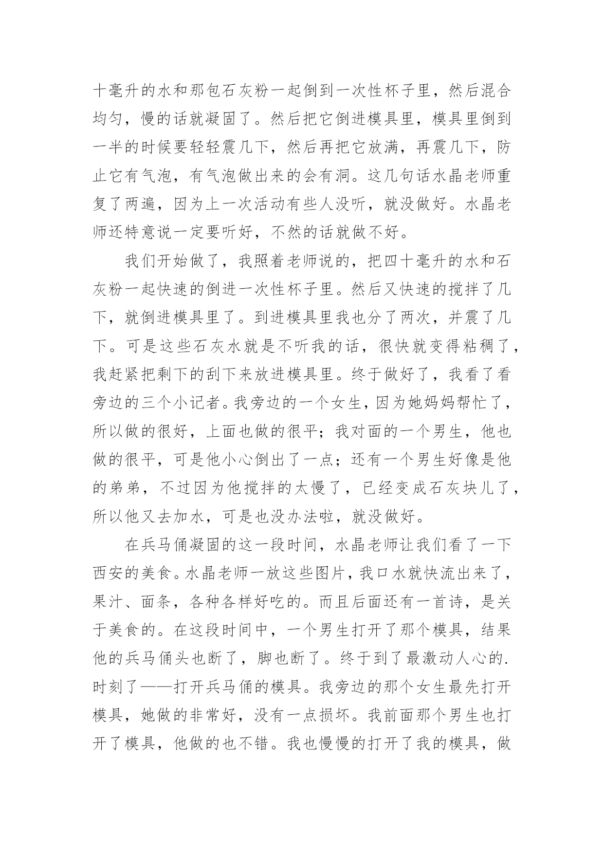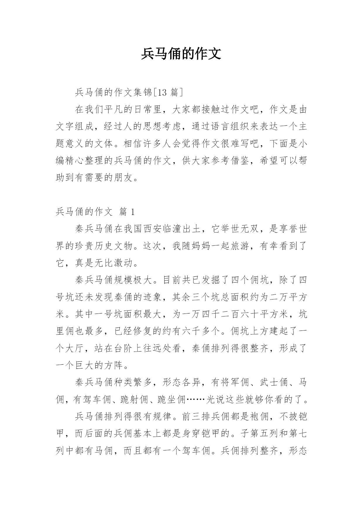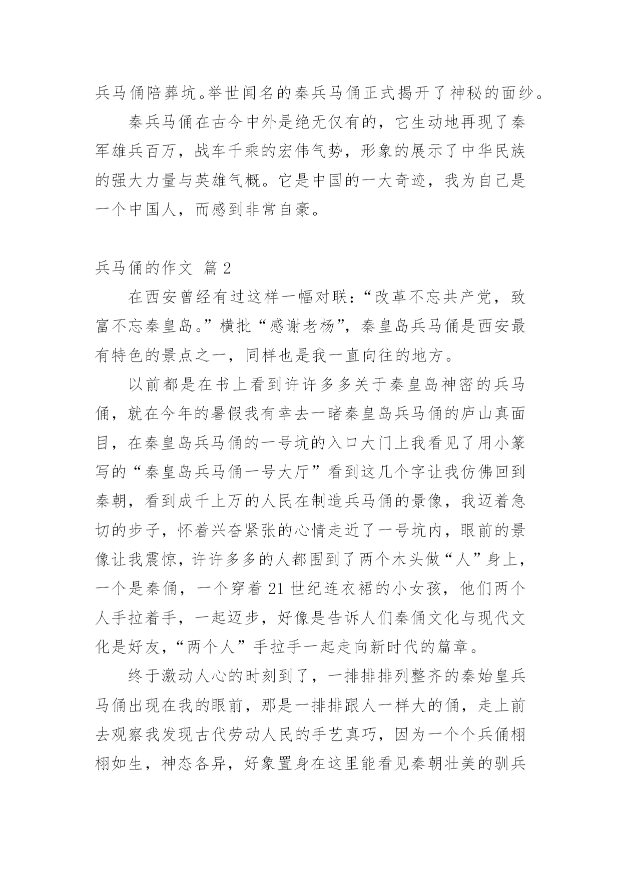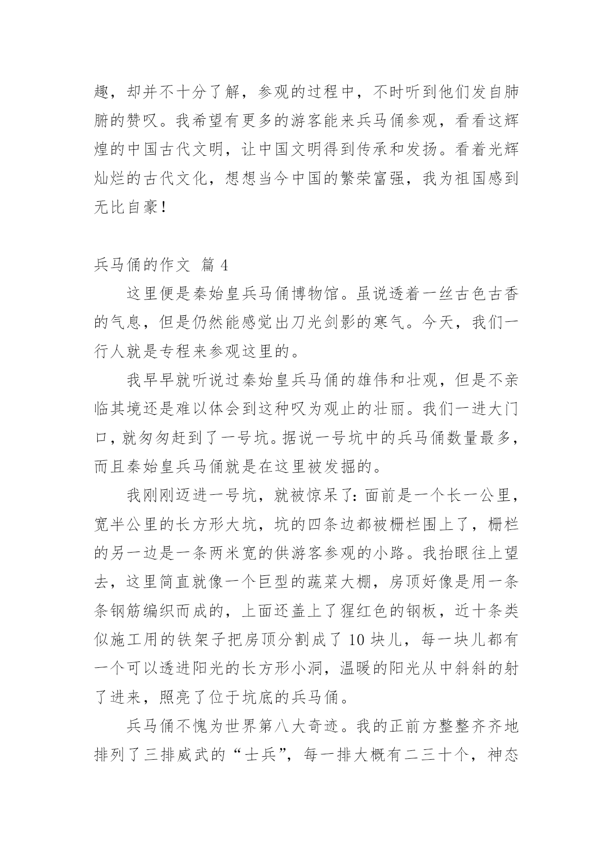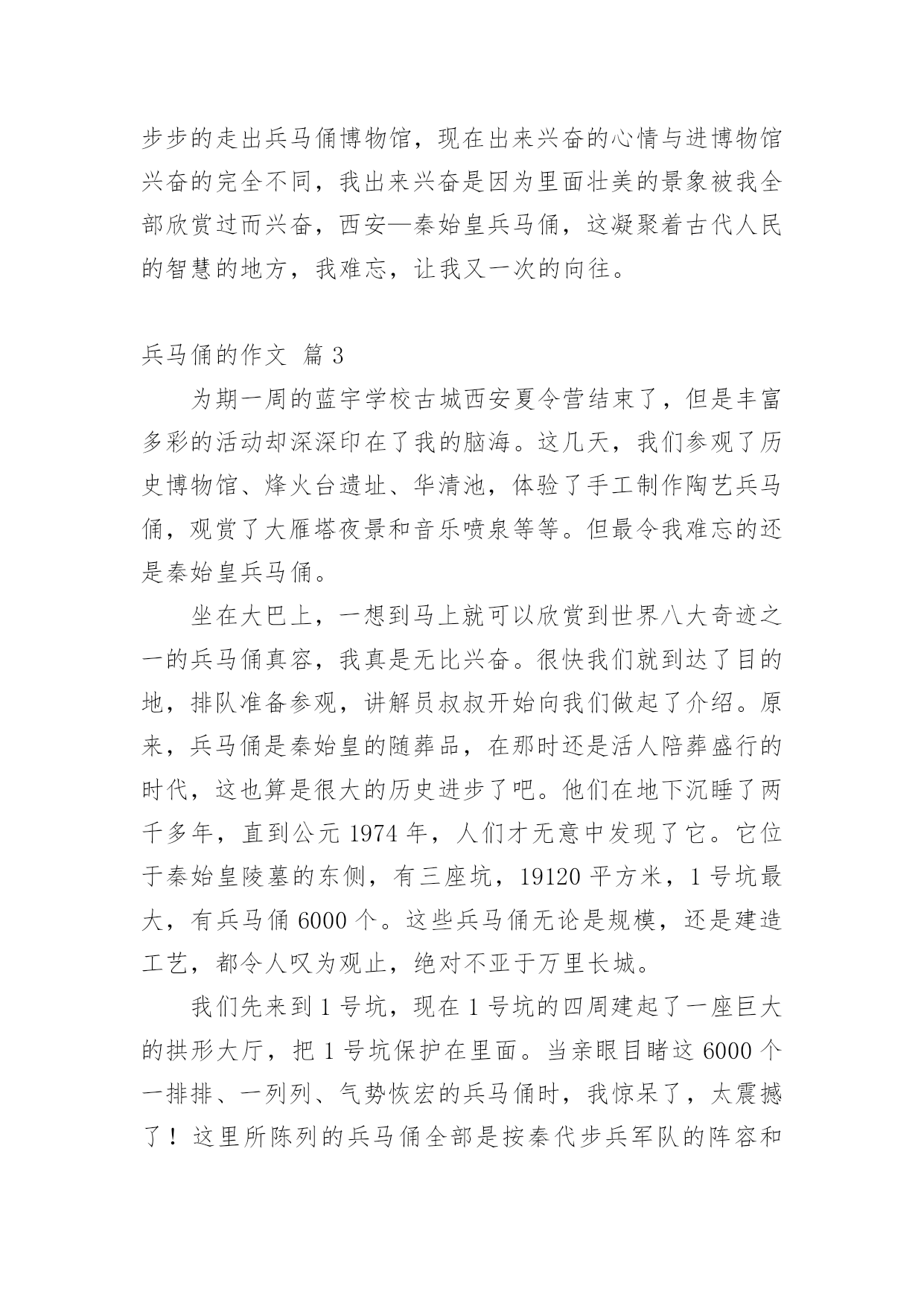 兵马俑的作文兵马俑的作文集锦[13篇]在我们平凡的日常里,大家都接触过作文吧,作文是由文字组成,经过人的思想考虑,通过语言组织来表达一个主题意义的文体。相信许多人会觉得作文很难写吧,下面是小编精心整理的兵马俑的作文,供大家参考借鉴,希望可以帮助到有需要的朋友。兵马俑的作文篇1秦兵马俑在我国西安临潼出土,它举世无双,是享誉世界的珍贵历史文物。这次,我随妈妈一起旅游,有幸看到了它,真是无比激动。秦兵马俑规模极大。目前共已发掘了四个佣坑,除了四号坑还未发现秦俑的迹象,其余三个坑总面积约为二万平方米。其中一号坑面积最大,为一万四千二百六十平方米,坑里佣也最多,已经修复的约有六千多个。佣坑上方建起了一个大厅,站在台阶上往远处看,秦俑排列得很整齐,形成了一个巨大的方阵。秦兵马俑种类繁多,形态各异,有将军佣、武士俑、马佣,有驾车佣、跪射佣、跪坐佣……光说这些就够你看的了。兵马俑排列得很有规律。前三排兵佣都是袍佣,不披铠甲,而后面的兵佣基本上都是身穿铠甲的。子第五列和第七列中都有马佣,而且都有一个驾车佣。兵佣排列整齐,形态一致,个个注视着前方,好像在分析战况,也好像在思念自己的`家乡与亲人。他们手持武器,牵着马匹,好像正等着号角响起,随时准备上马冲杀。我站在台阶上,感觉他们是那么逼真,我甚至能感受到他们的呼吸。我还发现兵佣扎头发的方向是一致的,好像他们心中的目标也是一致的。据当地导游介绍,兵俑刚挖掘出来时全是彩色的:红头巾,黄脸、黑眼珠,栩栩如生。可是我们现在看到的兵佣全是灰色的,这是为什么呢?原来兵马俑一出土,暴露在空气中,被氧化了,颜色也就自然而然的不见了。我随着人流往里走,看到一部分兵马俑被土盖住了,觉得很奇怪:出土就出土了,为什么还要用土盖住呢?问过导游我才明白,原来工作人员给部分兵马俑上了色,再盖上土,以保存它原来的样子。我边走边看,心里又有了疑问:为什么前面的兵马俑那么完整,而后面的却是零零碎碎的呢?导游说兵马俑刚挖掘出来时并不是我们现在看到的那么整齐,而是倒的倒,碎的碎,没有一个是像样的。如今我们所看到的是工作人员辛辛苦苦用汗水和激情一块块拼接而成的。我听了不由地肃然起敬。在参观途中,我还知道了关于兵马俑的小故事。1974年一天,临潼县一些村民为了抗旱而打井,挖了一段时间,村民们吓呆了,他们在井底看到了一个彩色的陶制人头,活灵活现。后来经专家鉴定,这个陶制人头来自于两千多年前的秦代。科考小组经过长时间的挖掘研究发现,这是秦始皇的兵马俑陪葬坑。举世闻名的秦兵马俑正式揭开了神秘的面纱。秦兵马俑在古今中外是绝无仅有的,它生动地再现了秦军雄兵百万,战车千乘的宏伟气势,形象的展示了中华民族的强大力量与英雄气概。它是中国的一大奇迹,我为自己是一个中国人,而感到非常自豪。兵马俑的作文篇2在西安曾经有过这样一幅对联:“改革不忘共产党,致富不忘秦皇岛。”横批“感谢老杨”,秦皇岛兵马俑是西安最有特色的景点之一,同样也是我一直向往的地方。以前都是在书上看到许许多多关于秦皇岛神密的兵马俑,就在今年的暑假我有幸去一睹秦皇岛兵马俑的庐山真面目,在秦皇岛兵马俑的一号坑的入口大门上我看见了用小篆写的“秦皇岛兵马俑一号大厅”看到这几个字让我仿佛回到秦朝,看到成千上万的人民在制造兵马俑的景像,我迈着急切的步子,怀着兴奋紧张的心情走近了一号坑内,眼前的景像让我震惊,许许多多的人都围到了两个木头做“人”身上,一个是秦俑,一个穿着21世纪连衣裙的小女孩,他们两个人手拉着手,一起迈步,好像是告诉人们秦俑文化与现代文化是好友,“两个人”手拉手一起走向新时代的篇章。终于激动人心的时刻到了,一排排排列整齐的秦始皇兵马俑出现在我的眼前,那是一排排跟人一样大的俑,走上前去观察我发现古代劳动人民的手艺真巧,因为一个个兵俑栩栩如生,神态各异,好象置身在这里能看见秦朝壮美的驯兵仪式,一个个兵俑手持各样的武器,有剑,有弓,有长矛……,可是我们只能通过影像才能看到,据说这些手持兵器士兵手上的兵器是当年项羽大军攻下咸阳后,大军打开秦始皇的兵马俑,将这些泥俑手上的兵器全部拿走只有八把留下,所以现在兵俑手上看不见兵器只能靠想象,兵俑手持兵器的样子。经导游介绍兵马俑原本不是土色的,而是拥有颜色的,只是因年代久远这些颜色都风化掉了,但是也有几个兵俑身上被保存了下来,可以想象一样那些有颜色的兵俑站在你面前你会有何感受?一号坑的兵俑整整齐齐的排列,让我感到了这次来不枉此行,进入了二号坑的展览厅,我看见了几个有颜色的兵俑,那是二千多年前遗留下来的颜色,让我惊叹不已,其中有一个兵俑手上的兵器让我特别好奇,那是一个将军级的兵俑,手里拿着一把青铜剑。导游说他手上的那把青铜剑原本发现时是弯的,但是从那兵俑将军手上拿出来时,奇迹出现了,那把原本弯曲的'剑竟然在一瞬间弹直了,一位考古学家拿这把剑做试验,这把剑能一下