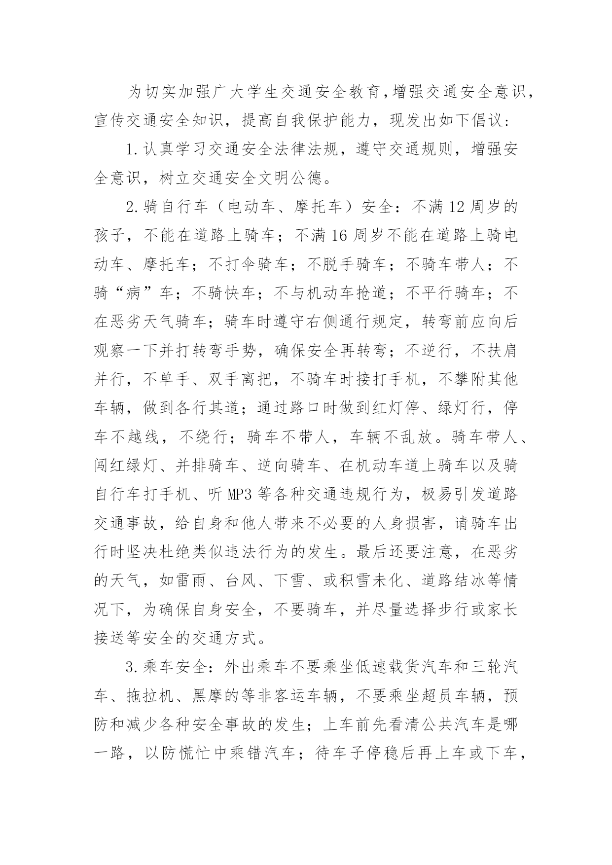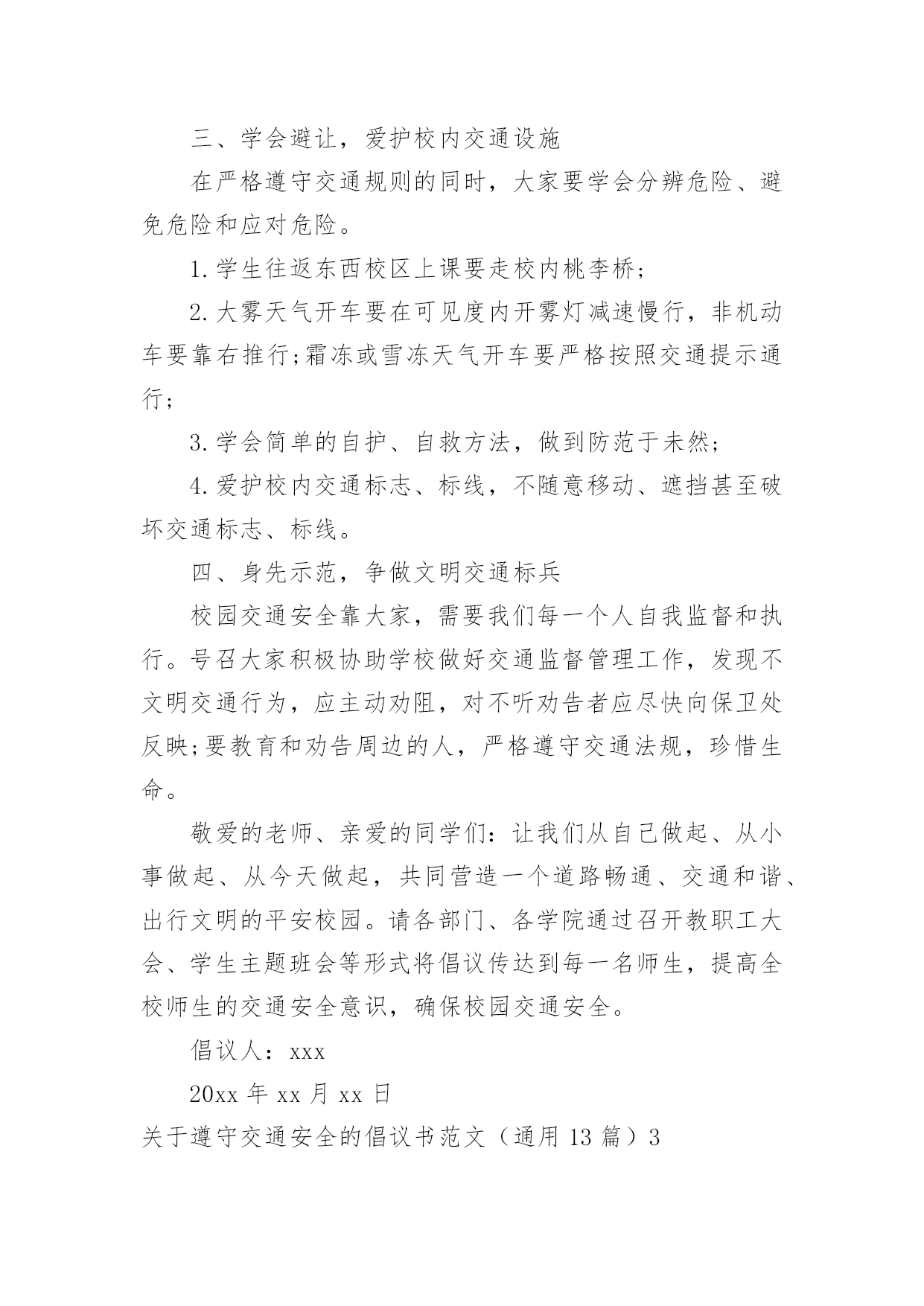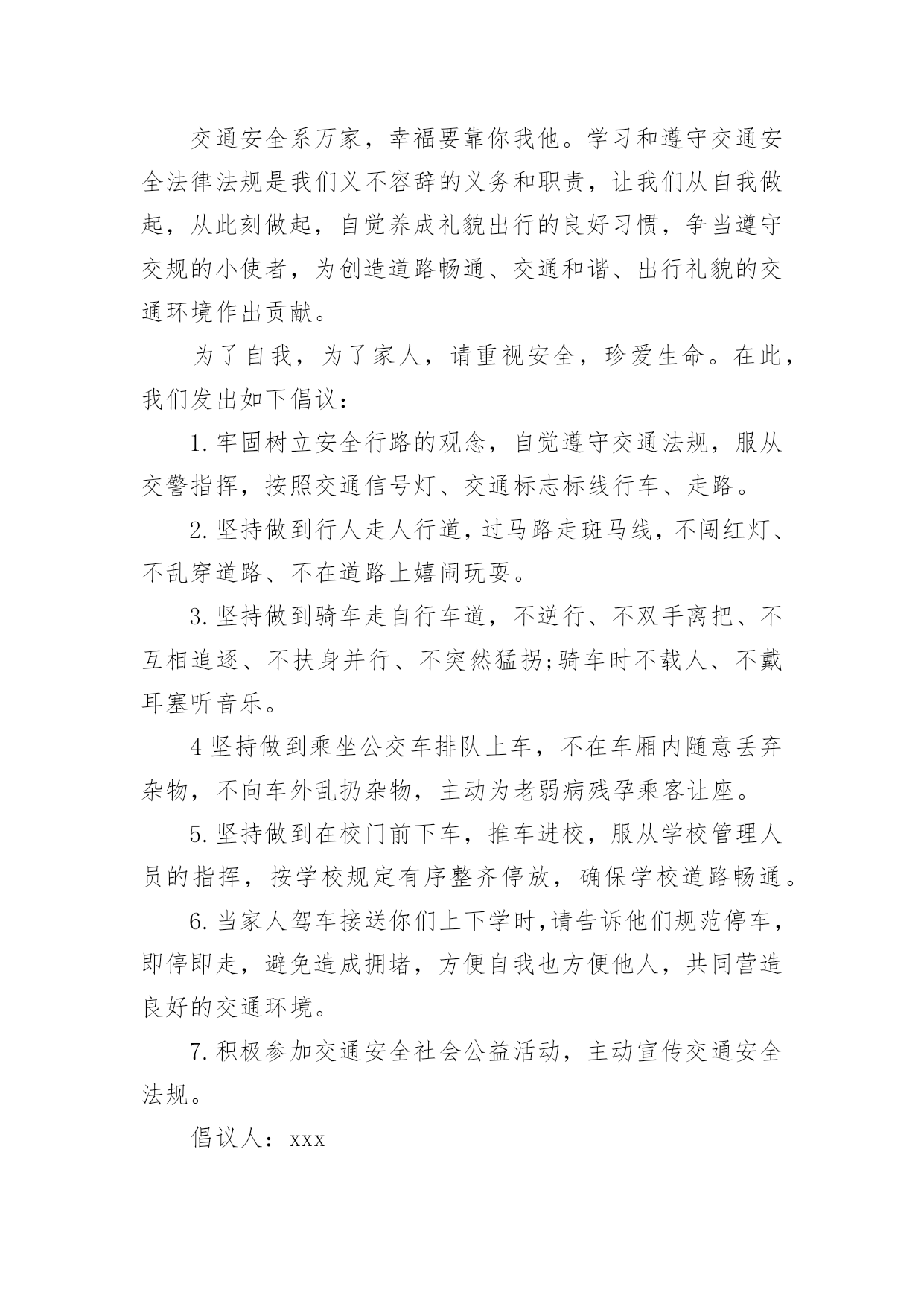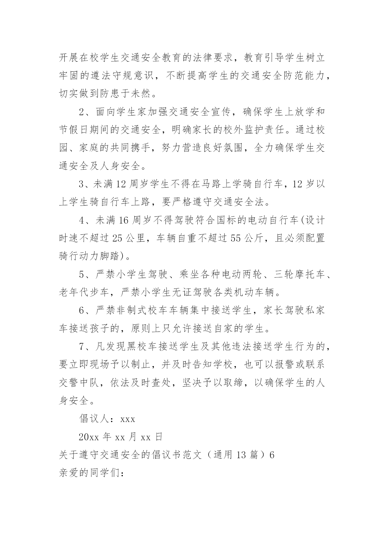 遵守交通安全的倡议书关于遵守交通安全的倡议书范文(通用13篇)随着社会一步步向前发展,倡议书与我们的生活息息相关,倡议书是日常应用写作中的一种常用文体。大家知道倡议书的格式吗?以下是小编为大家收集的关于遵守交通安全的倡议书范文(通用13篇),供大家参考借鉴,希望可以帮助到有需要的朋友。关于遵守交通安全的倡议书范文(通用13篇)1我们生活在一个交通便利的社会,每天来往于学校、家庭和其他场所之间,在那行人车辆拥挤的街道上,你是否看到了潜藏在我们每日行走的交通路线上的危险呢?因为不遵守交通法规,我们看到了血的事实,经受了血的教训,那一幕幕令人心痛、惨不忍睹的画面,那一个个因抢救无效而离我们远去的人们,最后留给我们的都是心灵上的创伤和对离去者无尽的痛惜。我们在痛惜他们的同时,更应该清醒地认识到:遵守交通法规,就是珍爱生命!有人曾说,动荡年代最可怕的是战争,而和平年代最可怕的是车祸。这决不是危言耸听,因为全球每年死于交通事故的人相当于一次中型战争的阵亡人数。俗话说得好:“没有规矩不成方圆。”因此,凡是在马路上进行与交通有关的活动的人都不能随心所欲,都必须严守规矩,即交通法规。它是保证我们社会井然有序,健康迅速发展的坚强后盾。因为我们遵守交通法规,我们的社会便向着文明的彼岸又迈进了一步,遵守交通法规是我们每个人的义务,更是我们的责任。让我们所有同学都携起手来呵护好这文明之花,让我们远离伤痛,珍爱彼此的生命吧!为此,发出以下倡议:全校同学应做到交通安全从我做起,树立校园文明新风。1.过马路时,应严格遵守交通规则,走人行横道或人行天桥,切勿闯红灯;2.12周岁以下的同学请不要骑自行车到校。3.同学们应克服麻痹和侥幸心理,时刻牢记交通法规,确保自己与他人的交通安全,行安全路,做文明人。4.同学们应该提醒你身边的朋友或家人,请他们也时刻遵守交通规则,做一个良好的市民。我们坚信,只要携起手来,共同努力,就能营造出一个安全、文明、畅通的社会环境。倡议人:xxx20xx年xx月xx日关于遵守交通安全的倡议书范文(通用13篇)2安全平稳的校园环境是全校师生快乐工作、学习和生活的基础。目前,随着学校的快速发展,校内人员和机动车辆与日俱增,交通事故隐患逐年增加。为进一步提高师生交通安全意识,规范校内交通行为,现发出校园交通安全倡议如下:一、提高认识,强化交通安全观念交通安全心系你我他,请大家认真学习《中华人民共和国道路交通安全法》等交通安全法规,本着对学校、对家人和对他人负责的态度,增强交通法制观念。二、遵章行路,严格遵守交通法规1.机动车校内行驶时,做到“三要”和“七不”:要遵守交通规则,要减速慢行,要避让行人;车速不得超过15公里/小时,不鸣喇叭,不随意驶入教学区域,不与学生争抢道路,不在学生跑操时行驶,不得酒后校内驾车,不得急转弯。2.非机动车校内行驶时,做到“四要”和“十不”:进出校门要下车推行,要靠右行驶,转弯时要放慢车速,通过坡度较大路面时应减速慢行或下车推行;骑车时不载人、不戴耳塞听音乐、不双手离把、不打手机、不吃零食、不搭肩并行、不互相追逐,不逆向行驶,不在机动车临近时突然拐弯,不与机动车抢道;3.任何机动车或非机动车停放,做到“两要”和“三不”:要在指定区域停放,要有序停放,不占道停放、不随意停放,不在绿化带上停放;4.行人应在人行道上行走,如无人行道,则靠路边右侧行走;在桃李桥上行走时,要在桥两边的人行道上行走;与他人结伴行走时,不在马路上追逐打闹、嬉戏,不三五成群并肩行走或聚集停留,不逆向行走;过路口时要“一慢、二看、三通过”。三、学会避让,爱护校内交通设施在严格遵守交通规则的同时,大家要学会分辨危险、避免危险和应对危险。1.学生往返东西校区上课要走校内桃李桥;2.大雾天气开车要在可见度内开雾灯减速慢行,非机动车要靠右推行;霜冻或雪冻天气开车要严格按照交通提示通行;3.学会简单的自护、自救方法,做到防范于未然;4.爱护校内交通标志、标线,不随意移动、遮挡甚至破坏交通标志、标线。四、身先示范,争做文明交通标兵校园交通安全靠大家,需要我们每一个人自我监督和执行。号召大家积极协助学校做好交通监督管理工作,发现不文明交通行为,应主动劝阻,对不听劝告者应尽快向保卫处反映;要教育和劝告周边的人,严格遵守交通法规,珍惜生命。敬爱的老师、亲爱的同学们:让我们从自己做起、从小事做起、从今天做起,共同营造一个道路畅通、交通和谐、出行文明的平安校园。请各部门、各学院通过召开教职工大会、学生主题班会等形式将倡议传达到每一名师生,提高全校师生的交通安全意识,确保校园交通安全。倡议人:xxx20xx年xx月xx日关于遵守交通安全的倡议书范文(通用13篇)3为切实加强广大学生交通安全教育,增强交通安全意识,宣传交通安全知识,提高自我保护能力,现发出如下倡议:1.