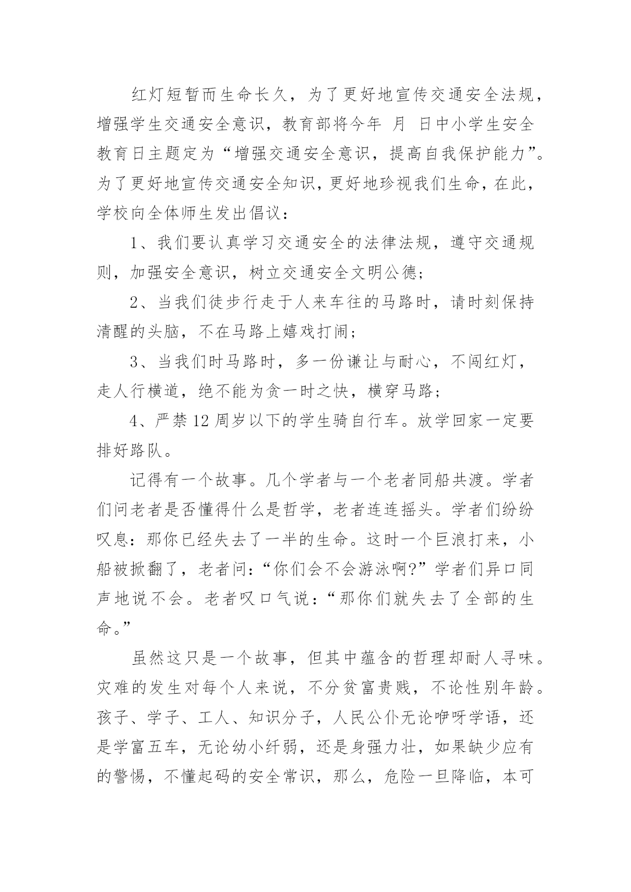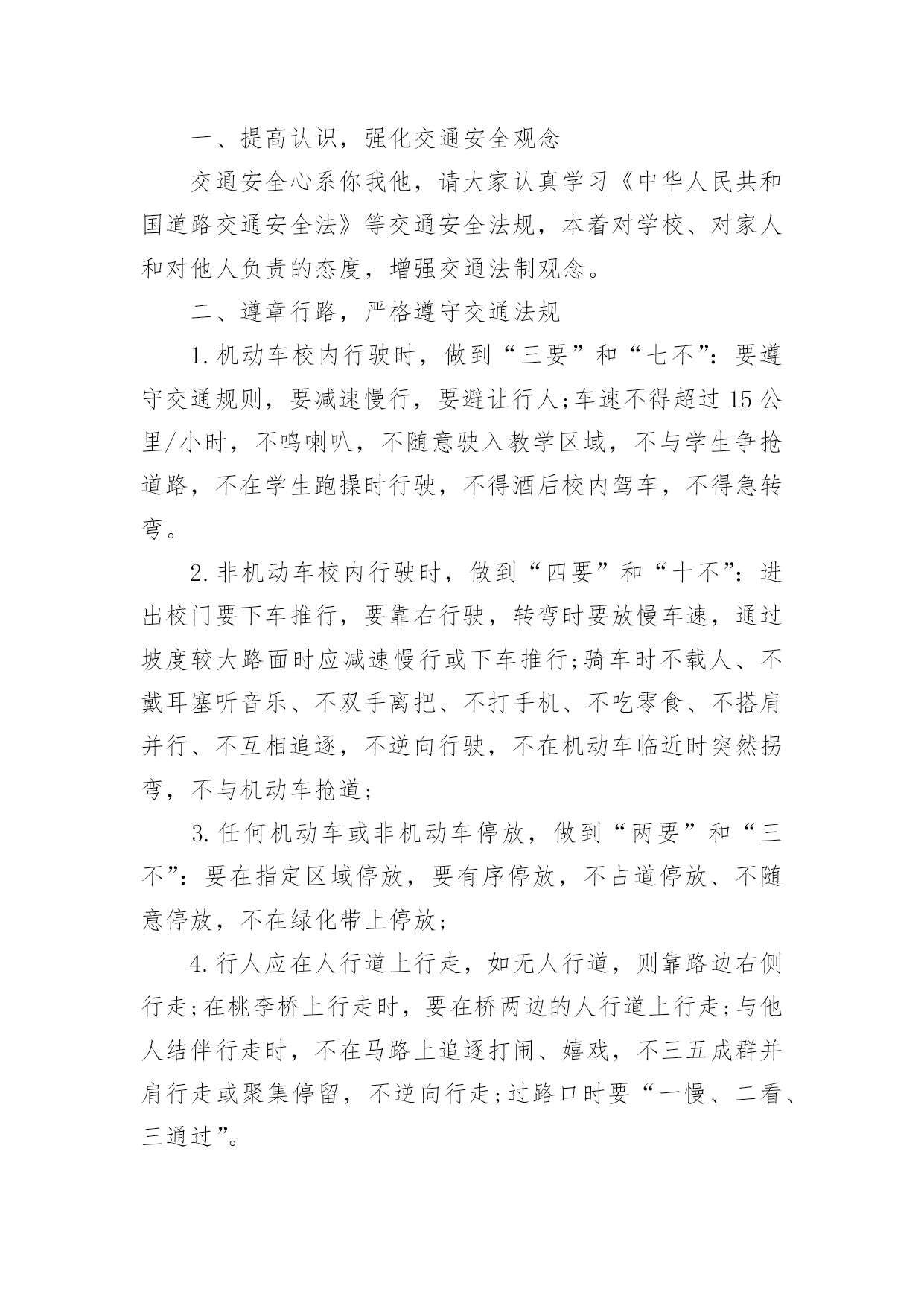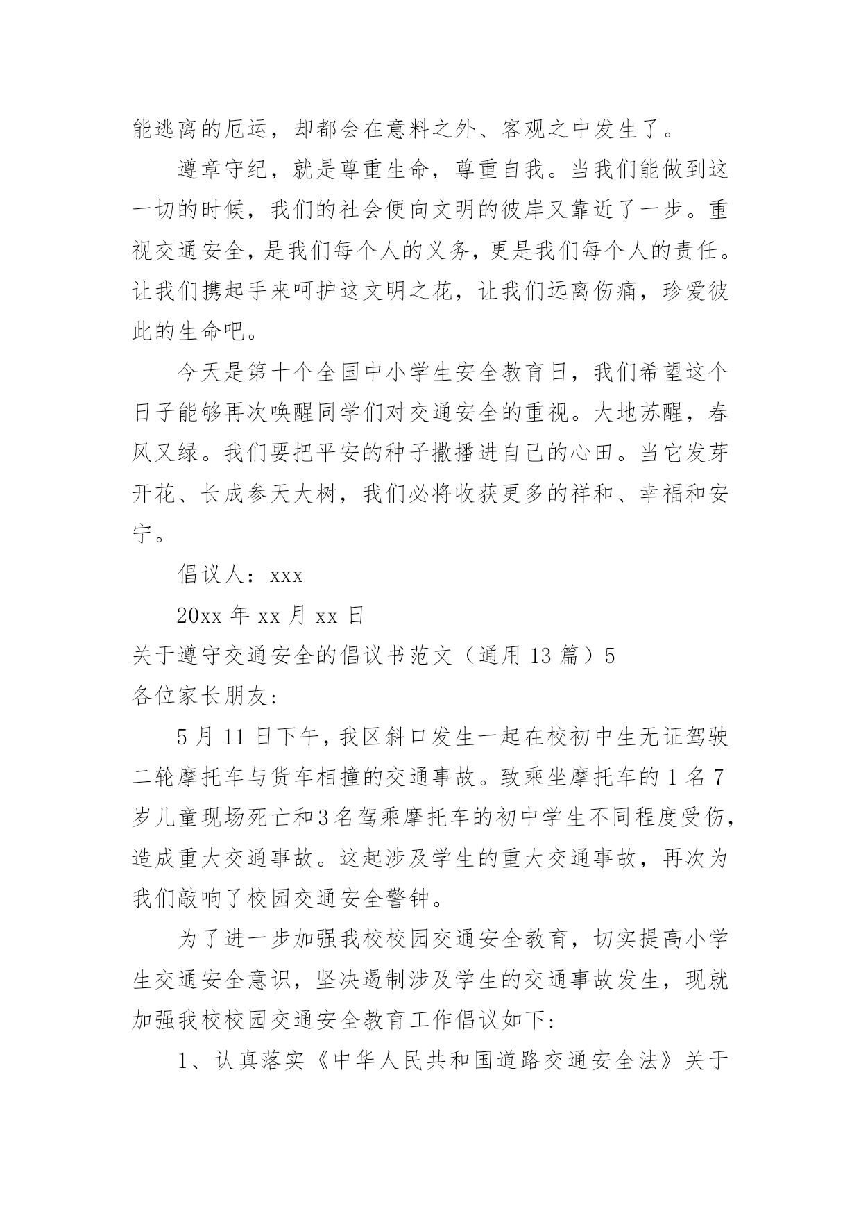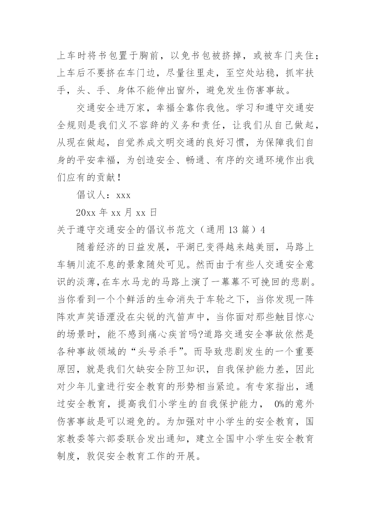 遵守交通安全的倡议书关于遵守交通安全的倡议书范文(通用13篇)随着社会一步步向前发展,倡议书与我们的生活息息相关,倡议书是日常应用写作中的一种常用文体。大家知道倡议书的格式吗?以下是小编为大家收集的关于遵守交通安全的倡议书范文(通用13篇),供大家参考借鉴,希望可以帮助到有需要的朋友。关于遵守交通安全的倡议书范文(通用13篇)1我们生活在一个交通便利的社会,每天来往于学校、家庭和其他场所之间,在那行人车辆拥挤的街道上,你是否看到了潜藏在我们每日行走的交通路线上的危险呢?因为不遵守交通法规,我们看到了血的事实,经受了血的教训,那一幕幕令人心痛、惨不忍睹的画面,那一个个因抢救无效而离我们远去的人们,最后留给我们的都是心灵上的创伤和对离去者无尽的痛惜。我们在痛惜他们的同时,更应该清醒地认识到:遵守交通法规,就是珍爱生命!有人曾说,动荡年代最可怕的是战争,而和平年代最可怕的是车祸。这决不是危言耸听,因为全球每年死于交通事故的人相当于一次中型战争的阵亡人数。俗话说得好:“没有规矩不成方圆。”因此,凡是在马路上进行与交通有关的活动的人都不能随心所欲,都必须严守规矩,即交通法规。它是保证我们社会井然有序,健康迅速发展的坚强后盾。因为我们遵守交通法规,我们的社会便向着文明的彼岸又迈进了一步,遵守交通法规是我们每个人的义务,更是我们的责任。让我们所有同学都携起手来呵护好这文明之花,让我们远离伤痛,珍爱彼此的生命吧!为此,发出以下倡议:全校同学应做到交通安全从我做起,树立校园文明新风。1.过马路时,应严格遵守交通规则,走人行横道或人行天桥,切勿闯红灯;2.12周岁以下的同学请不要骑自行车到校。3.同学们应克服麻痹和侥幸心理,时刻牢记交通法规,确保自己与他人的交通安全,行安全路,做文明人。4.同学们应该提醒你身边的朋友或家人,请他们也时刻遵守交通规则,做一个良好的市民。我们坚信,只要携起手来,共同努力,就能营造出一个安全、文明、畅通的社会环境。倡议人:xxx20xx年xx月xx日关于遵守交通安全的倡议书范文(通用13篇)2安全平稳的校园环境是全校师生快乐工作、学习和生活的基础。目前,随着学校的快速发展,校内人员和机动车辆与日俱增,交通事故隐患逐年增加。为进一步提高师生交通安全意识,规范校内交通行为,现发出校园交通安全倡议如下:一、提高认识,强化交通安全观念交通安全心系你我他,请大家认真学习《中华人民共和国道路交通安全法》等交通安全法规,本着对学校、对家人和对他人负责的态度,增强交通法制观念。二、遵章行路,严格遵守交通法规1.机动车校内行驶时,做到“三要”和“七不”:要遵守交通规则,要减速慢行,要避让行人;车速不得超过15公里/小时,不鸣喇叭,不随意驶入教学区域,不与学生争抢道路,不在学生跑操时行驶,不得酒后校内驾车,不得急转弯。2.非机动车校内行驶时,做到“四要”和“十不”:进出校门要下车推行,要靠右行驶,转弯时要放慢车速,通过坡度较大路面时应减速慢行或下车推行;骑车时不载人、不戴耳塞听音乐、不双手离把、不打手机、不吃零食、不搭肩并行、不互相追逐,不逆向行驶,不在机动车临近时突然拐弯,不与机动车抢道;3.任何机动车或非机动车停放,做到“两要”和“三不”:要在指定区域停放,要有序停放,不占道停放、不随意停放,不在绿化带上停放;4.行人应在人行道上行走,如无人行道,则靠路边右侧行走;在桃李桥上行走时,要在桥两边的人行道上行走;与他人结伴行走时,不在马路上追逐打闹、嬉戏,不三五成群并肩行走或聚集停留,不逆向行走;过路口时要“一慢、二看、三通过”。三、学会避让,爱护校内交通设施在严格遵守交通规则的同时,大家要学会分辨危险、避免危险和应对危险。1.学生往返东西校区上课要走校内桃李桥;2.大雾天气开车要在可见度内开雾灯减速慢行,非机动车要靠右推行;霜冻或雪冻天气开车要严格按照交通提示通行;3.学会简单的自护、自救方法,做到防范于未然;4.爱护校内交通标志、标线,不随意移动、遮挡甚至破坏交通标志、标线。四、身先示范,争做文明交通标兵校园交通安全靠大家,需要我们每一个人自我监督和执行。号召大家积极协助学校做好交通监督管理工作,发现不文明交通行为,应主动劝阻,对不听劝告者应尽快向保卫处反映;要教育和劝告周边的人,严格遵守交通法规,珍惜生命。敬爱的老师、亲爱的同学们:让我们从自己做起、从小事做起、从今天做起,共同营造一个道路畅通、交通和谐、出行文明的平安校园。请各部门、各学院通过召开教职工大会、学生主题班会等形式将倡议传达到每一名师生,提高全校师生的交通安全意识,确保校园交通安全。倡议人:xxx20xx年xx月xx日关于遵守交通安全的倡议书范文(通用13篇)3为切实加强广大学生交通安全教育,增强交通安全意识,宣传交通安全知识,提高自我保护能力,现发出如下倡议:1.
