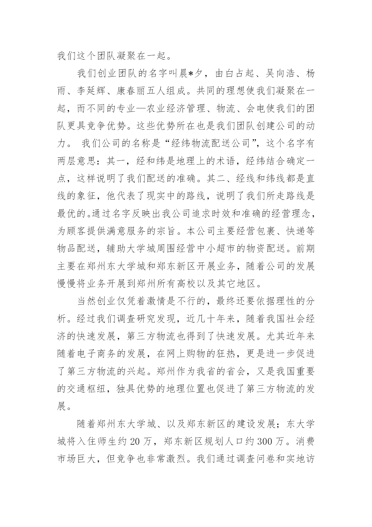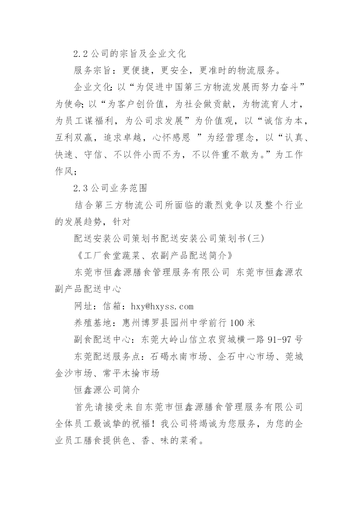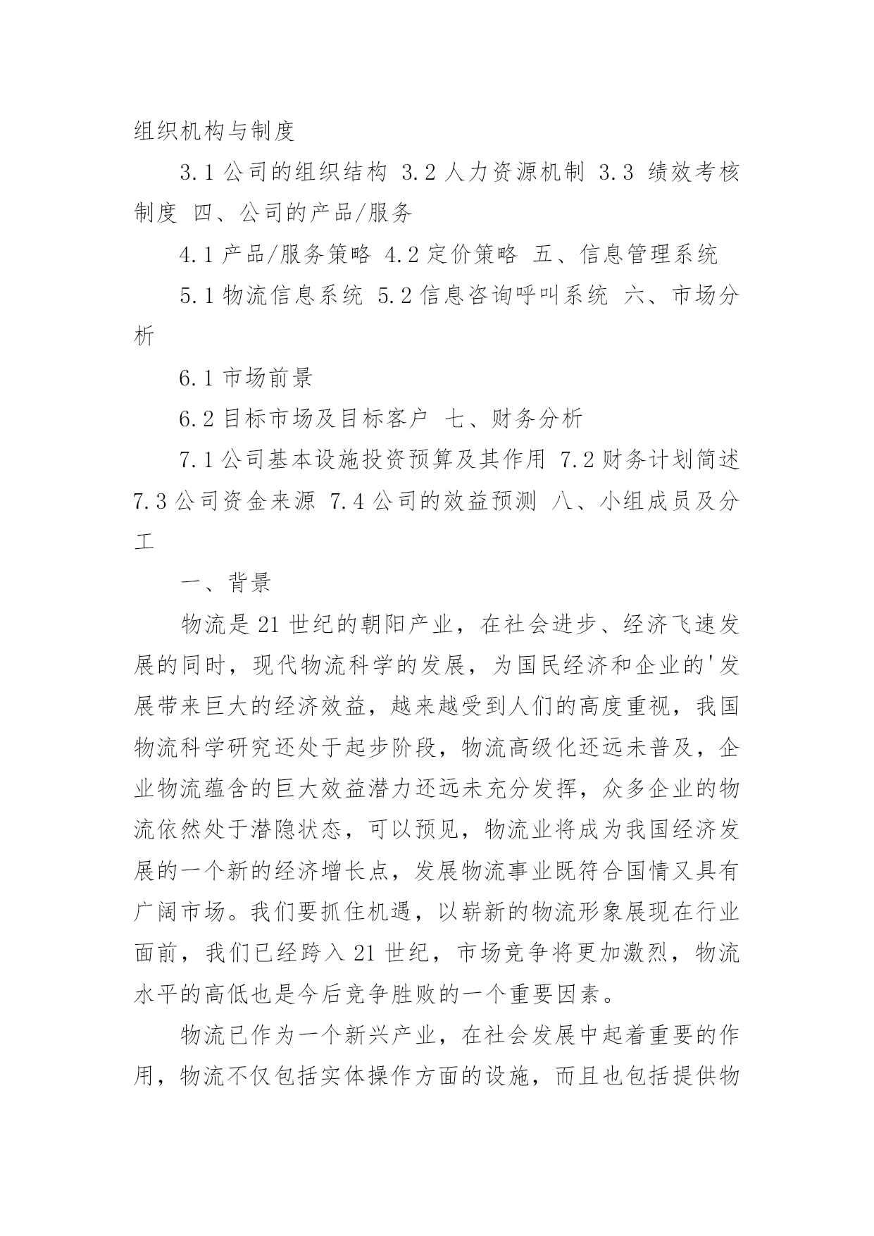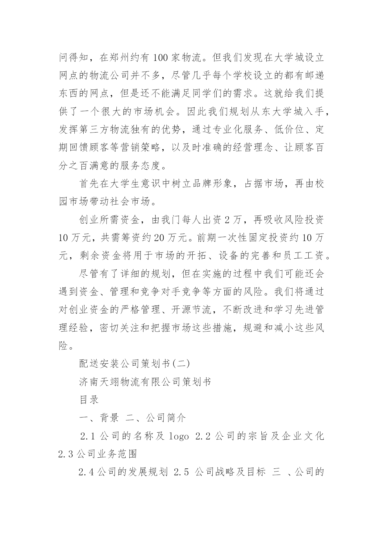 物流公司策划书物流公司策划书一段时间的工作在不知不觉间已经告一段落了,我们的工作将会有更高的难度,更高的工作目标,是不是需要好好写一份策划书呢?相信大家又在为写策划书犯愁了吧!以下是小编帮大家整理的物流公司策划书,欢迎阅读与收藏。物流公司策划书1配送安装公司策划书(一)系别:经济管理系团队名称:晨*夕团队成员:白占起吴向浩杨雨李延辉康春丽时间:20xx年12月17日目录摘要....................................................................................................41公司简介.........................................................................................61.1公司名称、形式、出发点......................................................61.2公司宗旨、目标.....................................................................61.3公司经营理念、管理..............................................................62信息服务.........................................................................................73市场分析.........................................................................................93.1行业发展分析........................................................................93.2目标市场分析......................................................................123.3市场趋势预测及分析...........................................................133.4SWOT分析.............................................................................134管理合作团队介绍........................................................................154.1部门及职能介绍..................................................................154.2团队成员介绍......................................................................155营销策略.......................................................................................165.1营销战略规划......................................................................165.2目标市场营销........................................错误!未定义书签。5.3营销策略................................................错误!未定义书签。6财务规划.......................................................................................196.1股本结构与规模分析...........................................................197风险与风险管理............................................................................247.1风险...............................................................................