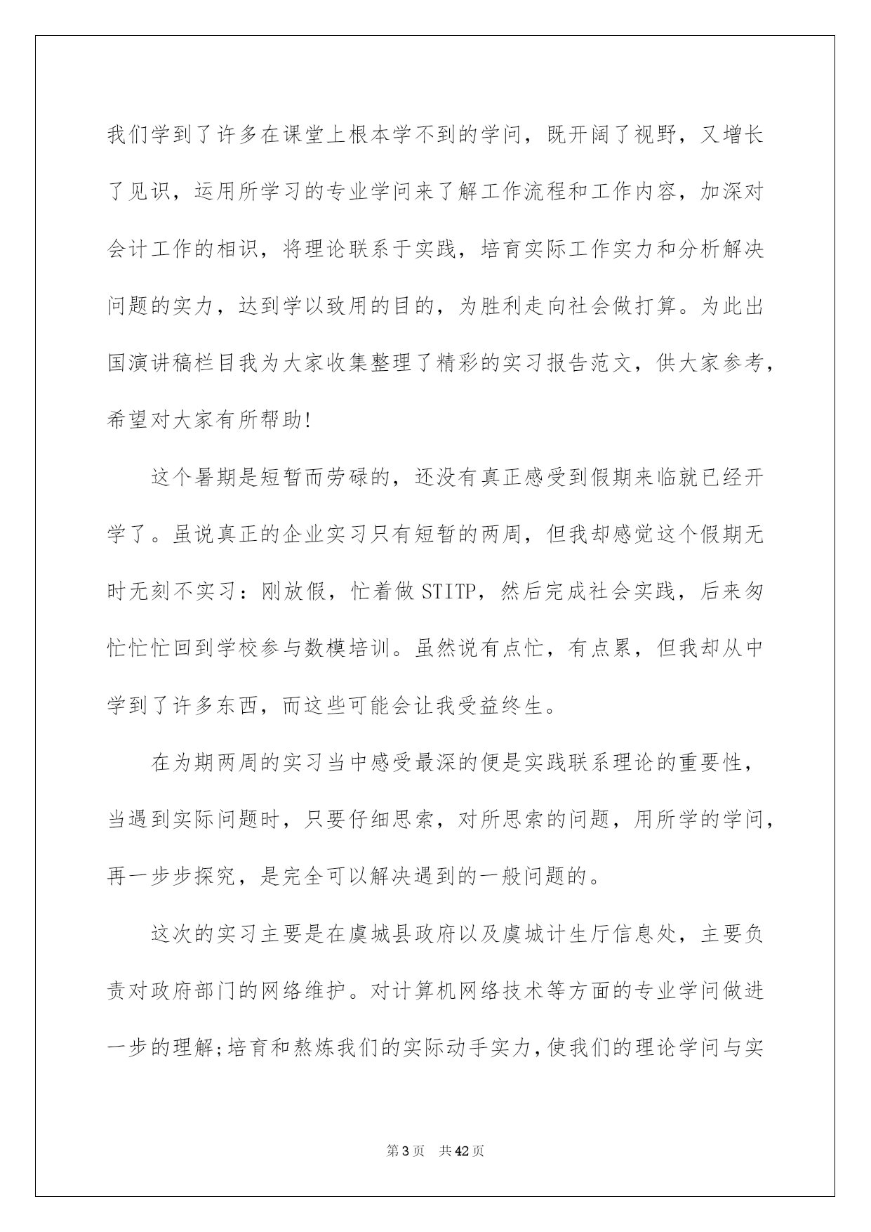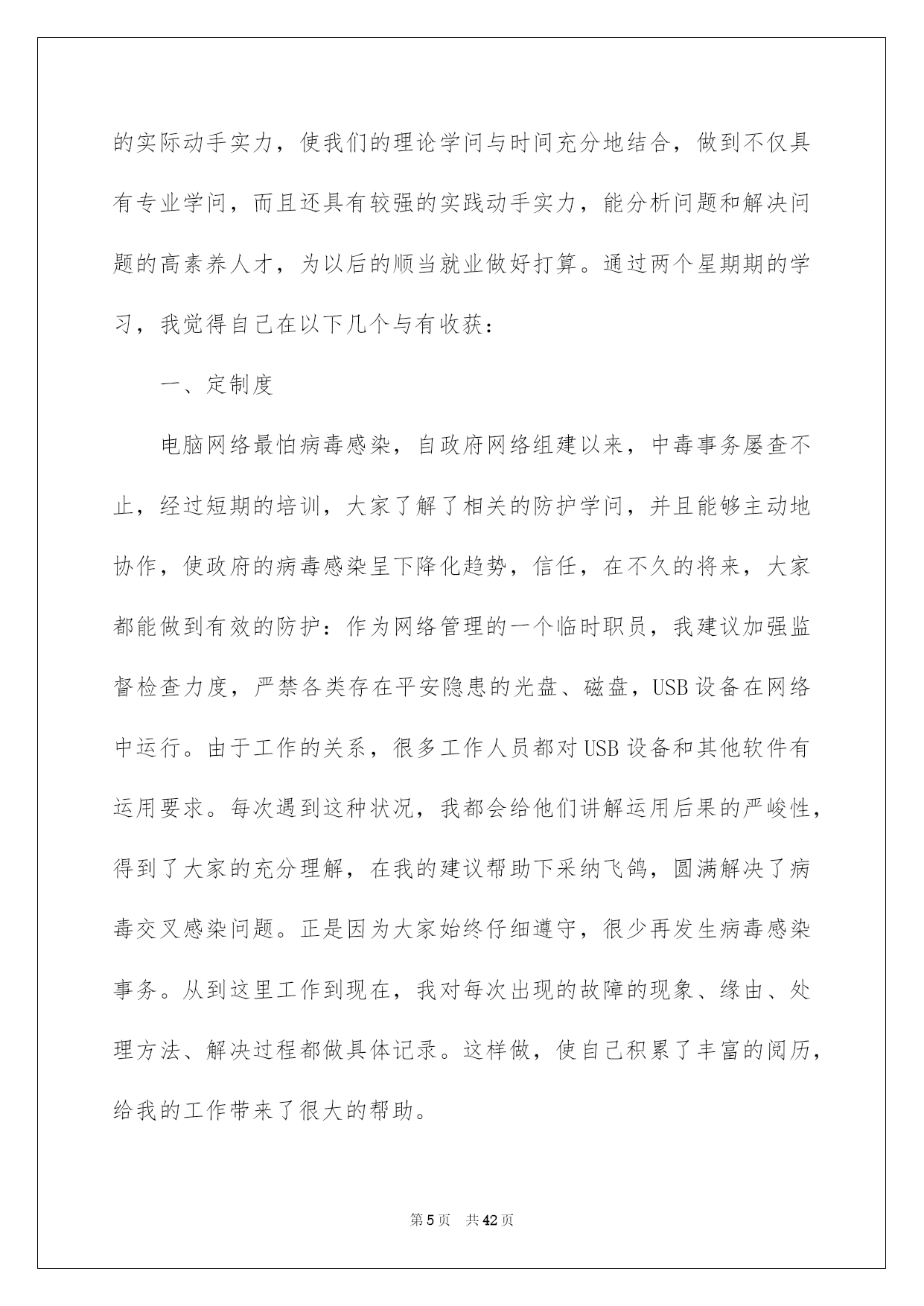 第PAGE\*Arabic\*MERGEFORMAT42页共NUMPAGES\*Arabic\*MERGEFORMAT42页第PAGE\*MERGEFORMAT42页共NUMPAGES\*MERGEFORMAT42页第PAGE\*MERGEFORMAT42页共NUMPAGES\*MERGEFORMAT42页第PAGE\*MERGEFORMAT42页共NUMPAGES\*MERGEFORMAT42页第PAGE\*MERGEFORMAT42页共NUMPAGES\*MERGEFORMAT42页第PAGE\*MERGEFORMAT42页共NUMPAGES\*MERGEFORMAT42页第PAGE\*MERGEFORMAT42页共NUMPAGES\*MERGEFORMAT42页第PAGE\*MERGEFORMAT42页共NUMPAGES\*MERGEFORMAT42页第PAGE\*MERGEFORMAT42页共NUMPAGES\*MERGEFORMAT42页第PAGE\*MERGEFORMAT42页共NUMPAGES\*MERGEFORMAT42页第PAGE\*MERGEFORMAT42页共NUMPAGES\*MERGEFORMAT42页2022大学生计算机实习报告高校生计算机实习报告10篇随着个人素养的提升,报告的用途越来越大,报告包含标题、正文、结尾等。那么报告应当怎么写才合适呢?下面是我细心整理的高校生计算机实习报告10篇,仅供参考,欢迎大家阅读。高校生计算机实习报告篇1当今社会已步入了信息社会,学问经济将成为新世纪的主导产业。伴随计算机的逐步推广和运用,计算机已在科研、生产、商业、服务等很多方面创建了提高效率的途径,与此同时,单位技术成本也逐年有了明显的下降,然而办公室里的人事费用却不断增加。在国外,花费在专业、管理和行政人员上的成本占了办公室总成本的2/3—4/5,这一现象使人们对办公室自动化的要求与日俱增。我们必需在进行机构改革的同时,尽快运用现代化管理设备、管理手段、管理方法。计算机在人事部门的广泛运用,改进了统计手段,改革了统计方法,提高了统计工计算机在人事部门的广泛应用,将为我国的人事管理工作,供应现代化的管理手段和科学的管理方法,并将为开创人事管理工作的新局面创建条件。目前,计算机在我国的人事管理工作中,主要可用来进行报表处理,档案管理,文书,信息查询,综合分析。干部统计作为人事管理的一个重要组成部分,是通过对干部状况的调查,整理和分析,了解干部队伍的发展趋势,为各级领导机关制定干部工作的方针,政策,加强干部管理,改革干部制度供应精确数字的依据。其工作除涉及到干部的基本状况统计之外,还包括干部的工资统计,干部编制状况统计,干部奖惩状况统计,军转干部安置状况统计,老干部状况统计等方面,其涉及的面之广,数据量之大可想而知,若利用手工进行干部的统计工作,大致要经过干部统计调查,干部统计资料的整理,干部统计分析三个过程,但这种手工统计过程,存在着几个明显的问题,比如说统计资料缺乏精确性,刚好性,须要花费大量的人力,物力,财力等。高校生计算机实习报告篇2实习是每一个毕业生必经的一段经验,它使我们在实践中了解社会,巩固学问,实习又是对每一位毕业生专业学问的一种检验,它让我们学到了许多在课堂上根本学不到的学问,既开阔了视野,又增长了见识,运用所学习的专业学问来了解工作流程和工作内容,加深对会计工作的相识,将理论联系于实践,培育实际工作实力和分析解决问题的实力,达到学以致用的目的,为胜利走向社会做打算。为此出国演讲稿栏目我为大家收集整理了精彩的实习报告范文,供大家参考,希望对大家有所帮助!这个暑期是短暂而劳碌的,还没有真正感受到假期来临就已经开学了。虽说真正的企业实习只有短暂的两周,但我却感觉这个假期无时无刻不实习:刚放假,忙着做STITP,然后完成社会实践,后来匆忙忙忙回到学校参与数模培训。虽然说有点忙,有点累,但我却从中学到了许多东西,而这些可能会让我受益终生。在为期两周的实习当中感受最深的便是实践联系理论的重要性,当遇到实际问题时,只要仔细思索,对所思索的问题,用所学的学问,再一步步探究,是完全可以解决遇到的一般问题的。这次的实习主要是在虞城县政府以及虞城计生厅信息处,主要负责对政府部门的网络维护。对计算机网络技术等方面的专业学问做进一步的理解;培育和熬炼我们的实际动手实力,使我们的理论学问与实践充分地结合,做到不仅具有专业学问,而且还具有较强的实践动手实力,能分析问题和解决问题的高素养人才,为以后的顺当就业作好打算。在大一和大二我们学的都是一些理论学问,就是有几个实习我