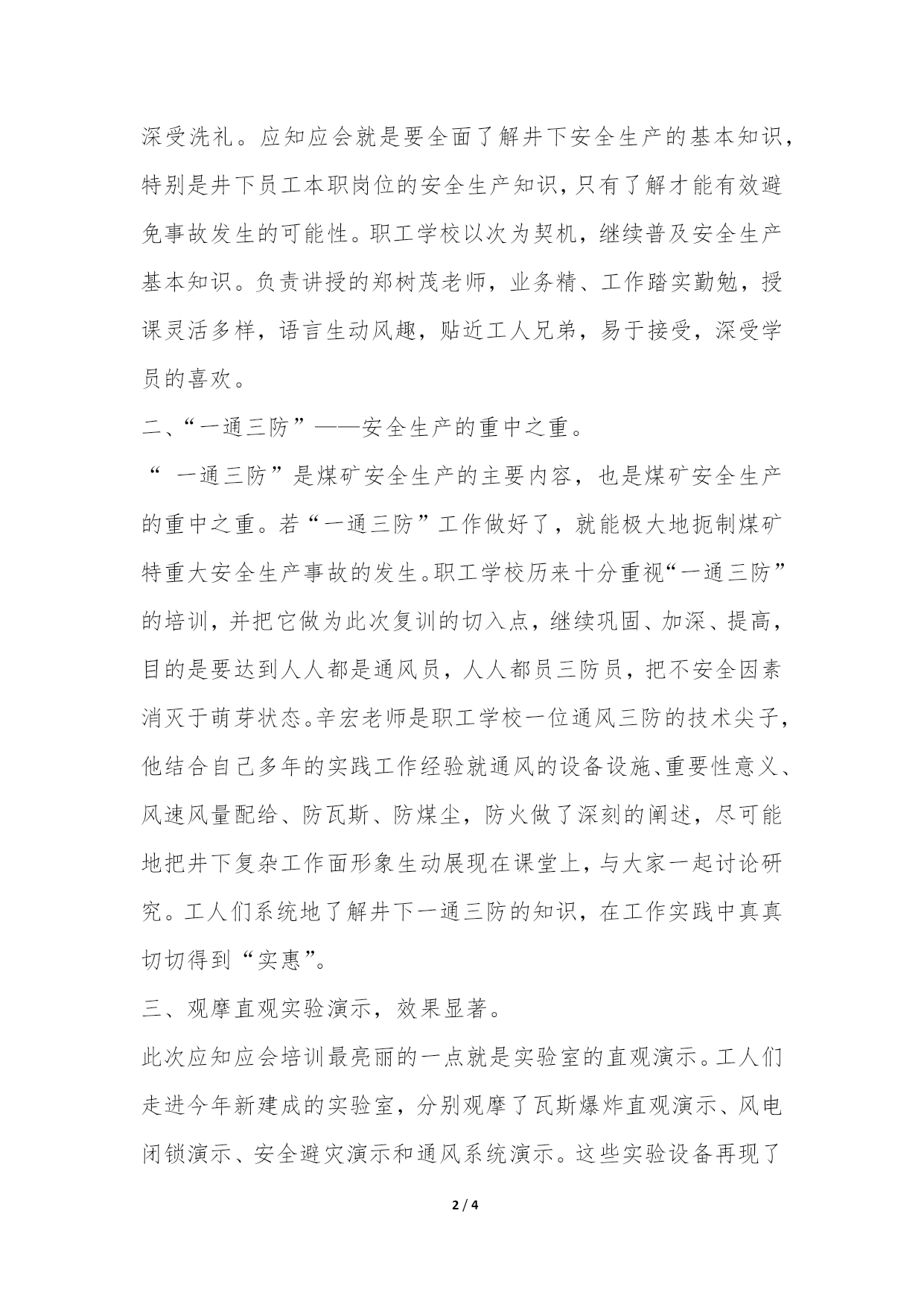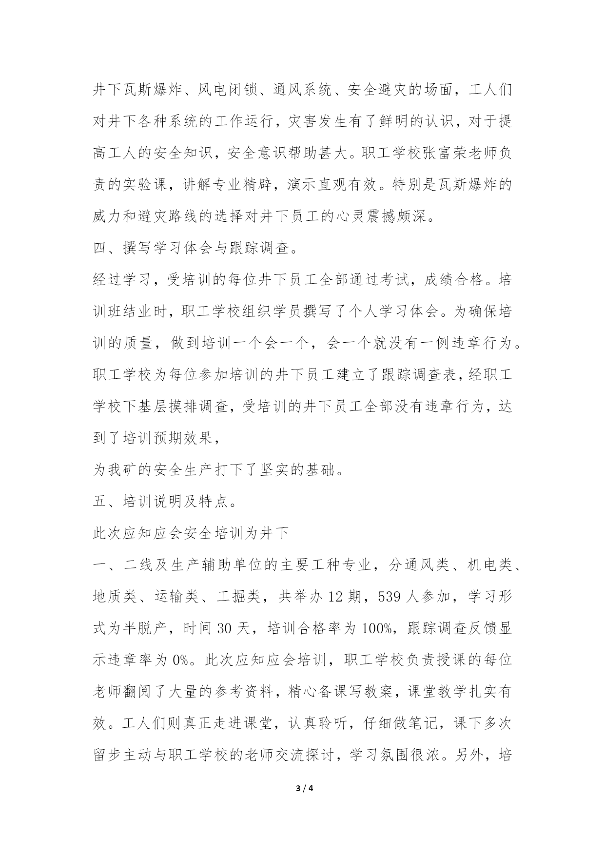 PAGE4/NUMPAGES4地质测量安全技术应知应会培训班总结为了进一步落实国家七部委《关于加强国有重点煤矿安全基础管理的指导意见和全国国有重点煤矿安全基础管理工作座谈会精神要求,同煤集团云冈矿在做好井下员工应知应会培训的基础上,XX年11月初特专门下发云煤培字[XX]第246号文件《关于对井下员工进行应知应会培训的通知》,有针对性地对采、掘、机、运输和地质测量工种进行安全技术应知应会培训,旨在巩固前一阶段的工作,全面提高井下员工的安全生产素质,为云冈矿10~12月份的安全生产提供强有力的保障。此次应知应会培训学习人员按时到位,职工学校严实管理,达到了预期目的,受训员工的安全意识进一步加强,安全生产知识巩固加深。现将第二阶段(XX年10月16日至XX年11月17日)的应知应会培训工作总结如下:一、加强安全形势教育,普及安全基本知识。井下人员必须时刻树立安全生产的意识,保持“安全第一、预防为主”的原则观念,任何生产环节不得马虎,心存侥幸,在思想意识必须高度重视。职工学校把此次应知应会培训的第一堂课定为安全形势教育课,校长孔骋亲自主讲。他分别从当前煤矿安全生产的紧迫性与重要性、各类频发事故的汇总分析和构建社会、企业、家庭的安全文化氛围并结合我矿安全生产的特点等方面深刻剖析和诠释了安全生产的内涵,井下员工思想上又一次深受洗礼。应知应会就是要全面了解井下安全生产的基本知识,特别是井下员工本职岗位的安全生产知识,只有了解才能有效避免事故发生的可能性。职工学校以次为契机,继续普及安全生产基本知识。负责讲授的郑树茂老师,业务精、工作踏实勤勉,授课灵活多样,语言生动风趣,贴近工人兄弟,易于接受,深受学员的喜欢。二、“一通三防”——安全生产的重中之重。“一通三防”是煤矿安全生产的主要内容,也是煤矿安全生产的重中之重。若“一通三防”工作做好了,就能极大地扼制煤矿特重大安全生产事故的发生。职工学校历来十分重视“一通三防”的培训,并把它做为此次复训的切入点,继续巩固、加深、提高,目的是要达到人人都是通风员,人人都员三防员,把不安全因素消灭于萌芽状态。辛宏老师是职工学校一位通风三防的技术尖子,他结合自己多年的实践工作经验就通风的设备设施、重要性意义、风速风量配给、防瓦斯、防煤尘,防火做了深刻的阐述,尽可能地把井下复杂工作面形象生动展现在课堂上,与大家一起讨论研究。工人们系统地了解井下一通三防的知识,在工作实践中真真切切得到“实惠”。三、观摩直观实验演示,效果显著。此次应知应会培训最亮丽的一点就是实验室的直观演示。工人们走进今年新建成的实验室,分别观摩了瓦斯爆炸直观演示、风电闭锁演示、安全避灾演示和通风系统演示。这些实验设备再现了井下瓦斯爆炸、风电闭锁、通风系统、安全避灾的场面,工人们对井下各种系统的工作运行,灾害发生有了鲜明的认识,对于提高工人的安全知识,安全意识帮助甚大。职工学校张富荣老师负责的实验课,讲解专业精辟,演示直观有效。特别是瓦斯爆炸的威力和避灾路线的选择对井下员工的心灵震撼颇深。四、撰写学习体会与跟踪调查。经过学习,受培训的每位井下员工全部通过考试,成绩合格。培训班结业时,职工学校组织学员撰写了个人学习体会。为确保培训的质量,做到培训一个会一个,会一个就没有一例违章行为。职工学校为每位参加培训的井下员工建立了跟踪调查表,经职工学校下基层摸排调查,受培训的井下员工全部没有违章行为,达到了培训预期效果,为我矿的安全生产打下了坚实的基础。五、培训说明及特点。此次应知应会安全培训为井下一、二线及生产辅助单位的主要工种专业,分通风类、机电类、地质类、运输类、工掘类,共举办12期,539人参加,学习形式为半脱产,时间30天,培训合格率为100%,跟踪调查反馈显示违章率为0%。此次应知应会培训,职工学校负责授课的每位老师翻阅了大量的参考资料,精心备课写教案,课堂教学扎实有效。工人们则真正走进课堂,认真聆听,仔细做笔记,课下多次留步主动与职工学校的老师交流探讨,学习氛围很浓。另外,培训班学习其间张存富矿长亲临职工学校检查指导工作并提出了建议。