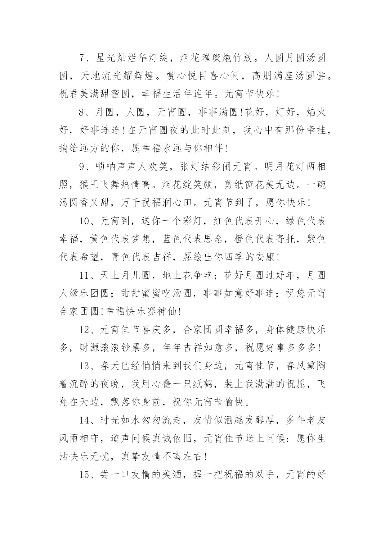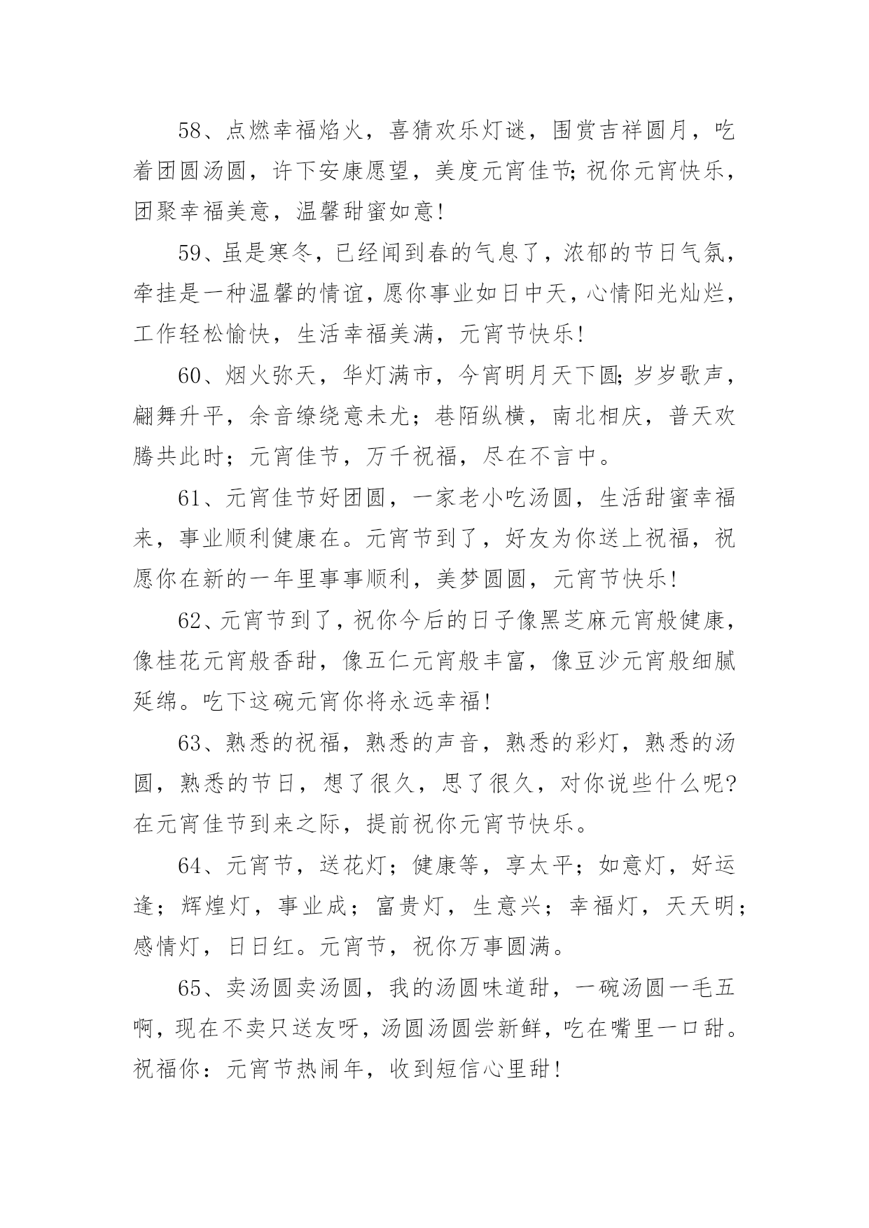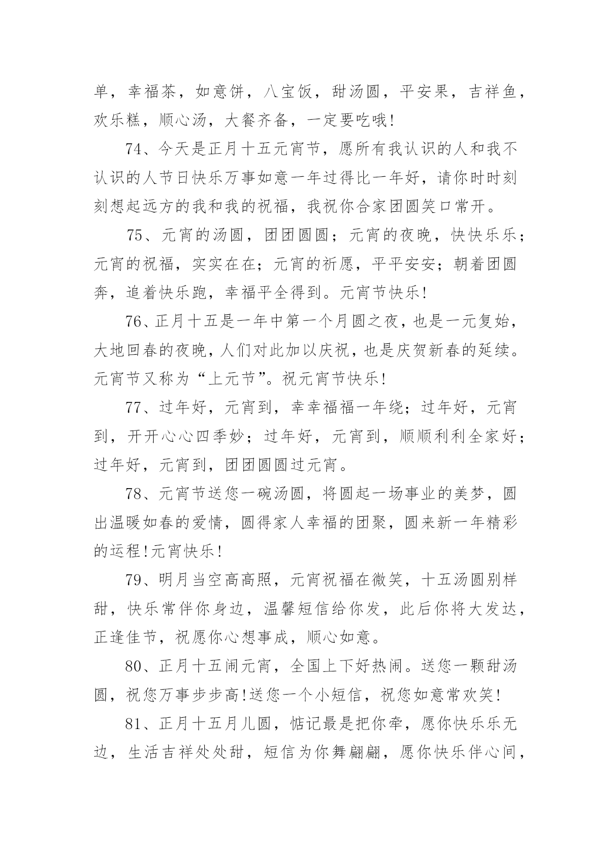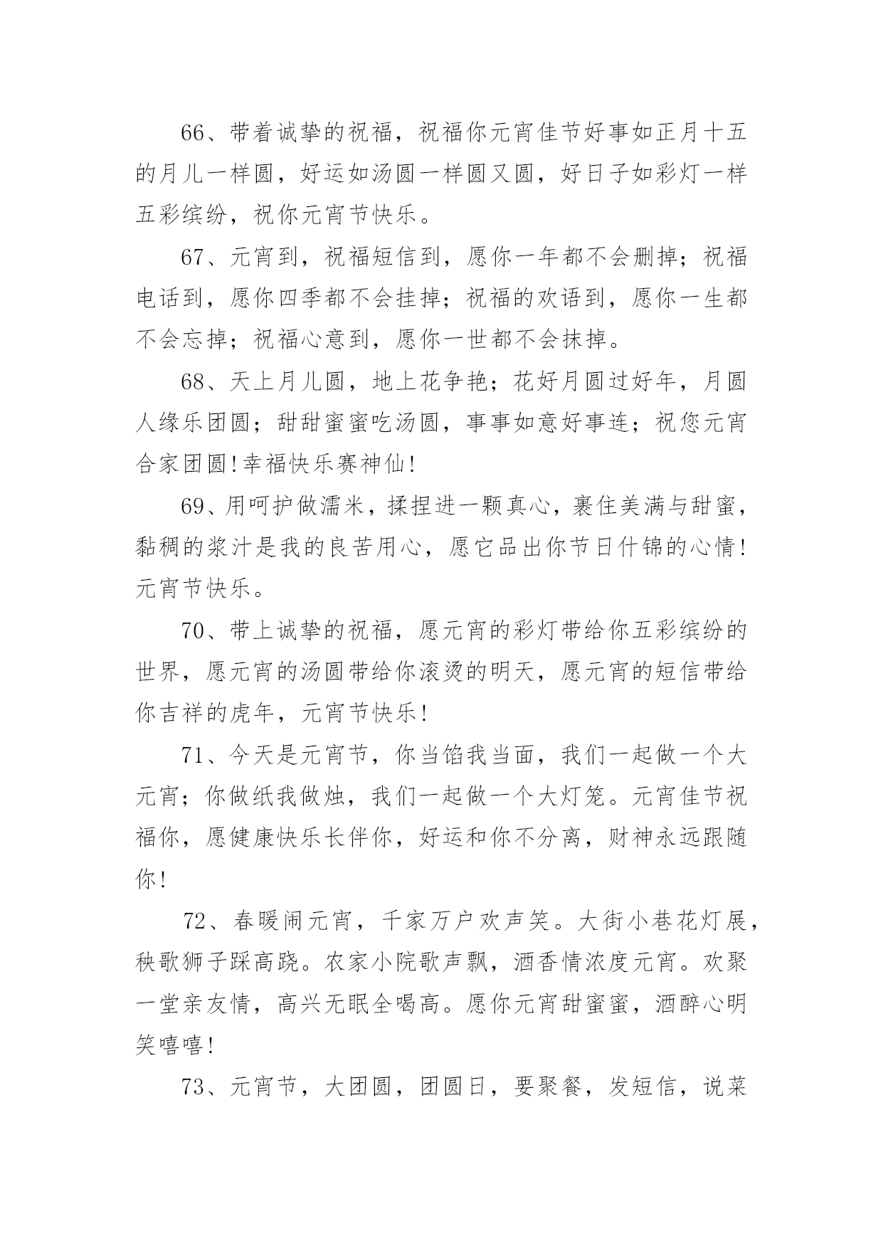 元宵节庆团圆的文案在日常生活或是工作学习中,越来越多人钟情于发布文案,文案用于分享快乐,宣泄伤感。究竟什么样的文案才是特别的呢?下面是小编精心整理的元宵节庆团圆的文案,仅供参考,大家一起来看看吧。1、喜喜的,是节日;圆圆的,是汤圆;黏黏的,是情谊;甜甜的,是思念;滑滑的,是日子;美美的,是生活;溜溜的,是好运;浓浓的,是祝福。元宵快乐!2、月亮,元宵,映衬着你的欢笑,正月十五回荡着你的歌调,新春充盈着你的热闹,此时我心久恋着你的美妙。3、灯火万家,良宵美景;笙歌一曲,盛世佳音。祝你元宵节快快乐乐,热热闹闹!4、喜庆元宵佳节,我祝你:日圆,月圆,圆圆如意。官源财源,源源不断。人缘福缘,缘缘于手。情愿心愿,愿愿成真!元宵节快乐!5、火树银花不夜天,欢歌笑语人不眠;灯谜条条逗人乐,明月霞光照笑颜;亲朋好互庆贺,汤圆个个幸福甜;祝元宵节给力!前途似锦!6、丝真诚,胜过千两黄金;一丝温暖,能抵万里寒霜,一声问候,送来温馨甜蜜;一条短信,捎去我万般心意!愿您元宵节万事如意!7、星光灿烂华灯绽,烟花璀璨炮竹放。人圆月圆汤圆圆,天地流光耀辉煌。赏心悦目喜心间,高朋满座汤圆尝。祝君美满甜蜜圆,幸福生活年连年。元宵节快乐!8、月圆,人圆,元宵圆,事事满圆!花好,灯好,焰火好,好事连连!在元宵圆夜的此时此刻,我心中有那份牵挂,捎给远方的你,愿幸福永远与你相伴!9、唢呐声声人欢笑,张灯结彩闹元宵。明月花灯两相照,猴王飞舞热情高。烟花绽笑颜,剪纸窗花美无边。一碗汤圆香又甜,万千祝福润心田。元宵节到了,愿你快乐!10、元宵到,送你一个彩灯,红色代表开心,绿色代表幸福,黄色代表梦想,蓝色代表思念,橙色代表寄托,紫色代表希望,青色代表吉祥,愿绘出你四季的安康!11、天上月儿圆,地上花争艳;花好月圆过好年,月圆人缘乐团圆;甜甜蜜蜜吃汤圆,事事如意好事连;祝您元宵合家团圆!幸福快乐赛神仙!12、元宵佳节喜庆多,合家团圆幸福多,身体健康快乐多,财源滚滚钞票多,年年吉祥如意多,祝愿好事多多多!13、春天已经悄悄来到我们身边,元宵佳节,春风熏陶着沉醉的夜晚,我用心叠一只纸鹤,装上我满满的祝愿,飞翔在天边,飘落你身前,祝你元宵节愉快。14、时光如水匆匆流走,友情似酒越发醇厚,多年老友风雨相守,道声问候真诚依旧,元宵佳节送上问候:愿你生活快乐无忧,真挚友情不离左右!15、尝一口友情的美酒,握一把祝福的双手,元宵的好运跟随你走,愿你财源广进最永久,人缘通达众皆口,好运佳缘为你守,伴你快乐无烦忧,祝你元宵快乐。16、元宵到,烦恼消,快来报到,幸福时刻绕,祥云片片飞舞,吉祥天天迎头笑,祝福到来向来悄悄,愿你快乐常伴乐逍遥!17、正月十五闹元宵,缘来一家人,围坐后花园,圆圆的月亮高高挂,圆圆的元宵碗里躺,抬头望圆月,低头吃元宵,喜庆迎团圆,幸福满园香!18、万家灯火,好运与你携手,快乐伴你永久;十五月圆,吉祥为你蜜甜,如意陪你永远;元宵佳节,幸福源泉不竭,成功之榜等你揭。祝你元宵快乐。19、月圆月圆,团团圆圆。汤圆汤圆,圆圆满满。首轮圆月将来照,春节结束在元宵。祝愿寄达收存好,愿你生活走向高。天天如意好运道,时时开心乐滔滔。20、元宵儿圆圆心里儿甜甜。画一个圈圈添一个弯弯。加两个点点送你个笑脸。心儿再酸酸也该会缓缓。如果还烦烦再吃斤汤圆!21、托给明月元宵情,透过祥云渡吉祥,仰望圆月送祝福,嫦娥拂袖撒甘露,挚爱亲朋爱无疆,奋发图强有财气,举国上下齐努力,欢庆佳节同欢乐。22、你的快乐,我赞助:你的痛苦,我承受;你的幸福,我拥有;你的思念,我接受:你的脾气,我承受:你的一生,我陪伴。元宵节愉快!23、让我的短信带着快乐飞向你的梦乡,让我的短信伴着好运降落到你的身旁,让我的短信携着幸福流淌在你的心房,让我的短信捎给你元宵的吉祥!亲爱的元宵快乐!24、甜甜的甜甜的鲜灵的汤圆,圆圆的圆圆的月亮的脸,满满的满满的盛给你一碗,装上我美美的美美的元宵祝愿!衷心祝愿朋友元宵佳节合家团圆!25、带上诚挚的祝福,愿你开心大本营,开心总动员,开心大风车,开心每一年,开心每一月,开心每一天,开心每一刻,开心,开心,元宵节开心。26、人,相互依靠才脚踏实地;事,共同努力才简单容易;路,有人同行才风景美丽;朋友,时常惦记才分外亲密。元宵节祝您快乐,阖家幸福!27、元宵真热闹,看烟花,放鞭炮;灯笼红又亮,挂满窗,喜洋洋!28、盏盏花灯报元夜,岁岁瑞雪兆丰年,玉烛长调千户乐,花灯遍照万家春,祝我亲爱的朋友,元宵节快乐!29、天下之友无数,以投缘为佳;天下之谊无尽,以适己为悦;天下之爱无穷,以知音为贵;天下之情无量,以称心为重!祝您元宵阖家欢乐,事事如意!31、正月十五是元宵,佳节送来喜气多多,愿你合家欢乐团圆多多,爱情甜蜜美满多多,事业腾飞发财多多,生活幸福快乐多多,吉祥如意好事多多!元宵节快乐!32、快快
