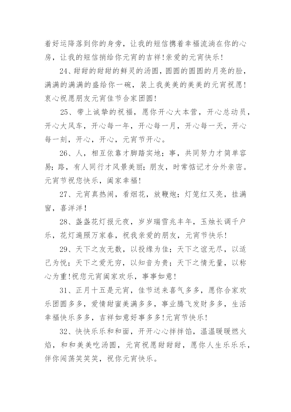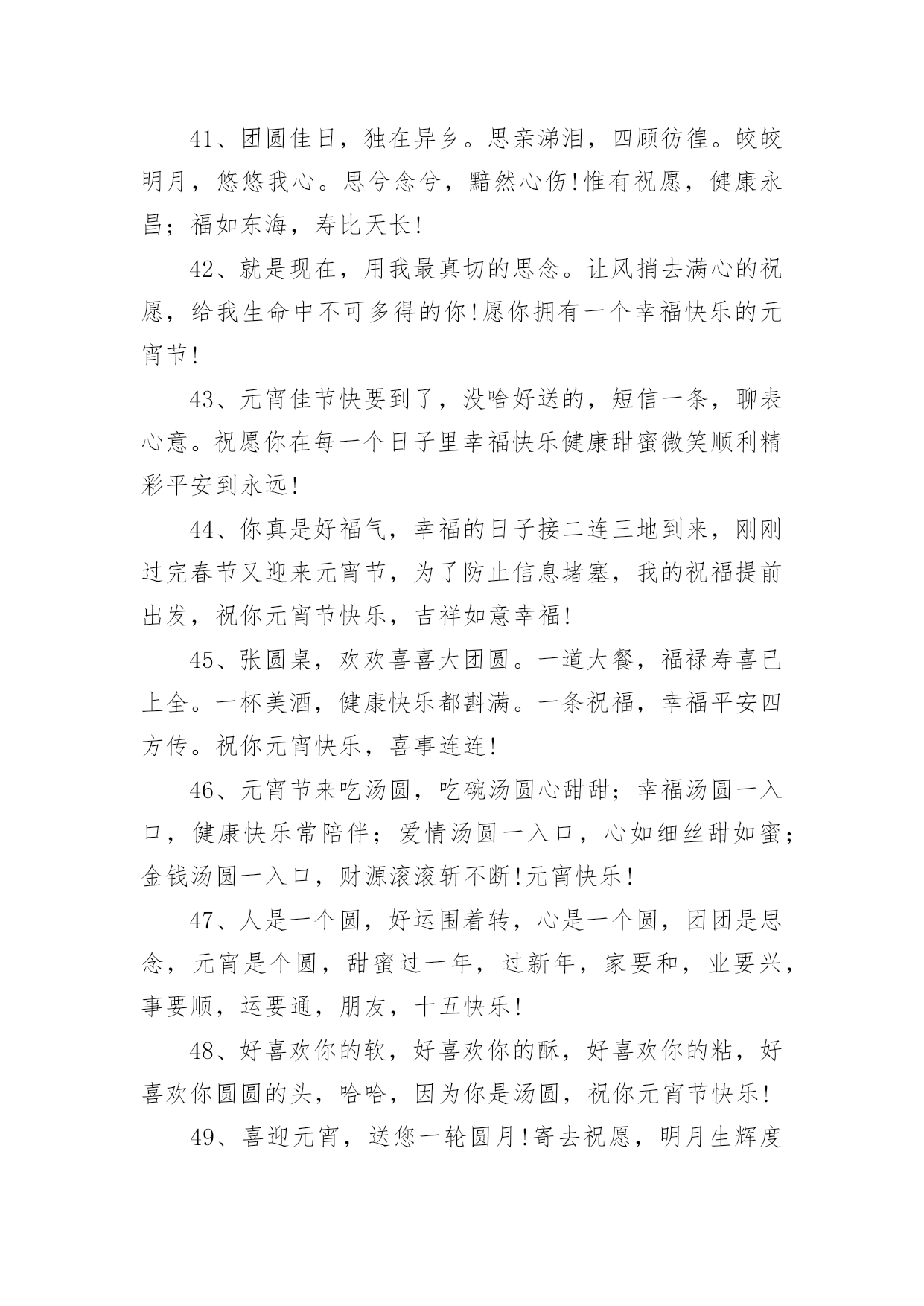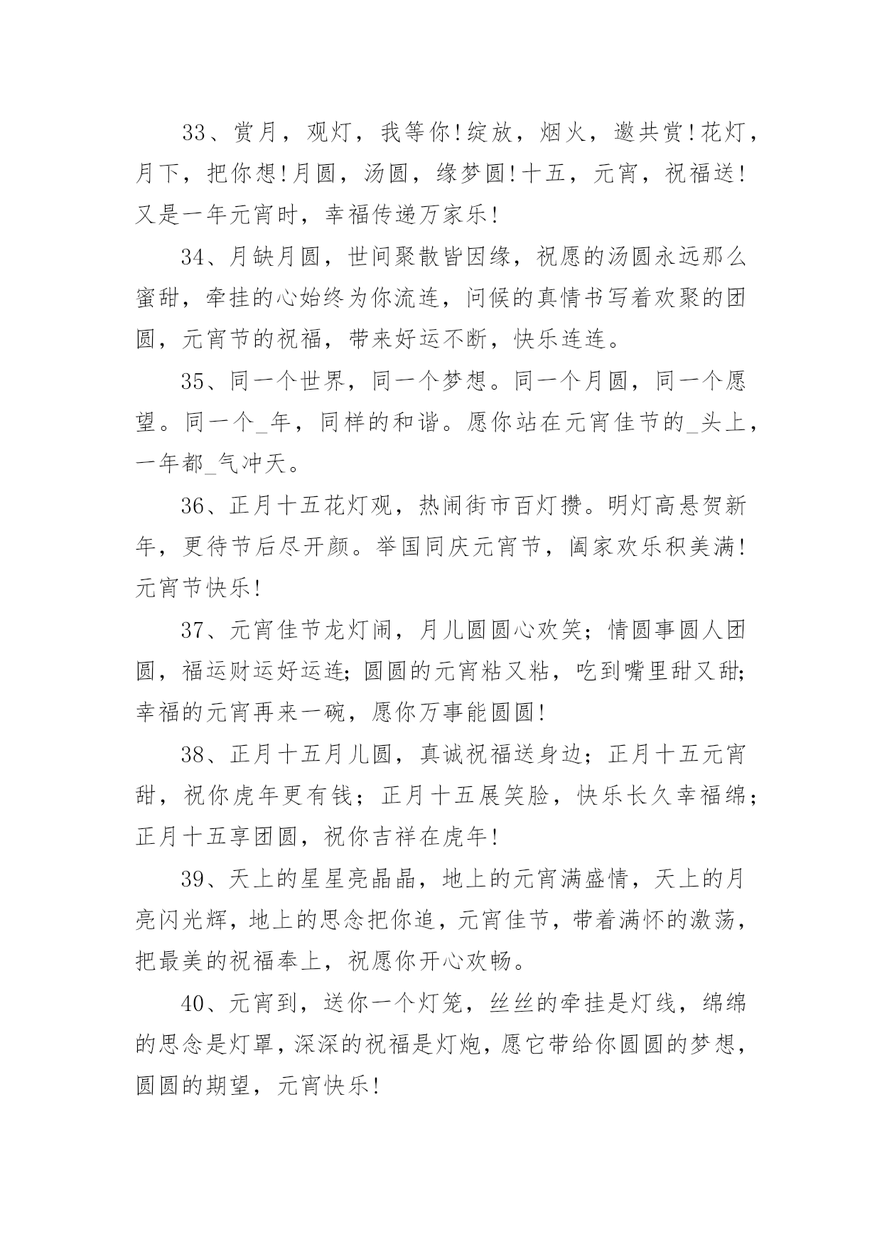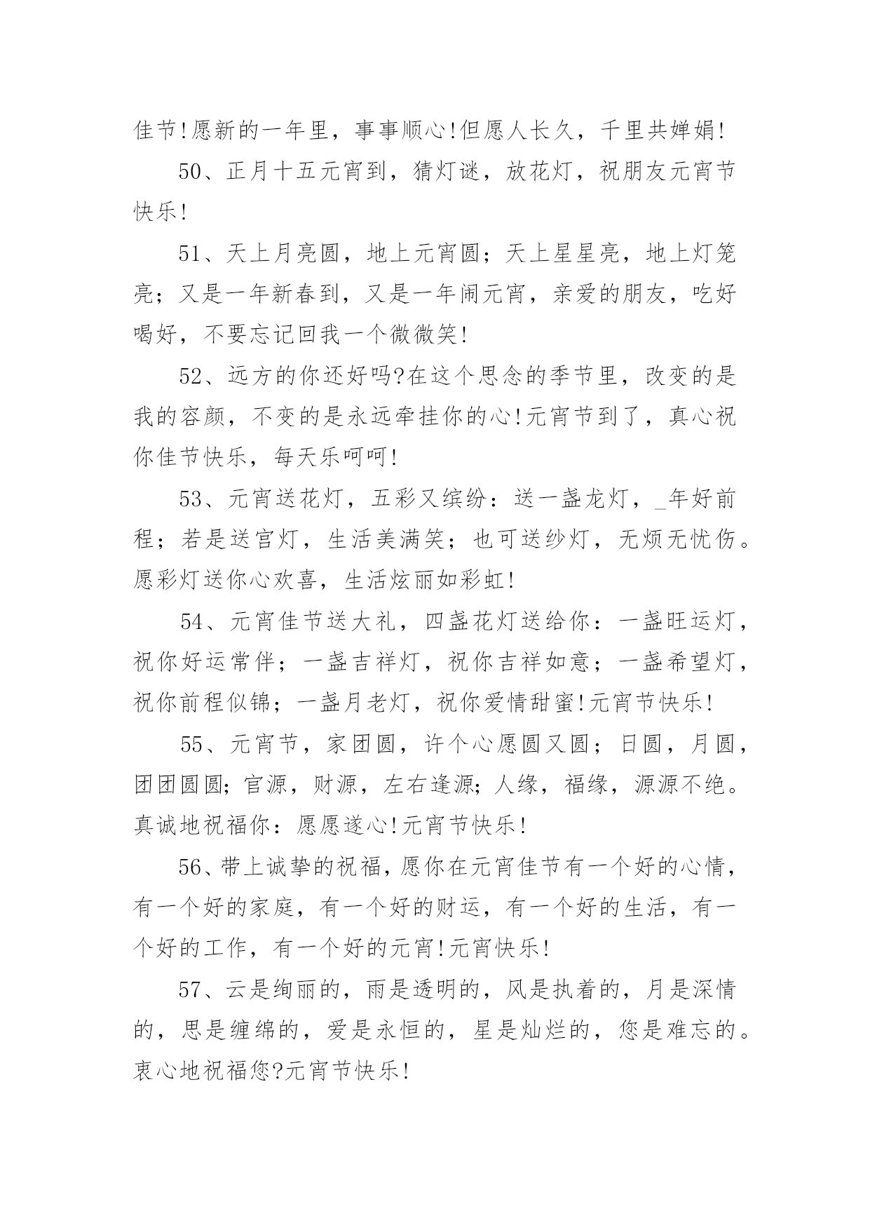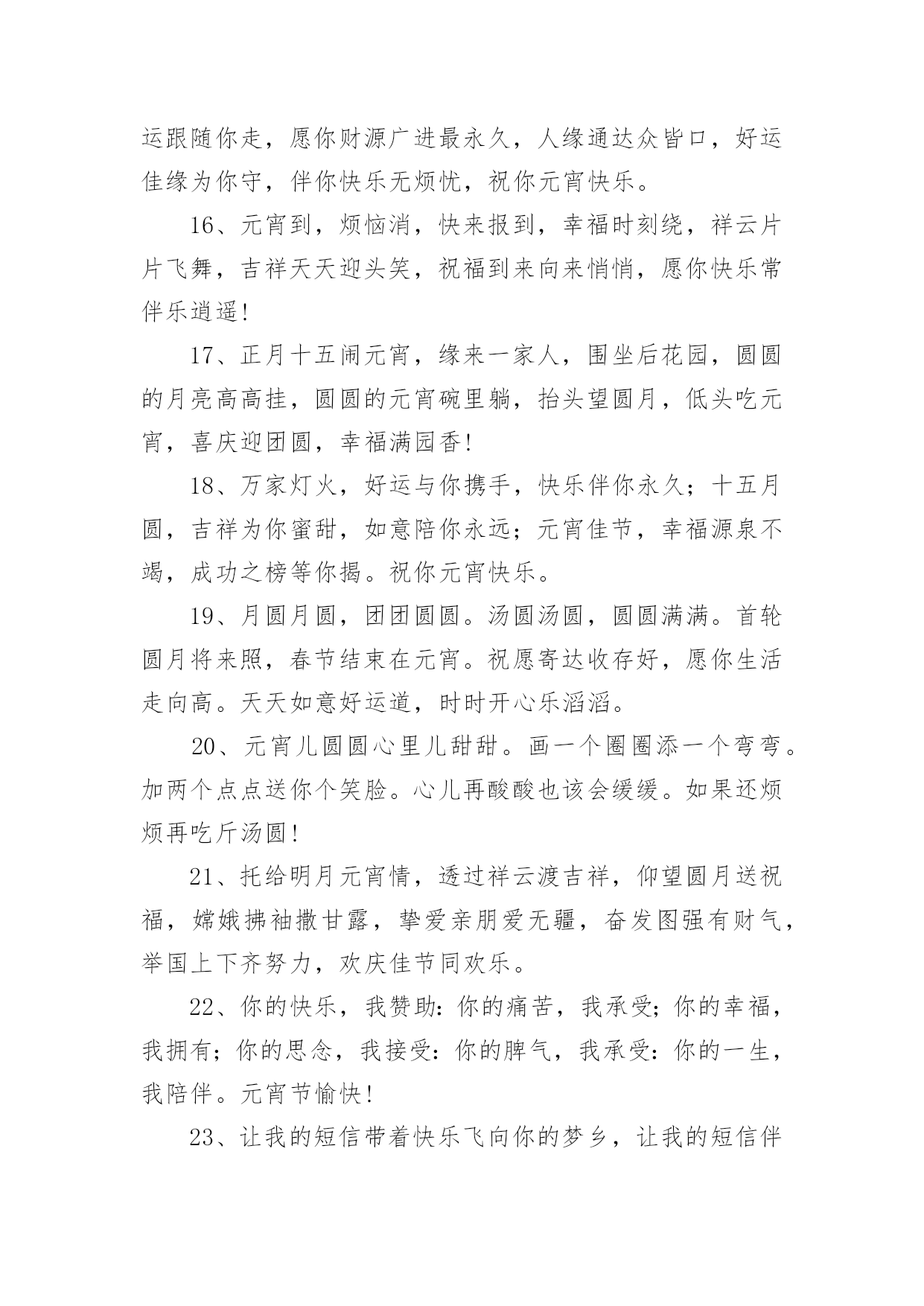 元宵节庆团圆的文案在日常生活或是工作学习中,越来越多人钟情于发布文案,文案用于分享快乐,宣泄伤感。究竟什么样的文案才是特别的呢?下面是小编精心整理的元宵节庆团圆的文案,仅供参考,大家一起来看看吧。1、喜喜的,是节日;圆圆的,是汤圆;黏黏的,是情谊;甜甜的,是思念;滑滑的,是日子;美美的,是生活;溜溜的,是好运;浓浓的,是祝福。元宵快乐!2、月亮,元宵,映衬着你的欢笑,正月十五回荡着你的歌调,新春充盈着你的热闹,此时我心久恋着你的美妙。3、灯火万家,良宵美景;笙歌一曲,盛世佳音。祝你元宵节快快乐乐,热热闹闹!4、喜庆元宵佳节,我祝你:日圆,月圆,圆圆如意。官源财源,源源不断。人缘福缘,缘缘于手。情愿心愿,愿愿成真!元宵节快乐!5、火树银花不夜天,欢歌笑语人不眠;灯谜条条逗人乐,明月霞光照笑颜;亲朋好互庆贺,汤圆个个幸福甜;祝元宵节给力!前途似锦!6、丝真诚,胜过千两黄金;一丝温暖,能抵万里寒霜,一声问候,送来温馨甜蜜;一条短信,捎去我万般心意!愿您元宵节万事如意!7、星光灿烂华灯绽,烟花璀璨炮竹放。人圆月圆汤圆圆,天地流光耀辉煌。赏心悦目喜心间,高朋满座汤圆尝。祝君美满甜蜜圆,幸福生活年连年。元宵节快乐!8、月圆,人圆,元宵圆,事事满圆!花好,灯好,焰火好,好事连连!在元宵圆夜的此时此刻,我心中有那份牵挂,捎给远方的你,愿幸福永远与你相伴!9、唢呐声声人欢笑,张灯结彩闹元宵。明月花灯两相照,猴王飞舞热情高。烟花绽笑颜,剪纸窗花美无边。一碗汤圆香又甜,万千祝福润心田。元宵节到了,愿你快乐!10、元宵到,送你一个彩灯,红色代表开心,绿色代表幸福,黄色代表梦想,蓝色代表思念,橙色代表寄托,紫色代表希望,青色代表吉祥,愿绘出你四季的安康!11、天上月儿圆,地上花争艳;花好月圆过好年,月圆人缘乐团圆;甜甜蜜蜜吃汤圆,事事如意好事连;祝您元宵合家团圆!幸福快乐赛神仙!12、元宵佳节喜庆多,合家团圆幸福多,身体健康快乐多,财源滚滚钞票多,年年吉祥如意多,祝愿好事多多多!13、春天已经悄悄来到我们身边,元宵佳节,春风熏陶着沉醉的夜晚,我用心叠一只纸鹤,装上我满满的祝愿,飞翔在天边,飘落你身前,祝你元宵节愉快。14、时光如水匆匆流走,友情似酒越发醇厚,多年老友风雨相守,道声问候真诚依旧,元宵佳节送上问候:愿你生活快乐无忧,真挚友情不离左右!15、尝一口友情的美酒,握一把祝福的双手,元宵的好运跟随你走,愿你财源广进最永久,人缘通达众皆口,好运佳缘为你守,伴你快乐无烦忧,祝你元宵快乐。16、元宵到,烦恼消,快来报到,幸福时刻绕,祥云片片飞舞,吉祥天天迎头笑,祝福到来向来悄悄,愿你快乐常伴乐逍遥!17、正月十五闹元宵,缘来一家人,围坐后花园,圆圆的月亮高高挂,圆圆的元宵碗里躺,抬头望圆月,低头吃元宵,喜庆迎团圆,幸福满园香!18、万家灯火,好运与你携手,快乐伴你永久;十五月圆,吉祥为你蜜甜,如意陪你永远;元宵佳节,幸福源泉不竭,成功之榜等你揭。祝你元宵快乐。19、月圆月圆,团团圆圆。汤圆汤圆,圆圆满满。首轮圆月将来照,春节结束在元宵。祝愿寄达收存好,愿你生活走向高。天天如意好运道,时时开心乐滔滔。20、元宵儿圆圆心里儿甜甜。画一个圈圈添一个弯弯。加两个点点送你个笑脸。心儿再酸酸也该会缓缓。如果还烦烦再吃斤汤圆!21、托给明月元宵情,透过祥云渡吉祥,仰望圆月送祝福,嫦娥拂袖撒甘露,挚爱亲朋爱无疆,奋发图强有财气,举国上下齐努力,欢庆佳节同欢乐。22、你的快乐,我赞助:你的痛苦,我承受;你的幸福,我拥有;你的思念,我接受:你的脾气,我承受:你的一生,我陪伴。元宵节愉快!23、让我的短信带着快乐飞向你的梦乡,让我的短信伴着好运降落到你的身旁,让我的短信携着幸福流淌在你的心房,让我的短信捎给你元宵的吉祥!亲爱的元宵快乐!24、甜甜的甜甜的鲜灵的汤圆,圆圆的圆圆的月亮的脸,满满的满满的盛给你一碗,装上我美美的美美的元宵祝愿!衷心祝愿朋友元宵佳节合家团圆!25、带上诚挚的祝福,愿你开心大本营,开心总动员,开心大风车,开心每一年,开心每一月,开心每一天,开心每一刻,开心,开心,元宵节开心。26、人,相互依靠才脚踏实地;事,共同努力才简单容易;路,有人同行才风景美丽;朋友,时常惦记才分外亲密。元宵节祝您快乐,阖家幸福!27、元宵真热闹,看烟花,放鞭炮;灯笼红又亮,挂满窗,喜洋洋!28、盏盏花灯报元夜,岁岁瑞雪兆丰年,玉烛长调千户乐,花灯遍照万家春,祝我亲爱的朋友,元宵节快乐!29、天下之友无数,以投缘为佳;天下之谊无尽,以适己为悦;天下之爱无穷,以知音为贵;天下之情无量,以称心为重!祝您元宵阖家欢乐,事事如意!31、正月十五是元宵,佳节送来喜气多多,愿你合家欢乐团圆多多,爱情甜蜜美满多多,事业腾飞发财多多,生活幸福快乐多多,吉祥如意好事多多!元宵节快乐!32、快快