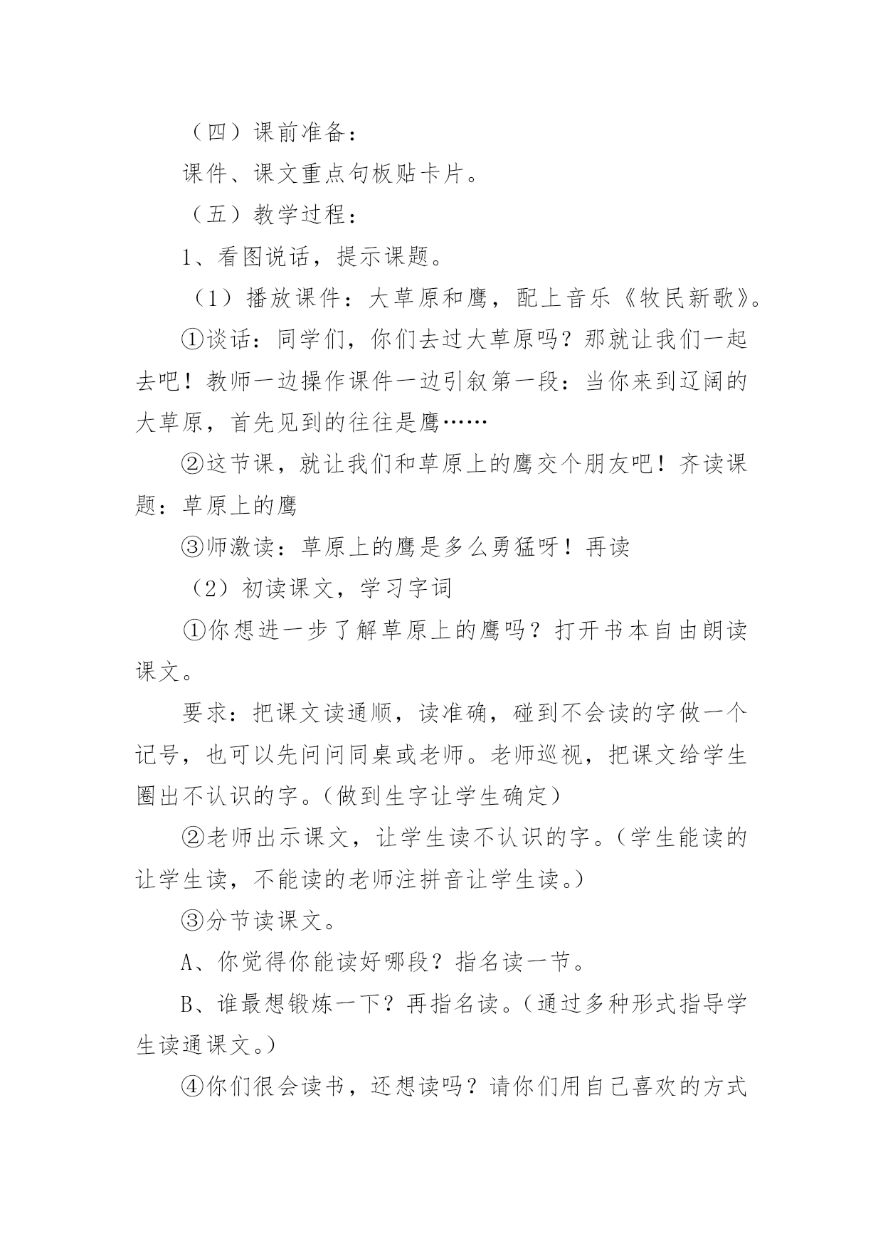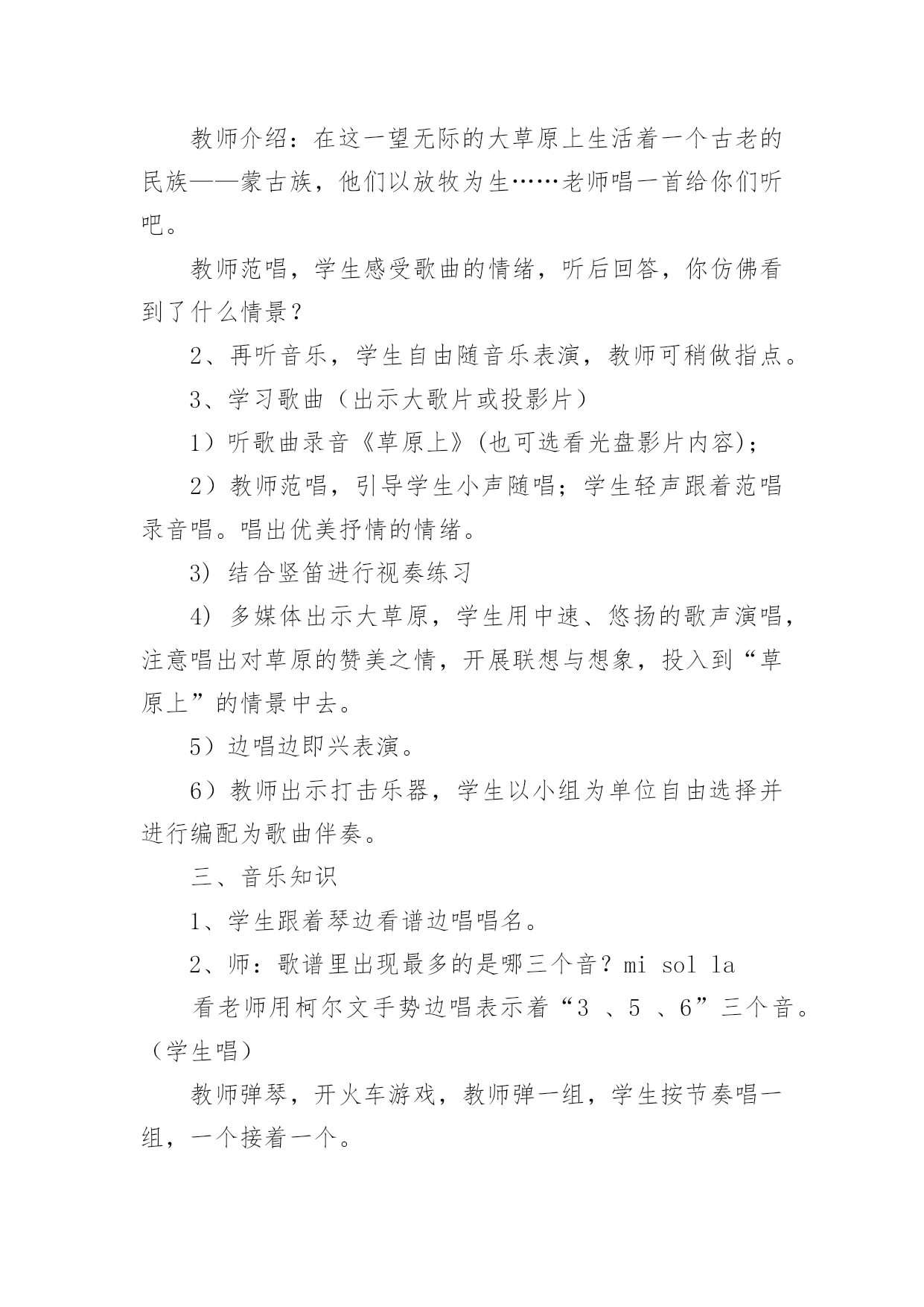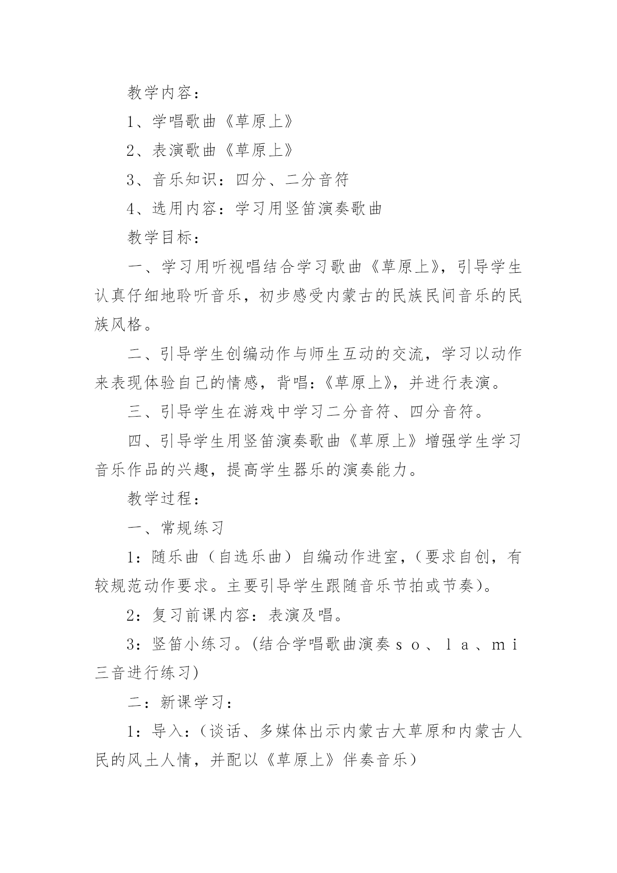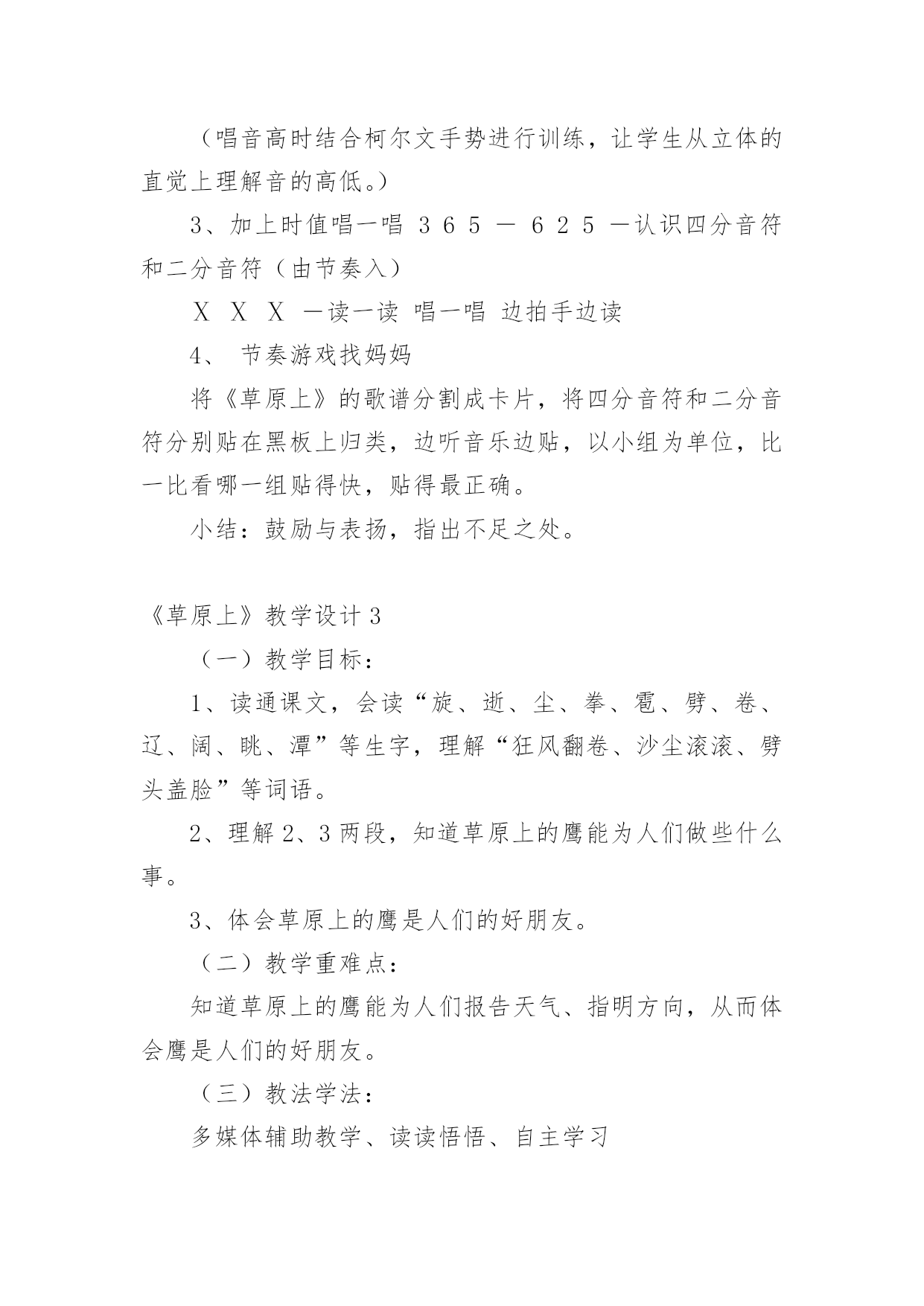 《草原上》教学设计《草原上》教学设计9篇在教学工作者开展教学活动前,总不可避免地需要编写教学设计,教学设计是把教学原理转化为教学材料和教学活动的计划。那么大家知道规范的教学设计是怎么写的吗?以下是小编为大家整理的《草原上》教学设计,欢迎阅读与收藏。《草原上》教学设计1(一)教学目标:1、读通课文,会读“旋、逝、尘、拳、雹、劈、卷、辽、阔、眺、潭”等生字,理解“狂风翻卷、沙尘滚滚、劈头盖脸”等词语。2、理解2、3两段,知道草原上的鹰能为人们做些什么事。3、体会草原上的鹰是人们的好朋友。(二)教学重难点:知道草原上的鹰能为人们报告天气、指明方向,从而体会鹰是人们的好朋友。(三)教法学法:多媒体辅助教学、读读悟悟、自主学习(四)课前准备:课件、课文重点句板贴卡片(五)教学过程:一、看图说话,提示课题1、播放课件:大草原和鹰,配上音乐《牧民新歌》。谈话:同学们,你们去过大草原吗?那就让我们一起去吧!教师一边操作课件一边引叙第一段:当你来到辽阔的大草原,首先见到的往往是鹰……2、这节课,就让我们和草原上的鹰交个朋友吧!齐读课题:草原上的鹰师激读:草原上的鹰是多么勇猛呀!再读二、初读课文,学习字词1、你想进一步了解草原上的鹰吗?打开书本自由朗读课文。要求:把课文读通顺,读准确,碰到不会读的字做一个记号,也可以先问问同桌或老师。老师巡视,把课文给学生圈出不认识的字。(做到生字让学生确定)2、老师出示课文,让学生读不认识的字。(学生能读的让学生读,不能读的老师注拼音让学生读。)3、分节读课文。①你觉得你能读好哪段?指名读一节。②谁最想锻炼一下?再指名读。(通过多种形式指导学生读通课文。)4、你们很会读书,还想读吗?请你们用自己喜欢的方式读课文。要求:哪一句话最能看出人们对草原上的鹰有着深厚的感情,边读边划出一个句子。5、指名说,并板贴句子:草原上的鹰,真是人们的好朋友。指导朗读好这个句子,教师随机评点:老师感觉有点像好朋友了,再读。三、读读悟悟,体会情感学习第二段1、(导)为什么说草原上的鹰是人们的好朋友吗?自由朗读第二段,想一想:你从哪些句子中体会出鹰是人们的好朋友?2、指名说,随机重点训练以下句子:(1)出示句子:果然,()在朝霞消逝的地方,出现了一片黄云,()狂风翻卷,沙尘滚滚,拳手大的冰雹就劈头盖脸地打下来。A、天气有怎样的变化?学生说,老师出示以上句子。B、其实天气变化是有一定先后顺序的。请你给这两个句子加上表示先后顺序的词。(过不了多久、接着)读一读这两个词语,你有什么感觉?(体会天气变化之快。)C、天气的变化不仅快,而且越变越恶劣。先看图(配音)感受看了图,你有什么感受?请你用书上的一两个词语来说一说这时候的天气情况。(如:狂风翻卷,沙尘滚滚,劈头盖脸)教师马上指导读好这几个词。你能通过读把这恶劣的天气展现出来吗?自由练读整句子→指名读→评议→全班男同学读、女同学读(师点:女同学要是能通过朗读,把这恶劣的天气展现出来,那真的很了不起)→齐读。---------------------------D、第一次激情引读重点句:鹰为人们预告了这么恶劣的天气,可以让人们早做准备,怪不得草原上的人们见到在草原上空飞翔的鹰会说—学生齐读句子:草原上的鹰,真是人们的好朋友。(2)你还从哪里体会出鹰是人们的好朋友?指名说,再师生共同学习句子。A、先看图,教师激情:瞧,月亮高高地挂在空中,清风阵阵地吹着,多美丽的草原夜色,多宁静的草原之夜呀!学生齐读句子:晚上,月亮高高地挂在空中,清风阵阵地吹着,草原上空不时传来鹰的长鸣,这是它在预告,明天天气一定晴朗。(要是学生读不出来,老师再点拨:要是能再轻一点,老师会感觉草原之夜更宁静更美)。B、指导朗读全段:男女同学分读“早晨”“晚上”两部分,特别要注意读好这两种不同的意境。&《草原上》教学设计2教学内容:1、学唱歌曲《草原上》2、表演歌曲《草原上》3、音乐知识:四分、二分音符4、选用内容:学习用竖笛演奏歌曲教学目标:一、学习用听视唱结合学习歌曲《草原上》,引导学生认真仔细地聆听音乐,初步感受内蒙古的民族民间音乐的民族风格。二、引导学生创编动作与师生互动的交流,学习以动作来表现体验自己的情感,背唱:《草原上》,并进行表演。三、引导学生在游戏中学习二分音符、四分音符。四、引导学生用竖笛演奏歌曲《草原上》增强学生学习音乐作品的兴趣,提高学生器乐的演奏能力。教学过程:一、常规练习1:随乐曲(自选乐曲)自编动作进室,(要求自创,有较规范动作要求。主要引导学生跟随音乐节拍或节奏)。2:复习前课内容:表演及唱。3:竖笛小练习。(结合学唱歌曲演奏so、la、mi三音进行练习)二:新课学习:1:导入:(谈话、多媒体出示内蒙古大草原和内蒙古人民的风土人情,并配以《草原上》伴奏音乐)教师介绍:在这一望无际的大草原上生活着一