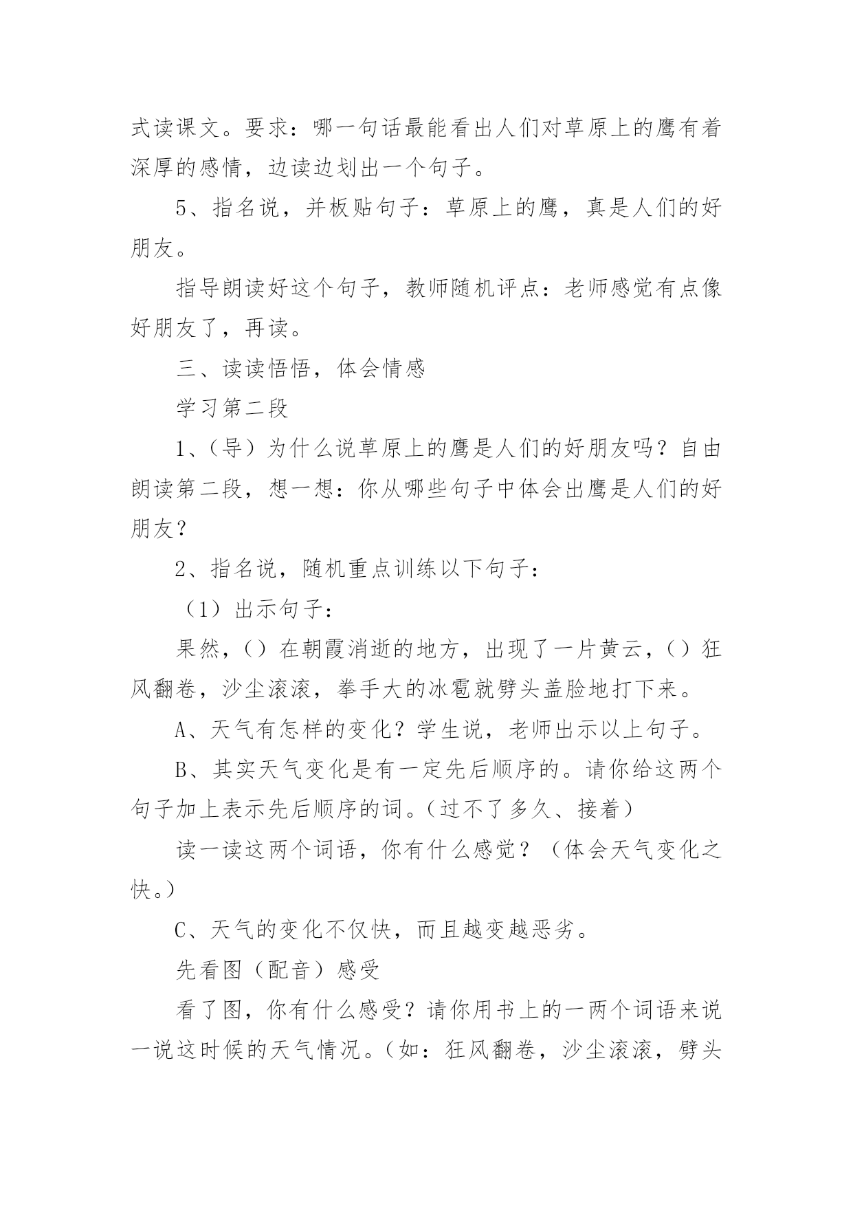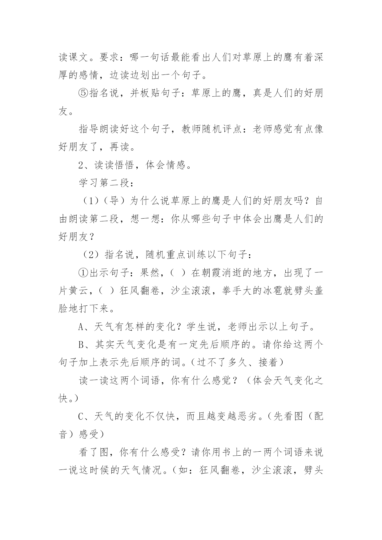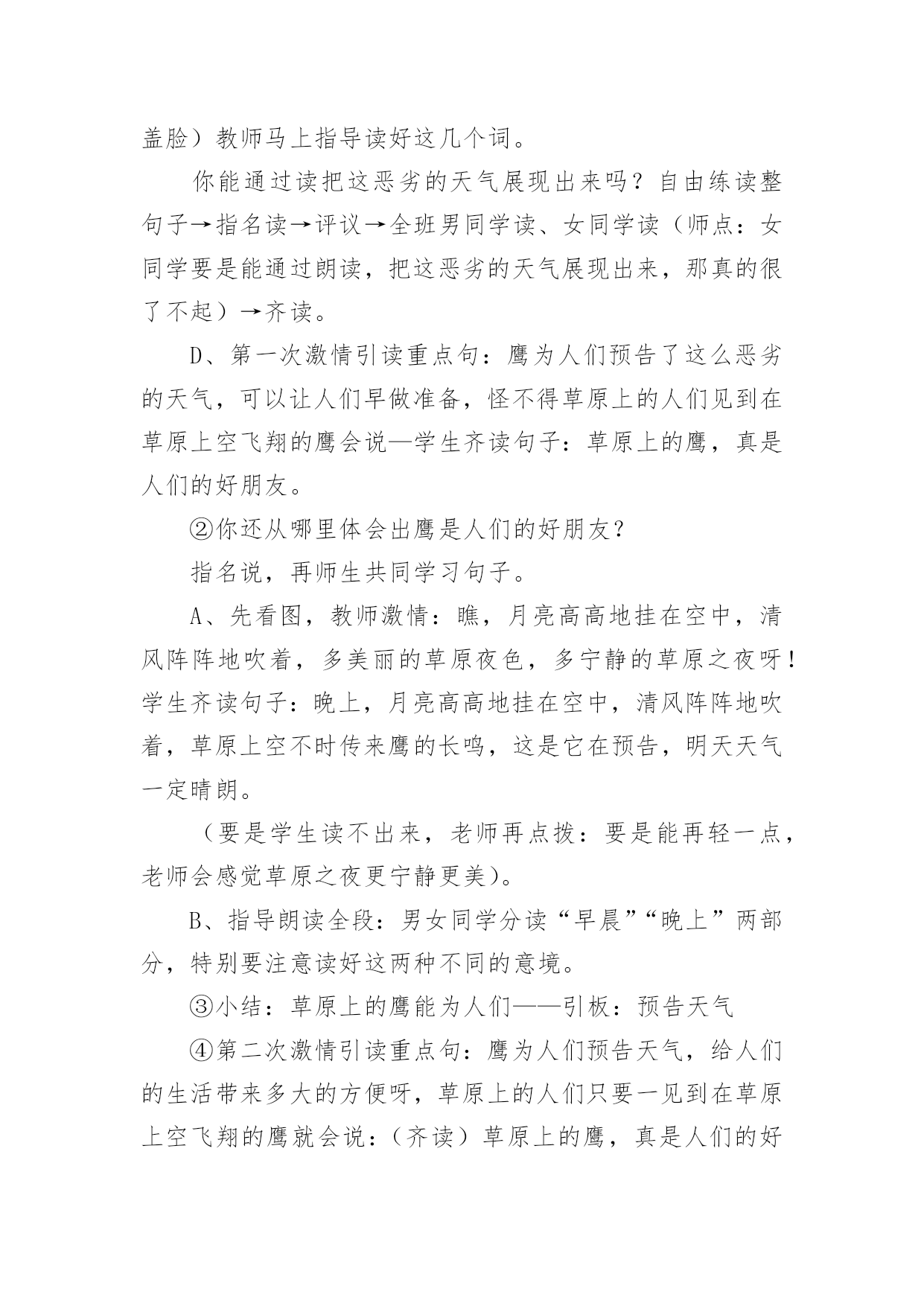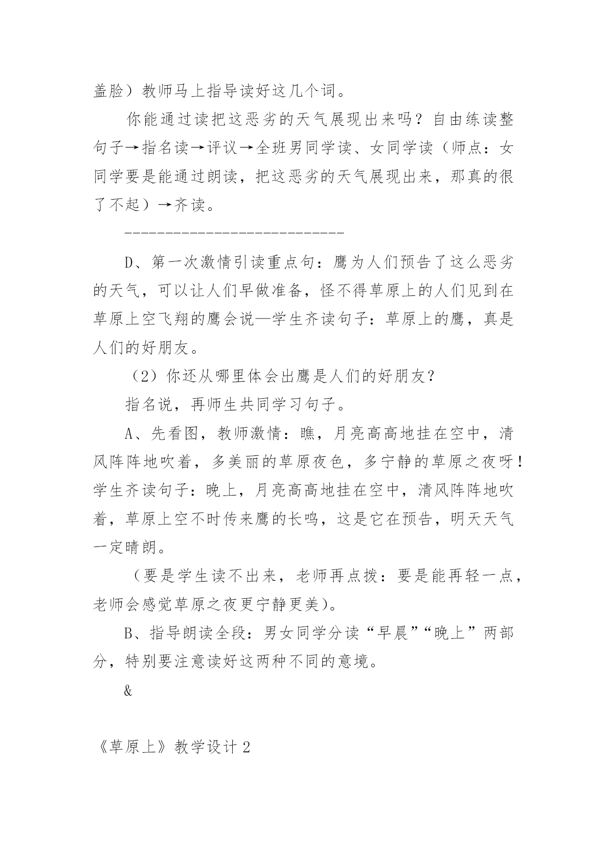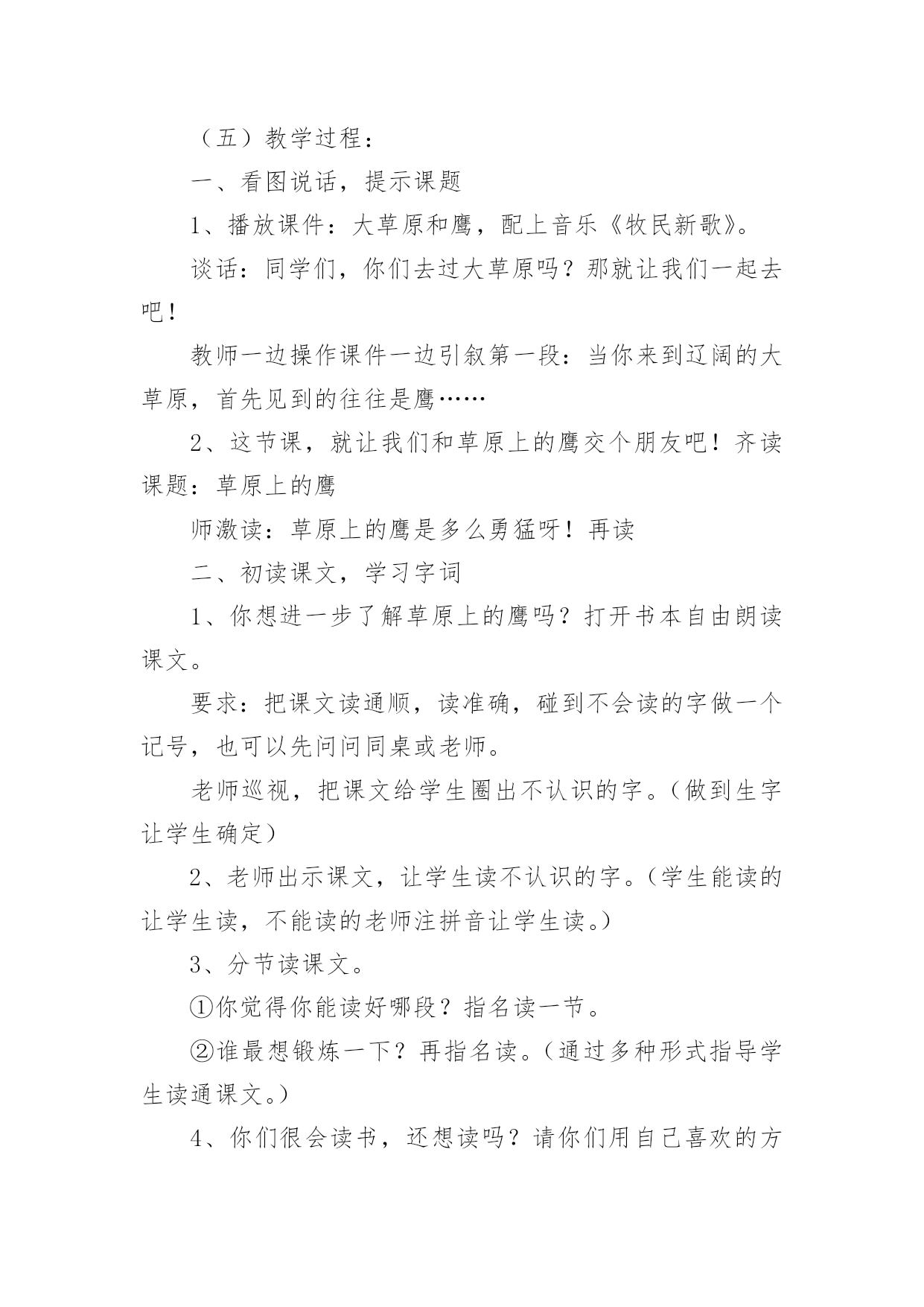 《草原上》教学设计《草原上》教学设计9篇在教学工作者开展教学活动前,总不可避免地需要编写教学设计,教学设计是把教学原理转化为教学材料和教学活动的计划。那么大家知道规范的教学设计是怎么写的吗?以下是小编为大家整理的《草原上》教学设计,欢迎阅读与收藏。《草原上》教学设计1(一)教学目标:1、读通课文,会读“旋、逝、尘、拳、雹、劈、卷、辽、阔、眺、潭”等生字,理解“狂风翻卷、沙尘滚滚、劈头盖脸”等词语。2、理解2、3两段,知道草原上的鹰能为人们做些什么事。3、体会草原上的鹰是人们的好朋友。(二)教学重难点:知道草原上的鹰能为人们报告天气、指明方向,从而体会鹰是人们的好朋友。(三)教法学法:多媒体辅助教学、读读悟悟、自主学习(四)课前准备:课件、课文重点句板贴卡片(五)教学过程:一、看图说话,提示课题1、播放课件:大草原和鹰,配上音乐《牧民新歌》。谈话:同学们,你们去过大草原吗?那就让我们一起去吧!教师一边操作课件一边引叙第一段:当你来到辽阔的大草原,首先见到的往往是鹰……2、这节课,就让我们和草原上的鹰交个朋友吧!齐读课题:草原上的鹰师激读:草原上的鹰是多么勇猛呀!再读二、初读课文,学习字词1、你想进一步了解草原上的鹰吗?打开书本自由朗读课文。要求:把课文读通顺,读准确,碰到不会读的字做一个记号,也可以先问问同桌或老师。老师巡视,把课文给学生圈出不认识的字。(做到生字让学生确定)2、老师出示课文,让学生读不认识的字。(学生能读的让学生读,不能读的老师注拼音让学生读。)3、分节读课文。①你觉得你能读好哪段?指名读一节。②谁最想锻炼一下?再指名读。(通过多种形式指导学生读通课文。)4、你们很会读书,还想读吗?请你们用自己喜欢的方式读课文。要求:哪一句话最能看出人们对草原上的鹰有着深厚的感情,边读边划出一个句子。5、指名说,并板贴句子:草原上的鹰,真是人们的好朋友。指导朗读好这个句子,教师随机评点:老师感觉有点像好朋友了,再读。三、读读悟悟,体会情感学习第二段1、(导)为什么说草原上的鹰是人们的好朋友吗?自由朗读第二段,想一想:你从哪些句子中体会出鹰是人们的好朋友?2、指名说,随机重点训练以下句子:(1)出示句子:果然,()在朝霞消逝的地方,出现了一片黄云,()狂风翻卷,沙尘滚滚,拳手大的冰雹就劈头盖脸地打下来。A、天气有怎样的变化?学生说,老师出示以上句子。B、其实天气变化是有一定先后顺序的。请你给这两个句子加上表示先后顺序的词。(过不了多久、接着)读一读这两个词语,你有什么感觉?(体会天气变化之快。)C、天气的变化不仅快,而且越变越恶劣。先看图(配音)感受看了图,你有什么感受?请你用书上的一两个词语来说一说这时候的天气情况。(如:狂风翻卷,沙尘滚滚,劈头盖脸)教师马上指导读好这几个词。你能通过读把这恶劣的天气展现出来吗?自由练读整句子→指名读→评议→全班男同学读、女同学读(师点:女同学要是能通过朗读,把这恶劣的天气展现出来,那真的很了不起)→齐读。---------------------------D、第一次激情引读重点句:鹰为人们预告了这么恶劣的天气,可以让人们早做准备,怪不得草原上的人们见到在草原上空飞翔的鹰会说—学生齐读句子:草原上的鹰,真是人们的好朋友。(2)你还从哪里体会出鹰是人们的好朋友?指名说,再师生共同学习句子。A、先看图,教师激情:瞧,月亮高高地挂在空中,清风阵阵地吹着,多美丽的草原夜色,多宁静的草原之夜呀!学生齐读句子:晚上,月亮高高地挂在空中,清风阵阵地吹着,草原上空不时传来鹰的长鸣,这是它在预告,明天天气一定晴朗。(要是学生读不出来,老师再点拨:要是能再轻一点,老师会感觉草原之夜更宁静更美)。B、指导朗读全段:男女同学分读“早晨”“晚上”两部分,特别要注意读好这两种不同的意境。&《草原上》教学设计2教学内容:1、学唱歌曲《草原上》2、表演歌曲《草原上》3、音乐知识:四分、二分音符4、选用内容:学习用竖笛演奏歌曲教学目标:一、学习用听视唱结合学习歌曲《草原上》,引导学生认真仔细地聆听音乐,初步感受内蒙古的民族民间音乐的民族风格。二、引导学生创编动作与师生互动的交流,学习以动作来表现体验自己的情感,背唱:《草原上》,并进行表演。三、引导学生在游戏中学习二分音符、四分音符。四、引导学生用竖笛演奏歌曲《草原上》增强学生学习音乐作品的兴趣,提高学生器乐的演奏能力。教学过程:一、常规练习1:随乐曲(自选乐曲)自编动作进室,(要求自创,有较规范动作要求。主要引导学生跟随音乐节拍或节奏)。2:复习前课内容:表演及唱。3:竖笛小练习。(结合学唱歌曲演奏so、la、mi三音进行练习)二:新课学习:1:导入:(谈话、多媒体出示内蒙古大草原和内蒙古人民的风土人情,并配以《草原上》伴奏音乐)教师介绍:在这一望无际的大草原上生活着一