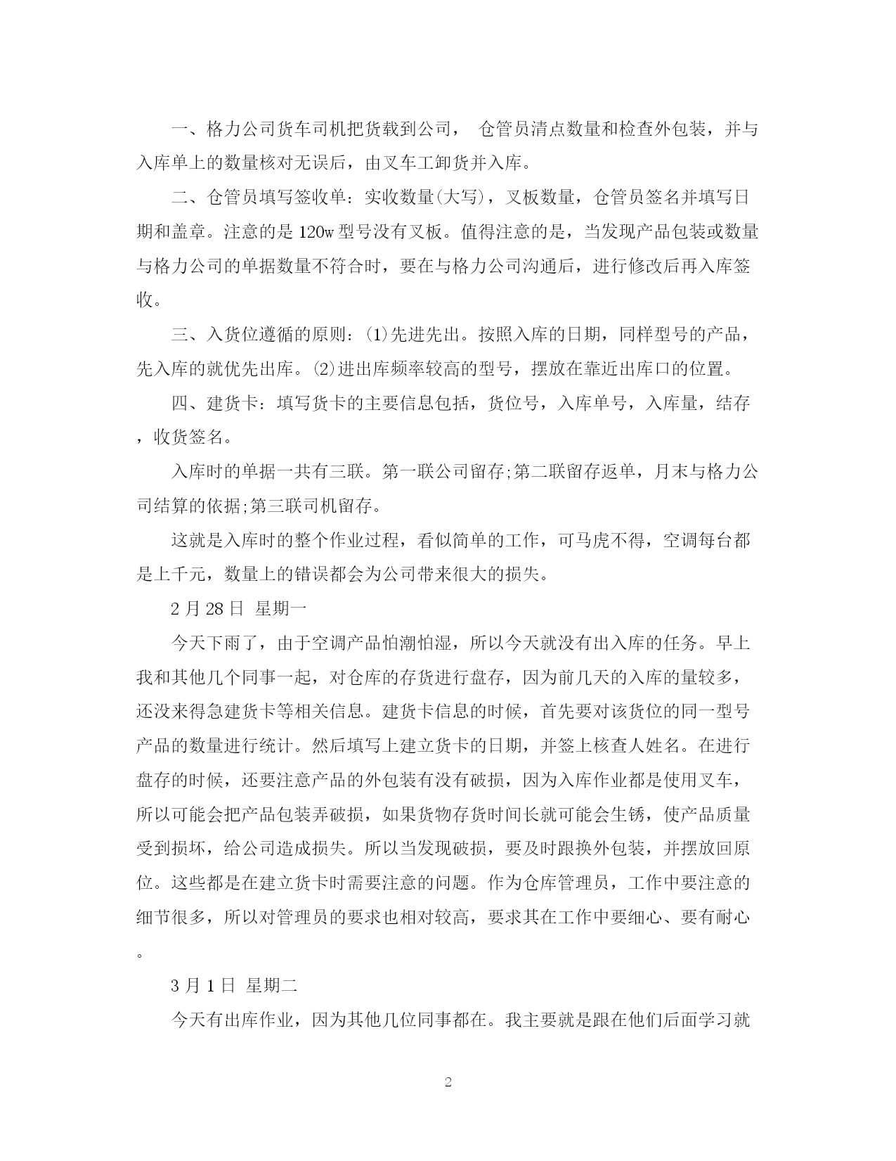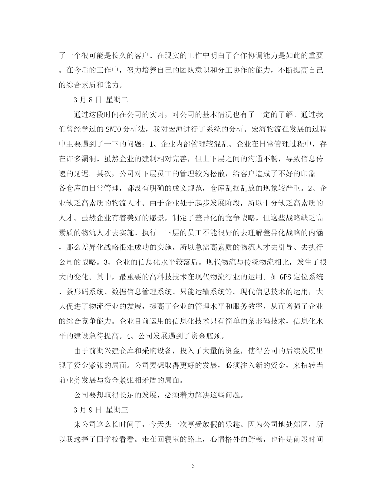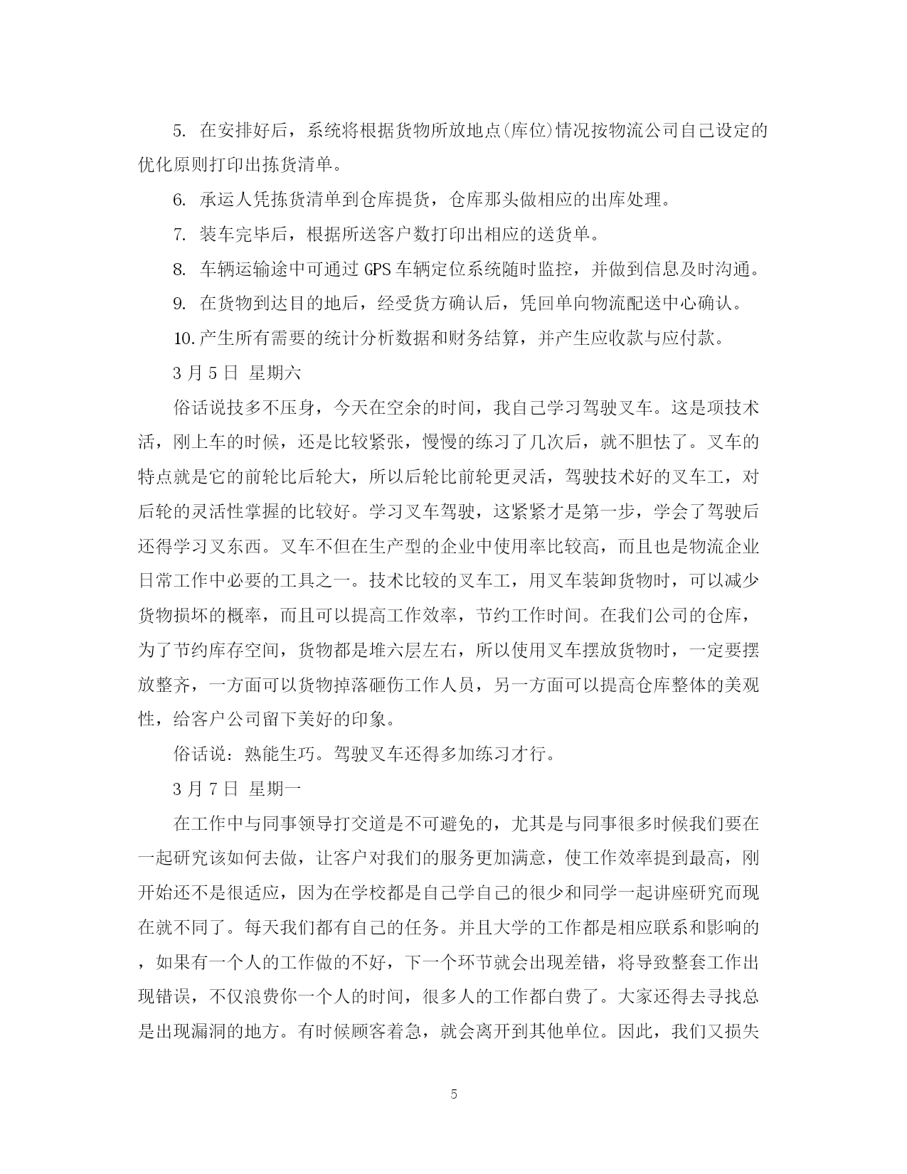 此资料由网络收集而来,如有侵权请告知上传者立即删除。资料共分享,我们负责传递知识。PAGEPAGE14物流管理专业公司实习日记2月24日星期四第一天正式上班,心里难免有些激动,因为我已经这是踏入工作岗位了,同时也有些紧张,担心自己的工作做不好。我告诉自己,没有谁在刚刚参加工作的时候,是一帆风顺的。工作中没有犯错误,说明你很优秀;工作中犯了错也不用害怕,在哪跌倒就要从哪爬起来,现在犯的错误是为了避免以后工作中出现同样类似的状况,这些都将是我们以后工作中宝贵的财富。早上起来,洗漱完我就开始打扫仓库的办公室。吃完早餐,杨总就给我介绍公司的一些具体情况,比如公司的规模,发展远景,企业文化等等。宏海物流(GrandseaLogistics)创建于2019年,同年并成立了国际货代公司。通过努力,公司已发展成以干线运输、城际配送、仓储装卸、铁路行包、航空运输、国际货代及物流方案策划为一体的综合性现代化物流企业。未来的宏海,将以客户需求为中心,完善基础管理;以技术专业化、服务差异化、平台规模化、经营精细化、共同为实现国内物流现代化、专业化并跻身于国内行列,实现宏海人“以心传递,物通天下”的承诺。企业宗旨:以客户为中心,服务于客户、满足于客户;业精神:团队合作、努力拼搏、积极创新、追求卓越;企业目标:创世界级物流品牌。虽然公司才刚刚起步,但公司对未来的定位很清晰,未来蓝图的规划很美好。只要在这样的公司里好好干,每个人都有机会去施展自己的拳脚的舞台!2月25日星期五从今天开始我就正式在宏海物流公司的格力外库实习,格力外库坐落在高新区格力工业园旁,格力外库就是作为格力的独立仓库。仓库的日常管理和出入库作业都由宏海物流公司负责,仓库的产品全部是格力的空调。今天没有出入库作业,我的主要工作内容就是尽快熟悉仓库的产品型号。2月26日星期六这两天都没什么业务,杨总让我学习下公司的入库作业的一些流程,明天再学习出库流程。入库的主要流程如下:一、格力公司货车司机把货载到公司,仓管员清点数量和检查外包装,并与入库单上的数量核对无误后,由叉车工卸货并入库。二、仓管员填写签收单:实收数量(大写),叉板数量,仓管员签名并填写日期和盖章。注意的是120w型号没有叉板。值得注意的是,当发现产品包装或数量与格力公司的单据数量不符合时,要在与格力公司沟通后,进行修改后再入库签收。三、入货位遵循的原则:(1)先进先出。按照入库的日期,同样型号的产品,先入库的就优先出库。(2)进出库频率较高的型号,摆放在靠近出库口的位置。四、建货卡:填写货卡的主要信息包括,货位号,入库单号,入库量,结存,收货签名。入库时的单据一共有三联。第一联公司留存;第二联留存返单,月末与格力公司结算的依据;第三联司机留存。这就是入库时的整个作业过程,看似简单的工作,可马虎不得,空调每台都是上千元,数量上的错误都会为公司带来很大的损失。2月28日星期一今天下雨了,由于空调产品怕潮怕湿,所以今天就没有出入库的任务。早上我和其他几个同事一起,对仓库的存货进行盘存,因为前几天的入库的量较多,还没来得急建货卡等相关信息。建货卡信息的时候,首先要对该货位的同一型号产品的数量进行统计。然后填写上建立货卡的日期,并签上核查人姓名。在进行盘存的时候,还要注意产品的外包装有没有破损,因为入库作业都是使用叉车,所以可能会把产品包装弄破损,如果货物存货时间长就可能会生锈,使产品质量受到损坏,给公司造成损失。所以当发现破损,要及时跟换外包装,并摆放回原位。这些都是在建立货卡时需要注意的问题。作为仓库管理员,工作中要注意的细节很多,所以对管理员的要求也相对较高,要求其在工作中要细心、要有耐心。3月1日星期二今天有出库作业,因为其他几位同事都在。我主要就是跟在他们后面学习就可以了。出库的主要流程就是:1.司机带着提货单来仓管员处提货,仓管员首先要看提货单上的发货仓库是不是本仓库,核对车牌号码。2.叉车工将产品装到仓库外,管理员扫码后人工装车。需要注意的地方:(1)对每托盘扫码结束后,要看看扫码器上的数字是否正确,防止漏扫。(2)装车的时候,先装外机后装内机,如果有柜机,先装柜机。3.签单:签收的数量、签收人、发货日期、盖章。其中第一联要求司机签字,第三联给装卸队。第一、四联仓库留存。4.每次发货结束后,要对仓库的库存情况要盘点,并修改货卡上的数据。值得注意的就是,扫码的人员一定要细心,不能漏扫。漏扫了就会给公司的服务质量带来损失。所以工作人员在工作的同时,也在对外展示公司的服务态度和服务质量。3月2日星期三早上吃完早饭,就有车来提货。在做好准备工作后,我们就开始出货。今天主要我来办理相关的手续及扫码工作,心里难免有点紧张,不过有同事在我旁边指导,心里放松了许多。提货单