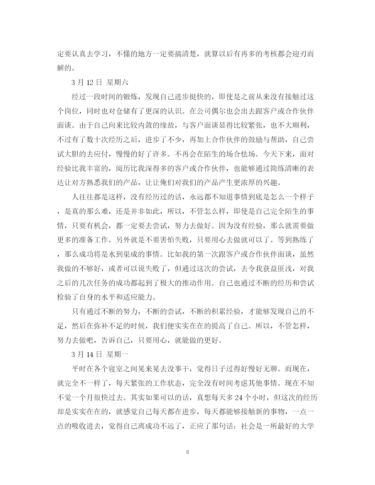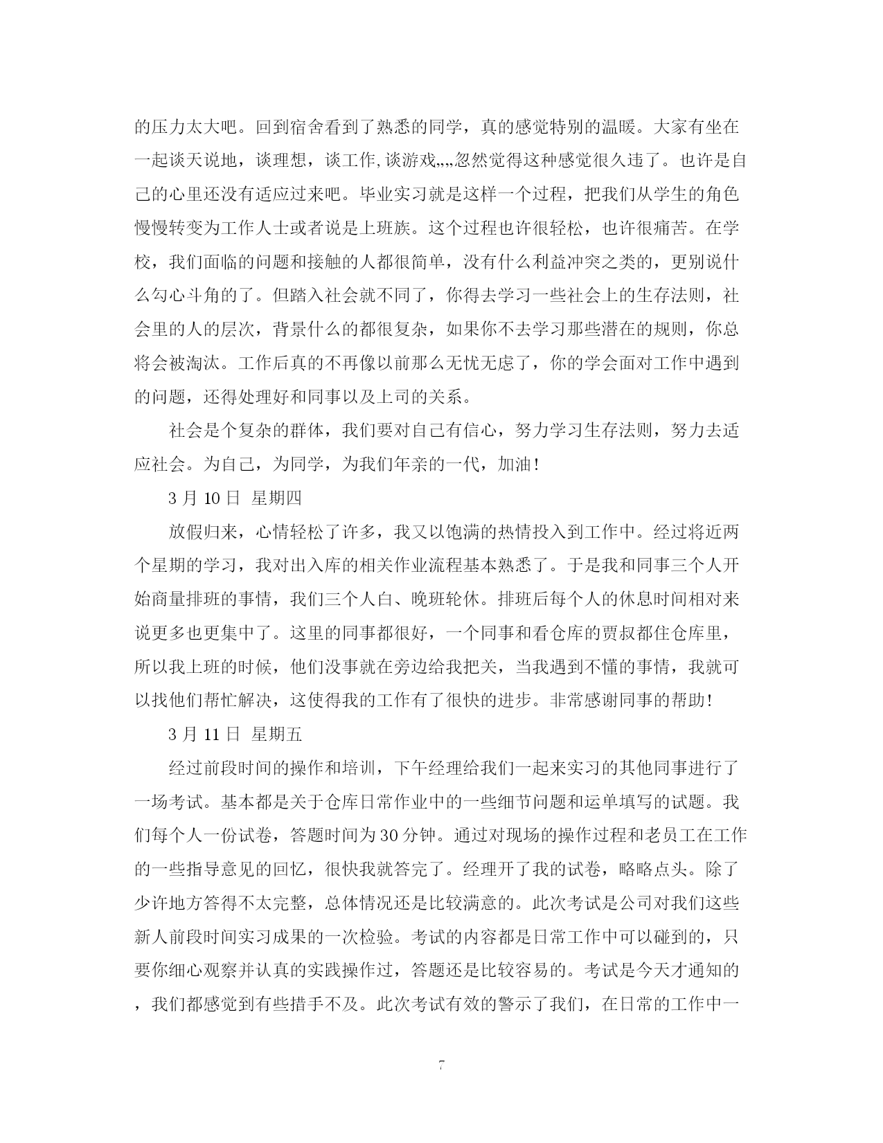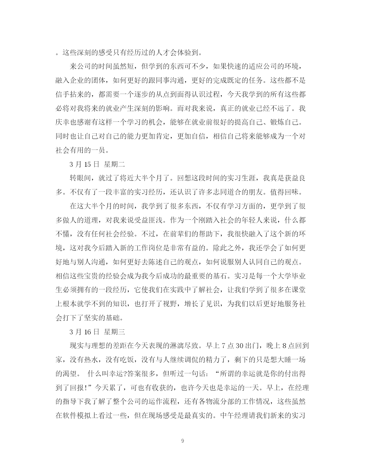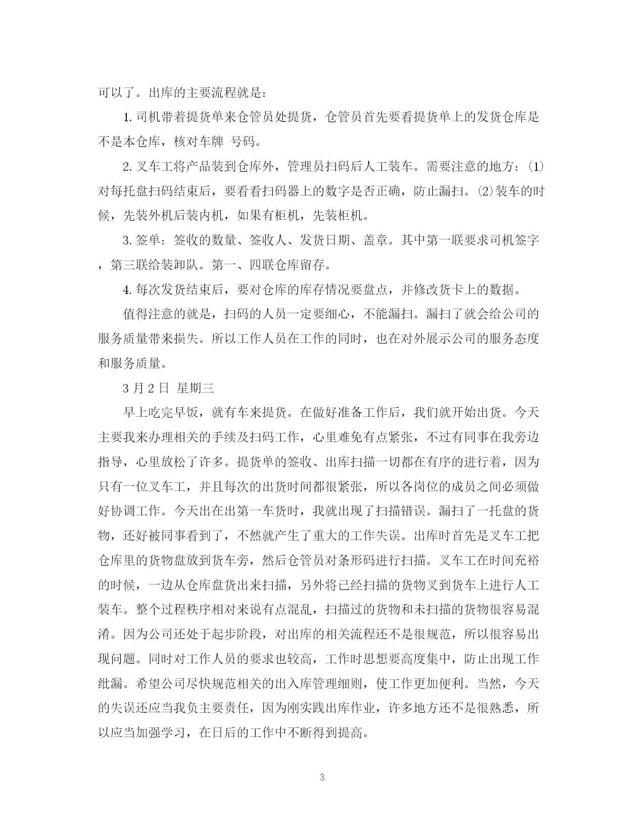 此资料由网络收集而来,如有侵权请告知上传者立即删除。资料共分享,我们负责传递知识。PAGEPAGE14物流管理专业公司实习日记2月24日星期四第一天正式上班,心里难免有些激动,因为我已经这是踏入工作岗位了,同时也有些紧张,担心自己的工作做不好。我告诉自己,没有谁在刚刚参加工作的时候,是一帆风顺的。工作中没有犯错误,说明你很优秀;工作中犯了错也不用害怕,在哪跌倒就要从哪爬起来,现在犯的错误是为了避免以后工作中出现同样类似的状况,这些都将是我们以后工作中宝贵的财富。早上起来,洗漱完我就开始打扫仓库的办公室。吃完早餐,杨总就给我介绍公司的一些具体情况,比如公司的规模,发展远景,企业文化等等。宏海物流(GrandseaLogistics)创建于2019年,同年并成立了国际货代公司。通过努力,公司已发展成以干线运输、城际配送、仓储装卸、铁路行包、航空运输、国际货代及物流方案策划为一体的综合性现代化物流企业。未来的宏海,将以客户需求为中心,完善基础管理;以技术专业化、服务差异化、平台规模化、经营精细化、共同为实现国内物流现代化、专业化并跻身于国内行列,实现宏海人“以心传递,物通天下”的承诺。企业宗旨:以客户为中心,服务于客户、满足于客户;业精神:团队合作、努力拼搏、积极创新、追求卓越;企业目标:创世界级物流品牌。虽然公司才刚刚起步,但公司对未来的定位很清晰,未来蓝图的规划很美好。只要在这样的公司里好好干,每个人都有机会去施展自己的拳脚的舞台!2月25日星期五从今天开始我就正式在宏海物流公司的格力外库实习,格力外库坐落在高新区格力工业园旁,格力外库就是作为格力的独立仓库。仓库的日常管理和出入库作业都由宏海物流公司负责,仓库的产品全部是格力的空调。今天没有出入库作业,我的主要工作内容就是尽快熟悉仓库的产品型号。2月26日星期六这两天都没什么业务,杨总让我学习下公司的入库作业的一些流程,明天再学习出库流程。入库的主要流程如下:一、格力公司货车司机把货载到公司,仓管员清点数量和检查外包装,并与入库单上的数量核对无误后,由叉车工卸货并入库。二、仓管员填写签收单:实收数量(大写),叉板数量,仓管员签名并填写日期和盖章。注意的是120w型号没有叉板。值得注意的是,当发现产品包装或数量与格力公司的单据数量不符合时,要在与格力公司沟通后,进行修改后再入库签收。三、入货位遵循的原则:(1)先进先出。按照入库的日期,同样型号的产品,先入库的就优先出库。(2)进出库频率较高的型号,摆放在靠近出库口的位置。四、建货卡:填写货卡的主要信息包括,货位号,入库单号,入库量,结存,收货签名。入库时的单据一共有三联。第一联公司留存;第二联留存返单,月末与格力公司结算的依据;第三联司机留存。这就是入库时的整个作业过程,看似简单的工作,可马虎不得,空调每台都是上千元,数量上的错误都会为公司带来很大的损失。2月28日星期一今天下雨了,由于空调产品怕潮怕湿,所以今天就没有出入库的任务。早上我和其他几个同事一起,对仓库的存货进行盘存,因为前几天的入库的量较多,还没来得急建货卡等相关信息。建货卡信息的时候,首先要对该货位的同一型号产品的数量进行统计。然后填写上建立货卡的日期,并签上核查人姓名。在进行盘存的时候,还要注意产品的外包装有没有破损,因为入库作业都是使用叉车,所以可能会把产品包装弄破损,如果货物存货时间长就可能会生锈,使产品质量受到损坏,给公司造成损失。所以当发现破损,要及时跟换外包装,并摆放回原位。这些都是在建立货卡时需要注意的问题。作为仓库管理员,工作中要注意的细节很多,所以对管理员的要求也相对较高,要求其在工作中要细心、要有耐心。3月1日星期二今天有出库作业,因为其他几位同事都在。我主要就是跟在他们后面学习就可以了。出库的主要流程就是:1.司机带着提货单来仓管员处提货,仓管员首先要看提货单上的发货仓库是不是本仓库,核对车牌号码。2.叉车工将产品装到仓库外,管理员扫码后人工装车。需要注意的地方:(1)对每托盘扫码结束后,要看看扫码器上的数字是否正确,防止漏扫。(2)装车的时候,先装外机后装内机,如果有柜机,先装柜机。3.签单:签收的数量、签收人、发货日期、盖章。其中第一联要求司机签字,第三联给装卸队。第一、四联仓库留存。4.每次发货结束后,要对仓库的库存情况要盘点,并修改货卡上的数据。值得注意的就是,扫码的人员一定要细心,不能漏扫。漏扫了就会给公司的服务质量带来损失。所以工作人员在工作的同时,也在对外展示公司的服务态度和服务质量。3月2日星期三早上吃完早饭,就有车来提货。在做好准备工作后,我们就开始出货。今天主要我来办理相关的手续及扫码工作,心里难免有点紧张,不过有同事在我旁边指导,心里放松了许多。提货单
