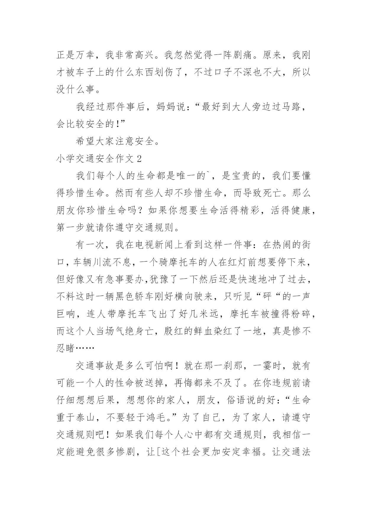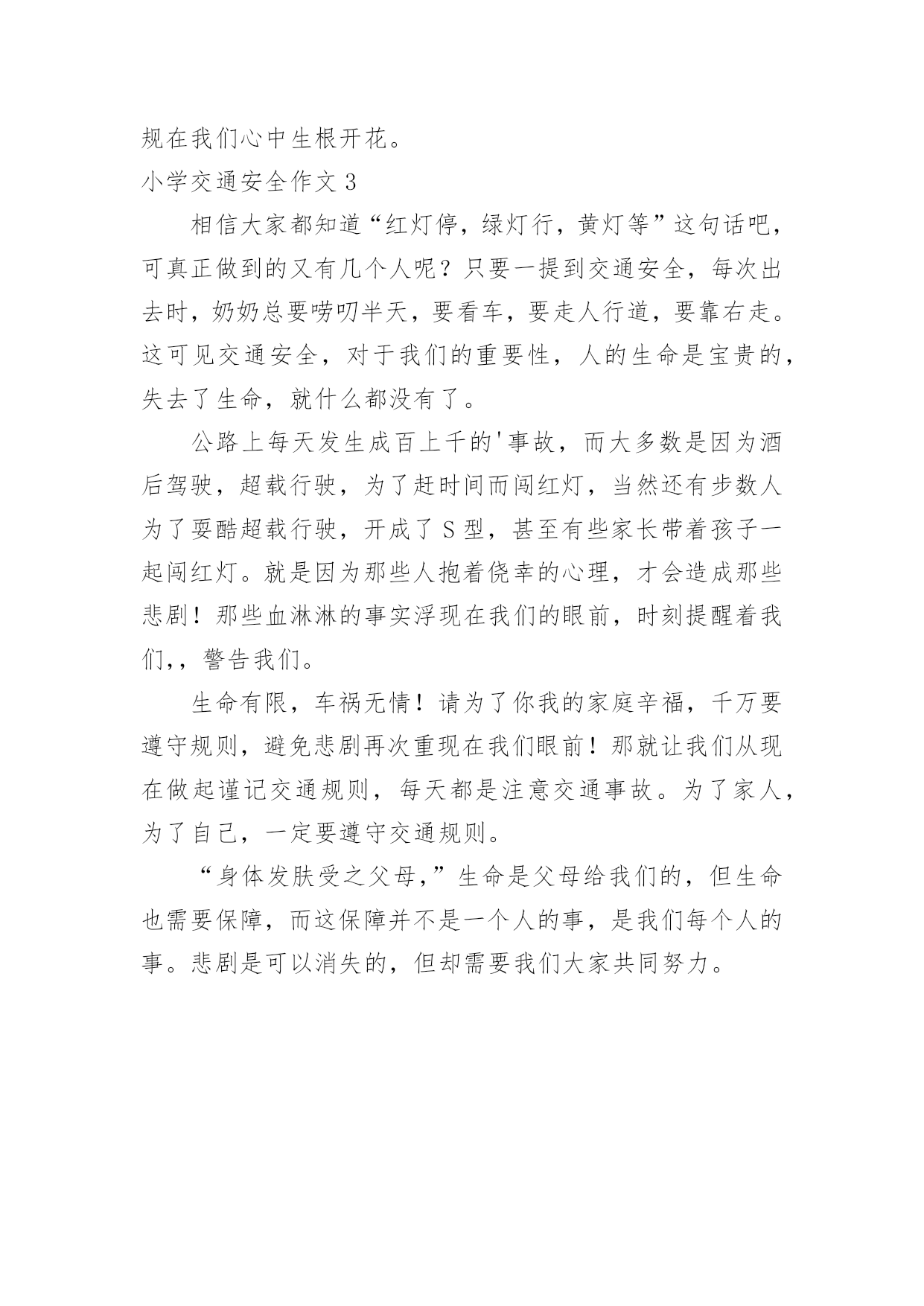 小学交通安全作文小学交通安全作文在平凡的学习、工作、生活中,大家都不可避免地会接触到作文吧,作文是人们以书面形式表情达意的言语活动。写起作文来就毫无头绪?下面是小编为大家整理的小学交通安全作文,仅供参考,欢迎大家阅读。小学交通安全作文1在生活中,我们都会听见大人对我们说一些交通安全警告,上学时,爸妈说:“一定要小心,不闯红灯!”放学时,老师说:“过马路走斑马线,注意安全!”在马路边,交警叔叔又说:“过马路,左右看,安全最重要!”我们在报纸上,网络上,电视中看到过许多交通事故的消息。有一些人,他们一点也不重视自己的安全,如闯红灯,在马路上看书、追赶打闹和听音乐,就这样,导致了车祸。也有人酒后驾车,超速,一边开车一边打电话,这也是车祸发生的原因之一。我曾经经历过一场很小很小的小车祸,前年夏天,当时是中午。我放学回家要经过一条马路,绿灯也刚亮起,我走上斑马线,左右不时看着。没想到,一辆闯红灯的'摩托车正“嘟—”向我驶来,上面的司机,手中拿着酒瓶,喝得醉醺醺的。我正要向前走几步,被这突如其来的事情惊呆了!我惊的时候,一位阿姨马上抱住我往后跑。车子正好驶过来,正是万幸,我非常高兴。我忽然觉得一阵剧痛。原来,我刚才被车子上的什么东西划伤了,不过口子不深也不大,所以没什么事。我经过那件事后,妈妈说:“最好到大人旁边过马路,会比较安全的!”希望大家注意安全。小学交通安全作文2我们每个人的生命都是唯一的`,是宝贵的,我们要懂得珍惜生命。然而有些人却不珍惜生命,而导致死亡。那么朋友你珍惜生命吗?如果你想要生命活得精彩,活得健康,第一步就请你遵守交通规则。有一次,我在电视新闻上看到这样一件事:在热闹的街口,车辆川流不息,一个骑摩托车的人在红灯前想要停下来,但好像又有急事要办,犹豫了一下然后还是快速地冲了过去,不料这时一辆黑色轿车刚好横向驶来,只听见“砰“的一声巨响,连人带摩托车飞出了好几米远,摩托车被撞得粉碎,而这个人当场气绝身亡,殷红的鲜血染红了一地,真是惨不忍睹……交通事故是多么可怕啊!就在那一刹那,一霎时,就有可能一个人的性命被送掉,再悔都来不及了。在你违规前请仔细想想后果,想想你的家人,朋友,俗语说的好:“生命重于泰山,不要轻于鸿毛。”为了自己,为了家人,请遵守交通规则吧!如果我们每个人心中都有交通规则,我相信一定能避免很多惨剧,让[这个社会更加安定幸福。让交通法规在我们心中生根开花。小学交通安全作文3相信大家都知道“红灯停,绿灯行,黄灯等”这句话吧,可真正做到的又有几个人呢?只要一提到交通安全,每次出去时,奶奶总要唠叨半天,要看车,要走人行道,要靠右走。这可见交通安全,对于我们的重要性,人的生命是宝贵的,失去了生命,就什么都没有了。公路上每天发生成百上千的'事故,而大多数是因为酒后驾驶,超载行驶,为了赶时间而闯红灯,当然还有步数人为了耍酷超载行驶,开成了S型,甚至有些家长带着孩子一起闯红灯。就是因为那些人抱着侥幸的心理,才会造成那些悲剧!那些血淋淋的事实浮现在我们的眼前,时刻提醒着我们,,警告我们。生命有限,车祸无情!请为了你我的家庭辛福,千万要遵守规则,避免悲剧再次重现在我们眼前!那就让我们从现在做起谨记交通规则,每天都是注意交通事故。为了家人,为了自己,一定要遵守交通规则。“身体发肤受之父母,”生命是父母给我们的,但生命也需要保障,而这保障并不是一个人的事,是我们每个人的事。悲剧是可以消失的,但却需要我们大家共同努力。