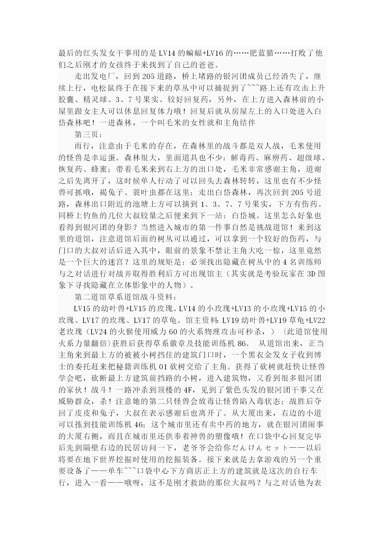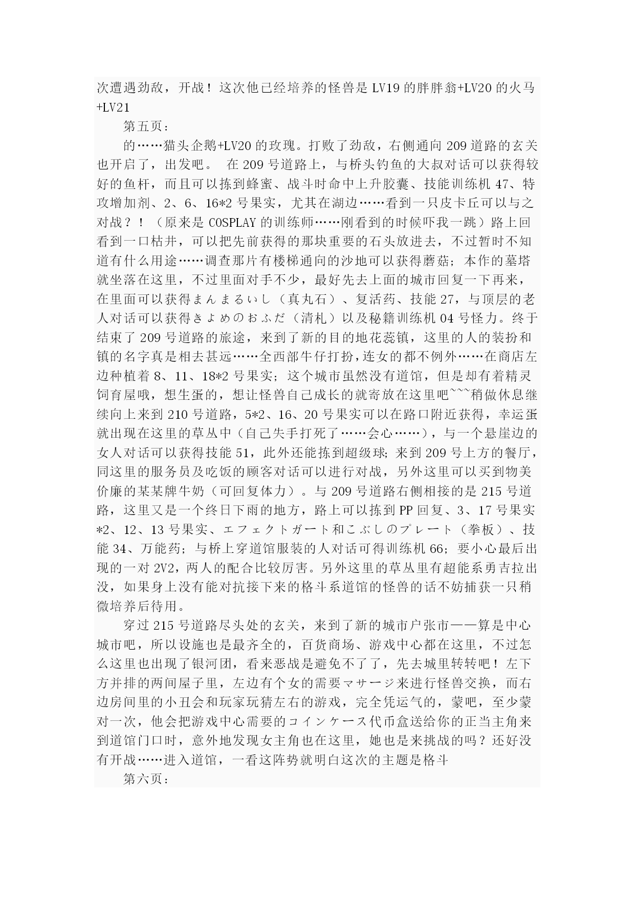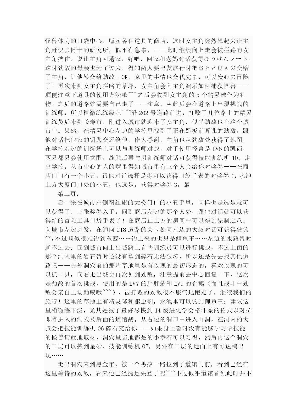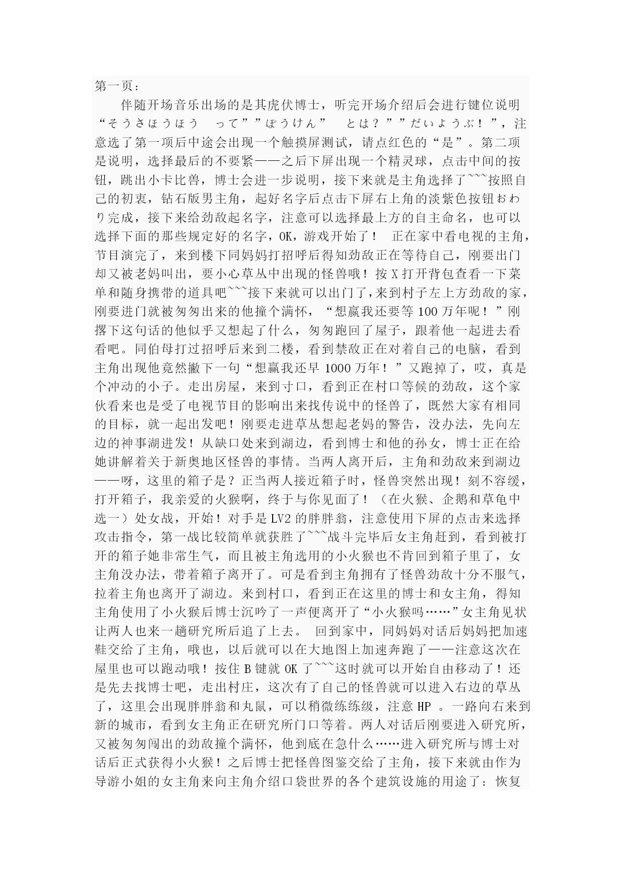 珍珠钻石(完整版)实用资料(可以直接使用,可编辑完整版实用资料,欢迎下载)第一页:伴随开场音乐出场的是其虎伏博士,听完开场介绍后会进行键位说明“そうさほうほうって””ぼうけん”とは?””だいようぶ!”,注意选了第一项后中途会出现一个触摸屏测试,请点红色的“是”。第二项是说明,选择最后的不要紧——之后下屏出现一个精灵球,点击中间的按钮,跳出小卡比兽,博士会进一步说明,接下来就是主角选择了~~~按照自己的初衷,钻石版男主角,起好名字后点击下屏右上角的淡紫色按钮おわり完成,接下来给劲敌起名字,注意可以选择最上方的自主命名,也可以选择下面的那些规定好的名字,OK,游戏开始了!正在家中看电视的主角,节目演完了,来到楼下同妈妈打招呼后得知劲敌正在等待自己,刚要出门却又被老妈叫出,要小心草丛中出现的怪兽哦!按X打开背包查看一下菜单和随身携带的道具吧~~~接下来就可以出门了,来到村子左上方劲敌的家,刚要进门就被匆匆出来的他撞个满怀,“想嬴我还要等100万年呢!”刚撂下这句话的他似乎又想起了什么,匆匆跑回了屋子,跟着他一起进去看看吧。同伯母打过招呼后来到二楼,看到禁敌正在对着自己的电脑,看到主角出现他竟然撇下一句“想赢我还早1000万年!”又跑掉了,哎,真是个冲动的小子。走出房屋,来到寸口,看到正在村口等候的劲敌,这个家伙看来也是受了电视节目的影响出来找传说中的怪兽了,既然大家有相同的目标,就一起出发吧!刚要走进草丛想起老妈的警告,没办法,先向左边的神事湖进发!从缺口处来到湖边,看到博士和他的孙女,博士正在给她讲解着关于新奥地区怪兽的事情。当两人离开后,主角和劲敌来到湖边——呀,这里的箱子是?正当两人接近箱子时,怪兽突然出现!刻不容缓,打开箱子,我亲爱的火猴啊,终于与你见面了!(在火猴、企鹅和草龟中选一)处女战,开始!对手是LV2的胖胖翁,注意使用下屏的点击来选择攻击指令,第一战比较简单就获胜了~~~战斗完毕后女主角赶到,看到被打开的箱子她非常生气,而且被主角选用的小火猴也不肯回到箱子里了,女主角没办法,带着箱子离开了。可是看到主角拥有了怪兽劲敌十分不服气,拉着主角也离开了湖边。来到村口,看到正在这里的博士和女主角,得知主角使用了小火猴后博士沉吟了一声便离开了“小火猴吗……”女主角见状让两人也来一趟研究所后追了上去。回到家中,同妈妈对话后妈妈把加速鞋交给了主角,哦也,以后就可以在大地图上加速奔跑了——注意这次在屋里也可以跑动哦!按住B键就OK了~~~这时就可以开始自由移动了!还是先去找博士吧,走出村庄,这次有了自己的怪兽就可以进入右边的草丛了,这里会出现胖胖翁和丸鼠,可以稍微练练级,注意HP。一路向右来到新的城市,看到女主角正在研究所门口等着。两人对话后刚要进入研究所,又被匆匆闯出的劲敌撞个满怀,他到底在急什么……进入研究所与博士对话后正式获得小火猴!之后博士把怪兽图鉴交给了主角,接下来就由作为导游小姐的女主角来向主角介绍口袋世界的各个建筑设施的用途了:恢复怪兽体力的口袋中心,贩卖各种道具的商店,这时女主角突然想起来让主角赶快去博士的研究所,似乎有急事,——此时继续向上走会被拦路的女主角挡住,说让主角回趟家,好吧,回家和老妈对话获得ぼうけんノート,这时劲敌的母亲也赶了过来,得知两人要出发旅行时把おとどけもの交给了主角,让他转交给劲敌。OK,家里的事情也交代完毕,可以安心去冒险了!再次来到女主角拦路的草坪,女主角会向主角演示如何捕获怪兽——顺便注意下道具的使用方法哦~~~之后会收到女主角的5个精灵球作为礼物。之后的道路就需要自己走了——注意,从此后会在道路上出现挑战的训练师,所以稍微练练级吧~~~沿202号道路前进,打败了几位路上的精灵训练员后来到长寿市,刚进入城市就迎来了女主角,似乎劲敌也在这个城市中。果然,在精灵中心左边的学校里找到了正在黑板前听课的劲敌,跟他对话把他家的钥匙交还给他,作为感谢,主角也从劲敌处获得了地图,在学校右边的训练场上可以与训练师对战,对手使用怪兽是LV6的凯西,两只都只会使用觉醒,战胜后再与男训练师对话可获得技能训练机10。走出学校,从市中心的人的嘴里得知城市里有三个人会给你对奖券——在商店门口有一个小丑,跟他对话选择是将可以获得口袋手表的对奖券1;水池上方大厦门口处的小丑,也选是,获得对奖券3,最第二页:后一张在城市左侧飘红旗的大楼门口的小丑手里,同样也是选是就可以获得了。三张奖券入手,回到商店左边的那个人处,跟他对话就可以获得新的冒险工具口袋手表了!在商店正上方的房间中可以得到先制之爪。向城市左边进发,在通向218道路的关卡处同左边的大叔对话可获得破钓竿,不过貌似很难钓到东西……钓上来的也只是鲤鱼王……左边的水路暂时通不过去;回到城市向上出城路上有些训练员可以进行挑战,不过上面的那个洞穴里的岩石暂时还没有