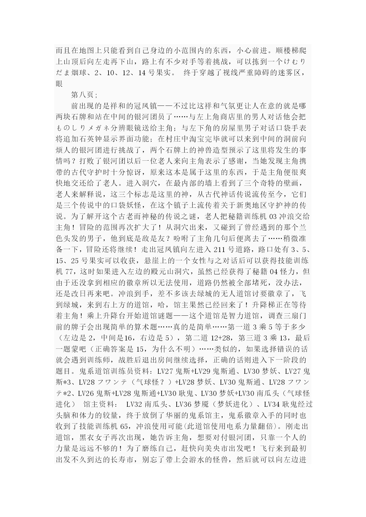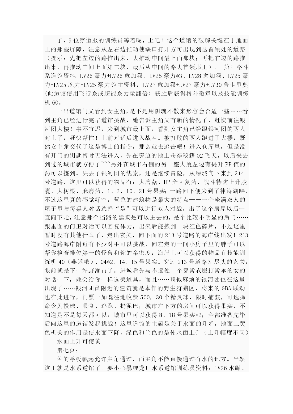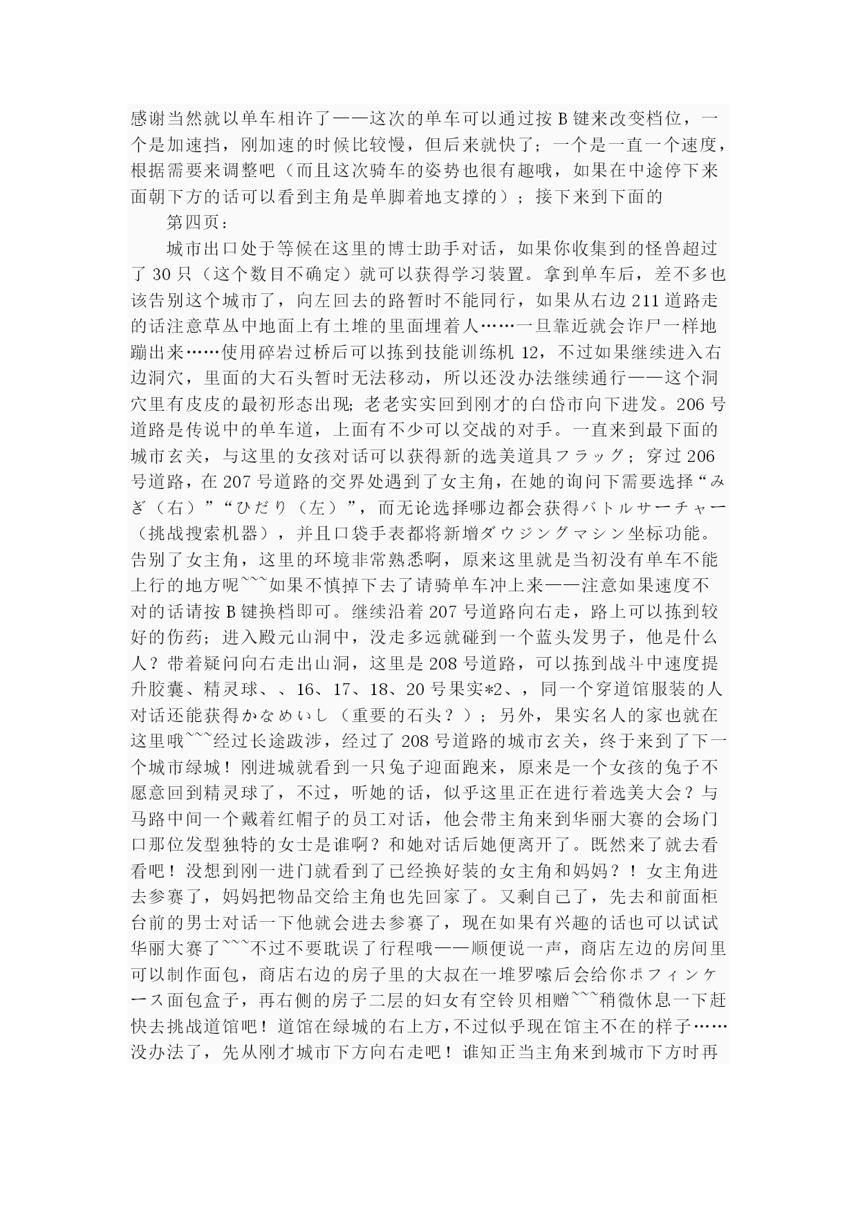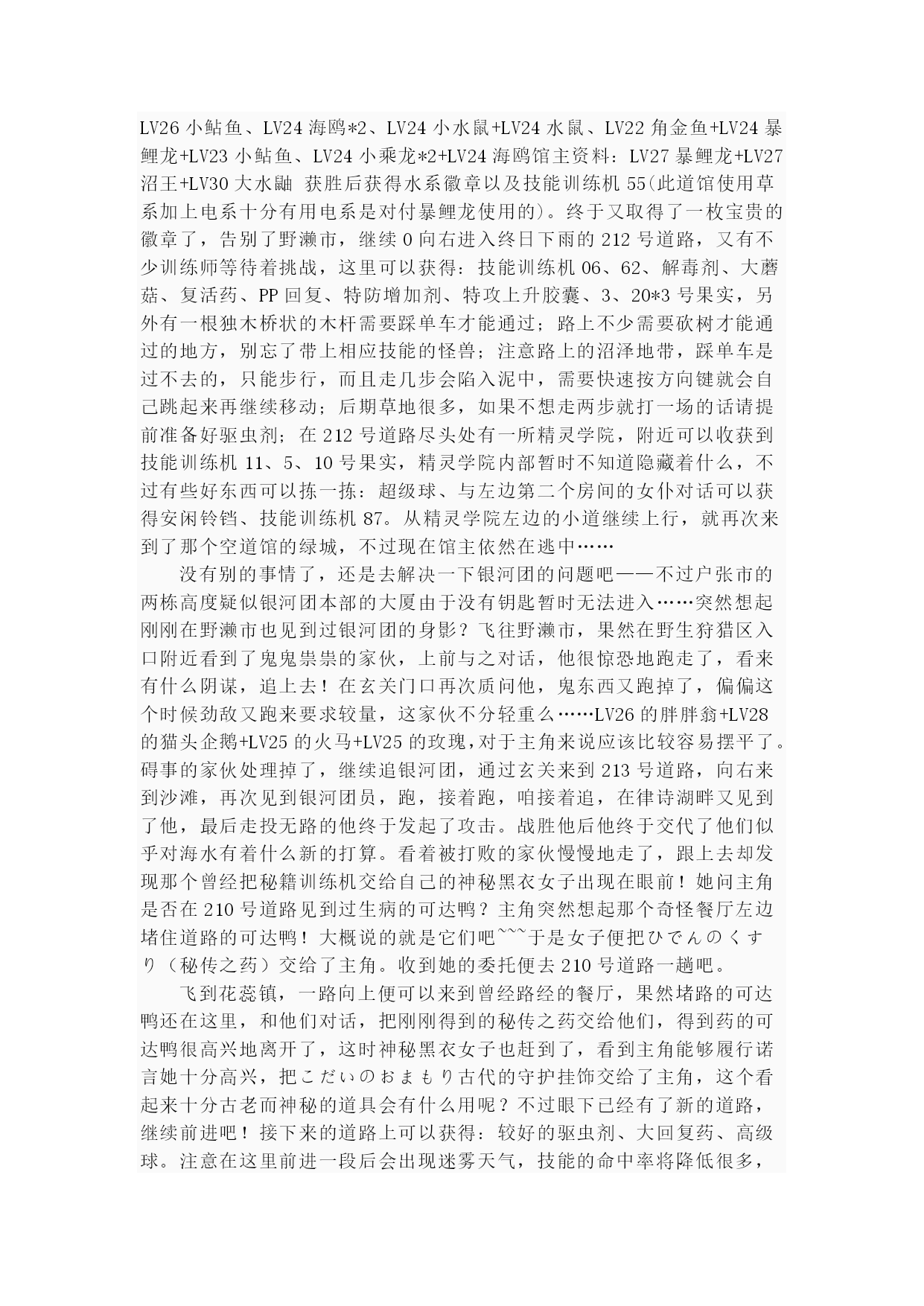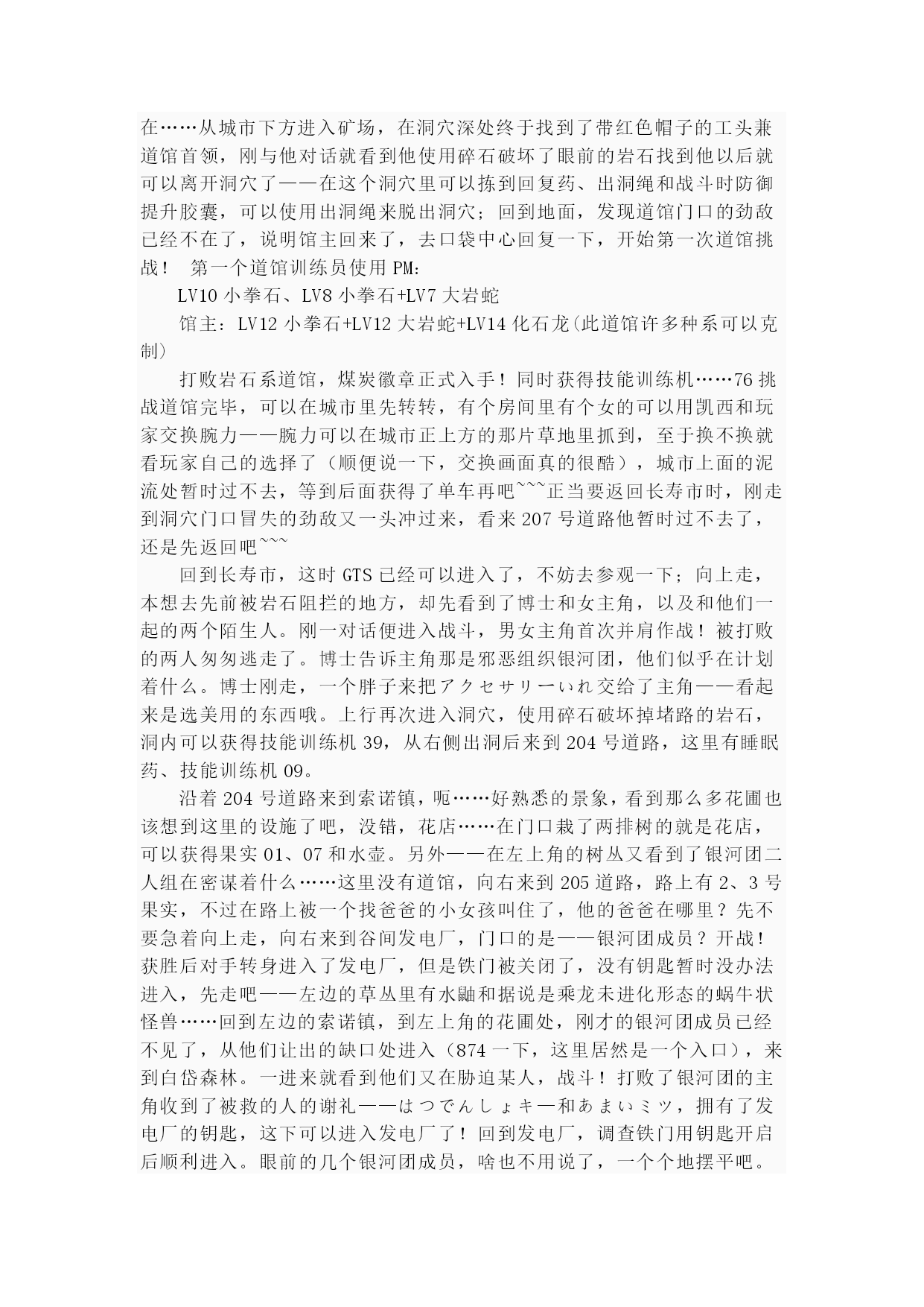 珍珠钻石(完整版)实用资料(可以直接使用,可编辑完整版实用资料,欢迎下载)第一页:伴随开场音乐出场的是其虎伏博士,听完开场介绍后会进行键位说明“そうさほうほうって””ぼうけん”とは?””だいようぶ!”,注意选了第一项后中途会出现一个触摸屏测试,请点红色的“是”。第二项是说明,选择最后的不要紧——之后下屏出现一个精灵球,点击中间的按钮,跳出小卡比兽,博士会进一步说明,接下来就是主角选择了~~~按照自己的初衷,钻石版男主角,起好名字后点击下屏右上角的淡紫色按钮おわり完成,接下来给劲敌起名字,注意可以选择最上方的自主命名,也可以选择下面的那些规定好的名字,OK,游戏开始了!正在家中看电视的主角,节目演完了,来到楼下同妈妈打招呼后得知劲敌正在等待自己,刚要出门却又被老妈叫出,要小心草丛中出现的怪兽哦!按X打开背包查看一下菜单和随身携带的道具吧~~~接下来就可以出门了,来到村子左上方劲敌的家,刚要进门就被匆匆出来的他撞个满怀,“想嬴我还要等100万年呢!”刚撂下这句话的他似乎又想起了什么,匆匆跑回了屋子,跟着他一起进去看看吧。同伯母打过招呼后来到二楼,看到禁敌正在对着自己的电脑,看到主角出现他竟然撇下一句“想赢我还早1000万年!”又跑掉了,哎,真是个冲动的小子。走出房屋,来到寸口,看到正在村口等候的劲敌,这个家伙看来也是受了电视节目的影响出来找传说中的怪兽了,既然大家有相同的目标,就一起出发吧!刚要走进草丛想起老妈的警告,没办法,先向左边的神事湖进发!从缺口处来到湖边,看到博士和他的孙女,博士正在给她讲解着关于新奥地区怪兽的事情。当两人离开后,主角和劲敌来到湖边——呀,这里的箱子是?正当两人接近箱子时,怪兽突然出现!刻不容缓,打开箱子,我亲爱的火猴啊,终于与你见面了!(在火猴、企鹅和草龟中选一)处女战,开始!对手是LV2的胖胖翁,注意使用下屏的点击来选择攻击指令,第一战比较简单就获胜了~~~战斗完毕后女主角赶到,看到被打开的箱子她非常生气,而且被主角选用的小火猴也不肯回到箱子里了,女主角没办法,带着箱子离开了。可是看到主角拥有了怪兽劲敌十分不服气,拉着主角也离开了湖边。来到村口,看到正在这里的博士和女主角,得知主角使用了小火猴后博士沉吟了一声便离开了“小火猴吗……”女主角见状让两人也来一趟研究所后追了上去。回到家中,同妈妈对话后妈妈把加速鞋交给了主角,哦也,以后就可以在大地图上加速奔跑了——注意这次在屋里也可以跑动哦!按住B键就OK了~~~这时就可以开始自由移动了!还是先去找博士吧,走出村庄,这次有了自己的怪兽就可以进入右边的草丛了,这里会出现胖胖翁和丸鼠,可以稍微练练级,注意HP。一路向右来到新的城市,看到女主角正在研究所门口等着。两人对话后刚要进入研究所,又被匆匆闯出的劲敌撞个满怀,他到底在急什么……进入研究所与博士对话后正式获得小火猴!之后博士把怪兽图鉴交给了主角,接下来就由作为导游小姐的女主角来向主角介绍口袋世界的各个建筑设施的用途了:恢复怪兽体力的口袋中心,贩卖各种道具的商店,这时女主角突然想起来让主角赶快去博士的研究所,似乎有急事,——此时继续向上走会被拦路的女主角挡住,说让主角回趟家,好吧,回家和老妈对话获得ぼうけんノート,这时劲敌的母亲也赶了过来,得知两人要出发旅行时把おとどけもの交给了主角,让他转交给劲敌。OK,家里的事情也交代完毕,可以安心去冒险了!再次来到女主角拦路的草坪,女主角会向主角演示如何捕获怪兽——顺便注意下道具的使用方法哦~~~之后会收到女主角的5个精灵球作为礼物。之后的道路就需要自己走了——注意,从此后会在道路上出现挑战的训练师,所以稍微练练级吧~~~沿202号道路前进,打败了几位路上的精灵训练员后来到长寿市,刚进入城市就迎来了女主角,似乎劲敌也在这个城市中。果然,在精灵中心左边的学校里找到了正在黑板前听课的劲敌,跟他对话把他家的钥匙交还给他,作为感谢,主角也从劲敌处获得了地图,在学校右边的训练场上可以与训练师对战,对手使用怪兽是LV6的凯西,两只都只会使用觉醒,战胜后再与男训练师对话可获得技能训练机10。走出学校,从市中心的人的嘴里得知城市里有三个人会给你对奖券——在商店门口有一个小丑,跟他对话选择是将可以获得口袋手表的对奖券1;水池上方大厦门口处的小丑,也选是,获得对奖券3,最第二页:后一张在城市左侧飘红旗的大楼门口的小丑手里,同样也是选是就可以获得了。三张奖券入手,回到商店左边的那个人处,跟他对话就可以获得新的冒险工具口袋手表了!在商店正上方的房间中可以得到先制之爪。向城市左边进发,在通向218道路的关卡处同左边的大叔对话可获得破钓竿,不过貌似很难钓到东西……钓上来的也只是鲤鱼王……左边的水路暂时通不过去;回到城市向上出城路上有些训练员可以进行挑战,不过上面的那个洞穴里的岩石暂时还没有