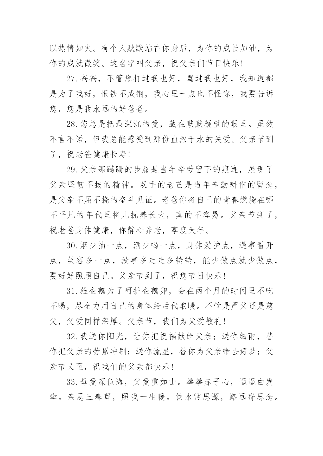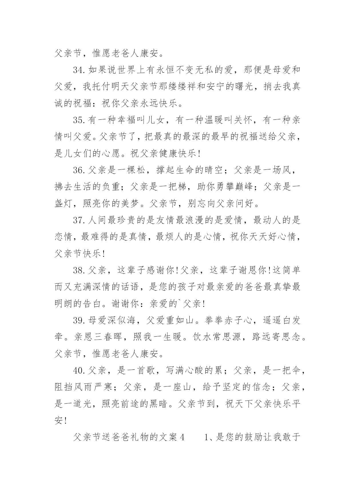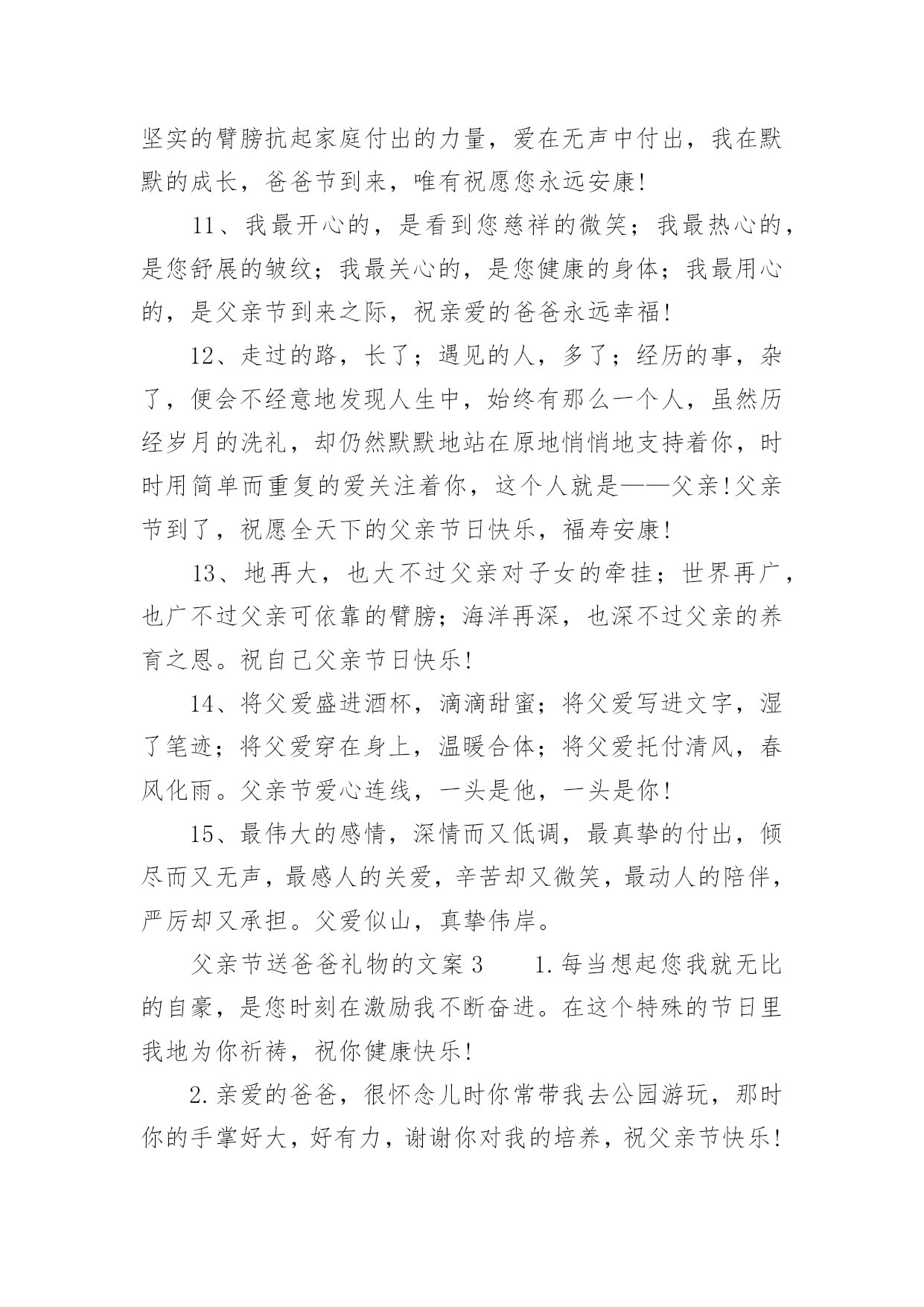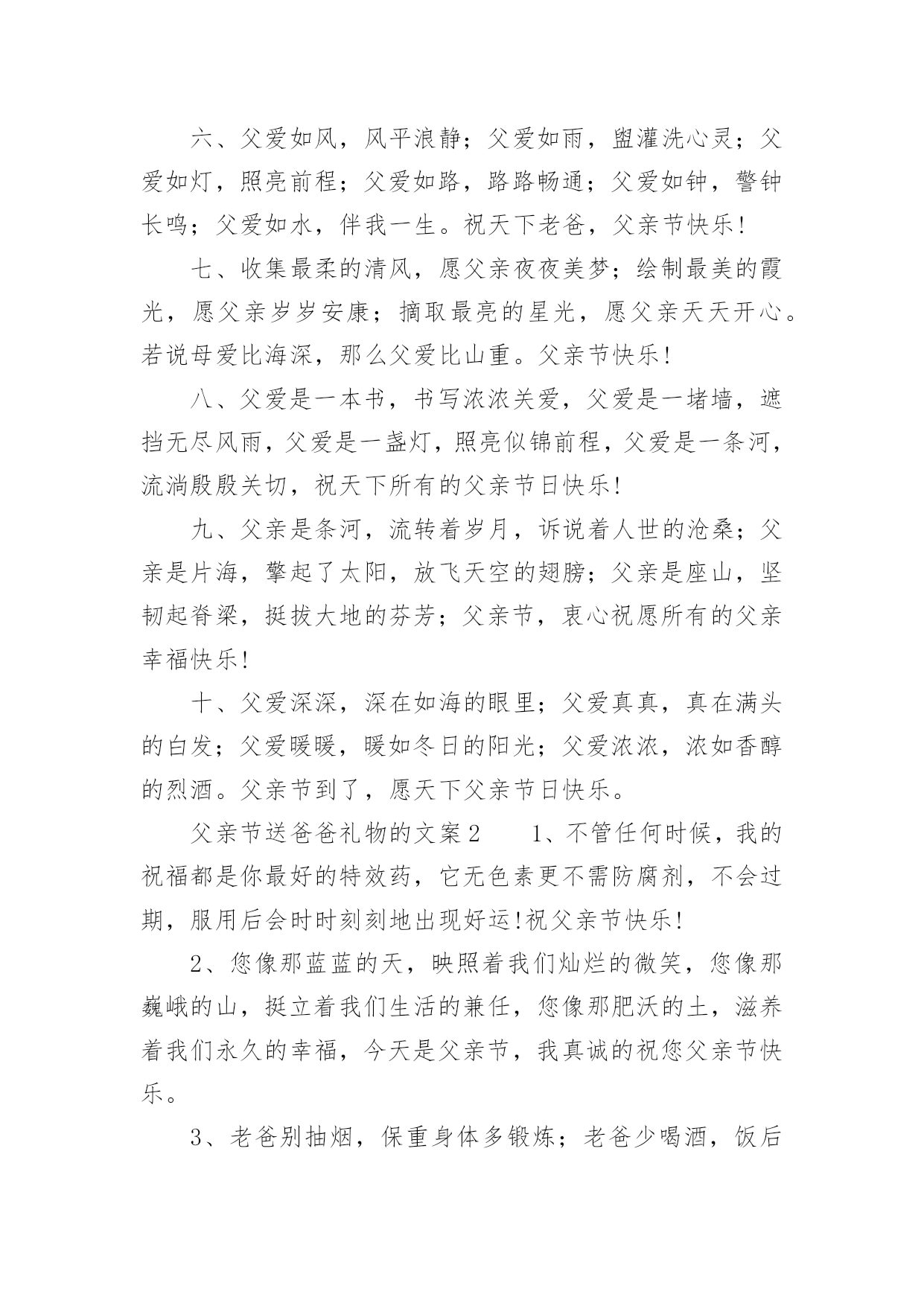 父亲节送爸爸礼物的文案父亲节送爸爸礼物的文案(精选125句)在学习、工作或生活中,越来越多人热衷于在网上发布文案,文案用于分享快乐,宣泄伤感。想发文案却总是不知道怎么组织语言?以下是小编收集整理的父亲节送爸爸礼物的文案(精选125句),供大家参考借鉴,希望可以帮助到有需要的朋友。父亲节送爸爸礼物的文案1一、父爱是山,不量距离;父爱是水,包容天地;父爱是风,没有承诺,却守候着雨;父爱是目光,炽炽如炬;父爱是深沉,只放在心里。祝天下父亲节日快乐!二、您用双手搭建心灵的小屋,您用臂膀撑起家庭的天空,您用慈爱筑起大爱的堤坝,您用辛劳创造幸福的传奇。父亲节,愿亲爱的爸爸身体健康,永远年轻!三、我是您最好的作品,延续着您的青春,感受着您的关爱,承载着您的期盼,快乐着您的心情。父亲节,我要自豪地说:老爸出品,必属精品。祝老爸节日快乐!四、亲爱的爸爸:岁月已将您的青春燃烧,但您的关怀和勉励将伴我信步风雨人生,用我心抚平你额上的皱纹,用我的情感染黑您头上的白发。祝您父亲节快乐!五、父亲的爱,如山川,高达雄峻;如阳光,温暖心灵;如江河,滔滔不绝;如溪流,沁润生活;如雨露,滴滴珍贵。父亲节,愿父亲健康长寿永不老,幸福快乐到永久!六、父爱如风,风平浪静;父爱如雨,盥灌洗心灵;父爱如灯,照亮前程;父爱如路,路路畅通;父爱如钟,警钟长鸣;父爱如水,伴我一生。祝天下老爸,父亲节快乐!七、收集最柔的清风,愿父亲夜夜美梦;绘制最美的霞光,愿父亲岁岁安康;摘取最亮的星光,愿父亲天天开心。若说母爱比海深,那么父爱比山重。父亲节快乐!八、父爱是一本书,书写浓浓关爱,父爱是一堵墙,遮挡无尽风雨,父爱是一盏灯,照亮似锦前程,父爱是一条河,流淌殷殷关切,祝天下所有的父亲节日快乐!九、父亲是条河,流转着岁月,诉说着人世的沧桑;父亲是片海,擎起了太阳,放飞天空的翅膀;父亲是座山,坚韧起脊梁,挺拔大地的芬芳;父亲节,衷心祝愿所有的父亲幸福快乐!十、父爱深深,深在如海的眼里;父爱真真,真在满头的白发;父爱暖暖,暖如冬日的阳光;父爱浓浓,浓如香醇的烈酒。父亲节到了,愿天下父亲节日快乐。父亲节送爸爸礼物的文案21、不管任何时候,我的祝福都是你最好的特效药,它无色素更不需防腐剂,不会过期,服用后会时时刻刻地出现好运!祝父亲节快乐!2、您像那蓝蓝的天,映照着我们灿烂的微笑,您像那巍峨的山,挺立着我们生活的兼任,您像那肥沃的土,滋养着我们永久的幸福,今天是父亲节,我真诚的祝您父亲节快乐。3、老爸别抽烟,保重身体多锻炼;老爸少喝酒,饭后逛逛百步走;老爸莫烦恼,豁达洒脱精神好;老爸莫劳累,健康开心最珍贵。老爸的教诲像一盏灯,为我照亮前程;老爸的关怀像一把伞,为我遮蔽风雨。今天是父亲节,老爸,祝你节日快乐!4、学走路时,您陪着我;写作业后,您检查着;犯错之时,您教育我;衣食住行,您供着我;长大之后,您挂念我;父亲节到,一声问候送给您,请你不用在牵挂我,祝您平安快乐着!5、您的身材并不魁梧,但您是我的山,给我依靠;您的思绪并不广阔,但您是我的翅,带我飞翔。谢谢您,亲爱的爸爸,父亲节快乐!6、不论你的父亲是严厉还是慈祥,不管你现在在他身旁还是远方,没有他爱护就没有你的成长,那么请祝福你父亲永远健康!7、跳动的音符响起,祝福的短信给您;悄悄说声我爱你,您的关怀我铭记;万千嘱咐随我意,父亲节日只为您:祝老爸身体康健,永远年轻。8、人生旅程中,是您带着我勇敢地面对生活,是您不尽的关怀,无限的关爱,伴我成长。父亲节来临之际,内心澎湃,只想大声对您说:我爱您!9、爸爸,今天是父亲节,这二十多年来,您为我付出的太多太多,我这辈子都是报答不完的,希望您每天都开开心心,健康平安。10、当你的青春逝去,当你的额头范光,我知道这是你坚实的臂膀抗起家庭付出的力量,爱在无声中付出,我在默默的成长,爸爸节到来,唯有祝愿您永远安康!11、我最开心的,是看到您慈祥的微笑;我最热心的,是您舒展的皱纹;我最关心的,是您健康的身体;我最用心的,是父亲节到来之际,祝亲爱的爸爸永远幸福!12、走过的路,长了;遇见的人,多了;经历的事,杂了,便会不经意地发现人生中,始终有那么一个人,虽然历经岁月的洗礼,却仍然默默地站在原地悄悄地支持着你,时时用简单而重复的爱关注着你,这个人就是——父亲!父亲节到了,祝愿全天下的父亲节日快乐,福寿安康!13、地再大,也大不过父亲对子女的牵挂;世界再广,也广不过父亲可依靠的臂膀;海洋再深,也深不过父亲的养育之恩。祝自己父亲节日快乐!14、将父爱盛进酒杯,滴滴甜蜜;将父爱写进文字,湿了笔迹;将父爱穿在身上,温暖合体;将父爱托付清风,春风化雨。父亲节爱心连线,一头是他,一头是你!15、最伟大的感情,深情而又低调,最真挚的付出,倾尽而又无声,最感人的关爱,辛苦却又微笑,最动人的陪伴,严厉却又承担。父爱似山,真挚伟