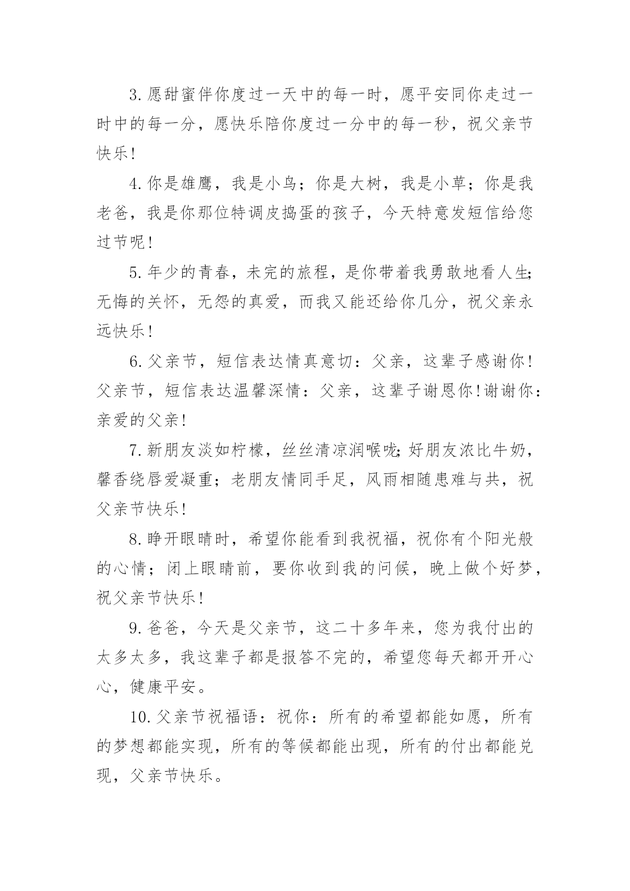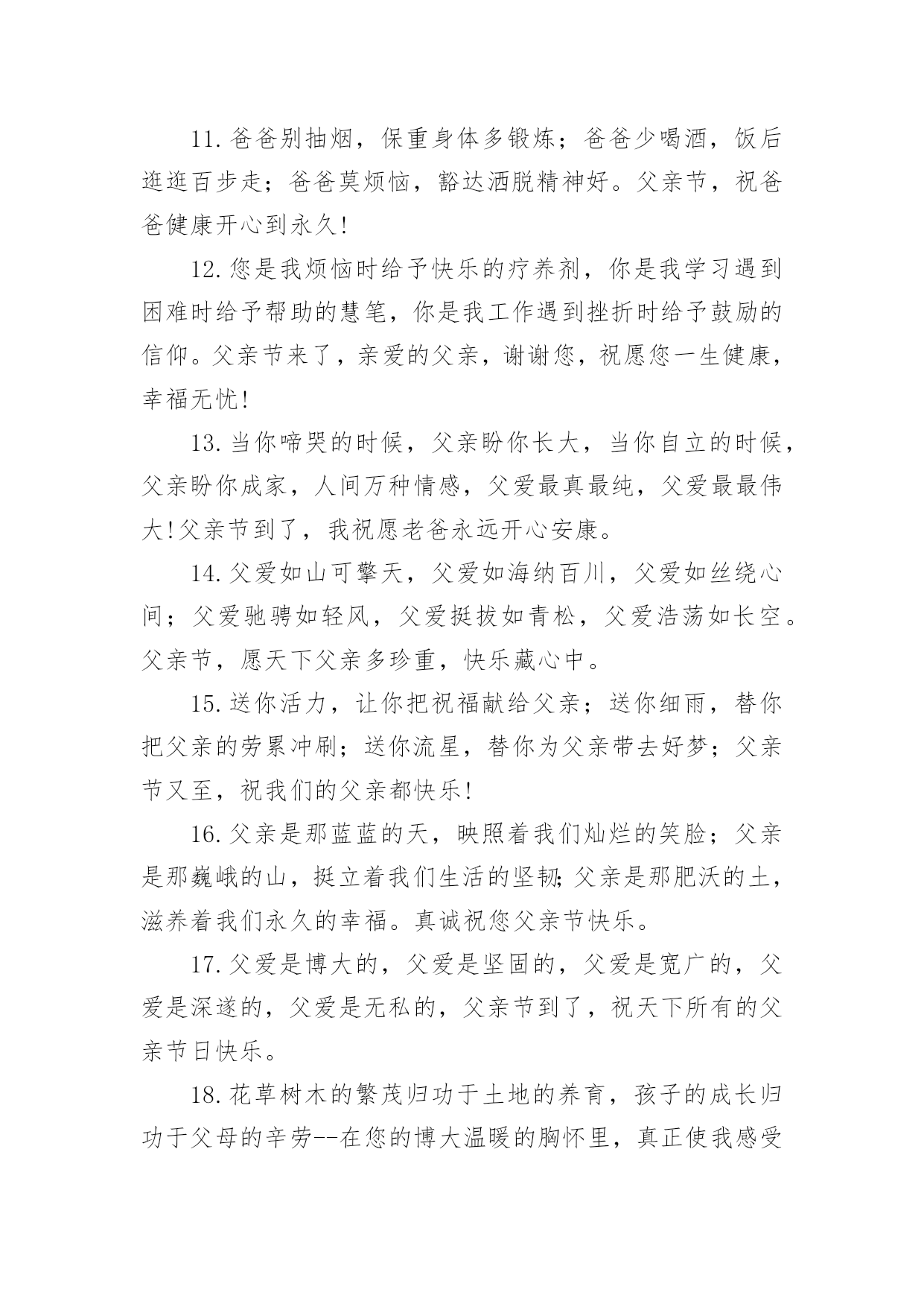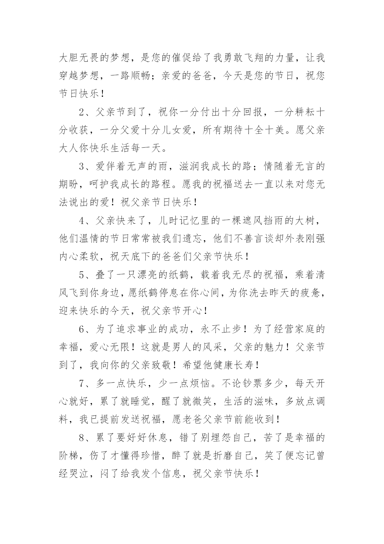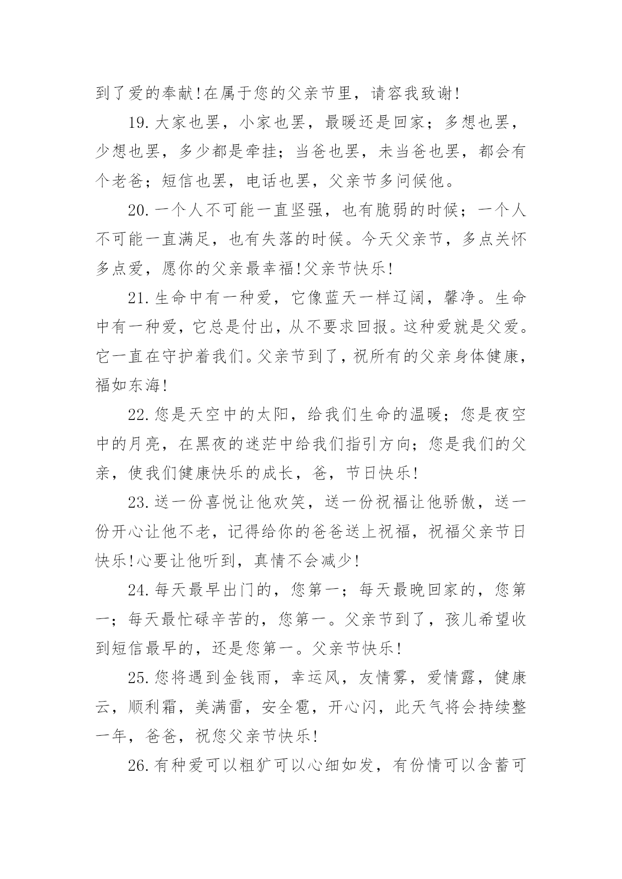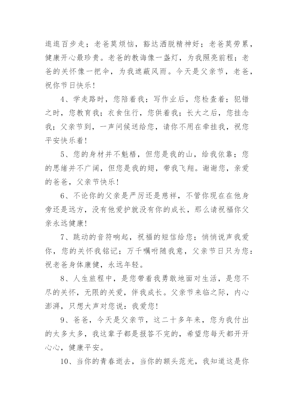父亲节送爸爸礼物的文案父亲节送爸爸礼物的文案(精选125句)在学习、工作或生活中,越来越多人热衷于在网上发布文案,文案用于分享快乐,宣泄伤感。想发文案却总是不知道怎么组织语言?以下是小编收集整理的父亲节送爸爸礼物的文案(精选125句),供大家参考借鉴,希望可以帮助到有需要的朋友。父亲节送爸爸礼物的文案1一、父爱是山,不量距离;父爱是水,包容天地;父爱是风,没有承诺,却守候着雨;父爱是目光,炽炽如炬;父爱是深沉,只放在心里。祝天下父亲节日快乐!二、您用双手搭建心灵的小屋,您用臂膀撑起家庭的天空,您用慈爱筑起大爱的堤坝,您用辛劳创造幸福的传奇。父亲节,愿亲爱的爸爸身体健康,永远年轻!三、我是您最好的作品,延续着您的青春,感受着您的关爱,承载着您的期盼,快乐着您的心情。父亲节,我要自豪地说:老爸出品,必属精品。祝老爸节日快乐!四、亲爱的爸爸:岁月已将您的青春燃烧,但您的关怀和勉励将伴我信步风雨人生,用我心抚平你额上的皱纹,用我的情感染黑您头上的白发。祝您父亲节快乐!五、父亲的爱,如山川,高达雄峻;如阳光,温暖心灵;如江河,滔滔不绝;如溪流,沁润生活;如雨露,滴滴珍贵。父亲节,愿父亲健康长寿永不老,幸福快乐到永久!六、父爱如风,风平浪静;父爱如雨,盥灌洗心灵;父爱如灯,照亮前程;父爱如路,路路畅通;父爱如钟,警钟长鸣;父爱如水,伴我一生。祝天下老爸,父亲节快乐!七、收集最柔的清风,愿父亲夜夜美梦;绘制最美的霞光,愿父亲岁岁安康;摘取最亮的星光,愿父亲天天开心。若说母爱比海深,那么父爱比山重。父亲节快乐!八、父爱是一本书,书写浓浓关爱,父爱是一堵墙,遮挡无尽风雨,父爱是一盏灯,照亮似锦前程,父爱是一条河,流淌殷殷关切,祝天下所有的父亲节日快乐!九、父亲是条河,流转着岁月,诉说着人世的沧桑;父亲是片海,擎起了太阳,放飞天空的翅膀;父亲是座山,坚韧起脊梁,挺拔大地的芬芳;父亲节,衷心祝愿所有的父亲幸福快乐!十、父爱深深,深在如海的眼里;父爱真真,真在满头的白发;父爱暖暖,暖如冬日的阳光;父爱浓浓,浓如香醇的烈酒。父亲节到了,愿天下父亲节日快乐。父亲节送爸爸礼物的文案21、不管任何时候,我的祝福都是你最好的特效药,它无色素更不需防腐剂,不会过期,服用后会时时刻刻地出现好运!祝父亲节快乐!2、您像那蓝蓝的天,映照着我们灿烂的微笑,您像那巍峨的山,挺立着我们生活的兼任,您像那肥沃的土,滋养着我们永久的幸福,今天是父亲节,我真诚的祝您父亲节快乐。3、老爸别抽烟,保重身体多锻炼;老爸少喝酒,饭后逛逛百步走;老爸莫烦恼,豁达洒脱精神好;老爸莫劳累,健康开心最珍贵。老爸的教诲像一盏灯,为我照亮前程;老爸的关怀像一把伞,为我遮蔽风雨。今天是父亲节,老爸,祝你节日快乐!4、学走路时,您陪着我;写作业后,您检查着;犯错之时,您教育我;衣食住行,您供着我;长大之后,您挂念我;父亲节到,一声问候送给您,请你不用在牵挂我,祝您平安快乐着!5、您的身材并不魁梧,但您是我的山,给我依靠;您的思绪并不广阔,但您是我的翅,带我飞翔。谢谢您,亲爱的爸爸,父亲节快乐!6、不论你的父亲是严厉还是慈祥,不管你现在在他身旁还是远方,没有他爱护就没有你的成长,那么请祝福你父亲永远健康!7、跳动的音符响起,祝福的短信给您;悄悄说声我爱你,您的关怀我铭记;万千嘱咐随我意,父亲节日只为您:祝老爸身体康健,永远年轻。8、人生旅程中,是您带着我勇敢地面对生活,是您不尽的关怀,无限的关爱,伴我成长。父亲节来临之际,内心澎湃,只想大声对您说:我爱您!9、爸爸,今天是父亲节,这二十多年来,您为我付出的太多太多,我这辈子都是报答不完的,希望您每天都开开心心,健康平安。10、当你的青春逝去,当你的额头范光,我知道这是你坚实的臂膀抗起家庭付出的力量,爱在无声中付出,我在默默的成长,爸爸节到来,唯有祝愿您永远安康!11、我最开心的,是看到您慈祥的微笑;我最热心的,是您舒展的皱纹;我最关心的,是您健康的身体;我最用心的,是父亲节到来之际,祝亲爱的爸爸永远幸福!12、走过的路,长了;遇见的人,多了;经历的事,杂了,便会不经意地发现人生中,始终有那么一个人,虽然历经岁月的洗礼,却仍然默默地站在原地悄悄地支持着你,时时用简单而重复的爱关注着你,这个人就是——父亲!父亲节到了,祝愿全天下的父亲节日快乐,福寿安康!13、地再大,也大不过父亲对子女的牵挂;世界再广,也广不过父亲可依靠的臂膀;海洋再深,也深不过父亲的养育之恩。祝自己父亲节日快乐!14、将父爱盛进酒杯,滴滴甜蜜;将父爱写进文字,湿了笔迹;将父爱穿在身上,温暖合体;将父爱托付清风,春风化雨。父亲节爱心连线,一头是他,一头是你!15、最伟大的感情,深情而又低调,最真挚的付出,倾尽而又无声,最感人的关爱,辛苦却又微笑,最动人的陪伴,严厉却又承担。父爱似山,真挚伟