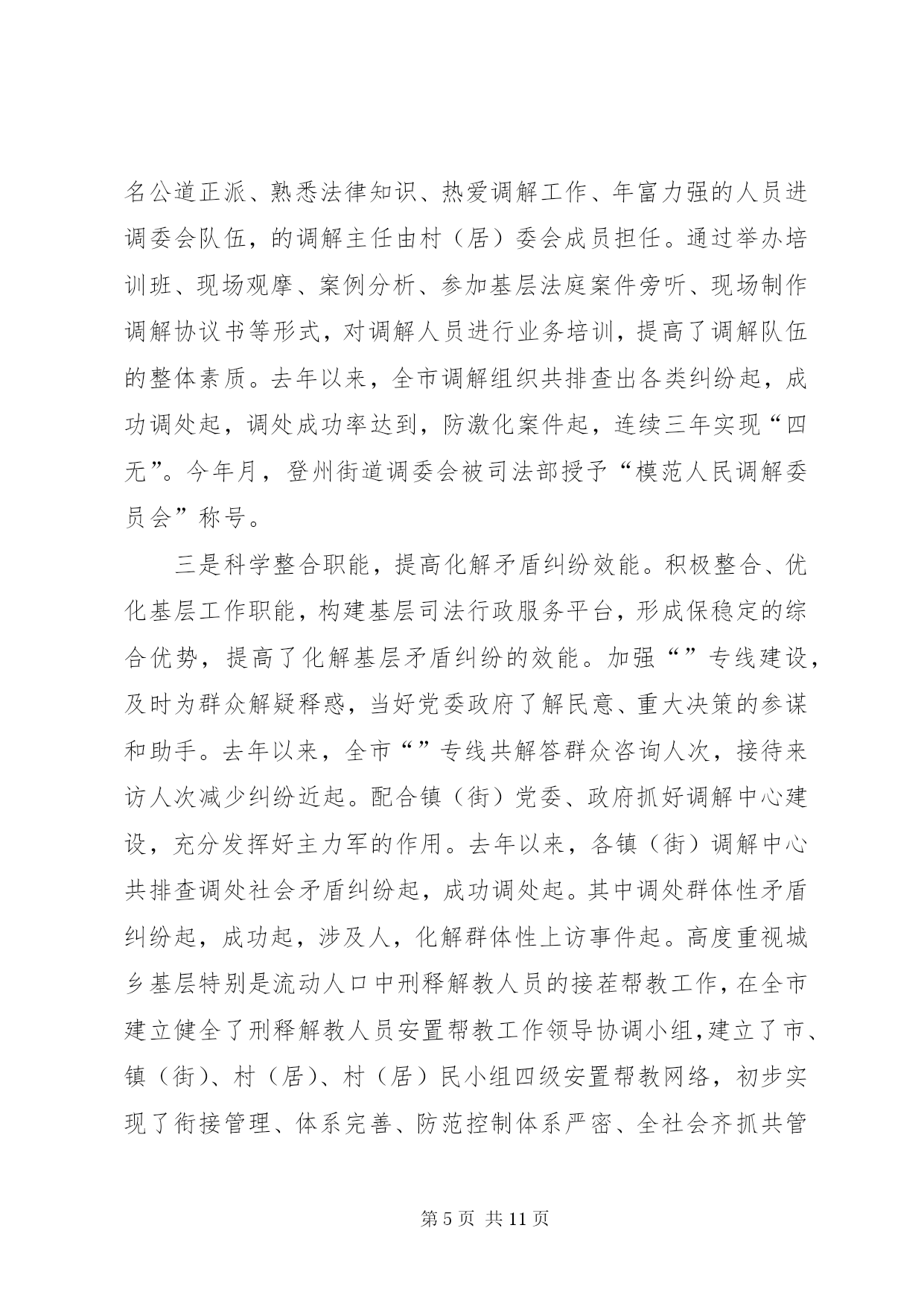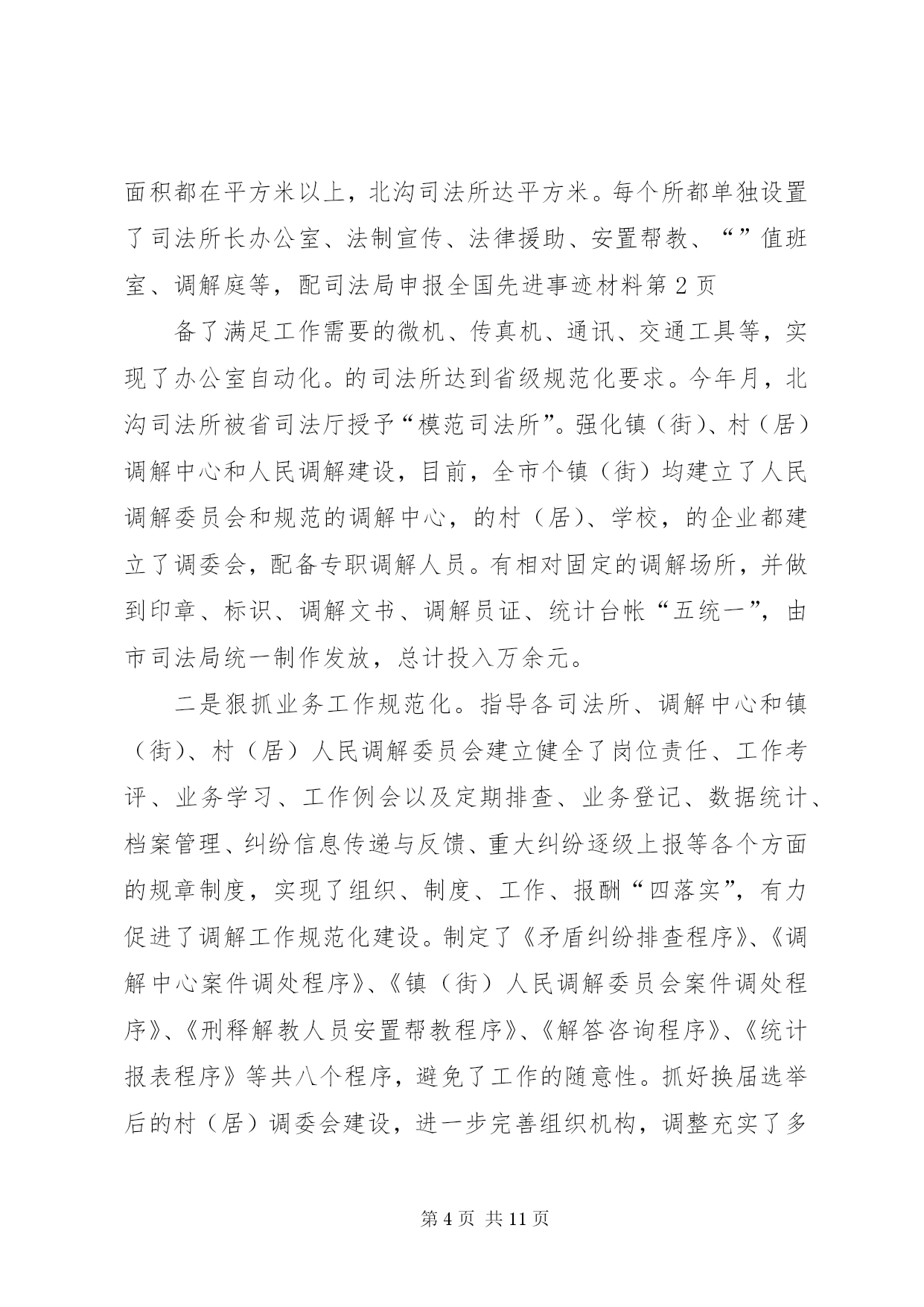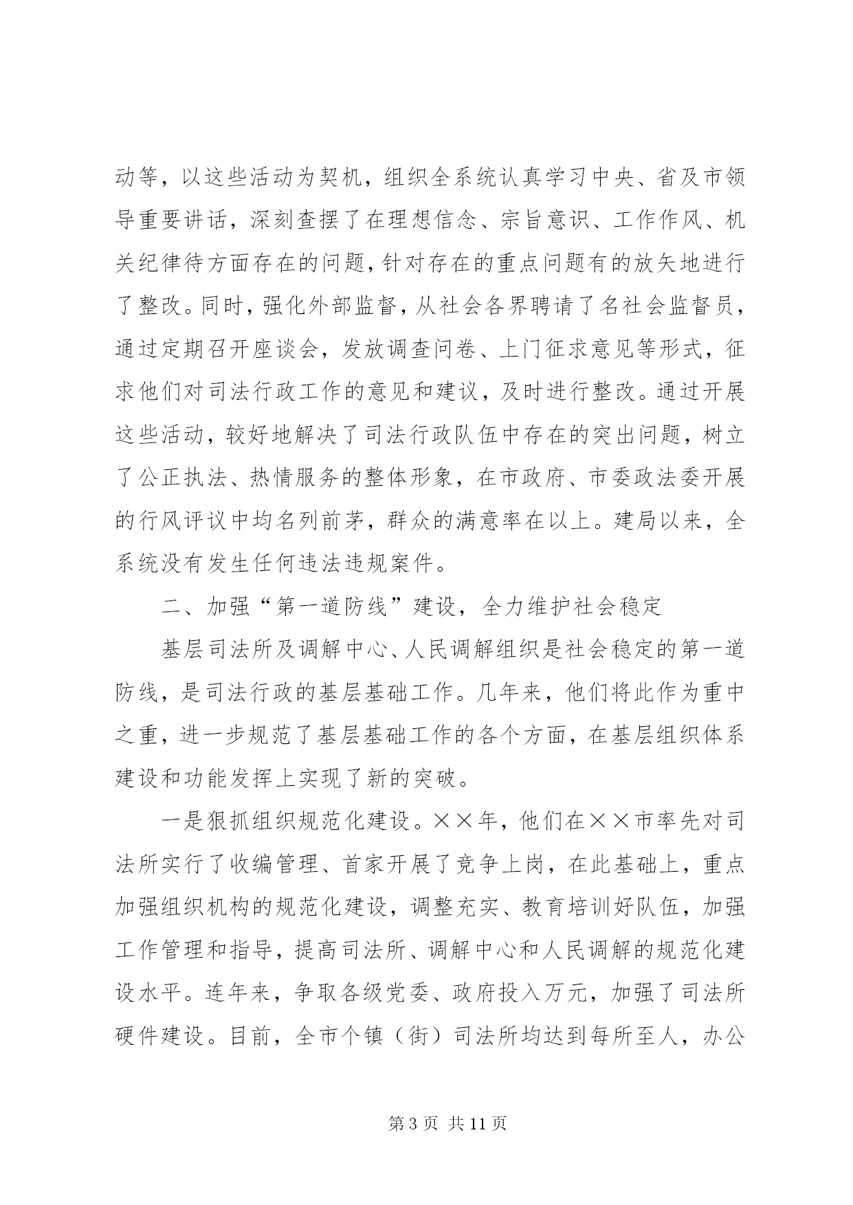 第PAGE\*Arabic\*MERGEFORMAT11页共NUMPAGES\*MERGEFORMAT11页司法局申报全国先进事迹材料近年来,××市司法局全面贯彻落实司法部关于加强基层司法行政工作的部署和要求,认真履行法律保障、法律服务、法律宣传职能,业务工作开展活跃,在人民调解、法律服务、法律援助、普法依法治理、刑释解教人员安置帮教和司法所建设等各项工作中大胆创新,丰富、发展和完善基层司法行政工作经验,为保持社会稳定、促进经济建设和维护人民群众的利益发挥了重要作用,受到了当地党委、政府、省、市司法厅(局)的充分肯定和人民群众的普遍欢迎。先后被××省司法厅授予政治工作先进集体、全省“”法律服务专线建设先进集体、全省人民满意的司法行政先进单位、××省人民调解工作先进单位;被省司法厅荣记集体二等功一次;被省普法办、省司法厅授予全省法制宣传工作先进集体被司法部基层工作指导司授予人民调解宣传工作先进单位;被省财政厅授予全省会计基础工作规范化单位;被省档案厅授予机关档案工作规范化管理单位;被××市委、市人大常委会、××市人民政府授予全市“二五”依法治市先进集体;被××市司法局荣记集体三等功两次。××年月,××市司法局在××市召开律师事务所规范化建设现场会;××年月,××市委、市政府在××召开了“加快推进第一道防线建设”现场会;××年月,××市司法局在省矛盾纠纷排查调处工作经验交流会议上做了典型发言。一、狠抓班子建设,带出一流队伍只有一流的队伍,才能创出一流的业绩。多年来,他们十分注重班子和队伍建设,以钢班子带出铁队伍,为基层司法行政工作开创新局面提供强有力的组织保证。一是领导班子坚强有力。近年来××市司法局领导班子始终注重自身建设,积极实践“三个代表”重要思想,坚持科学发展观,坚决贯彻落实党的路线、方针、政策,在政治上与党中央保持高度一致。注重与时俱进、改革创新,充分发挥战斗堡垒作用。党组一班人坚持科学决策、民主决策、民主管理,自觉做到“四带头、三承诺”,即带头参加学习、带头廉洁自律、带头求真务实、带头拼搏争先。要求下级做到的,班子成员率先做到;要求下级不做的,班子成员绝对不做;要求下级完成任务的,班子成员绝对首先完成。每个班子成员能够经常深入基层,促膝谈心,了解民情,帮助基层排忧解难。尤其是针对新形势下基层司法行政工作出现的新情况、新问题,善于创造性地开展工作,使基层司法行政工作年年有新突破、年年有新发展,许多工作都走在全省前列。三是从严治警严格管理。几年来,他们以开展各种教育整顿活动为载体,严格队伍管理,先后开展了效能建设年、环境建设年、“公正执法树形象”活动、“推进落实年”、保持共产党员先进性教育活动和“规范执法行为、促进执法公正”专项整顿活动等,以这些活动为契机,组织全系统认真学习中央、省及市领导重要讲话,深刻查摆了在理想信念、宗旨意识、工作作风、机关纪律待方面存在的问题,针对存在的重点问题有的放矢地进行了整改。同时,强化外部监督,从社会各界聘请了名社会监督员,通过定期召开座谈会,发放调查问卷、上门征求意见等形式,征求他们对司法行政工作的意见和建议,及时进行整改。通过开展这些活动,较好地解决了司法行政队伍中存在的突出问题,树立了公正执法、热情服务的整体形象,在市政府、市委政法委开展的行风评议中均名列前茅,群众的满意率在以上。建局以来,全系统没有发生任何违法违规案件。二、加强“第一道防线”建设,全力维护社会稳定基层司法所及调解中心、人民调解组织是社会稳定的第一道防线,是司法行政的基层基础工作。几年来,他们将此作为重中之重,进一步规范了基层基础工作的各个方面,在基层组织体系建设和功能发挥上实现了新的突破。一是狠抓组织规范化建设。××年,他们在××市率先对司法所实行了收编管理、首家开展了竞争上岗,在此基础上,重点加强组织机构的规范化建设,调整充实、教育培训好队伍,加强工作管理和指导,提高司法所、调解中心和人民调解的规范化建设水平。连年来,争取各级党委、政府投入万元,加强了司法所硬件建设。目前,全市个镇(街)司法所均达到每所至人,办公面积都在平方米以上,北沟司法所达平方米。每个所都单独设置了司法所长办公室、法制宣传、法律援助、安置帮教、“”值班室、调解庭等,配司法局申报全国先进事迹材料备了满足工作需要的微机、传真机、通讯、交通工具等,实现了办公室自动化。的司法所达到省级规范化要求。今年月,北沟司法所被省司法厅授予“模范司法所”。强化镇(街)、村(居)调解中心和人民调解建设,目前,全市个镇(街)均建立了人民调解委员会和规范的调解中心,的村(居)、学校,的企业都建立了调委会,配备专职调解人员。有相对固定的调解场所,并做到印章、标识、调解文书、调解员证、统计台帐“五统一”,由市司法局统一制作发放,总计投入万余元。二是