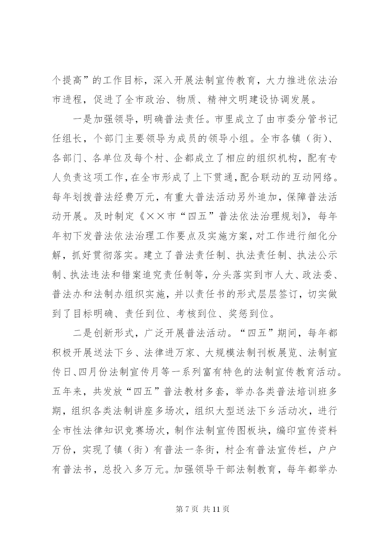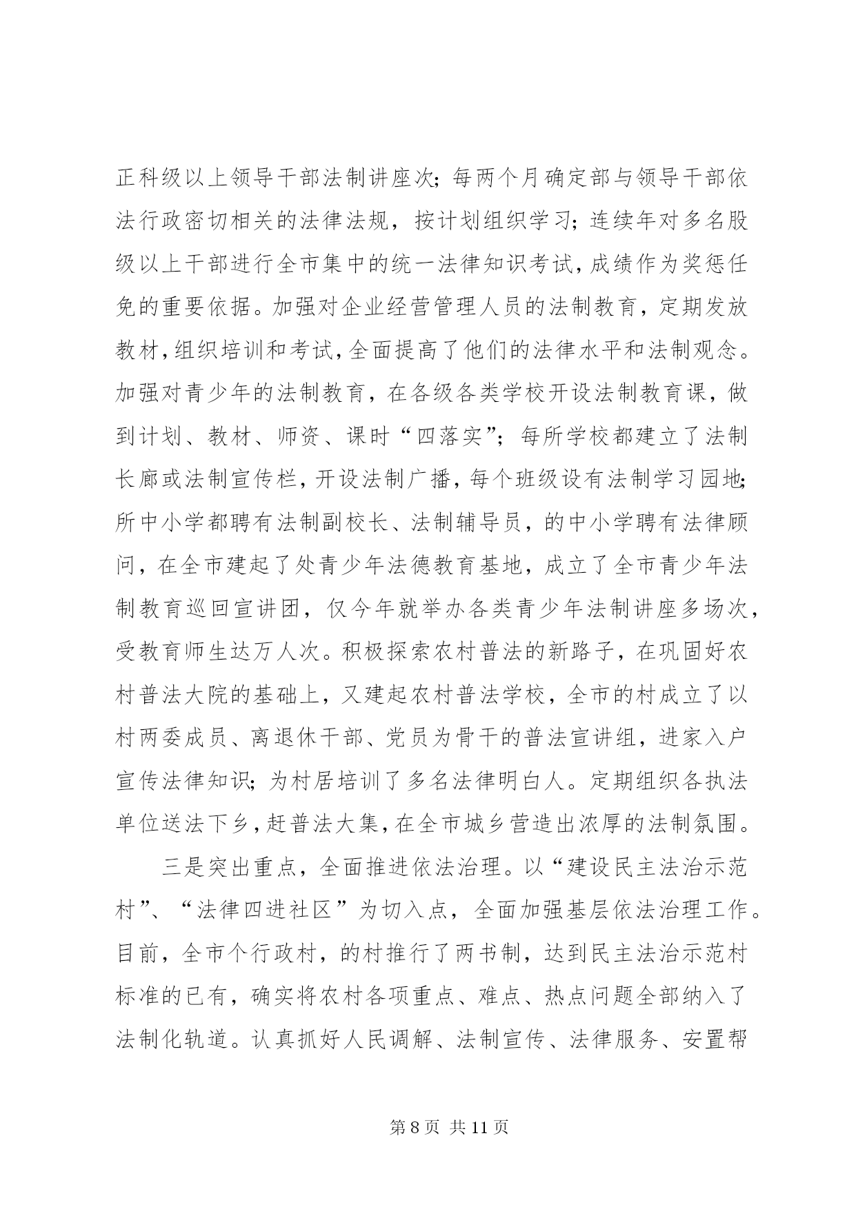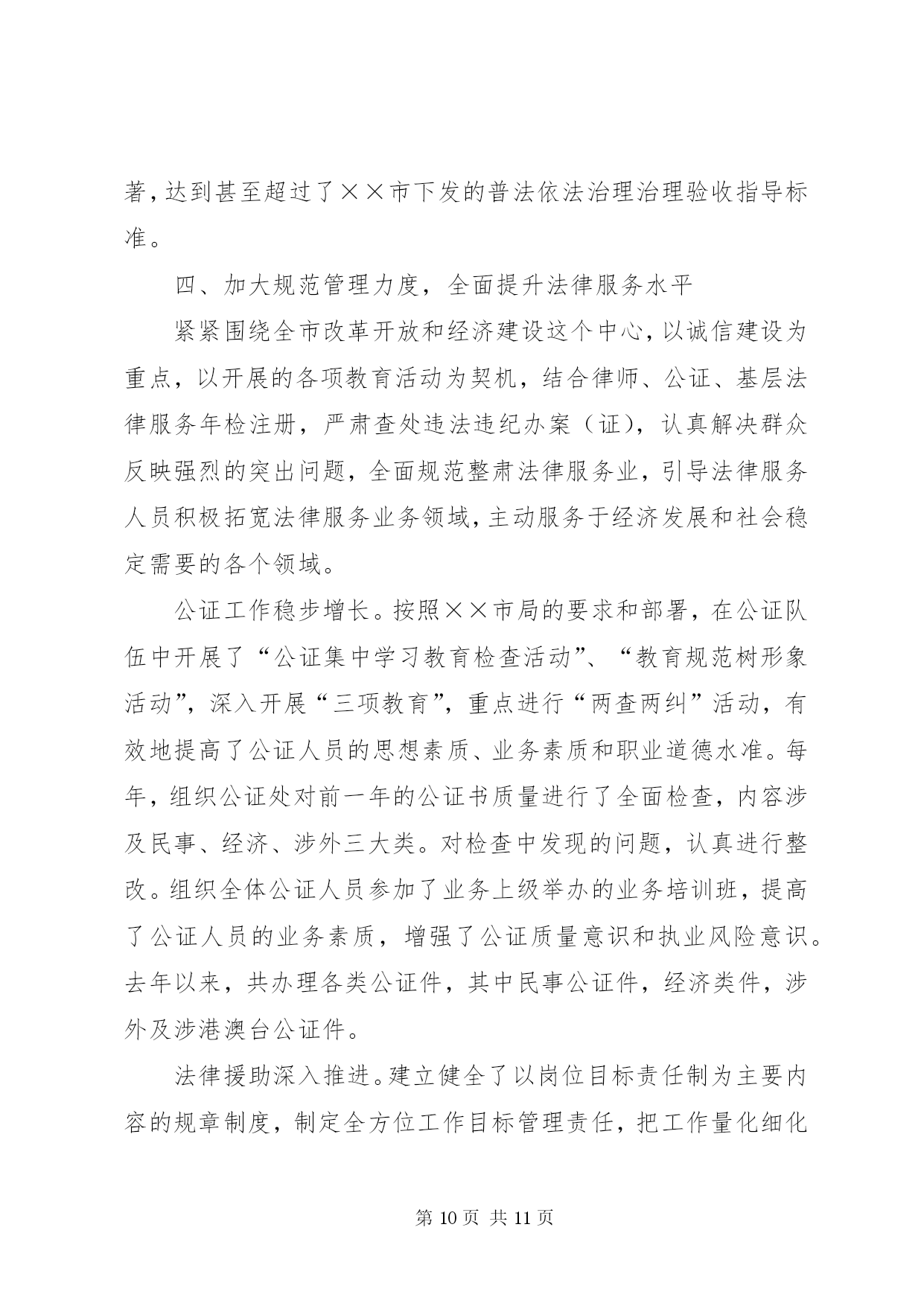 第PAGE\*Arabic\*MERGEFORMAT11页共NUMPAGES\*MERGEFORMAT11页司法局申报全国先进事迹材料近年来,××市司法局全面贯彻落实司法部关于加强基层司法行政工作的部署和要求,认真履行法律保障、法律服务、法律宣传职能,业务工作开展活跃,在人民调解、法律服务、法律援助、普法依法治理、刑释解教人员安置帮教和司法所建设等各项工作中大胆创新,丰富、发展和完善基层司法行政工作经验,为保持社会稳定、促进经济建设和维护人民群众的利益发挥了重要作用,受到了当地党委、政府、省、市司法厅(局)的充分肯定和人民群众的普遍欢迎。先后被××省司法厅授予政治工作先进集体、全省“”法律服务专线建设先进集体、全省人民满意的司法行政先进单位、××省人民调解工作先进单位;被省司法厅荣记集体二等功一次;被省普法办、省司法厅授予全省法制宣传工作先进集体被司法部基层工作指导司授予人民调解宣传工作先进单位;被省财政厅授予全省会计基础工作规范化单位;被省档案厅授予机关档案工作规范化管理单位;被××市委、市人大常委会、××市人民政府授予全市“二五”依法治市先进集体;被××市司法局荣记集体三等功两次。××年月,××市司法局在××市召开律师事务所规范化建设现场会;××年月,××市委、市政府在××召开了“加快推进第一道防线建设”现场会;××年月,××市司法局在省矛盾纠纷排查调处工作经验交流会议上做了典型发言。一、狠抓班子建设,带出一流队伍只有一流的队伍,才能创出一流的业绩。多年来,他们十分注重班子和队伍建设,以钢班子带出铁队伍,为基层司法行政工作开创新局面提供强有力的组织保证。一是领导班子坚强有力。近年来××市司法局领导班子始终注重自身建设,积极实践“三个代表”重要思想,坚持科学发展观,坚决贯彻落实党的路线、方针、政策,在政治上与党中央保持高度一致。注重与时俱进、改革创新,充分发挥战斗堡垒作用。党组一班人坚持科学决策、民主决策、民主管理,自觉做到“四带头、三承诺”,即带头参加学习、带头廉洁自律、带头求真务实、带头拼搏争先。要求下级做到的,班子成员率先做到;要求下级不做的,班子成员绝对不做;要求下级完成任务的,班子成员绝对首先完成。每个班子成员能够经常深入基层,促膝谈心,了解民情,帮助基层排忧解难。尤其是针对新形势下基层司法行政工作出现的新情况、新问题,善于创造性地开展工作,使基层司法行政工作年年有新突破、年年有新发展,许多工作都走在全省前列。三是从严治警严格管理。几年来,他们以开展各种教育整顿活动为载体,严格队伍管理,先后开展了效能建设年、环境建设年、“公正执法树形象”活动、“推进落实年”、保持共产党员先进性教育活动和“规范执法行为、促进执法公正”专项整顿活动等,以这些活动为契机,组织全系统认真学习中央、省及市领导重要讲话,深刻查摆了在理想信念、宗旨意识、工作作风、机关纪律待方面存在的问题,针对存在的重点问题有的放矢地进行了整改。同时,强化外部监督,从社会各界聘请了名社会监督员,通过定期召开座谈会,发放调查问卷、上门征求意见等形式,征求他们对司法行政工作的意见和建议,及时进行整改。通过开展这些活动,较好地解决了司法行政队伍中存在的突出问题,树立了公正执法、热情服务的整体形象,在市政府、市委政法委开展的行风评议中均名列前茅,群众的满意率在以上。建局以来,全系统没有发生任何违法违规案件。二、加强“第一道防线”建设,全力维护社会稳定基层司法所及调解中心、人民调解组织是社会稳定的第一道防线,是司法行政的基层基础工作。几年来,他们将此作为重中之重,进一步规范了基层基础工作的各个方面,在基层组织体系建设和功能发挥上实现了新的突破。一是狠抓组织规范化建设。××年,他们在××市率先对司法所实行了收编管理、首家开展了竞争上岗,在此基础上,重点加强组织机构的规范化建设,调整充实、教育培训好队伍,加强工作管理和指导,提高司法所、调解中心和人民调解的规范化建设水平。连年来,争取各级党委、政府投入万元,加强了司法所硬件建设。目前,全市个镇(街)司法所均达到每所至人,办公面积都在平方米以上,北沟司法所达平方米。每个所都单独设置了司法所长办公室、法制宣传、法律援助、安置帮教、“”值班室、调解庭等,配司法局申报全国先进事迹材料备了满足工作需要的微机、传真机、通讯、交通工具等,实现了办公室自动化。的司法所达到省级规范化要求。今年月,北沟司法所被省司法厅授予“模范司法所”。强化镇(街)、村(居)调解中心和人民调解建设,目前,全市个镇(街)均建立了人民调解委员会和规范的调解中心,的村(居)、学校,的企业都建立了调委会,配备专职调解人员。有相对固定的调解场所,并做到印章、标识、调解文书、调解员证、统计台帐“五统一”,由市司法局统一制作发放,总计投入万余元。二是