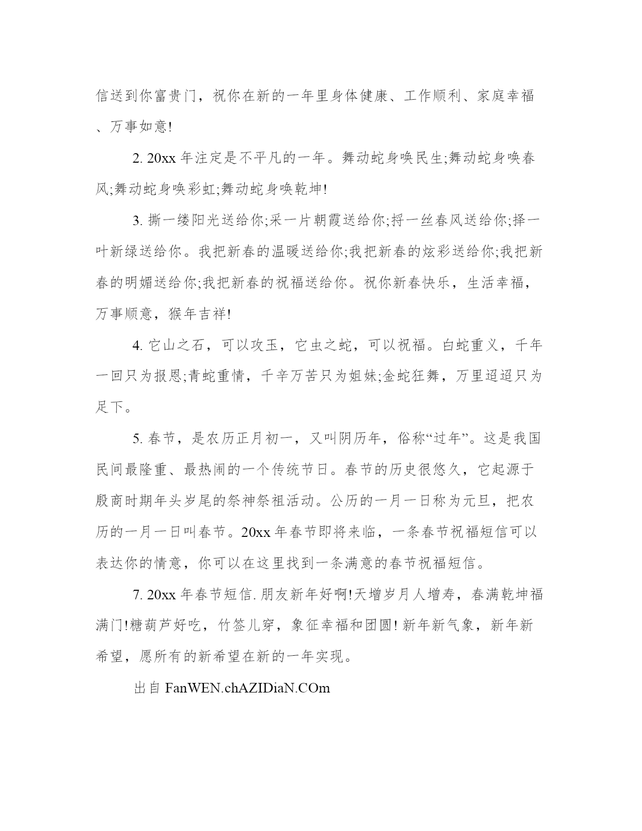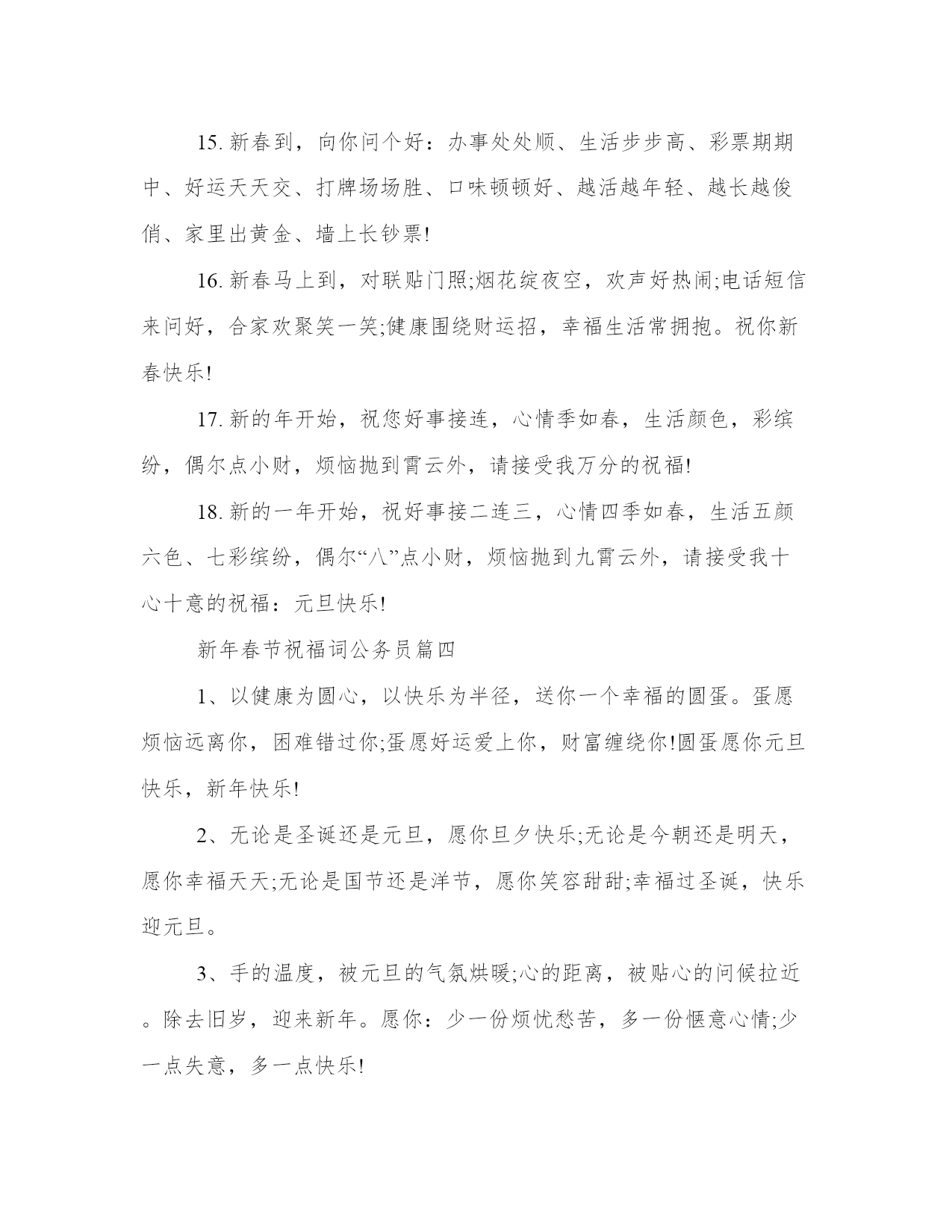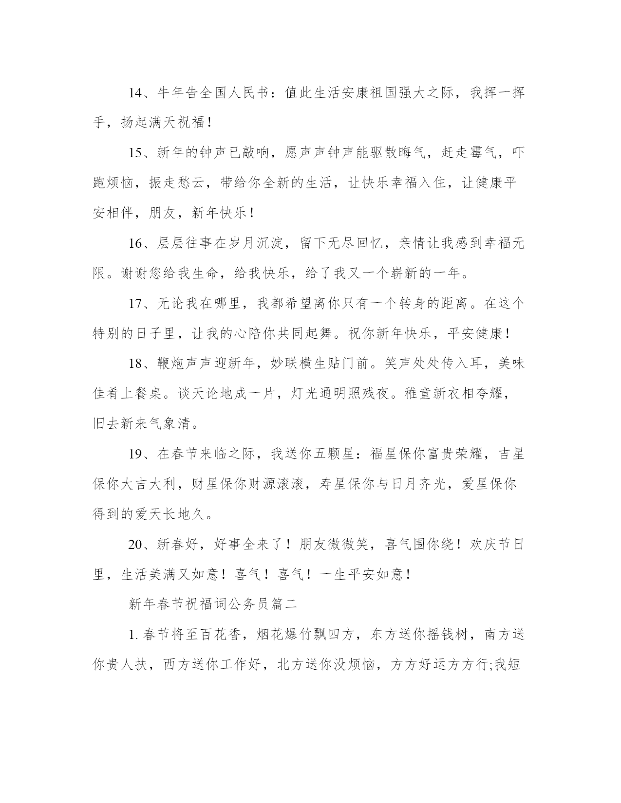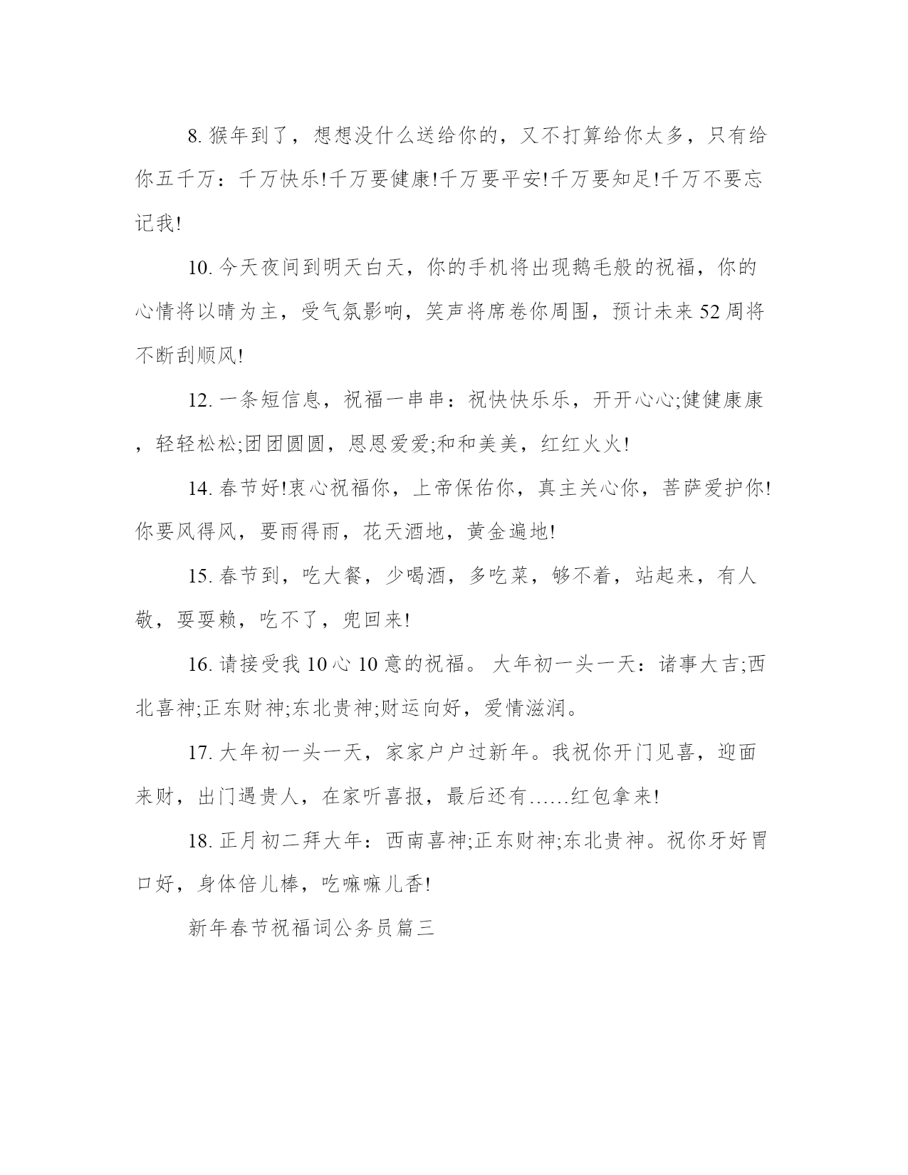新年春节祝福词公务员(通用13篇)总结是一种不断学习和进步的过程,只有持之以恒才能取得持久的成效。在总结中适度展示个人感受和体验,使总结更具有个性化和独特性。这些总结范文凝练了大量的信息,可以帮助我们更好地理解总结的要点。新年春节祝福词公务员篇一1、我的祝福跨过重重高山,掠过条条小溪,跳过大马路,窜过小胡同,闪过卖冰糖葫芦的老太太,钻进你耳朵里,新年快乐!2、新年祝福无限,发财跨越20xx!恭喜发财,财源广进!3、今年过节不收礼,其实给点也可以。十块八块不嫌弃,十万八万过得去。你要真是没的送,短信一条也可以。新年快乐!4、堆积365天的想念,凝聚千丝万缕的柔情,拼却春夏秋冬的痴恋,采撷夜空的璀璨的星宿,淘尽碧千年的珠玑,只为传帝给你最精髓的祝愿,20xx春节快乐!5、新年快乐节了,重回童年的记忆。好怀念,你那性感的开裆裤,你那鼻涕当面膜的厚脸皮,你哭笑转换自如的演技,撒气泼来地上蹭个坑的耐力。愿你永葆童心!6、烟花的一瞬间是快乐;流星的一瞬是祈愿;思念的一瞬是感动。而我只想让你看到短信的一瞬能够明白:无论你天涯海角,都会深深祝福你春节快乐!7、一生之中总有一些朋友难忘记,一年之中总有一些节日最珍惜,从春到夏,由陌生到熟悉,虽不能时时想起,却会在特别的日子轻轻问一声:春节快乐!8、我对你牛年的祝福,如那繁茂的树叶,一片片、一张张,都写满了我的真心意!新年快乐、万事如意!9、烟花绽放了吉祥,春联书写了新年,喜悦飞上了心头,年味回荡在心间,祝福真真传递此,问候深深表真意。愿你新年幸福满,生活甜蜜来。10、一朵花摘了许久,枯萎了也舍不得丢;一把伞撑了许久,雨停了也想不起收;一条路走了许久,天黑了也走不到头;一句话等了许久,终于可以说:新年快乐!11、祝愿你在新的一年里,所有的希望都能如愿,所有的梦想都能实现,所有的期待都能出现,所有的付出都能兑现!12、本年最可爱短信:收到的人会永不被炒,阅读的人会飞黄腾达,储存的人会爱情甜蜜,删除的人会好运连连,转发的人会薪水猛涨!13、朋友,还记的我吗?我就是小学时揍你,中学时带你,高考时抄你,工作后找你,没事时骂你,如今想你的人。发个短信问候远方的你:你狗剩哥想你了,祝福老弟翻身做老板,一定要身体健康,万寿无疆。14、牛年告全国人民书:值此生活安康祖国强大之际,我挥一挥手,扬起满天祝福!15、新年的钟声已敲响,愿声声钟声能驱散晦气,赶走霉气,吓跑烦恼,振走愁云,带给你全新的生活,让快乐幸福入住,让健康平安相伴,朋友,新年快乐!16、层层往事在岁月沉淀,留下无尽回忆,亲情让我感到幸福无限。谢谢您给我生命,给我快乐,给了我又一个崭新的一年。17、无论我在哪里,我都希望离你只有一个转身的距离。在这个特别的日子里,让我的心陪你共同起舞。祝你新年快乐,平安健康!18、鞭炮声声迎新年,妙联横生贴门前。笑声处处传入耳,美味佳肴上餐桌。谈天论地成一片,灯光通明照残夜。稚童新衣相夸耀,旧去新来气象清。19、在春节来临之际,我送你五颗星:福星保你富贵荣耀,吉星保你大吉大利,财星保你财源滚滚,寿星保你与日月齐光,爱星保你得到的爱天长地久。20、新春好,好事全来了!朋友微微笑,喜气围你绕!欢庆节日里,生活美满又如意!喜气!喜气!一生平安如意!新年春节祝福词公务员篇二1.春节将至百花香,烟花爆竹飘四方,东方送你摇钱树,南方送你贵人扶,西方送你工作好,北方送你没烦恼,方方好运方方行;我短信送到你富贵门,祝你在新的一年里身体健康、工作顺利、家庭幸福、万事如意!2.20xx年注定是不平凡的一年。舞动蛇身唤民生;舞动蛇身唤春风;舞动蛇身唤彩虹;舞动蛇身唤乾坤!3.撕一缕阳光送给你;采一片朝霞送给你;捋一丝春风送给你;择一叶新绿送给你。我把新春的温暖送给你;我把新春的炫彩送给你;我把新春的明媚送给你;我把新春的祝福送给你。祝你新春快乐,生活幸福,万事顺意,猴年吉祥!4.它山之石,可以攻玉,它虫之蛇,可以祝福。白蛇重义,千年一回只为报恩;青蛇重情,千辛万苦只为姐妹;金蛇狂舞,万里迢迢只为足下。5.春节,是农历正月初一,又叫阴历年,俗称“过年”。这是我国民间最隆重、最热闹的一个传统节日。春节的历史很悠久,它起源于殷商时期年头岁尾的祭神祭祖活动。公历的一月一日称为元旦,把农历的一月一日叫春节。20xx年春节即将来临,一条春节祝福短信可以表达你的情意,你可以在这里找到一条满意的春节祝福短信。7.20xx年春节短信.朋友新年好啊!天增岁月人增寿,春满乾坤福满门!糖葫芦好吃,竹签儿穿,象征幸福和团圆!新年新气象,新年新希望,愿所有的新希望在新的一年实现。出自FanWEN.chAZIDiaN.COm8.猴年到了,想想没什么送给你的,又不打算给你太多,只有给你五千万:千万快乐!千万要